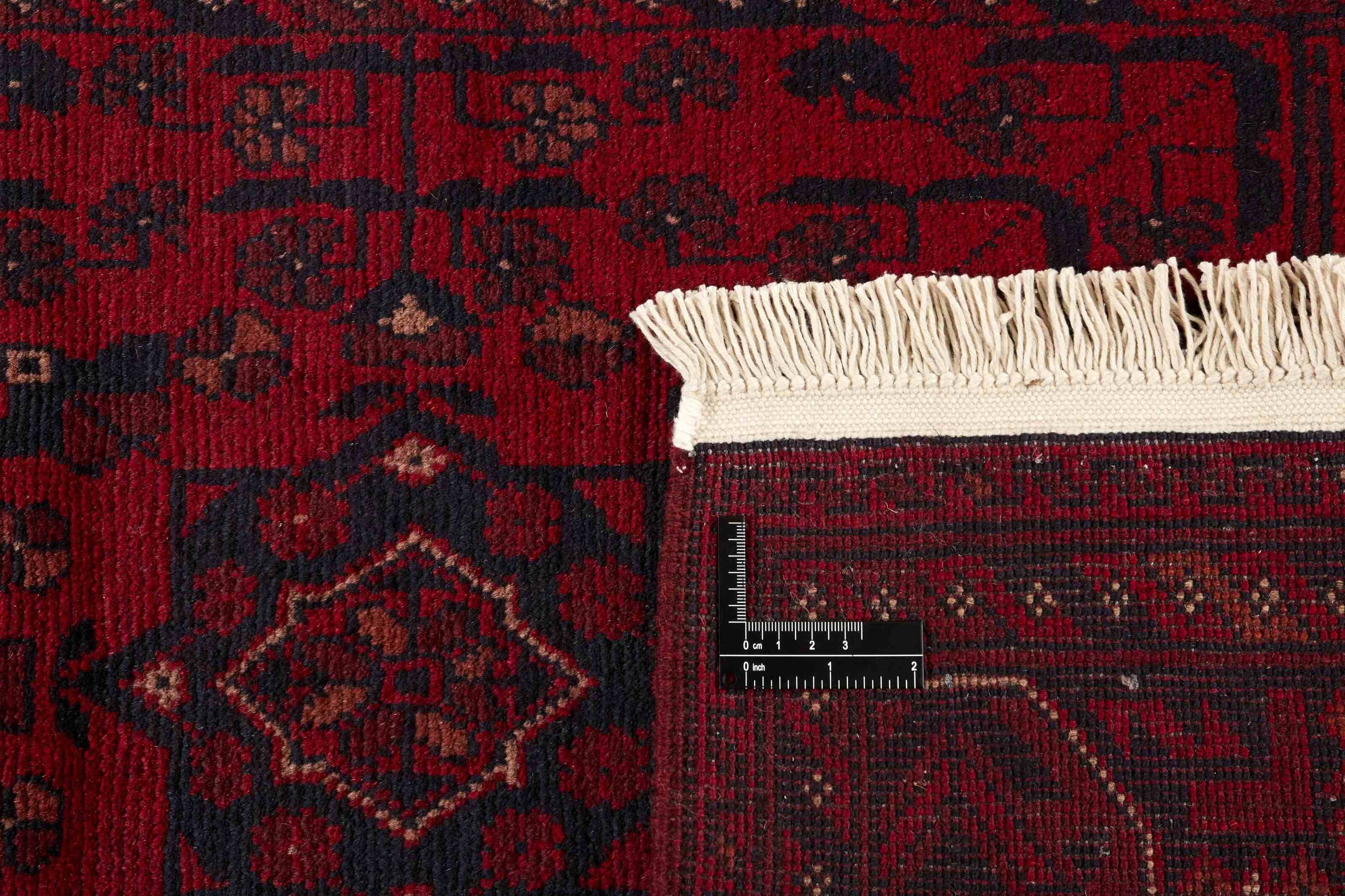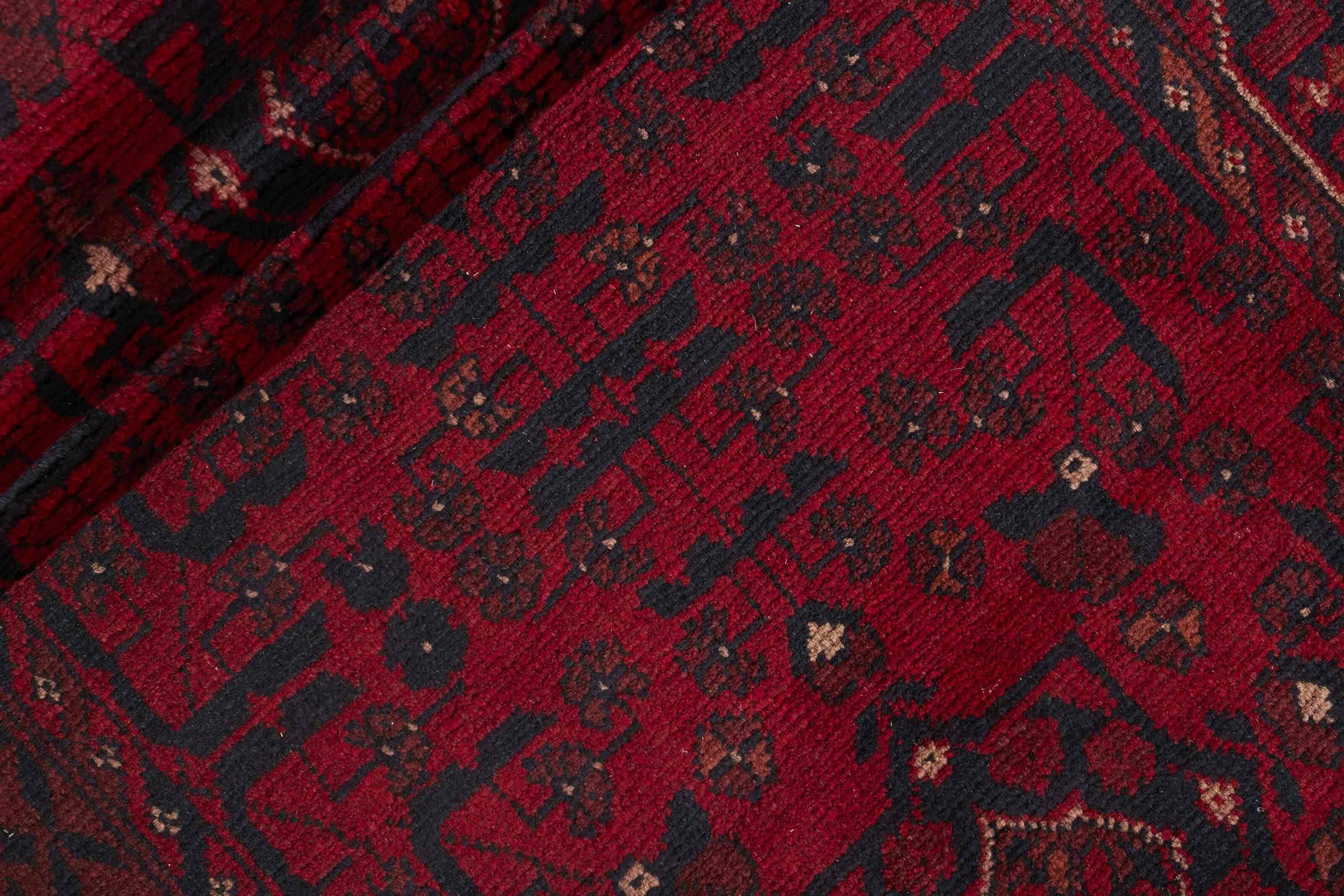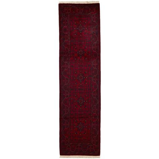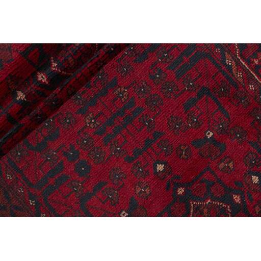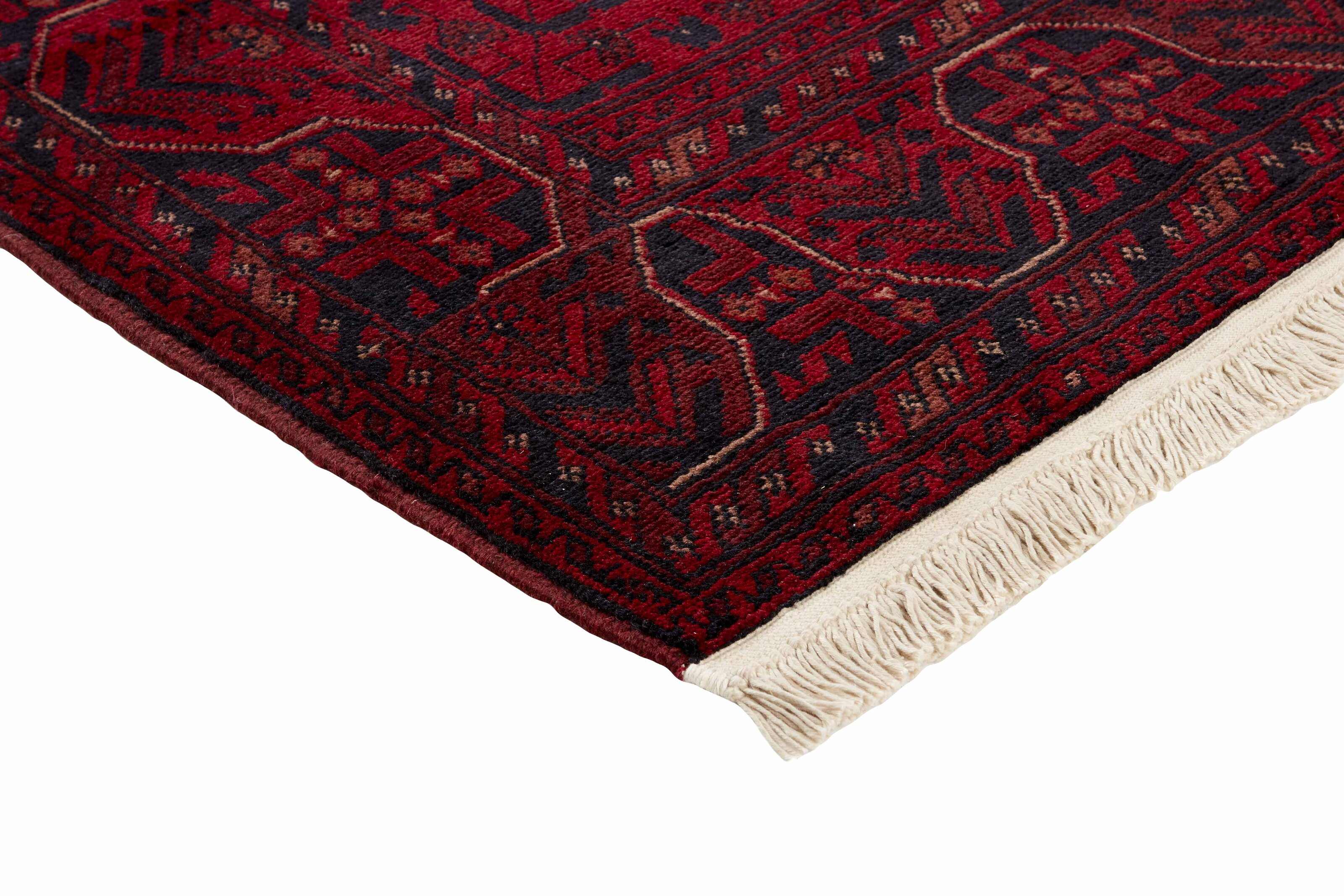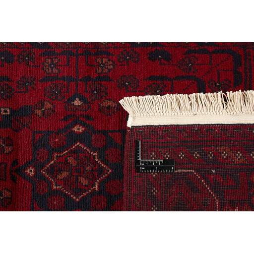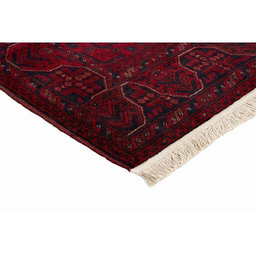 Two of the most popular Afghan rugs are Khal Mohammadi/Old Afghan, and Afghan Aktscha. Khal Mohammadi is handmade by Turkmens in northern Afghanistan. Both Turkmenistan to the North and Afghnaistan to the South are mostly inhabited by nomadic tribes. Kabul, the capitol of Afghanistan, and the city of Herat, are important centres for Afghan rugs. Characteristic of these rugs is the deep, warm, and fiery red base colour, the relatively high and sturdy pile, the wool base weave, the use of goat’s and horse’s hair, and knotting using the Seneh knot and the Gül (Elephant’s Foot) pattern. The base colour is a wide range of warm red nuances, from rust to copper brown. The pattern is a very dark blue, almost black, with ochre and ivory white colour.
