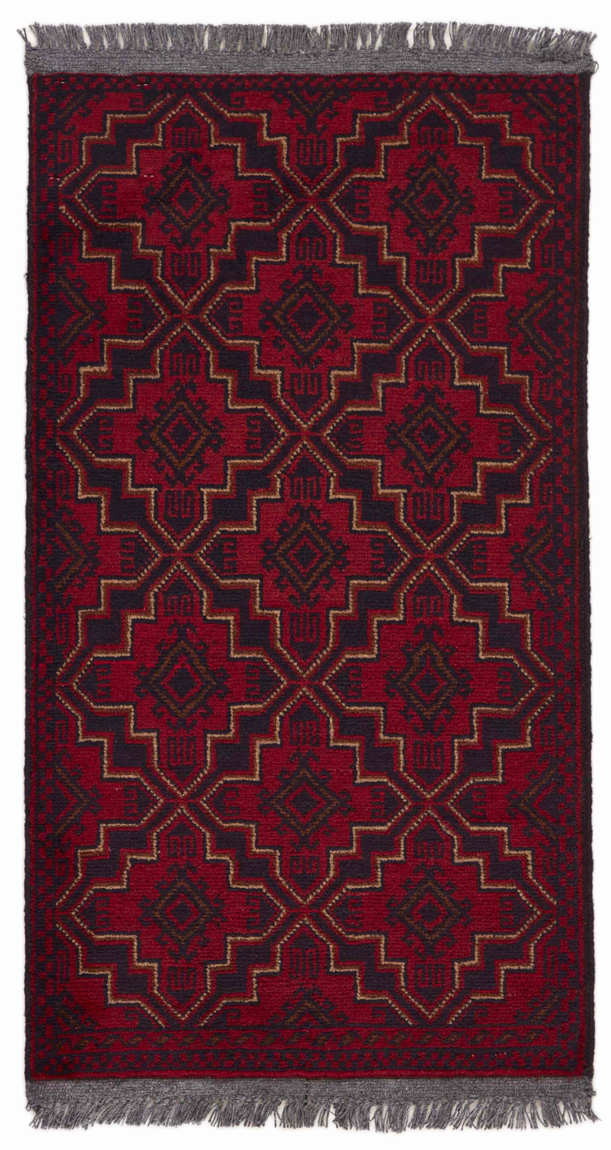 Two of the most popular Afghan rugs are Khal Mohammadi/Old Afghan, and Afghan Aktscha. Khal Mohammadi is handmade by Turkmens in northern Afghanistan. Both Turkmenistan to the North and Afghnaistan to the South are mostly inhabited by nomadic tribes. Kabul, the capitol of Afghanistan, and the city of Herat, are important centres for Afghan rugs. Characteristic of these rugs is the deep, warm, and fiery red base colour, the relatively high and sturdy pile, the wool base weave, the use of goat’s and horse’s hair, and knotting using the Seneh knot and the Gül (Elephant’s Foot) pattern. The base colour is a wide range of warm red nuances, from rust to copper brown. The pattern is a very dark blue, almost black, with ochre and ivory white colour.