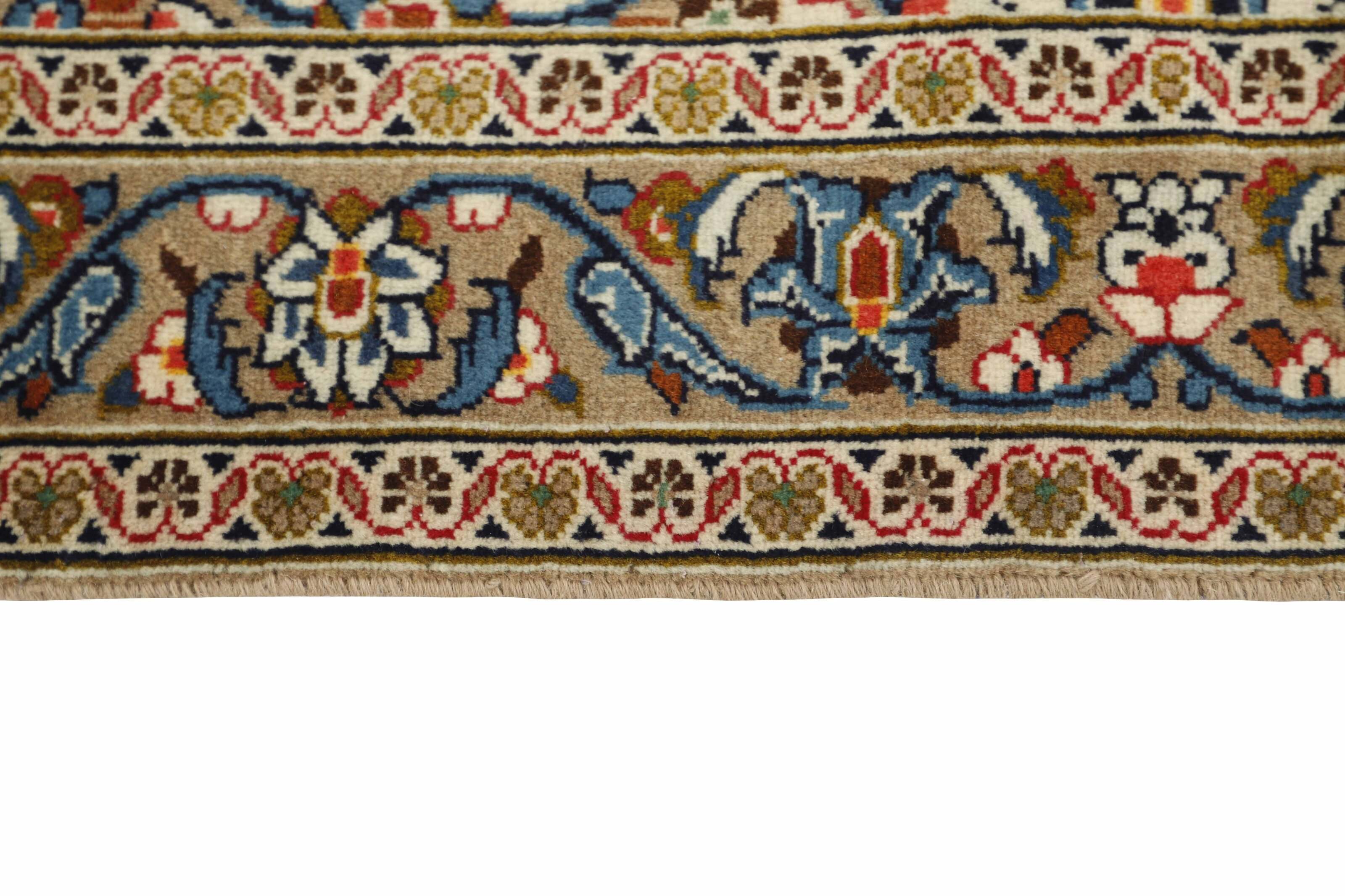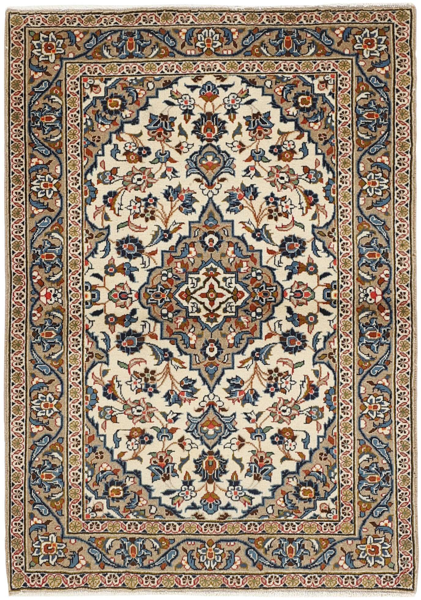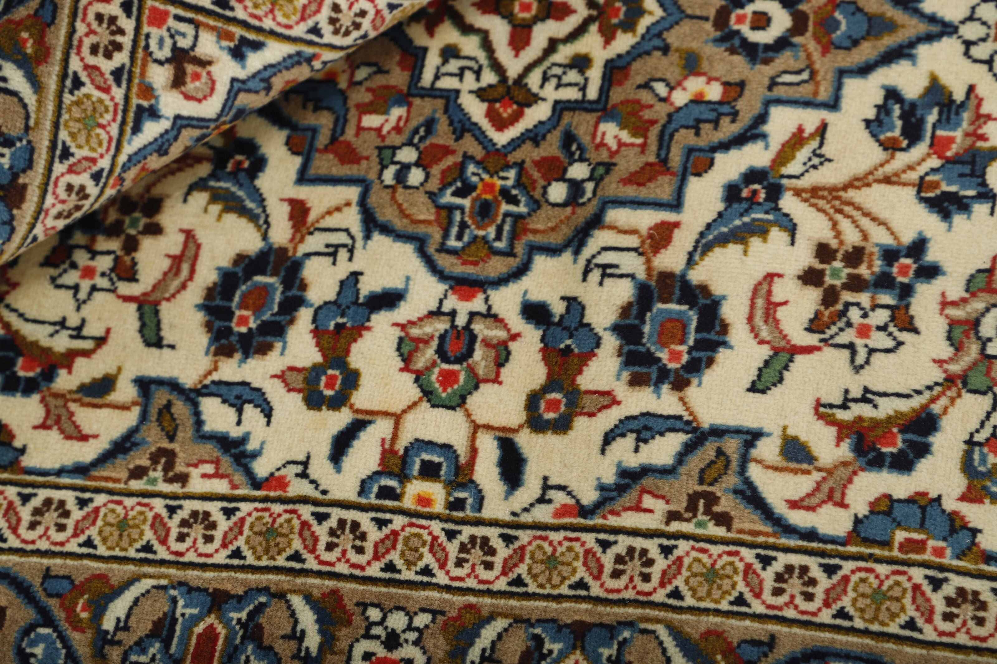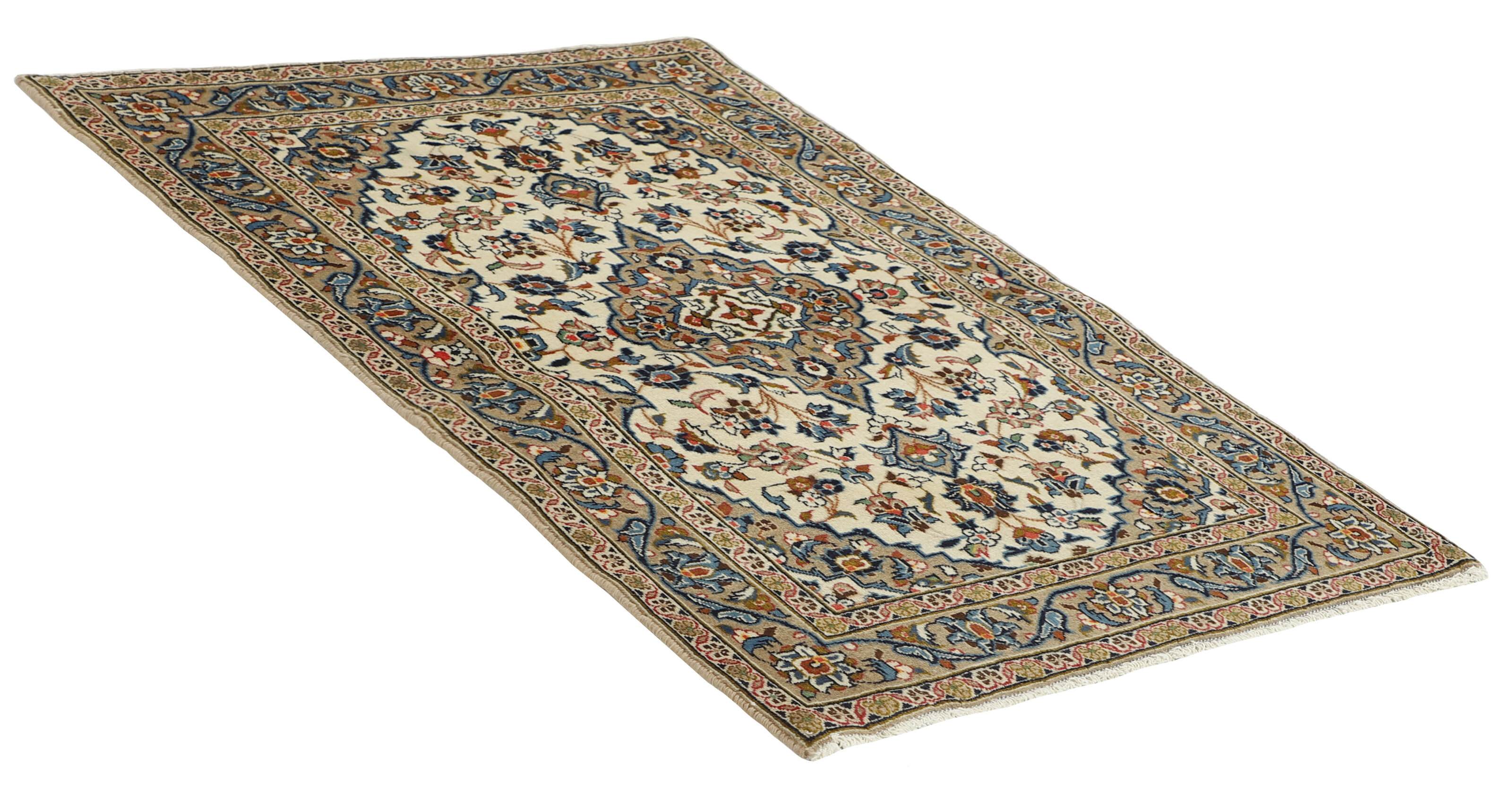 Keshan a toujours été célèbre pour son artisanat. Les villages se situent sur la route principale entre Ghom et Ispahan, dans le centre de l'Iran. À l'est, la région borde le plus grand désert d'Iran. Malgré le déclin de cet artisanat particulier au cours du XXe siècle, de nombreux tapis Keshan magnifiques sont toujours fabriqués conformément aux traditions des anciens maîtres, par exemple décorés de magnifiques motifs en médaillon ou de tapisseries représentant des motifs humains et animaux. Les motifs sont le plus souvent tissés autour d'un médaillon au centre du tapis, dont certains se répètent dans les coins. Les autres champs sont densément décorés de fleurs et de vignes réalistes. La bordure principale présente souvent le motif « Herati » (une feuille arquée), tandis que les bordures secondaires présentent des rosettes. Le rouge brique et le bleu foncé sont les couleurs de base les plus courantes. Keshan est une ville d'environ 300 000 habitants, située dans la province d'Ispahan, dans le centre de l'Iran. Elle est plutôt basse et il fait très chaud en été. Traditionnellement, les gens ont cherché à remédier à ce problème en construisant les maisons dans le sol. Keshan produit des tapis en laine et en soie. Les premiers ont une chaîne et une trame en coton, la trame étant bleue. Plusieurs qualités sont produites, mais la plupart des tapis Keshan sont très finement noués et entièrement couvrants. La forme d'un médaillon Keshan est assez particulière ; elle est faite d'une alternance de lignes courbes et d'angles droits. Les couleurs les plus courantes sont un champ rouge et un médaillon bleu, avec des détails secondaires dans d'autres couleurs. Les garnitures d'un tapis Keshan sont également spéciales ; la garniture principale est normalement entourée de rayures qui forment un motif géométrique, généralement de petits triangles bleus et rouges. Les tapis Keshan existent dans toutes les tailles. La ville de Natanez, au sud-est du pays, a donné son nom à des tapis d'image réalisés avec le même nouage que les Keshan.