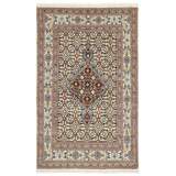 Moud est une petite ville au sud de Mashad, dans la province de Khorrasan. Les tapis de cette région se caractérisent par l'homogénéité de leurs motifs et de leur qualité. La chaîne et la trame sont en coton et le velours en laine. Les bordures sont une version de la bordure persane traditionnelle en tortue. Les tapis sont fabriqués dans toutes les tailles. Les tapis Moud sont souvent copiés en Inde, en raison de leur remarquable homogénéité. Les motifs caractéristiques de Moud sont parmi les plus uniformes, les plus réguliers et les plus facilement reconnaissables de la province de Khorrasan. Les Moud Mahi sont fabriqués dans des tons beige, rouge clair ou bleu, avec des motifs Mahi sur toute la surface ou avec un médaillon en forme d'étoile. Mahi signifie poisson et le motif Mahi est le motif le plus couramment utilisé dans les véritables tapis persans. En l'observant de près, vous pouvez voir un étang entouré de quatre poissons.