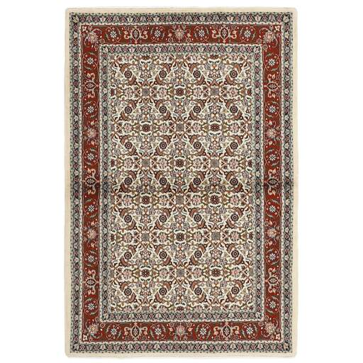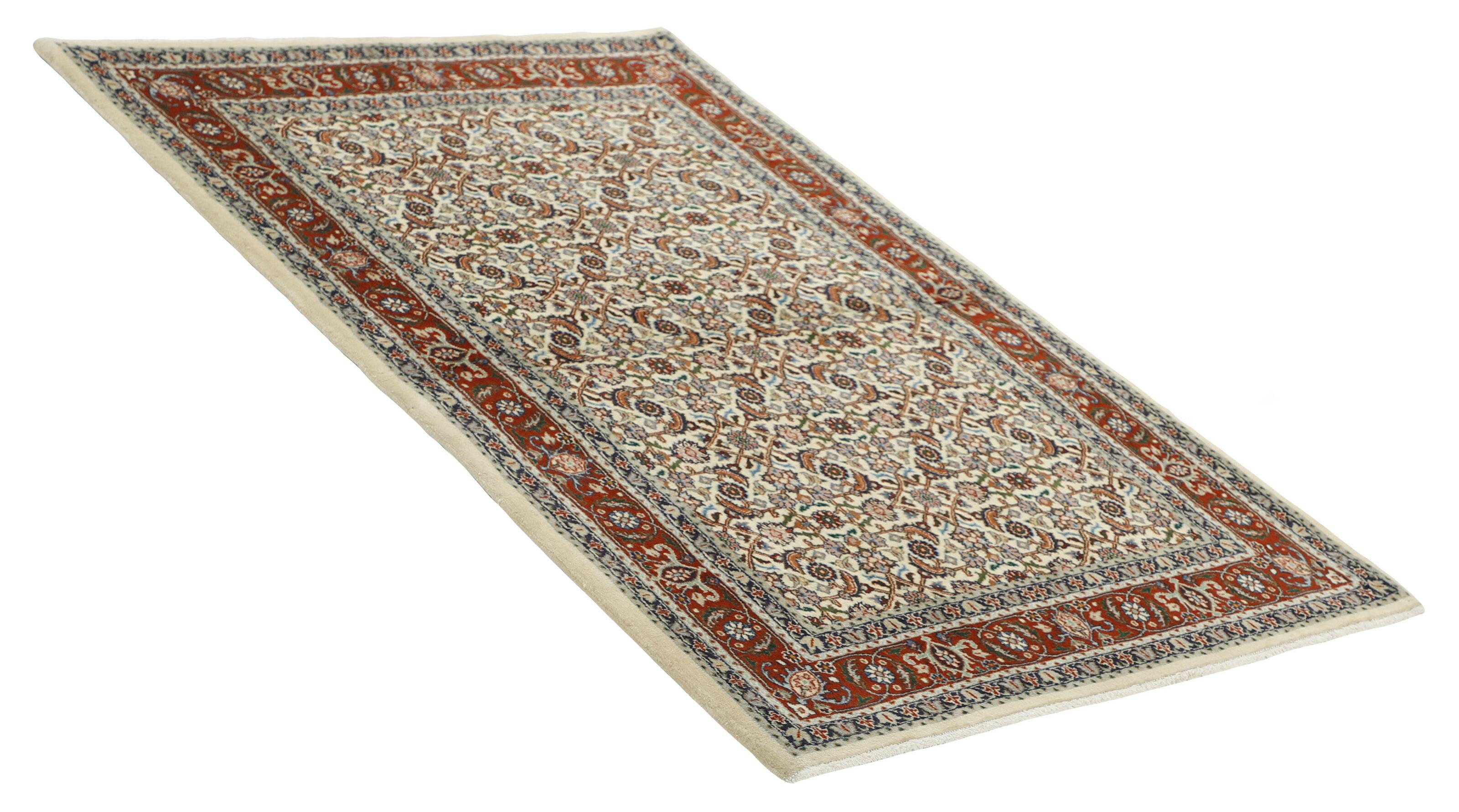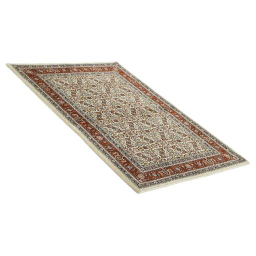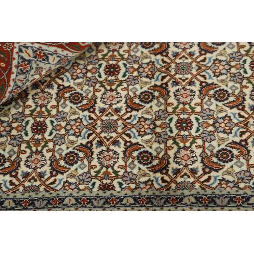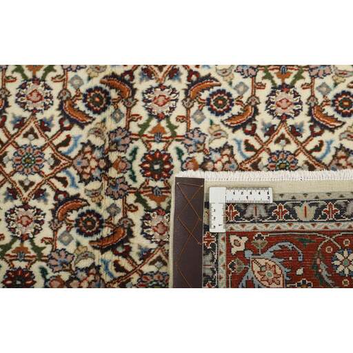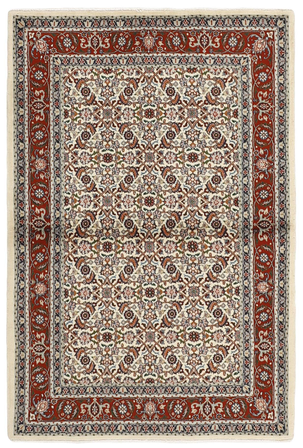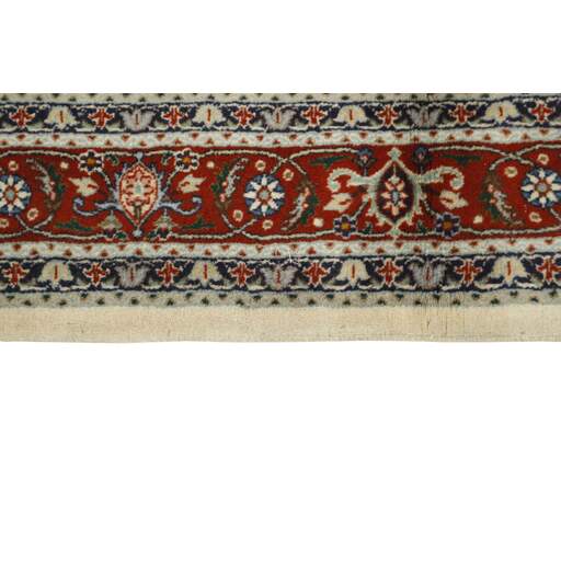 Moud est une petite ville au sud de Mashad, dans la province de Khorrasan. Les tapis de cette région se caractérisent par l'homogénéité de leurs motifs et de leur qualité. La chaîne et la trame sont en coton et le velours en laine. Les bordures sont une version de la bordure persane traditionnelle en tortue. Les tapis sont fabriqués dans toutes les tailles. Les tapis Moud sont souvent copiés en Inde, en raison de leur remarquable homogénéité. Les motifs caractéristiques de Moud sont parmi les plus uniformes, les plus réguliers et les plus facilement reconnaissables de la province de Khorrasan. Les Moud Mahi sont fabriqués dans des tons beige, rouge clair ou bleu, avec des motifs Mahi sur toute la surface ou avec un médaillon en forme d'étoile. Mahi signifie poisson et le motif Mahi est le motif le plus couramment utilisé dans les véritables tapis persans. En l'observant de près, vous pouvez voir un étang entouré de quatre poissons.