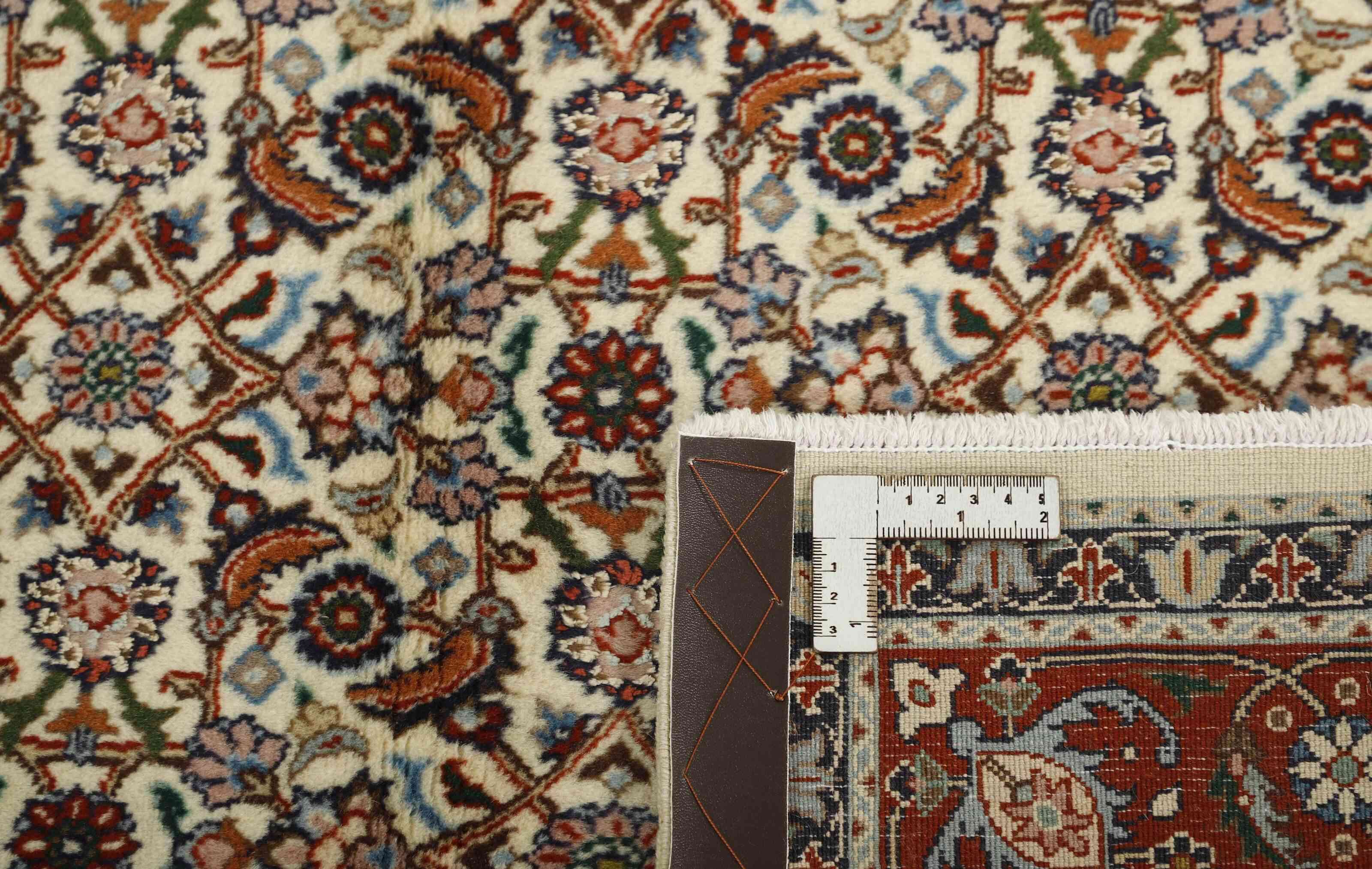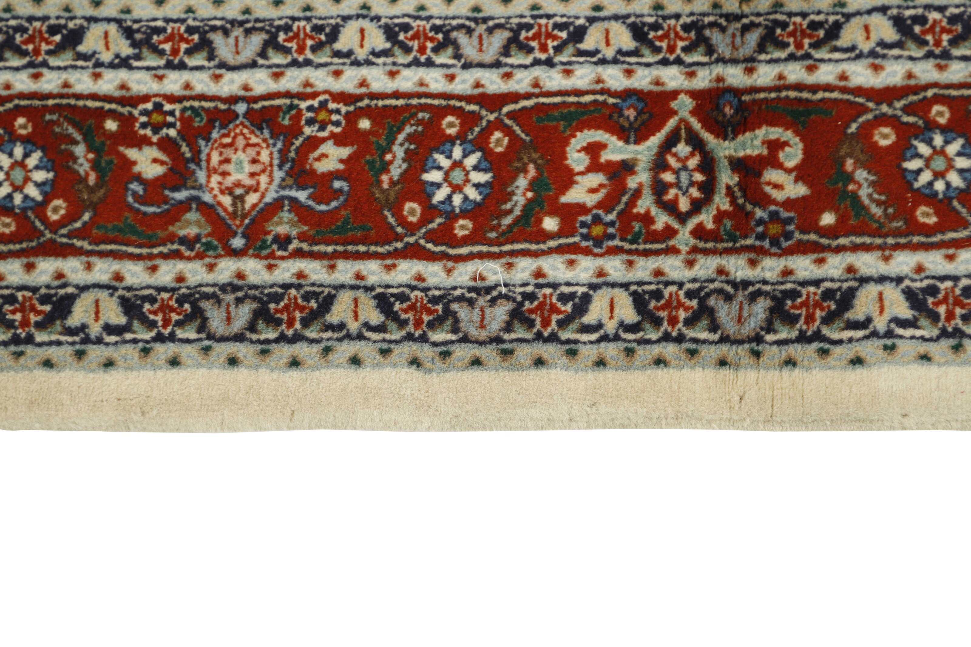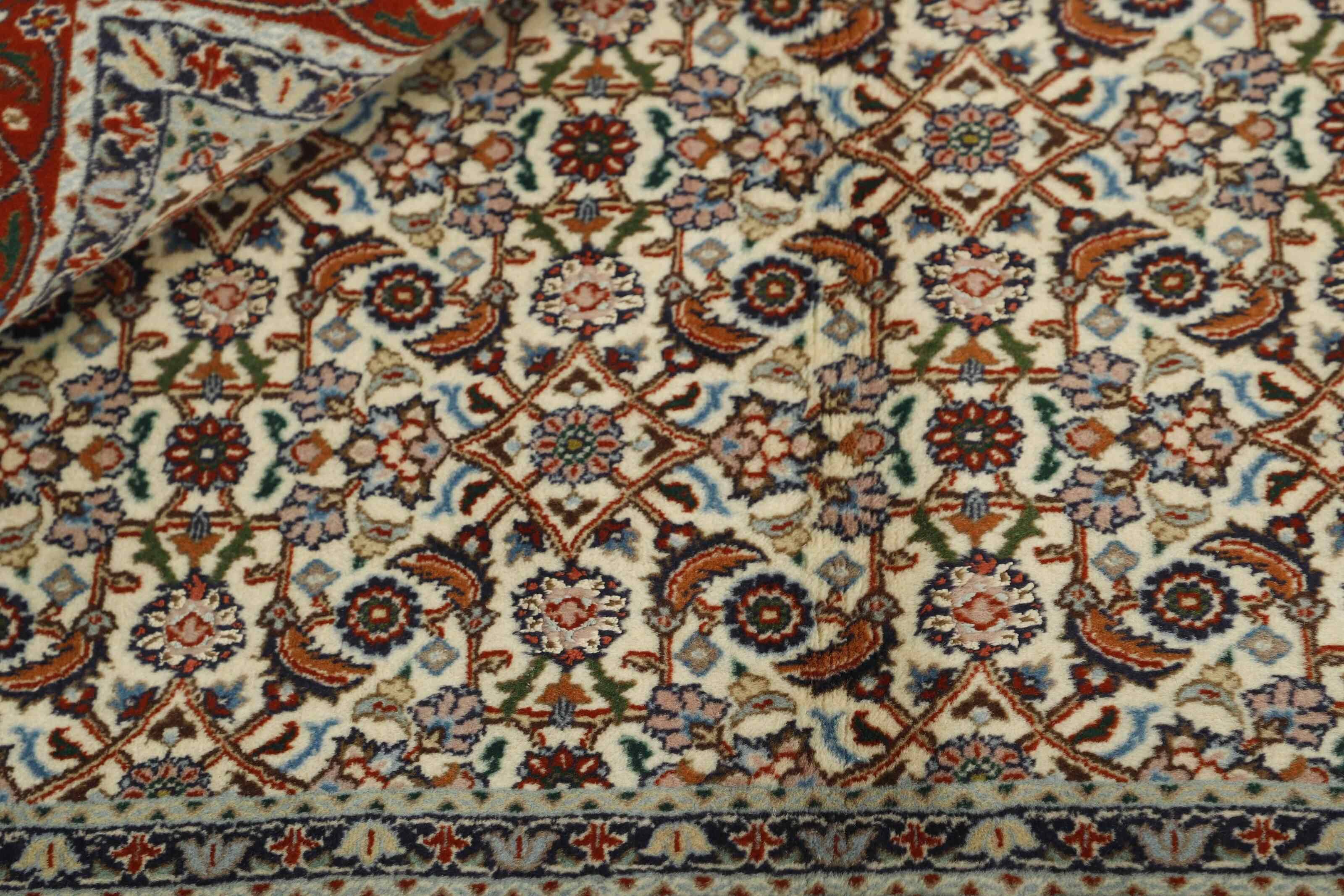 Moud est une petite ville au sud de Mashad, dans la province de Khorrasan. Les tapis de cette région se caractérisent par l'homogénéité de leurs motifs et de leur qualité. La chaîne et la trame sont en coton et le velours en laine. Les bordures sont une version de la bordure persane traditionnelle en tortue. Les tapis sont fabriqués dans toutes les tailles. Les tapis Moud sont souvent copiés en Inde, en raison de leur remarquable homogénéité. Les motifs caractéristiques de Moud sont parmi les plus uniformes, les plus réguliers et les plus facilement reconnaissables de la province de Khorrasan. Les Moud Mahi sont fabriqués dans des tons beige, rouge clair ou bleu, avec des motifs Mahi sur toute la surface ou avec un médaillon en forme d'étoile. Mahi signifie poisson et le motif Mahi est le motif le plus couramment utilisé dans les véritables tapis persans. En l'observant de près, vous pouvez voir un étang entouré de quatre poissons.