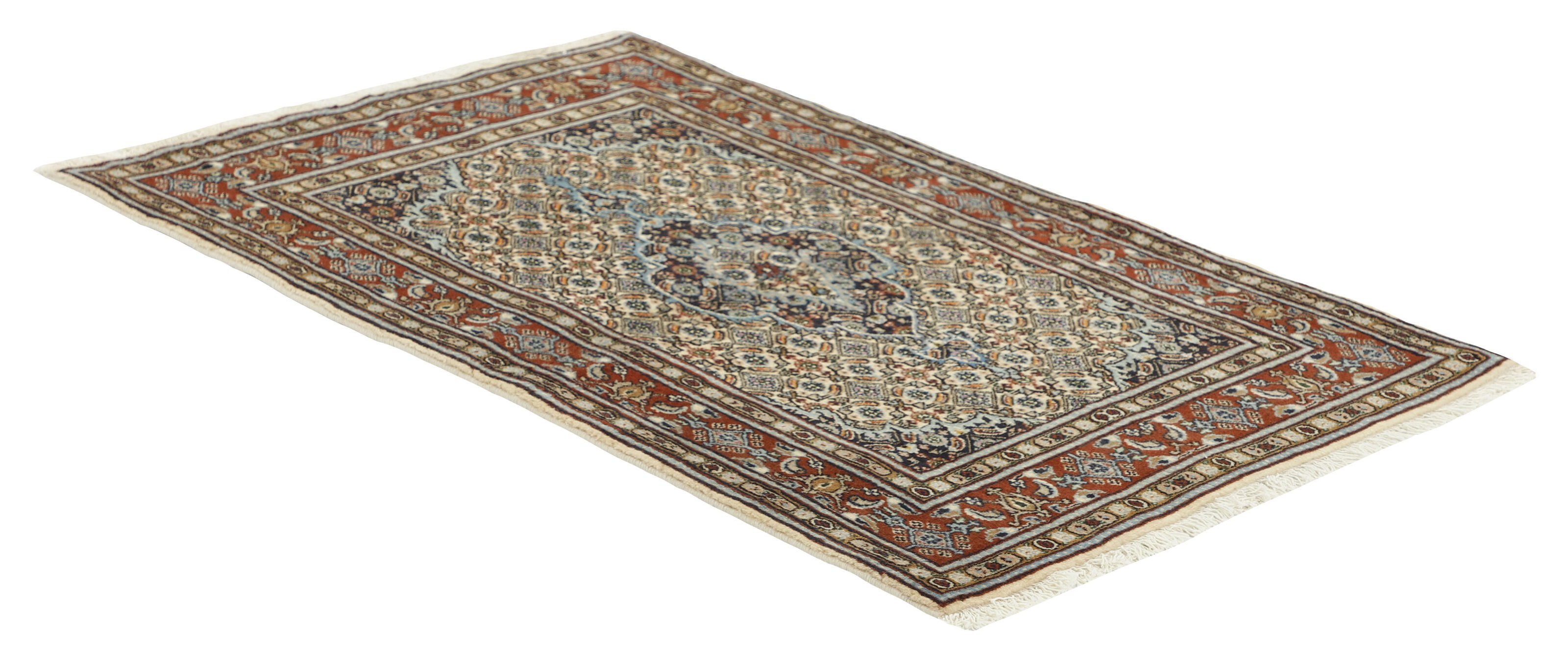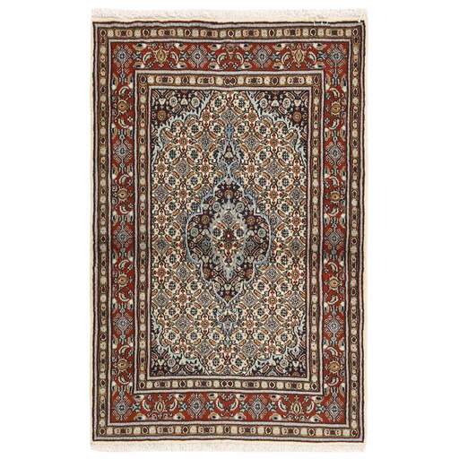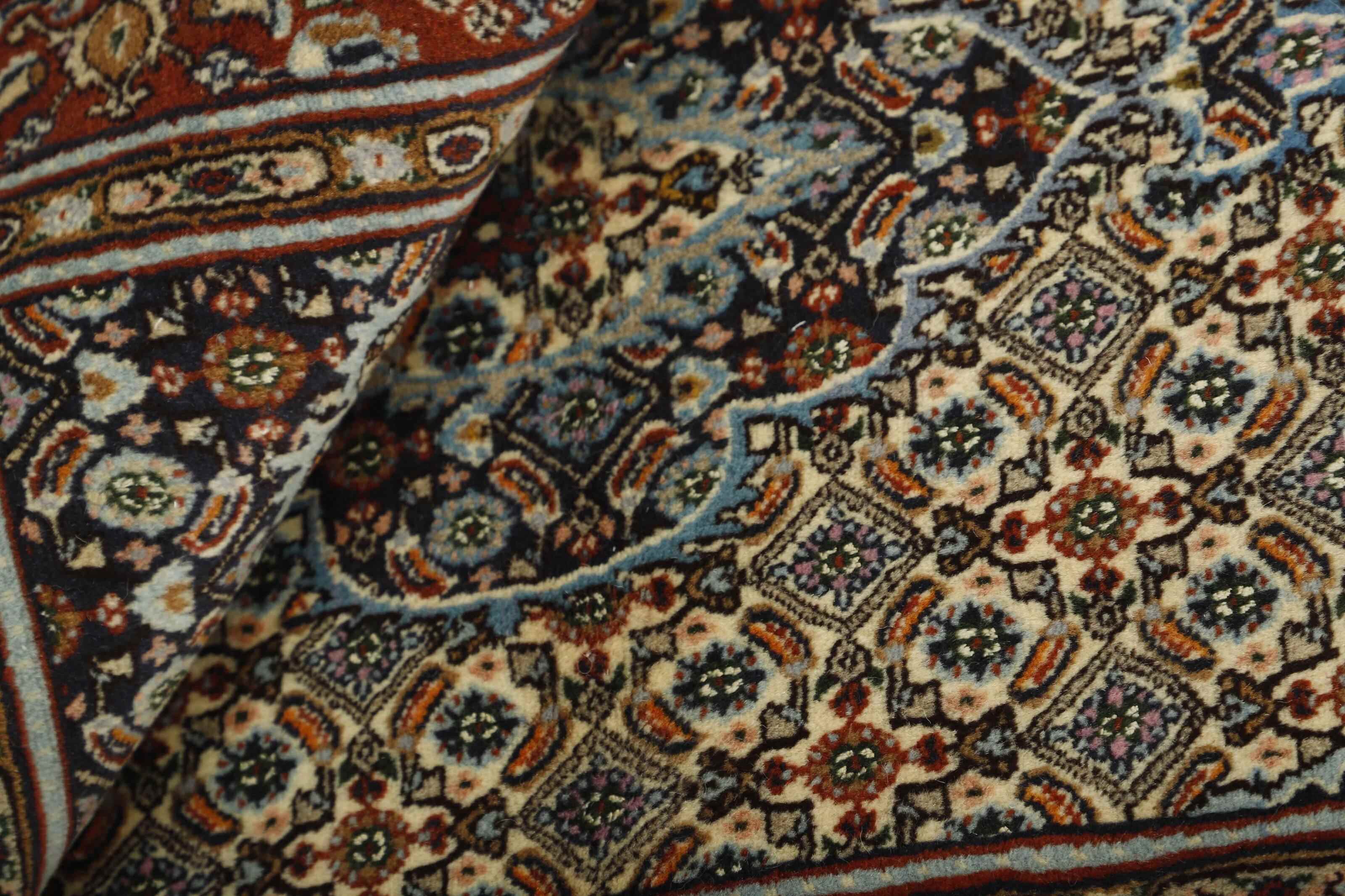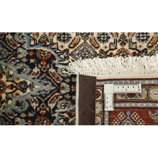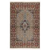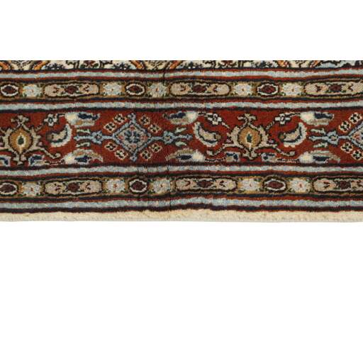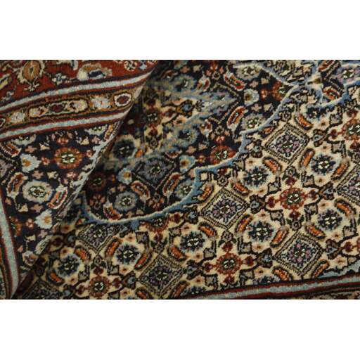Moud est une petite ville au sud de Mashad, dans la province de Khorrasan. Les tapis de cette région se caractérisent par l'homogénéité de leurs motifs et de leur qualité. La chaîne et la trame sont en coton et le velours en laine. Les bordures sont une version de la bordure persane traditionnelle en tortue. Les tapis sont fabriqués dans toutes les tailles. Les tapis Moud sont souvent copiés en Inde, en raison de leur remarquable homogénéité. Les motifs caractéristiques de Moud sont parmi les plus uniformes, les plus réguliers et les plus facilement reconnaissables de la province de Khorrasan. Les Moud Mahi sont fabriqués dans des tons beige, rouge clair ou bleu, avec des motifs Mahi sur toute la surface ou avec un médaillon en forme d'étoile. Mahi signifie poisson et le motif Mahi est le motif le plus couramment utilisé dans les véritables tapis persans. En l'observant de près, vous pouvez voir un étang entouré de quatre poissons.