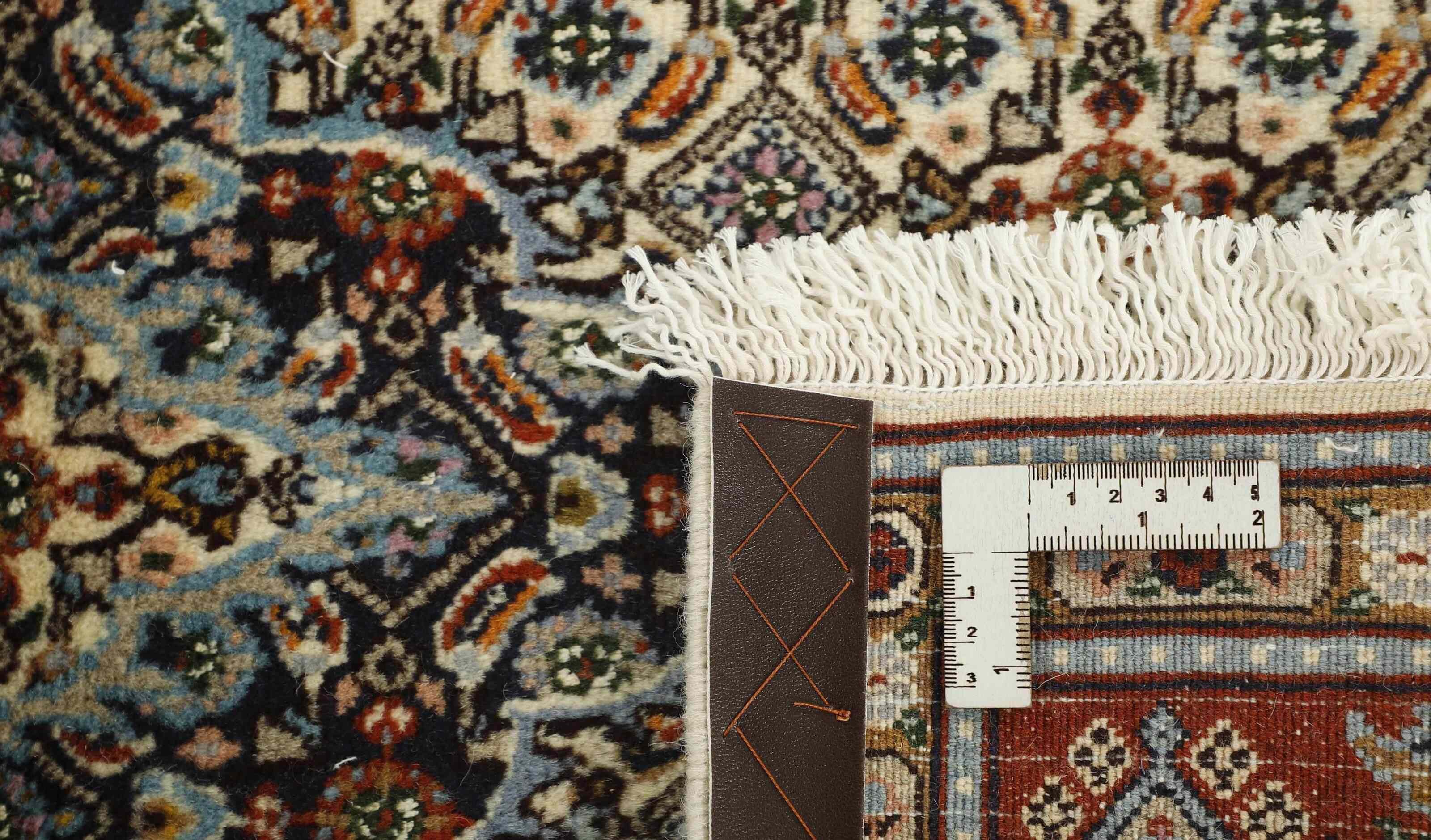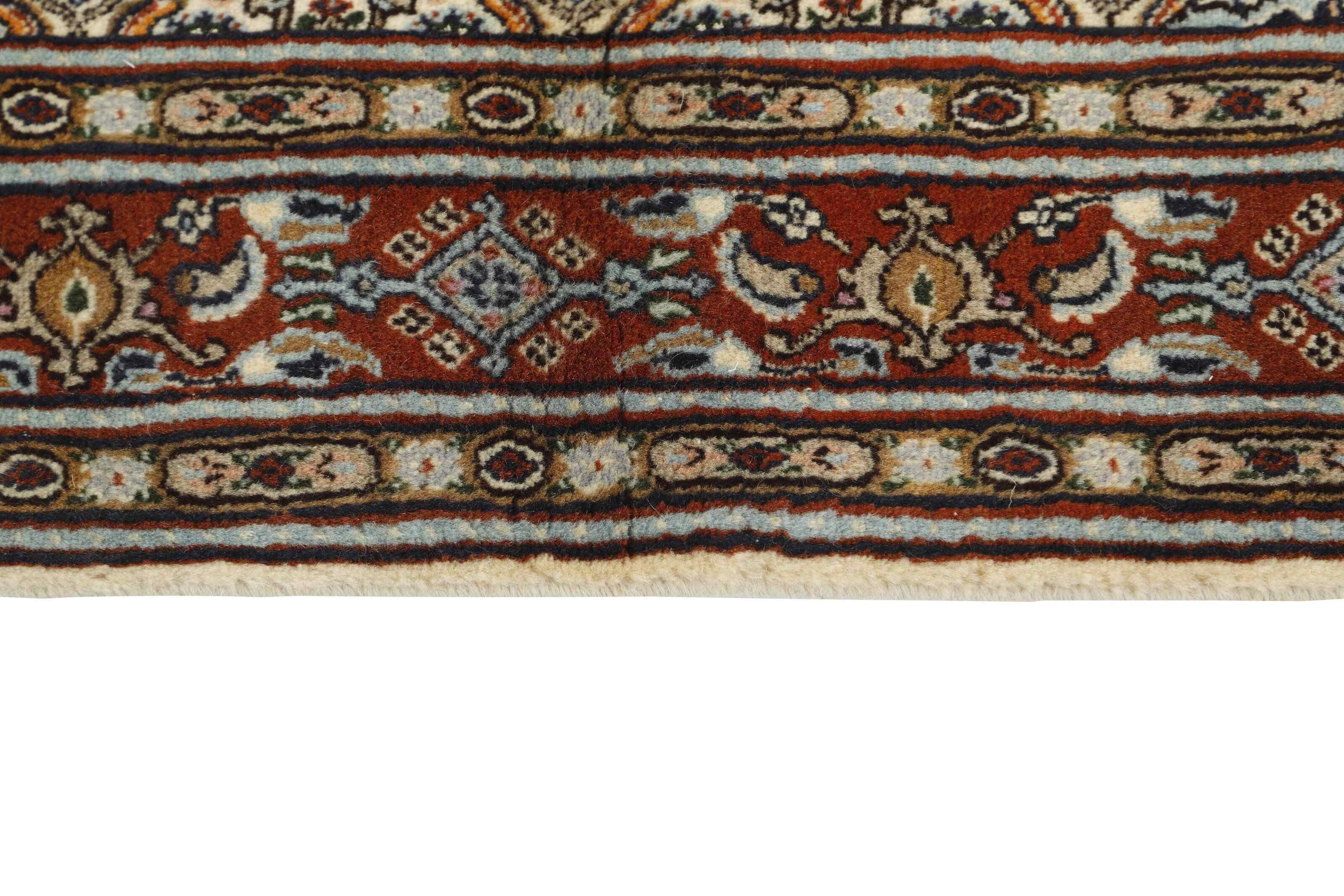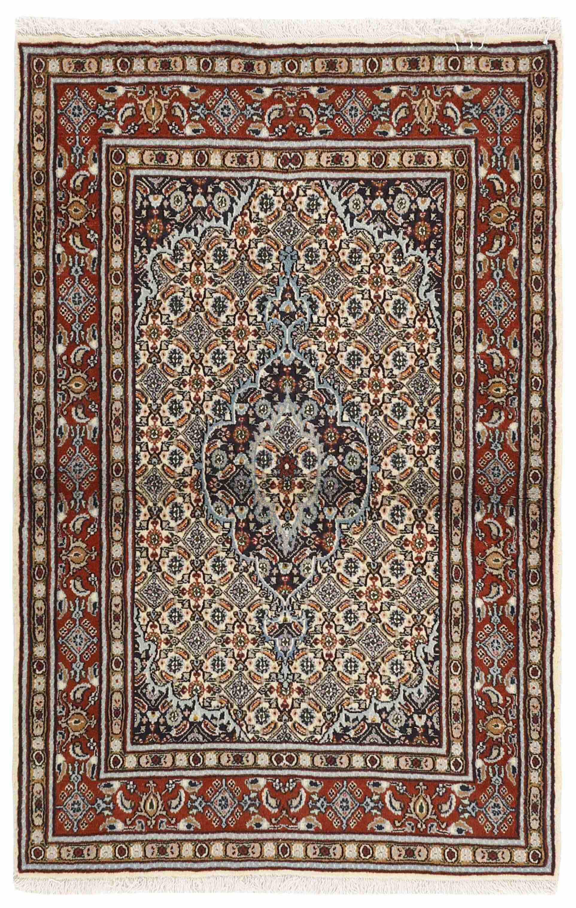 Moud est une petite ville au sud de Mashad, dans la province de Khorrasan. Les tapis de cette région se caractérisent par l'homogénéité de leurs motifs et de leur qualité. La chaîne et la trame sont en coton et le velours en laine. Les bordures sont une version de la bordure persane traditionnelle en tortue. Les tapis sont fabriqués dans toutes les tailles. Les tapis Moud sont souvent copiés en Inde, en raison de leur remarquable homogénéité. Les motifs caractéristiques de Moud sont parmi les plus uniformes, les plus réguliers et les plus facilement reconnaissables de la province de Khorrasan. Les Moud Mahi sont fabriqués dans des tons beige, rouge clair ou bleu, avec des motifs Mahi sur toute la surface ou avec un médaillon en forme d'étoile. Mahi signifie poisson et le motif Mahi est le motif le plus couramment utilisé dans les véritables tapis persans. En l'observant de près, vous pouvez voir un étang entouré de quatre poissons.