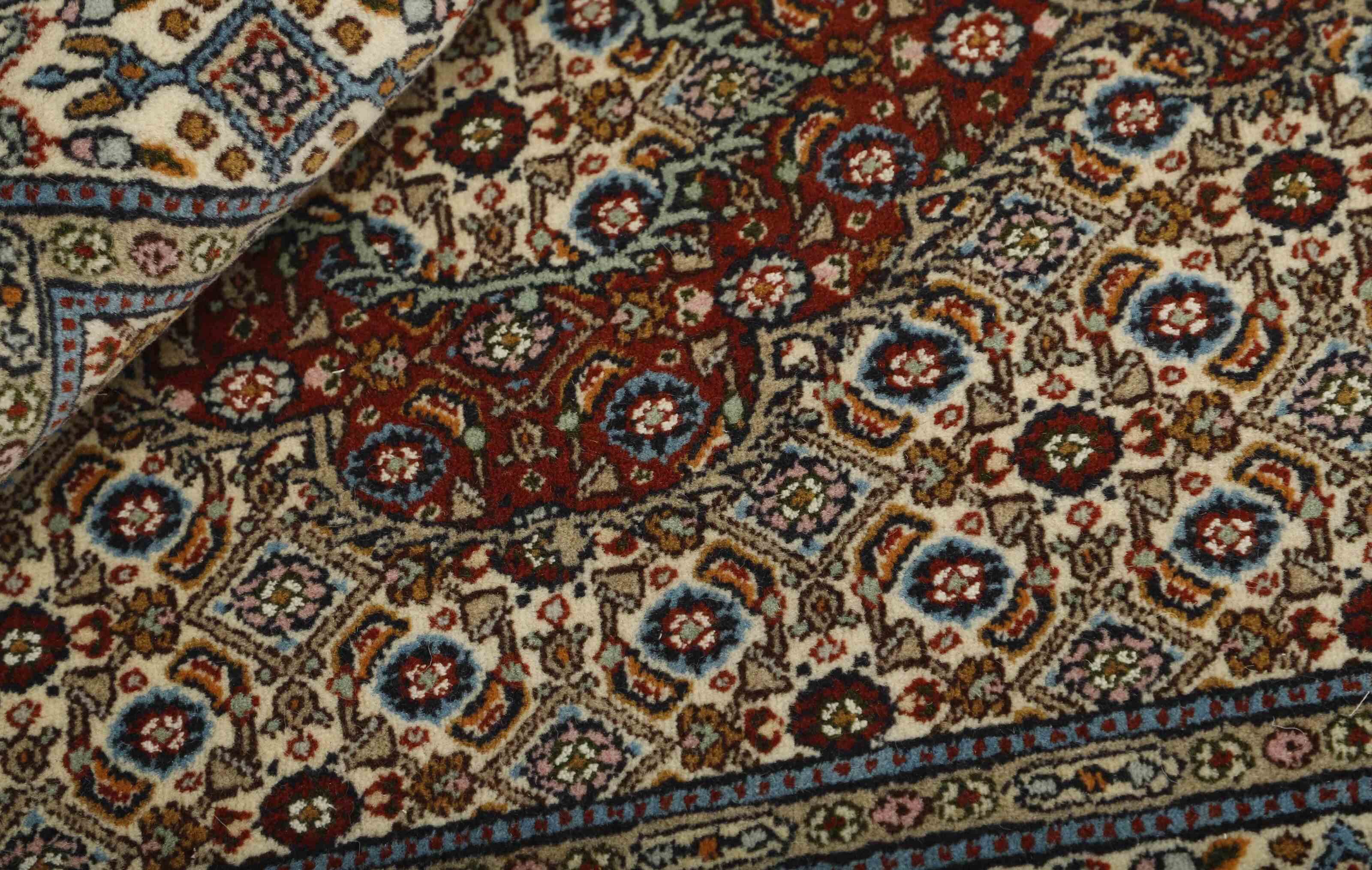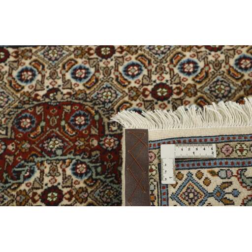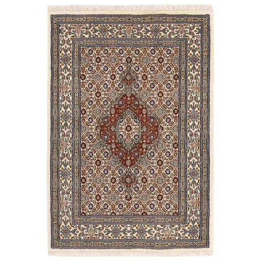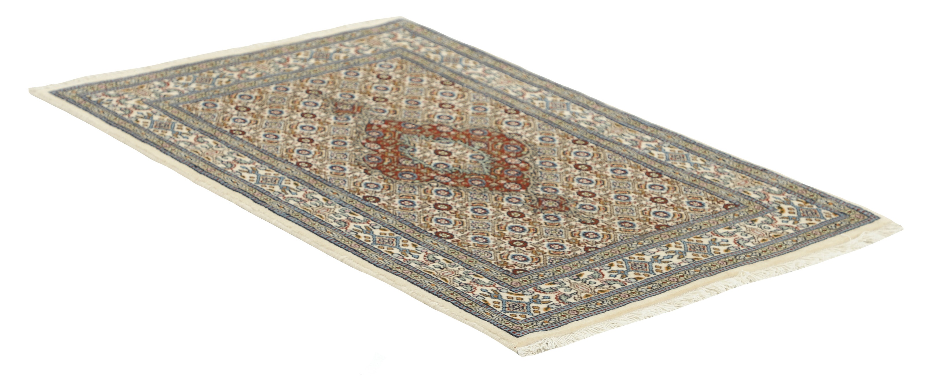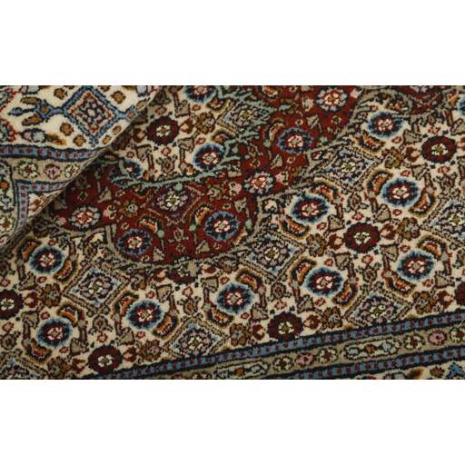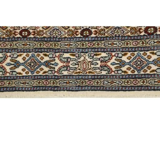 Moud est une petite ville au sud de Mashad, dans la province de Khorrasan. Les tapis de cette région se caractérisent par l'homogénéité de leurs motifs et de leur qualité. La chaîne et la trame sont en coton et le velours en laine. Les bordures sont une version de la bordure persane traditionnelle en tortue. Les tapis sont fabriqués dans toutes les tailles. Les tapis Moud sont souvent copiés en Inde, en raison de leur remarquable homogénéité. Les motifs caractéristiques de Moud sont parmi les plus uniformes, les plus réguliers et les plus facilement reconnaissables de la province de Khorrasan. Les Moud Mahi sont fabriqués dans des tons beige, rouge clair ou bleu, avec des motifs Mahi sur toute la surface ou avec un médaillon en forme d'étoile. Mahi signifie poisson et le motif Mahi est le motif le plus couramment utilisé dans les véritables tapis persans. En l'observant de près, vous pouvez voir un étang entouré de quatre poissons.