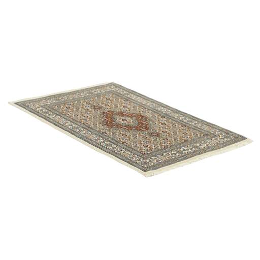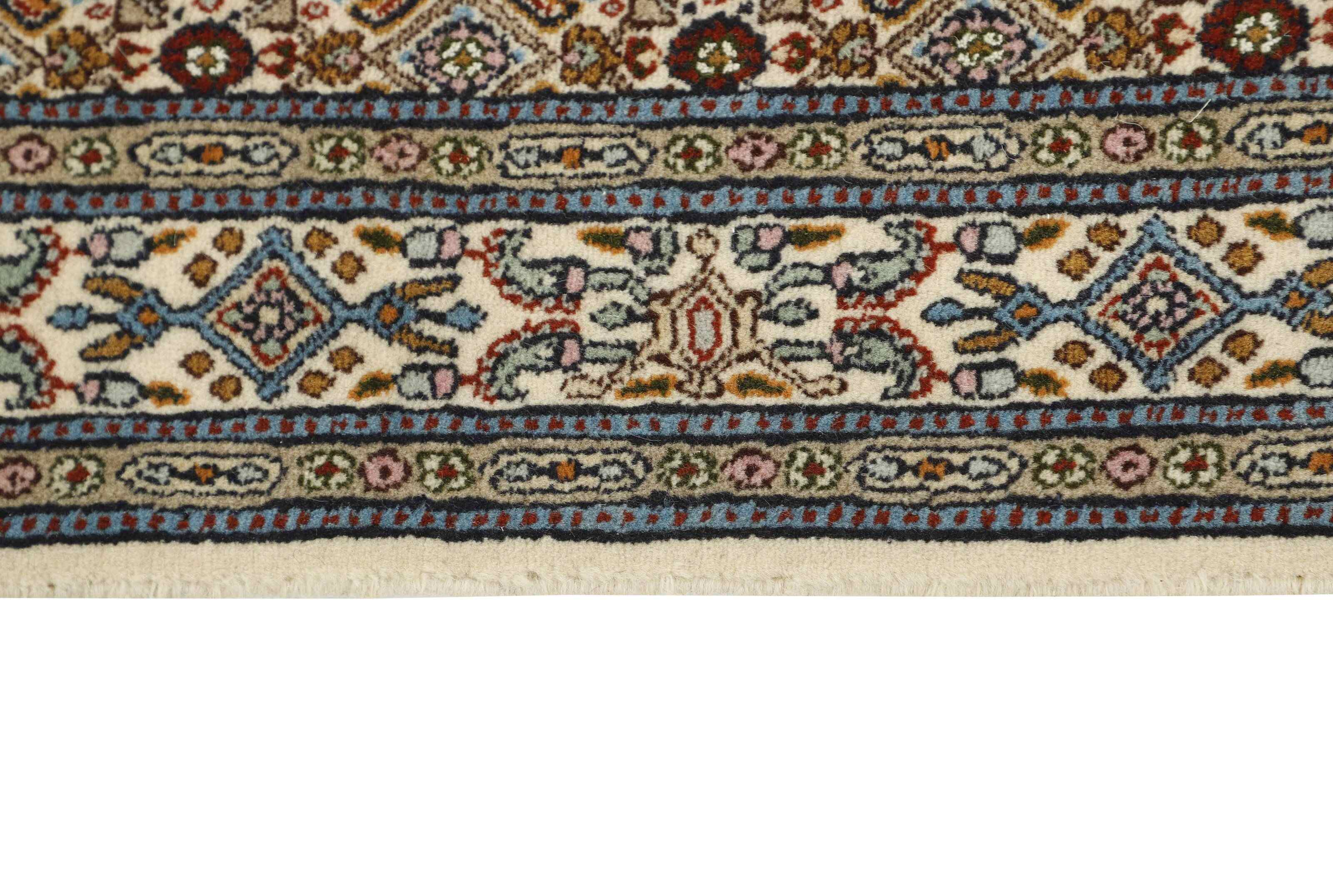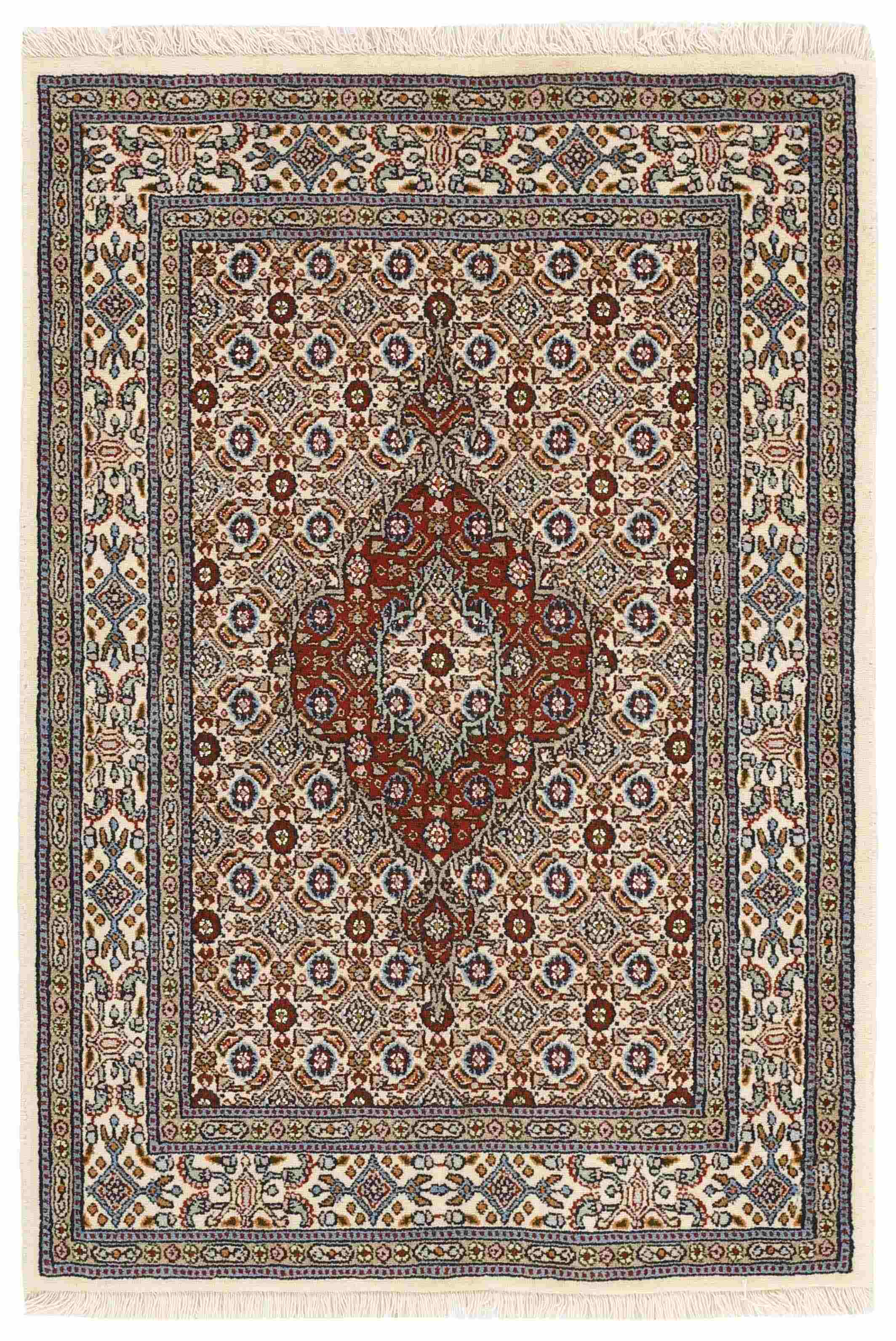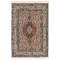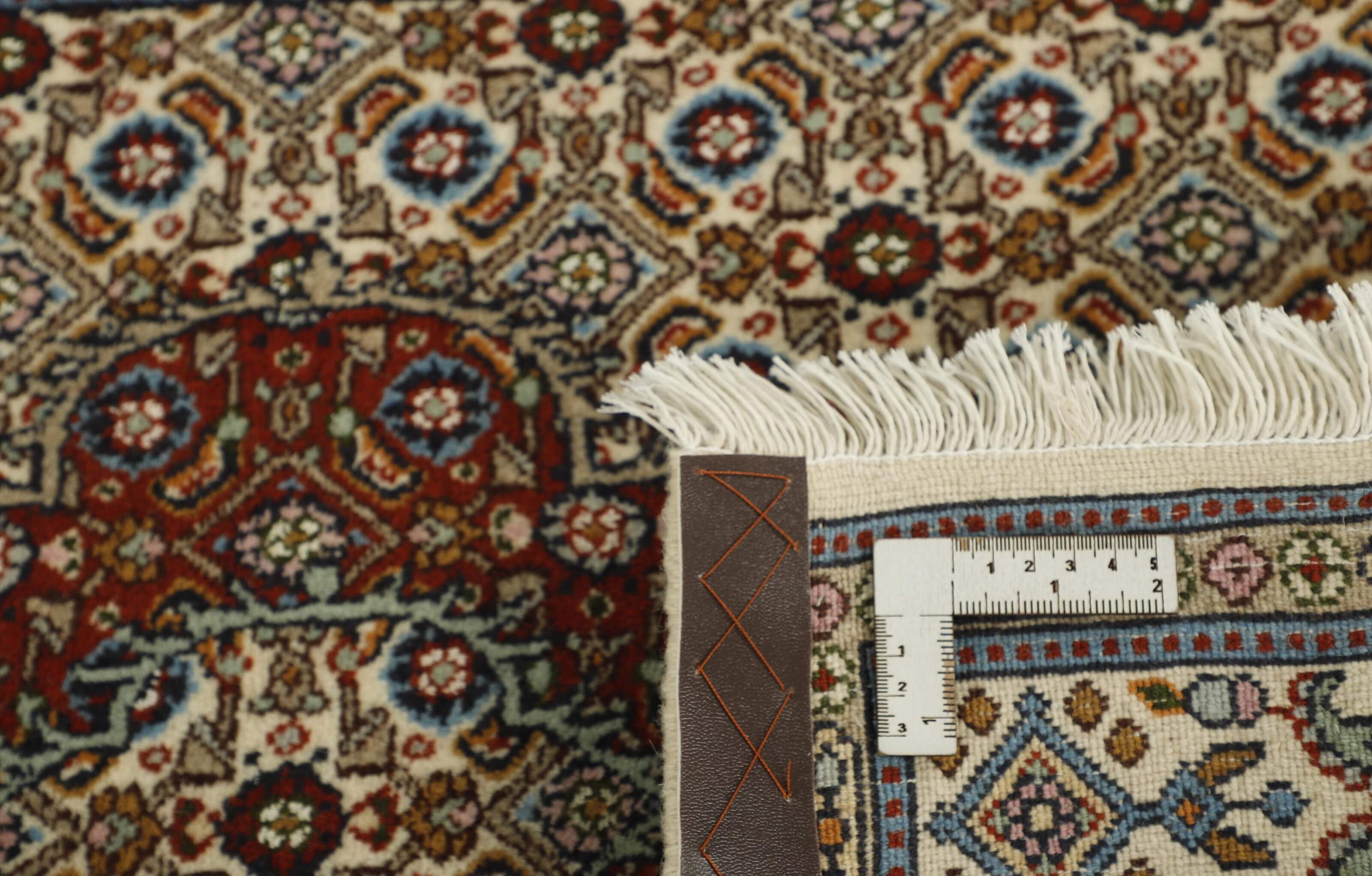 Moud est une petite ville au sud de Mashad, dans la province de Khorrasan. Les tapis de cette région se caractérisent par l'homogénéité de leurs motifs et de leur qualité. La chaîne et la trame sont en coton et le velours en laine. Les bordures sont une version de la bordure persane traditionnelle en tortue. Les tapis sont fabriqués dans toutes les tailles. Les tapis Moud sont souvent copiés en Inde, en raison de leur remarquable homogénéité. Les motifs caractéristiques de Moud sont parmi les plus uniformes, les plus réguliers et les plus facilement reconnaissables de la province de Khorrasan. Les Moud Mahi sont fabriqués dans des tons beige, rouge clair ou bleu, avec des motifs Mahi sur toute la surface ou avec un médaillon en forme d'étoile. Mahi signifie poisson et le motif Mahi est le motif le plus couramment utilisé dans les véritables tapis persans. En l'observant de près, vous pouvez voir un étang entouré de quatre poissons.