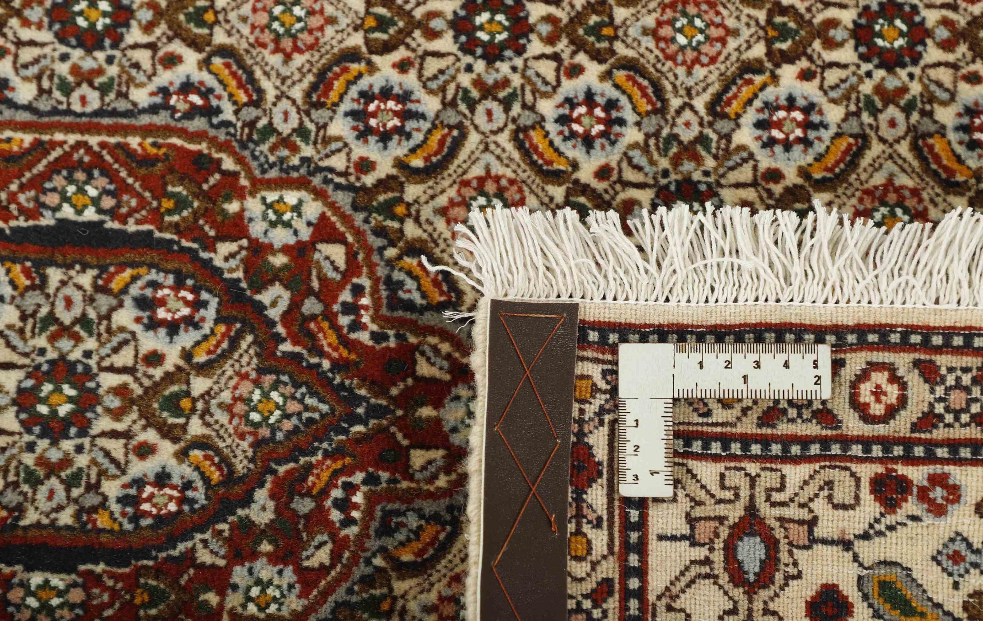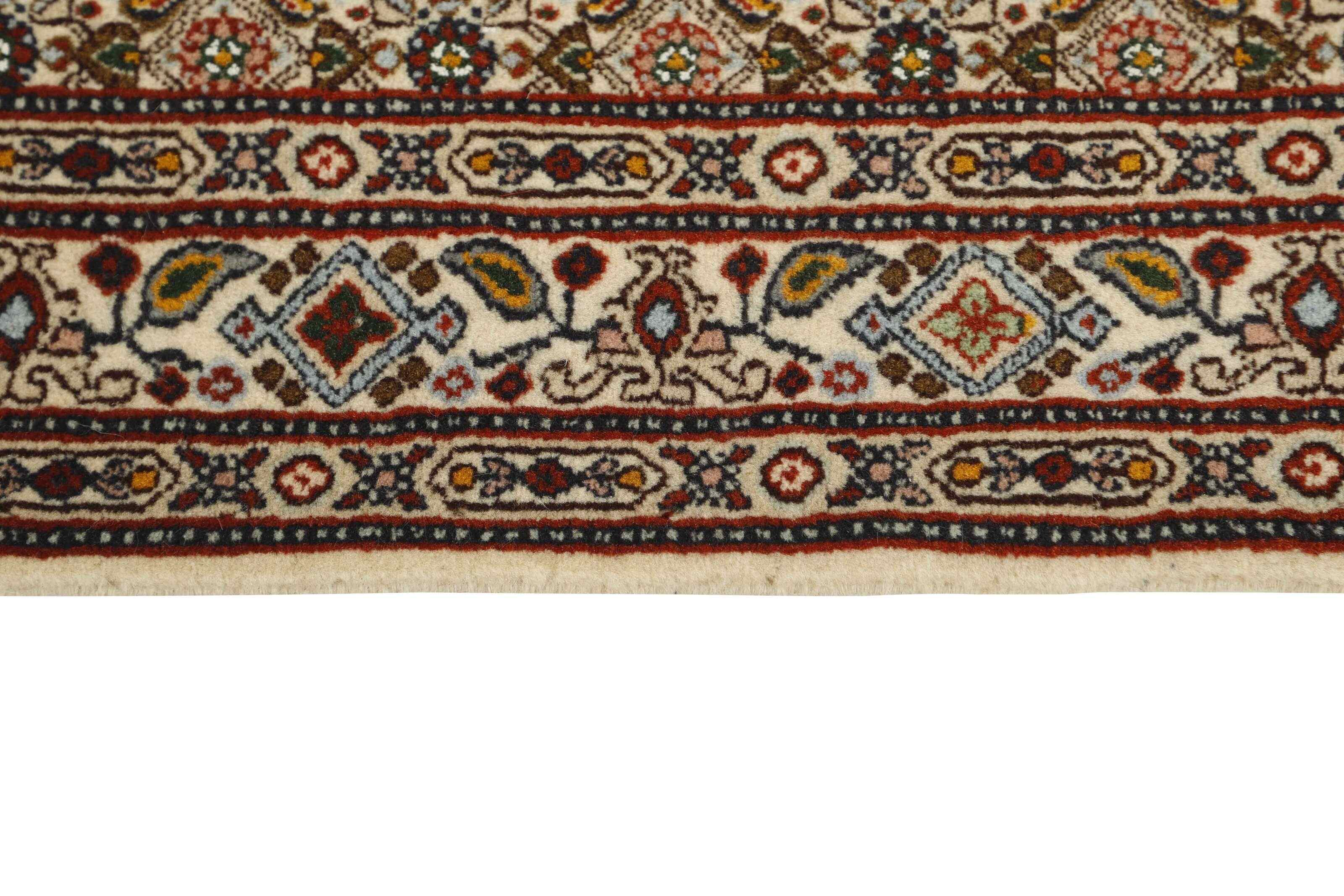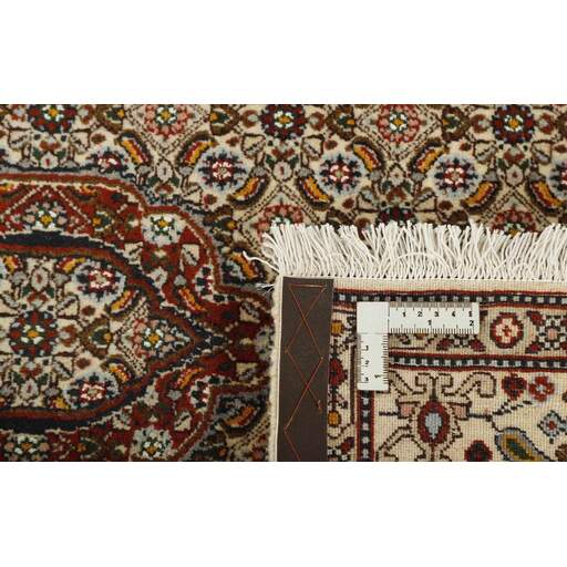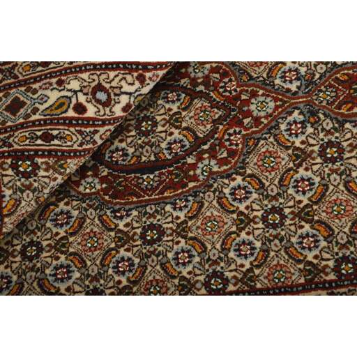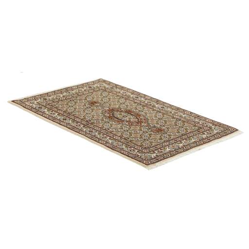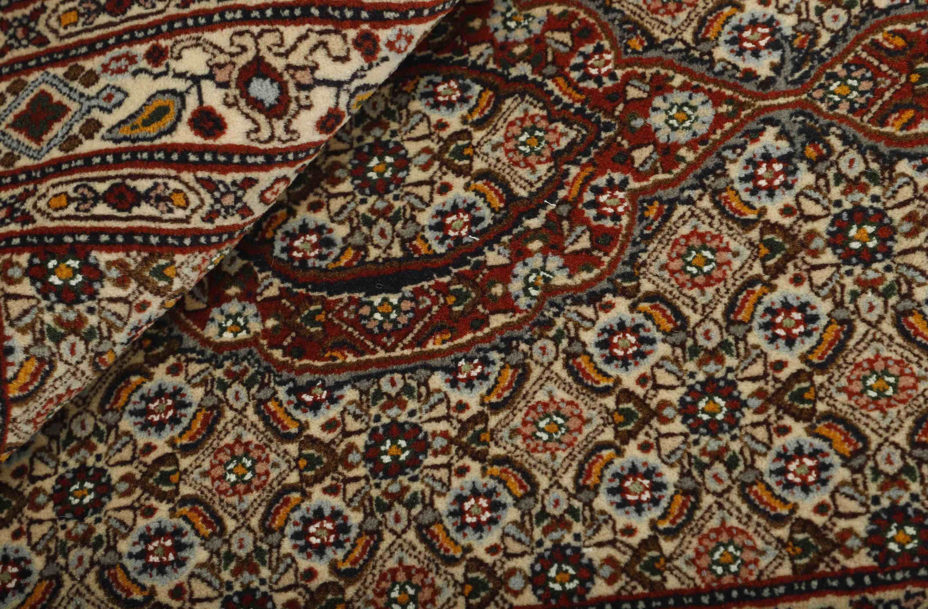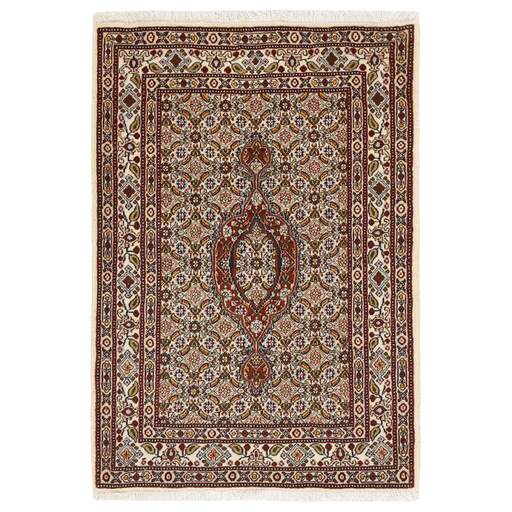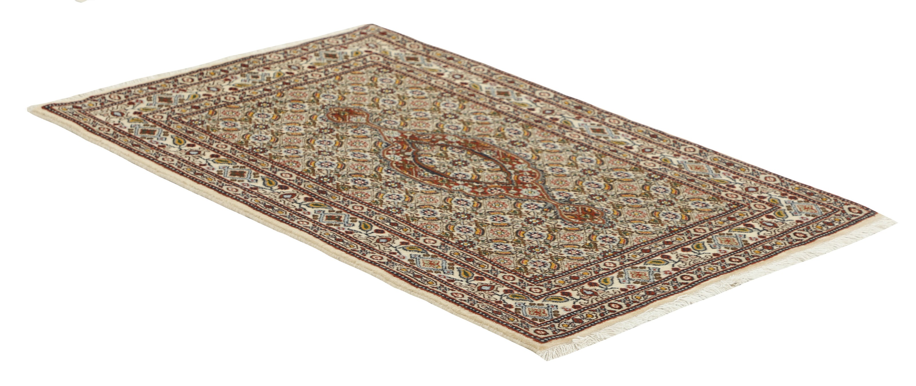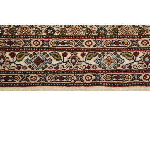 Moud est une petite ville au sud de Mashad, dans la province de Khorrasan. Les tapis de cette région se caractérisent par l'homogénéité de leurs motifs et de leur qualité. La chaîne et la trame sont en coton et le velours en laine. Les bordures sont une version de la bordure persane traditionnelle en tortue. Les tapis sont fabriqués dans toutes les tailles. Les tapis Moud sont souvent copiés en Inde, en raison de leur remarquable homogénéité. Les motifs caractéristiques de Moud sont parmi les plus uniformes, les plus réguliers et les plus facilement reconnaissables de la province de Khorrasan. Les Moud Mahi sont fabriqués dans des tons beige, rouge clair ou bleu, avec des motifs Mahi sur toute la surface ou avec un médaillon en forme d'étoile. Mahi signifie poisson et le motif Mahi est le motif le plus couramment utilisé dans les véritables tapis persans. En l'observant de près, vous pouvez voir un étang entouré de quatre poissons.