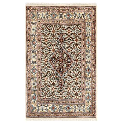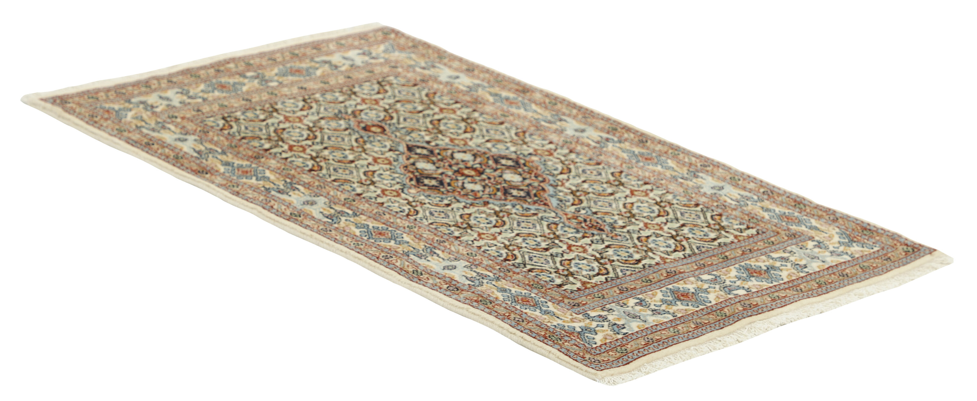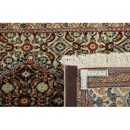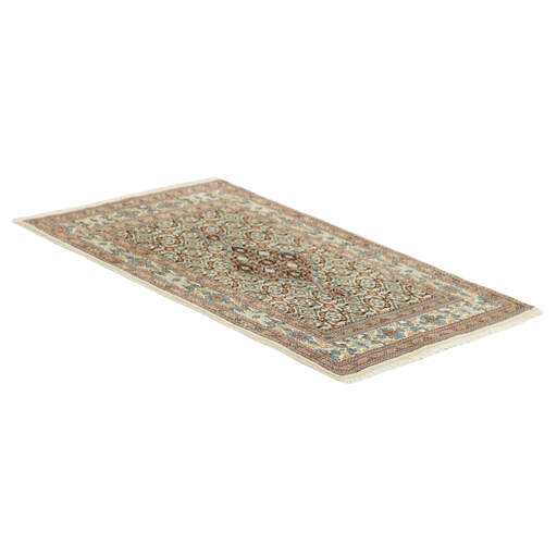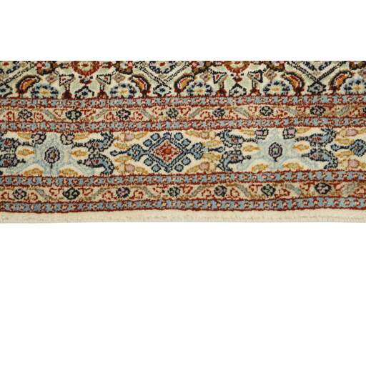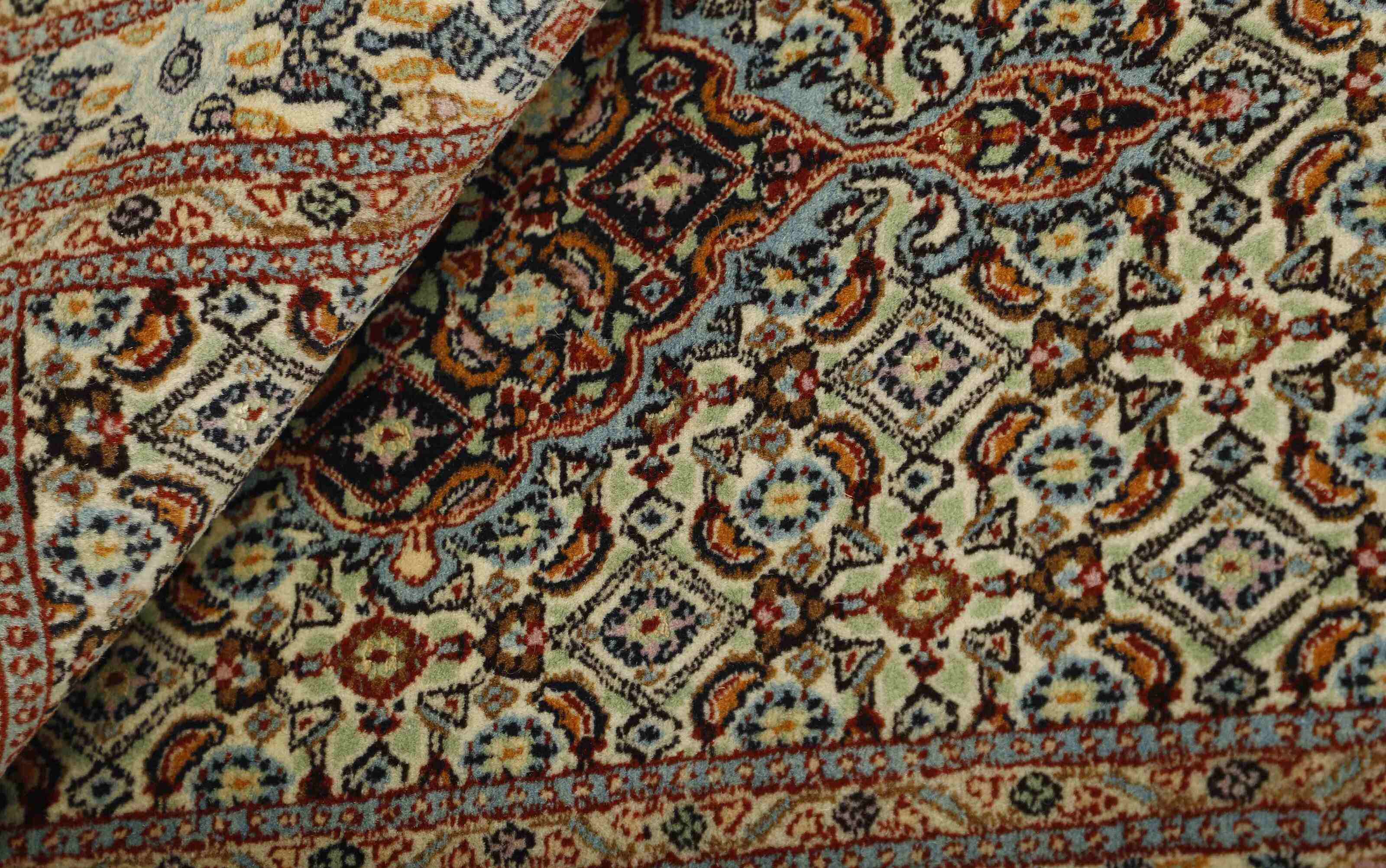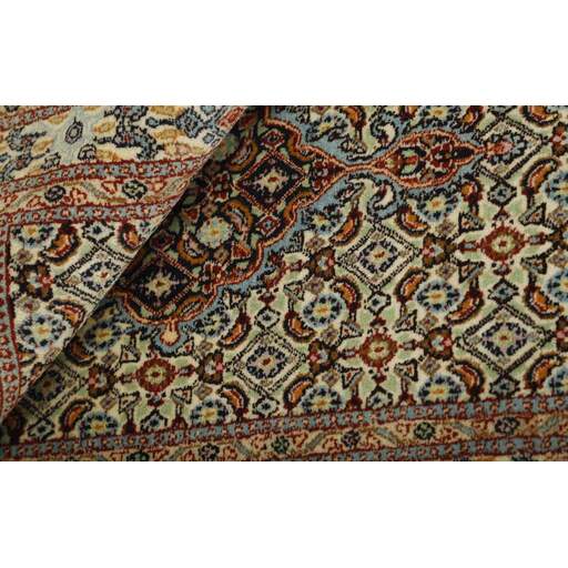 Moud est une petite ville au sud de Mashad, dans la province de Khorrasan. Les tapis de cette région se caractérisent par l'homogénéité de leurs motifs et de leur qualité. La chaîne et la trame sont en coton et le velours en laine. Les bordures sont une version de la bordure persane traditionnelle en tortue. Les tapis sont fabriqués dans toutes les tailles. Les tapis Moud sont souvent copiés en Inde, en raison de leur remarquable homogénéité. Les motifs caractéristiques de Moud sont parmi les plus uniformes, les plus réguliers et les plus facilement reconnaissables de la province de Khorrasan. Les Moud Mahi sont fabriqués dans des tons beige, rouge clair ou bleu, avec des motifs Mahi sur toute la surface ou avec un médaillon en forme d'étoile. Mahi signifie poisson et le motif Mahi est le motif le plus couramment utilisé dans les véritables tapis persans. En l'observant de près, vous pouvez voir un étang entouré de quatre poissons.