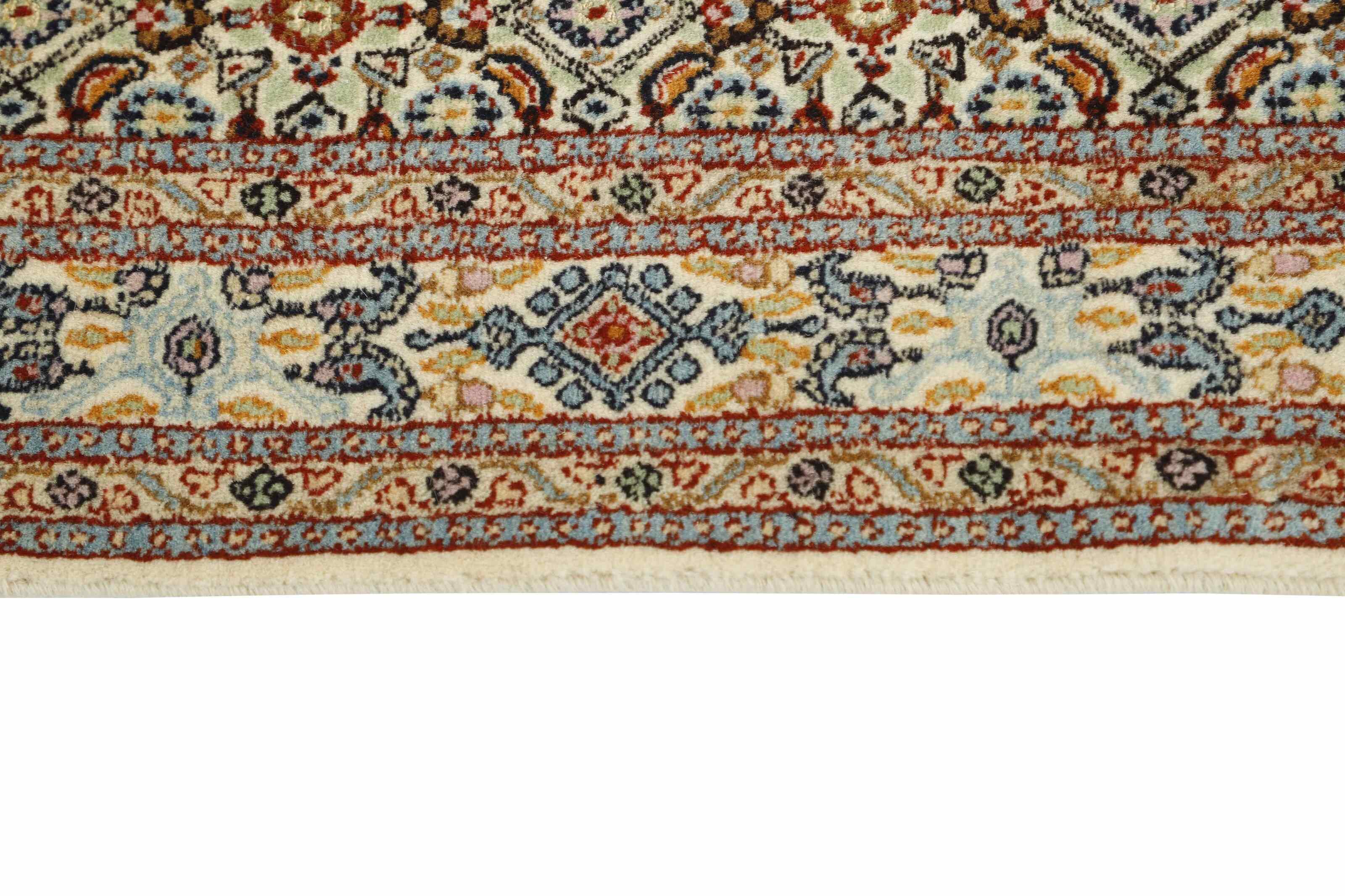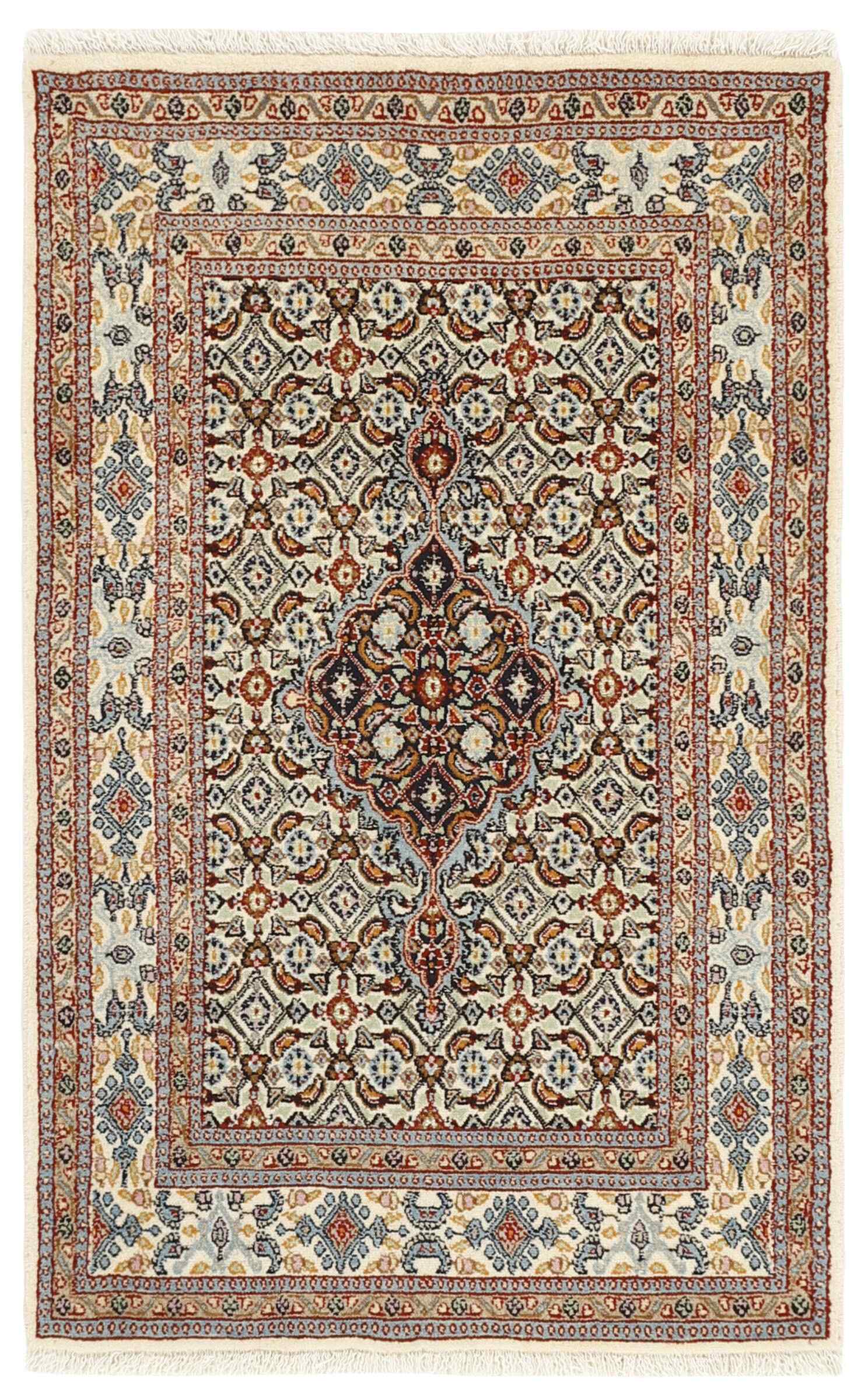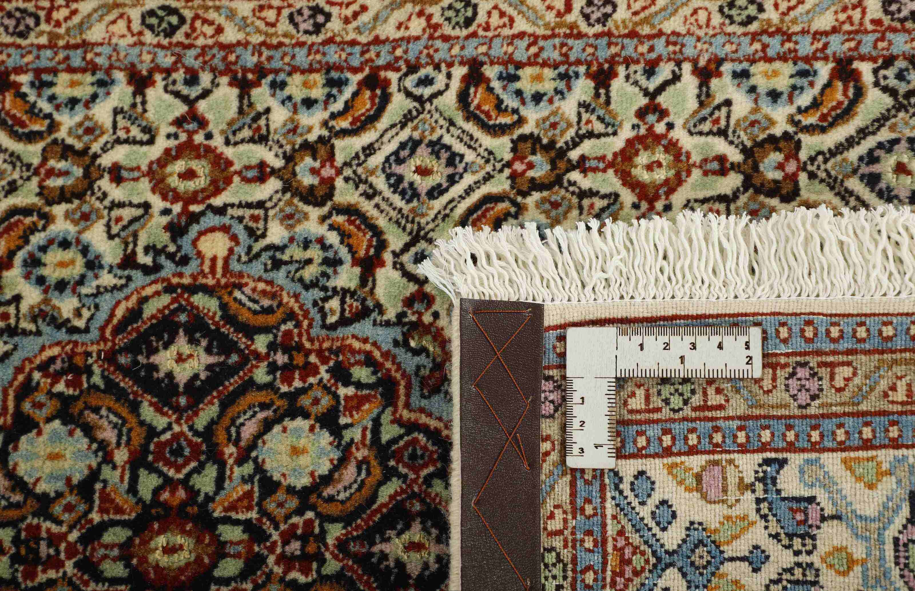 Moud est une petite ville au sud de Mashad, dans la province de Khorrasan. Les tapis de cette région se caractérisent par l'homogénéité de leurs motifs et de leur qualité. La chaîne et la trame sont en coton et le velours en laine. Les bordures sont une version de la bordure persane traditionnelle en tortue. Les tapis sont fabriqués dans toutes les tailles. Les tapis Moud sont souvent copiés en Inde, en raison de leur remarquable homogénéité. Les motifs caractéristiques de Moud sont parmi les plus uniformes, les plus réguliers et les plus facilement reconnaissables de la province de Khorrasan. Les Moud Mahi sont fabriqués dans des tons beige, rouge clair ou bleu, avec des motifs Mahi sur toute la surface ou avec un médaillon en forme d'étoile. Mahi signifie poisson et le motif Mahi est le motif le plus couramment utilisé dans les véritables tapis persans. En l'observant de près, vous pouvez voir un étang entouré de quatre poissons.
