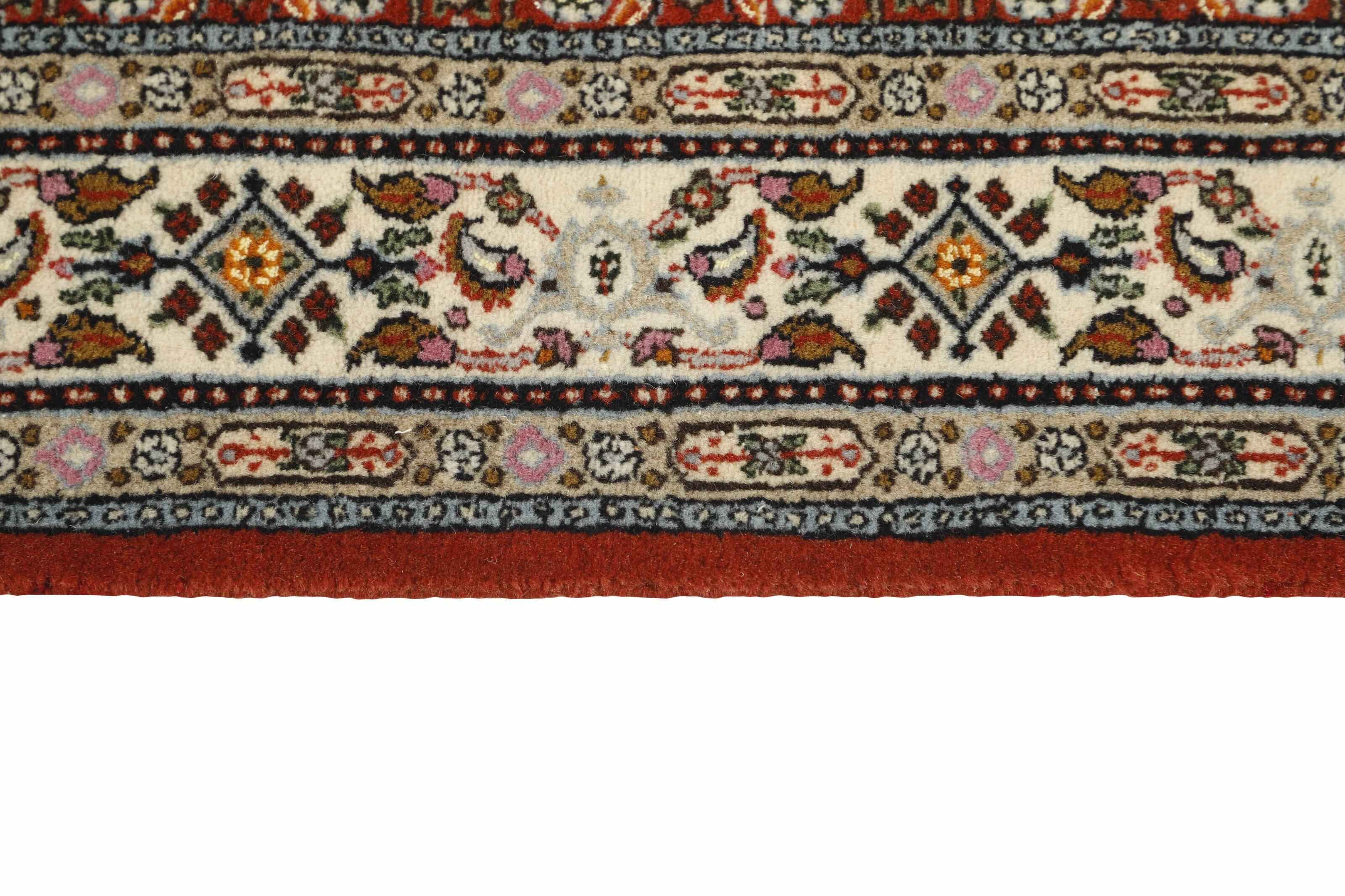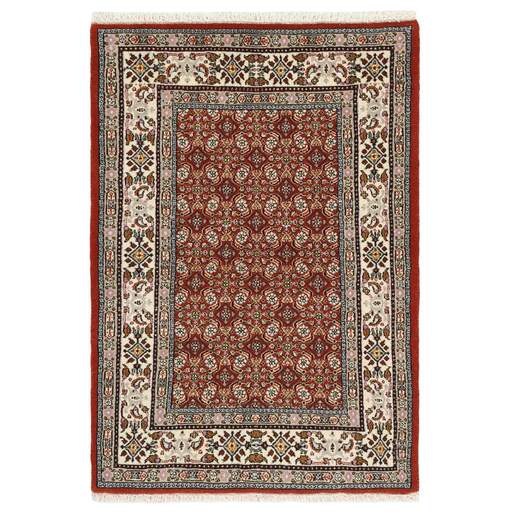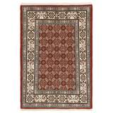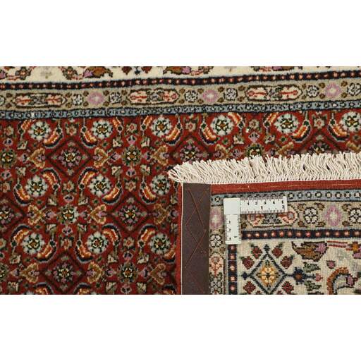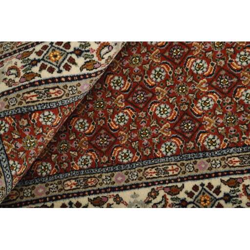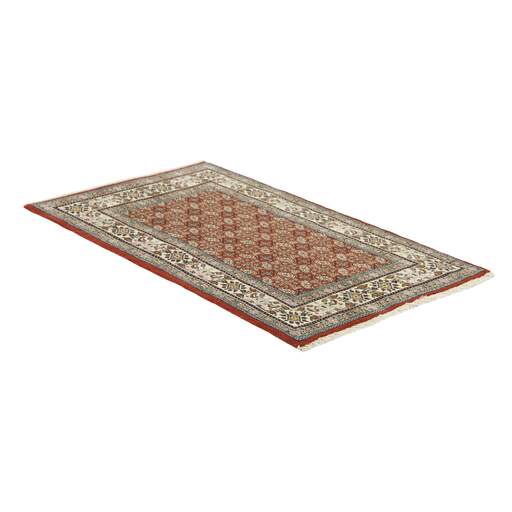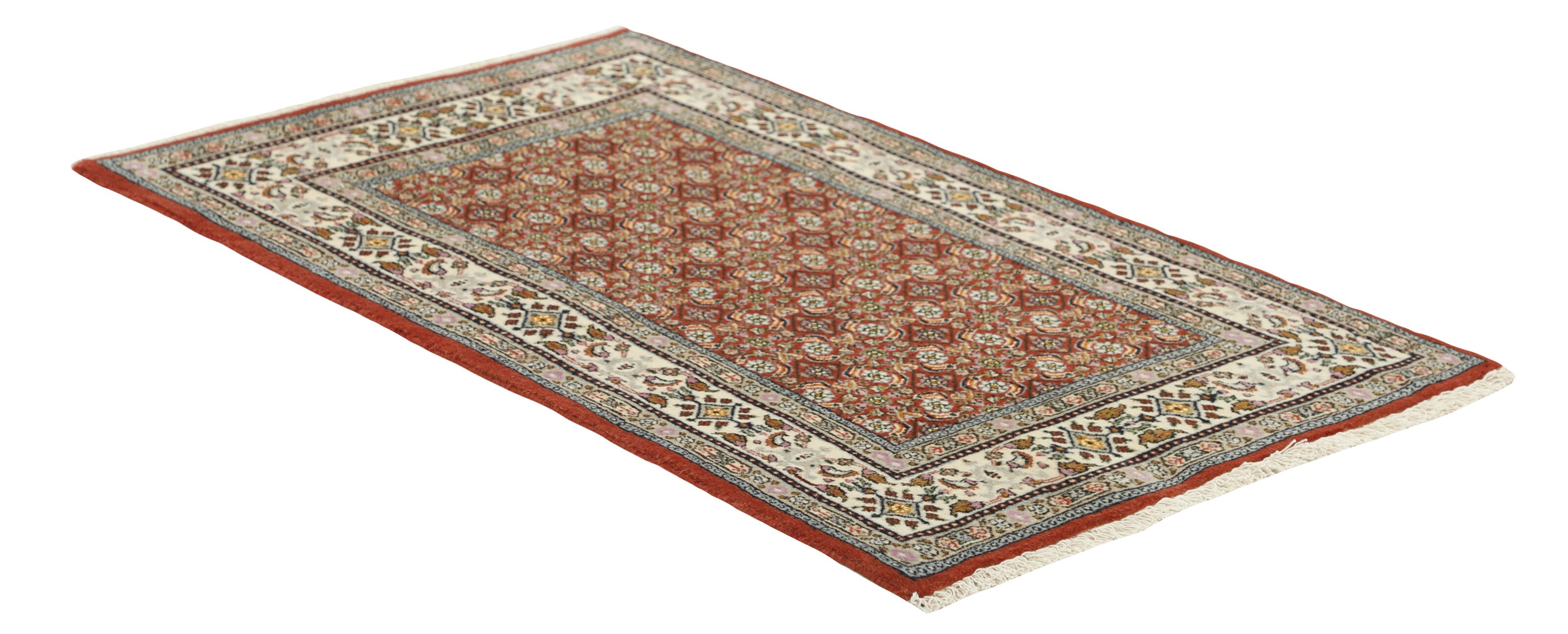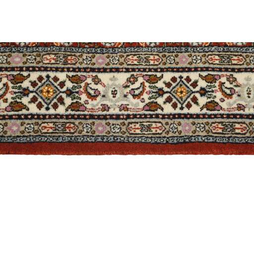 Moud est une petite ville au sud de Mashad, dans la province de Khorrasan. Les tapis de cette région se caractérisent par l'homogénéité de leurs motifs et de leur qualité. La chaîne et la trame sont en coton et le velours en laine. Les bordures sont une version de la bordure persane traditionnelle en tortue. Les tapis sont fabriqués dans toutes les tailles. Les tapis Moud sont souvent copiés en Inde, en raison de leur remarquable homogénéité. Les motifs caractéristiques de Moud sont parmi les plus uniformes, les plus réguliers et les plus facilement reconnaissables de la province de Khorrasan. Les Moud Mahi sont fabriqués dans des tons beige, rouge clair ou bleu, avec des motifs Mahi sur toute la surface ou avec un médaillon en forme d'étoile. Mahi signifie poisson et le motif Mahi est le motif le plus couramment utilisé dans les véritables tapis persans. En l'observant de près, vous pouvez voir un étang entouré de quatre poissons.