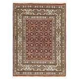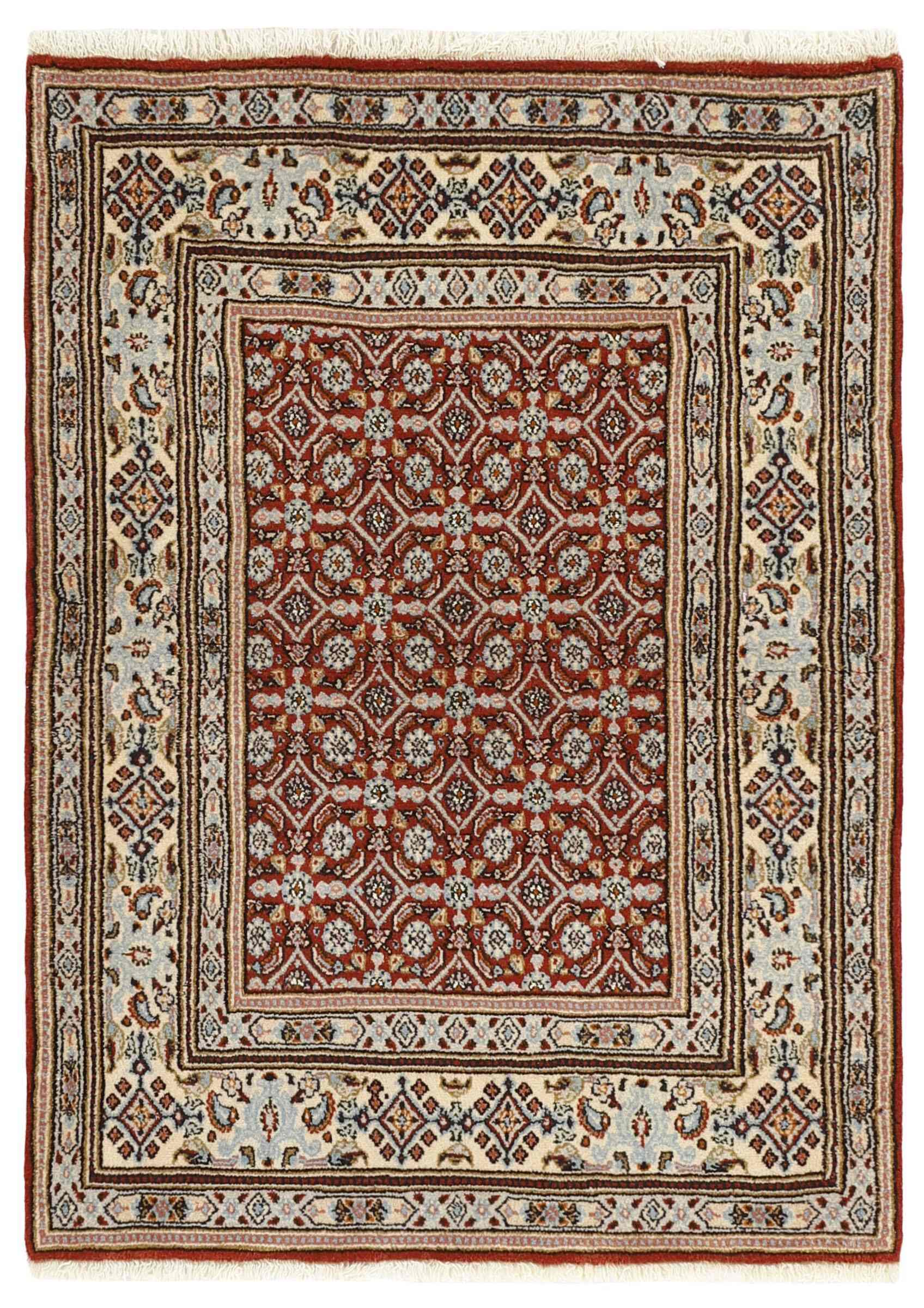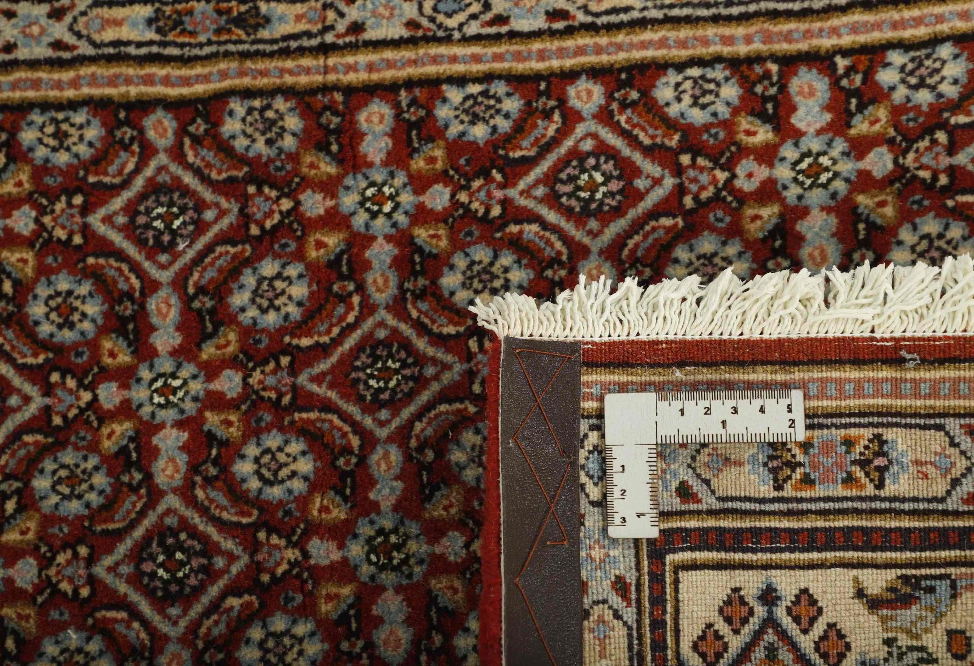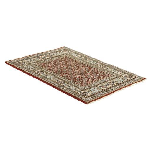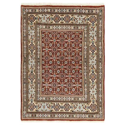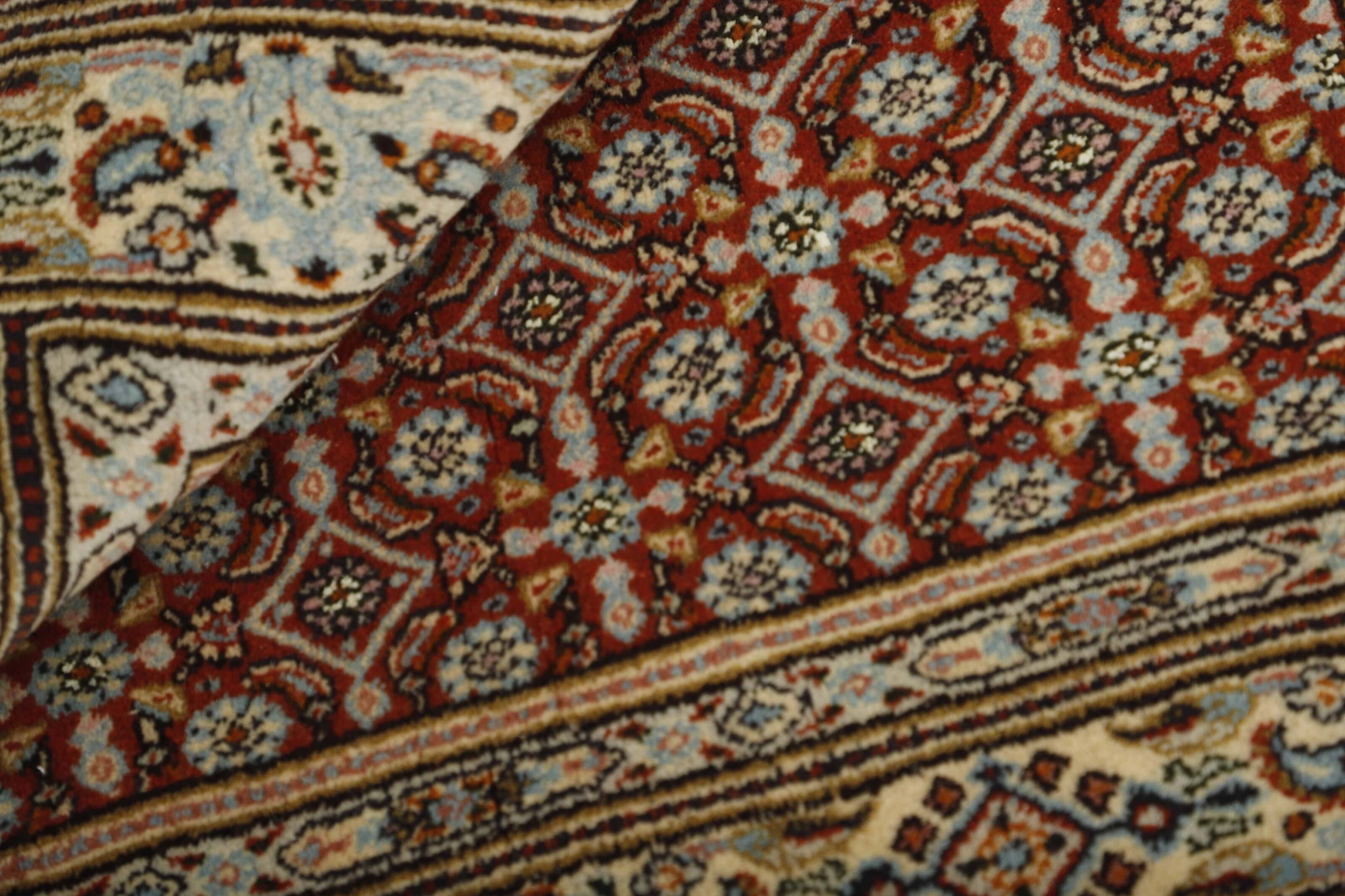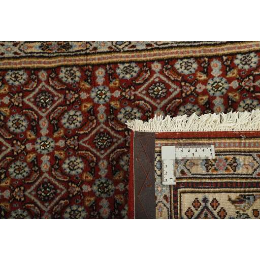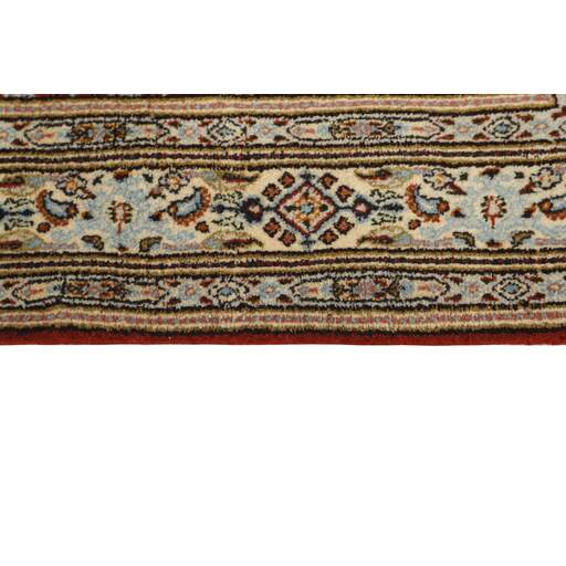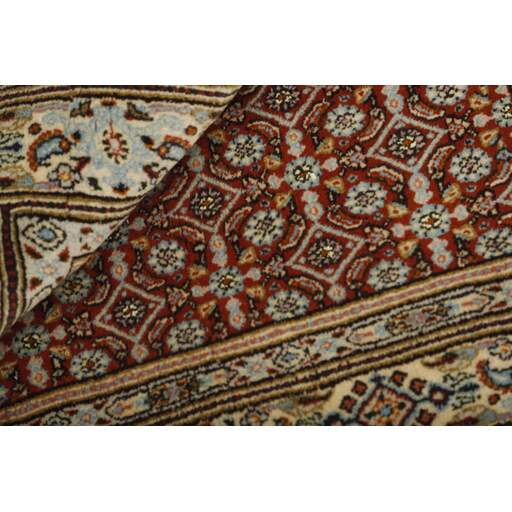 Moud est une petite ville au sud de Mashad, dans la province de Khorrasan. Les tapis de cette région se caractérisent par l'homogénéité de leurs motifs et de leur qualité. La chaîne et la trame sont en coton et le velours en laine. Les bordures sont une version de la bordure persane traditionnelle en tortue. Les tapis sont fabriqués dans toutes les tailles. Les tapis Moud sont souvent copiés en Inde, en raison de leur remarquable homogénéité. Les motifs caractéristiques de Moud sont parmi les plus uniformes, les plus réguliers et les plus facilement reconnaissables de la province de Khorrasan. Les Moud Mahi sont fabriqués dans des tons beige, rouge clair ou bleu, avec des motifs Mahi sur toute la surface ou avec un médaillon en forme d'étoile. Mahi signifie poisson et le motif Mahi est le motif le plus couramment utilisé dans les véritables tapis persans. En l'observant de près, vous pouvez voir un étang entouré de quatre poissons.