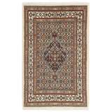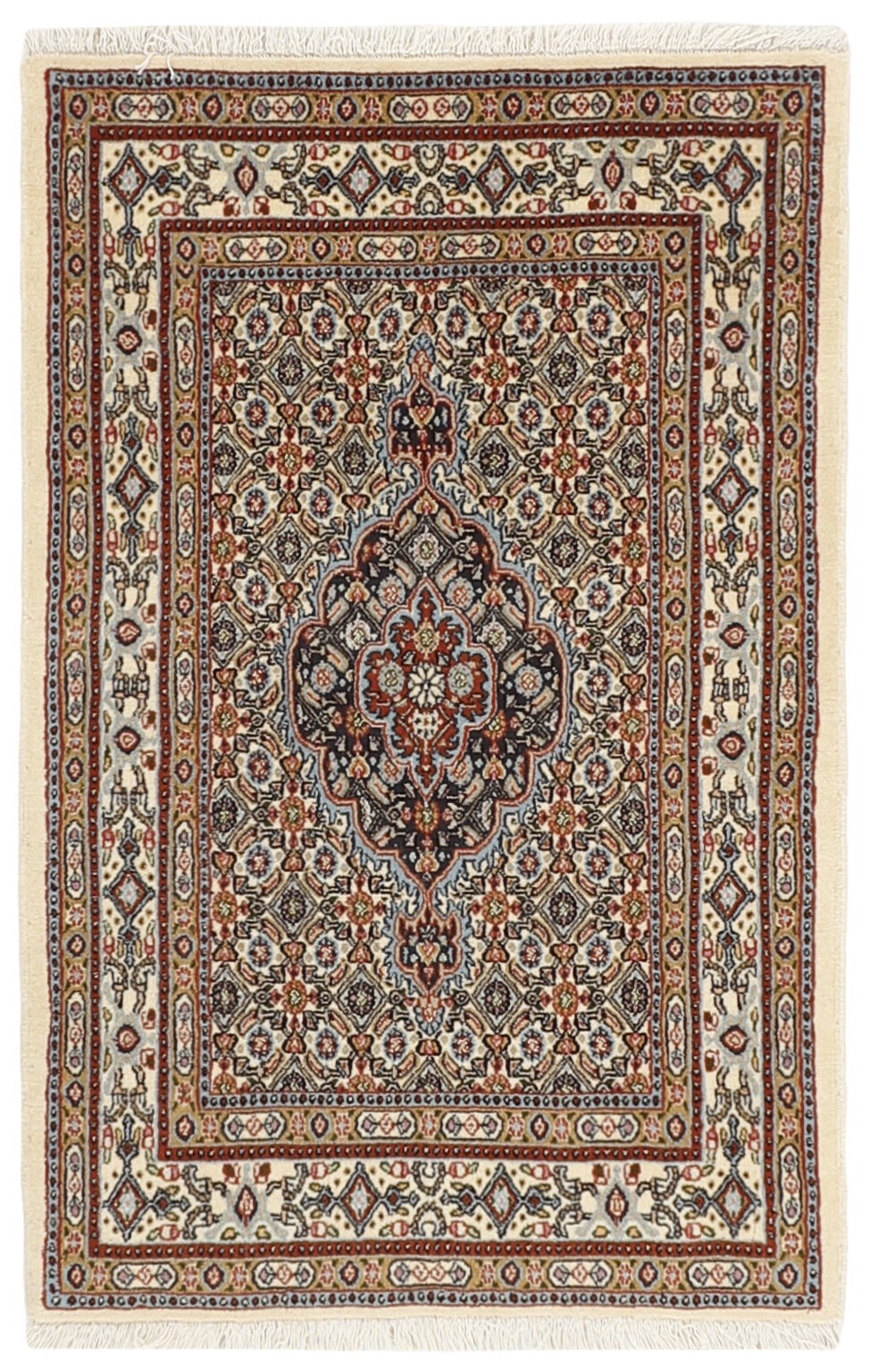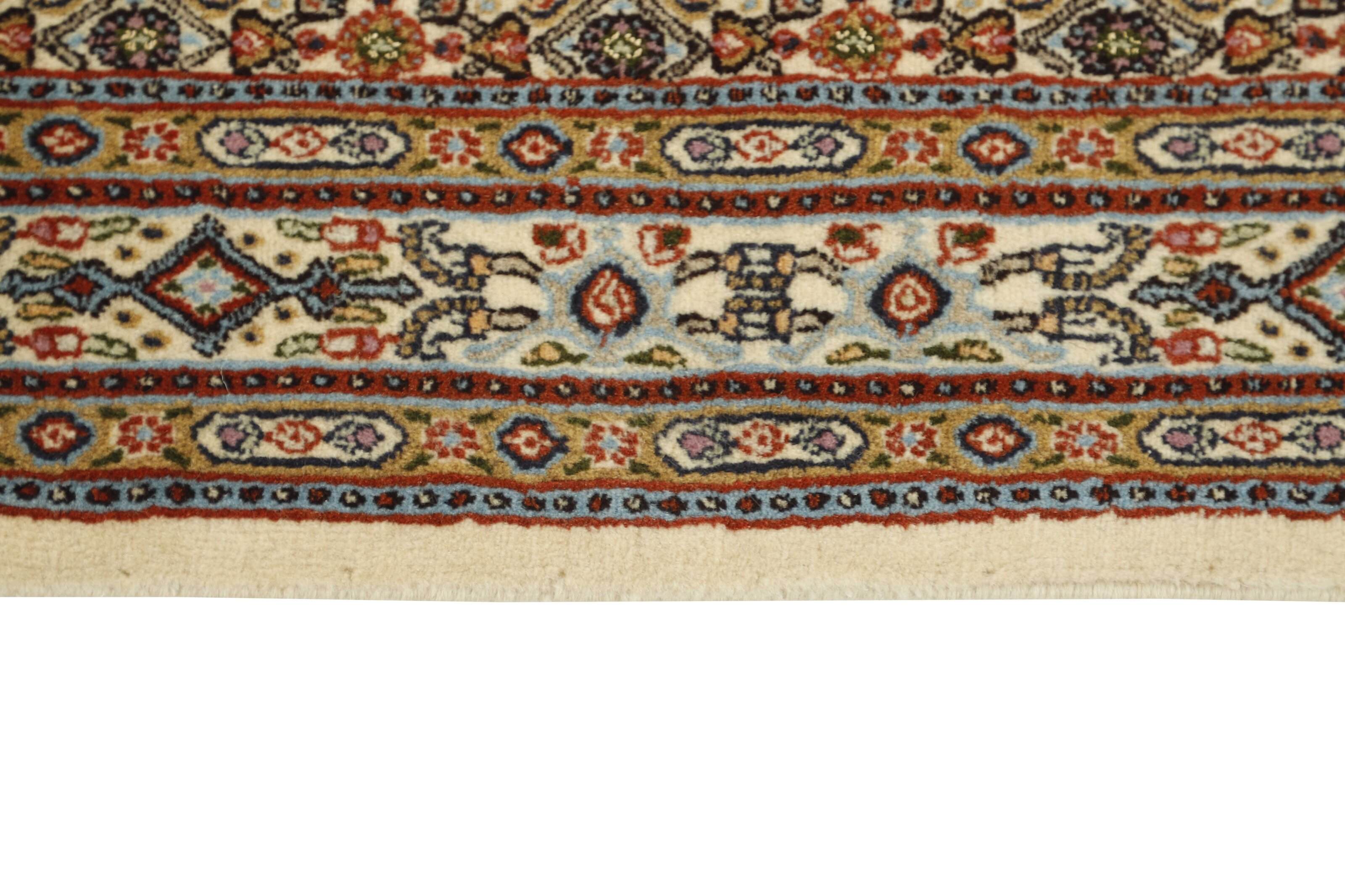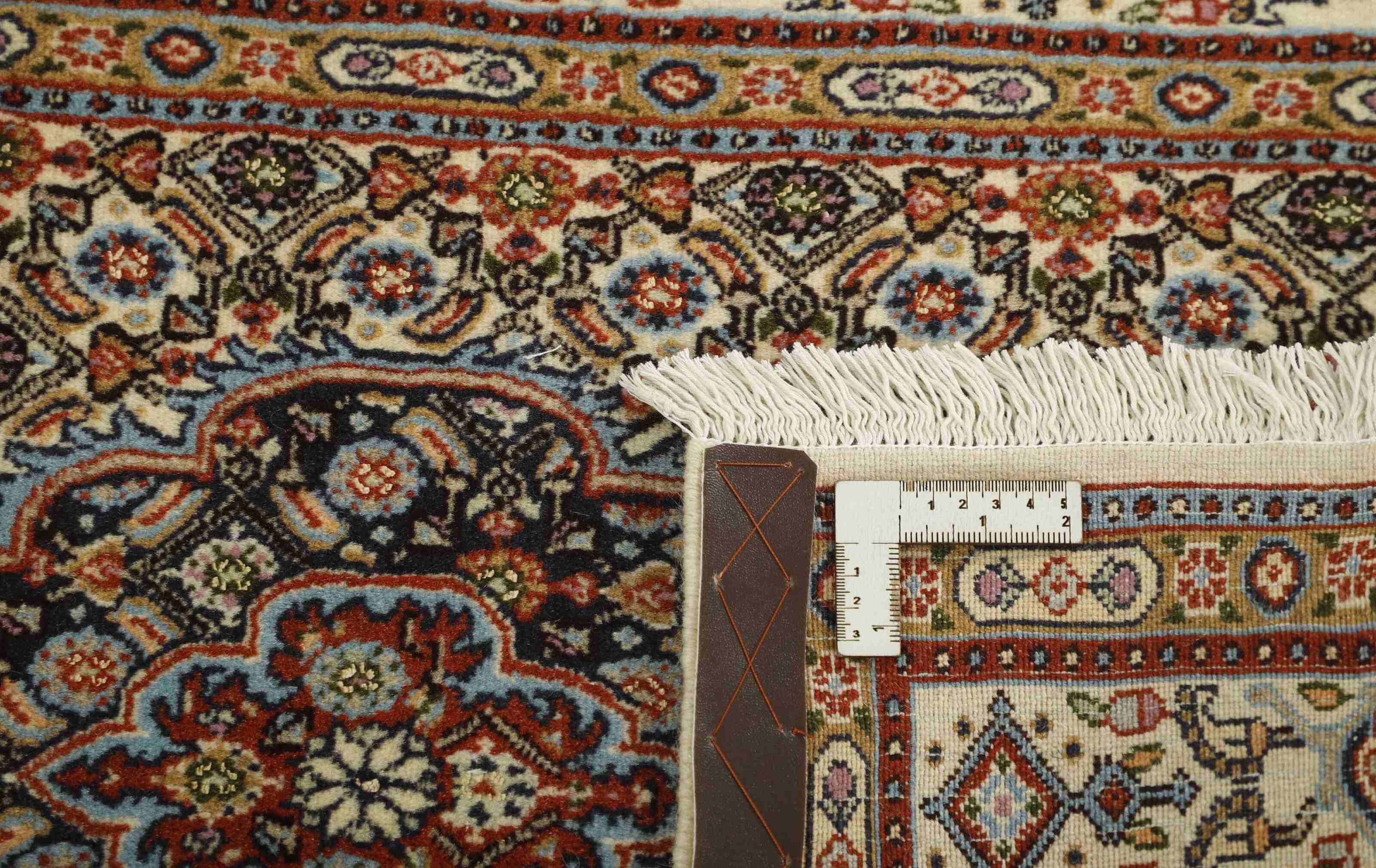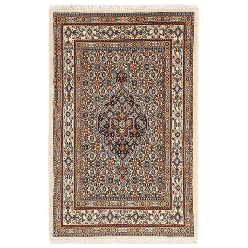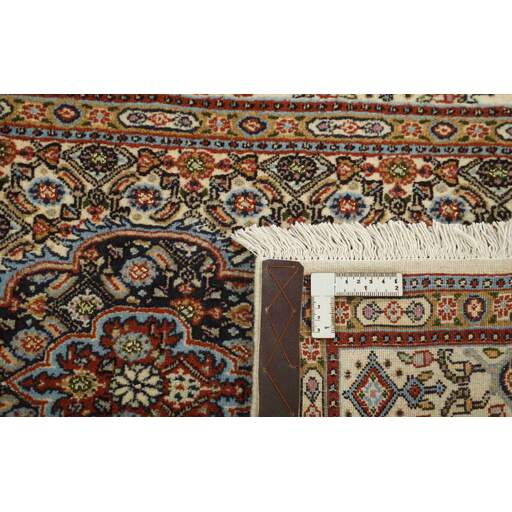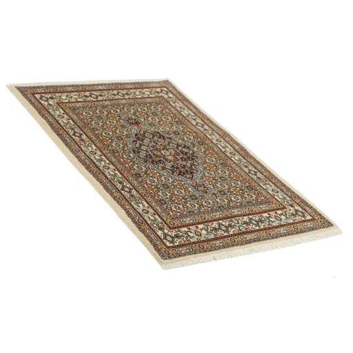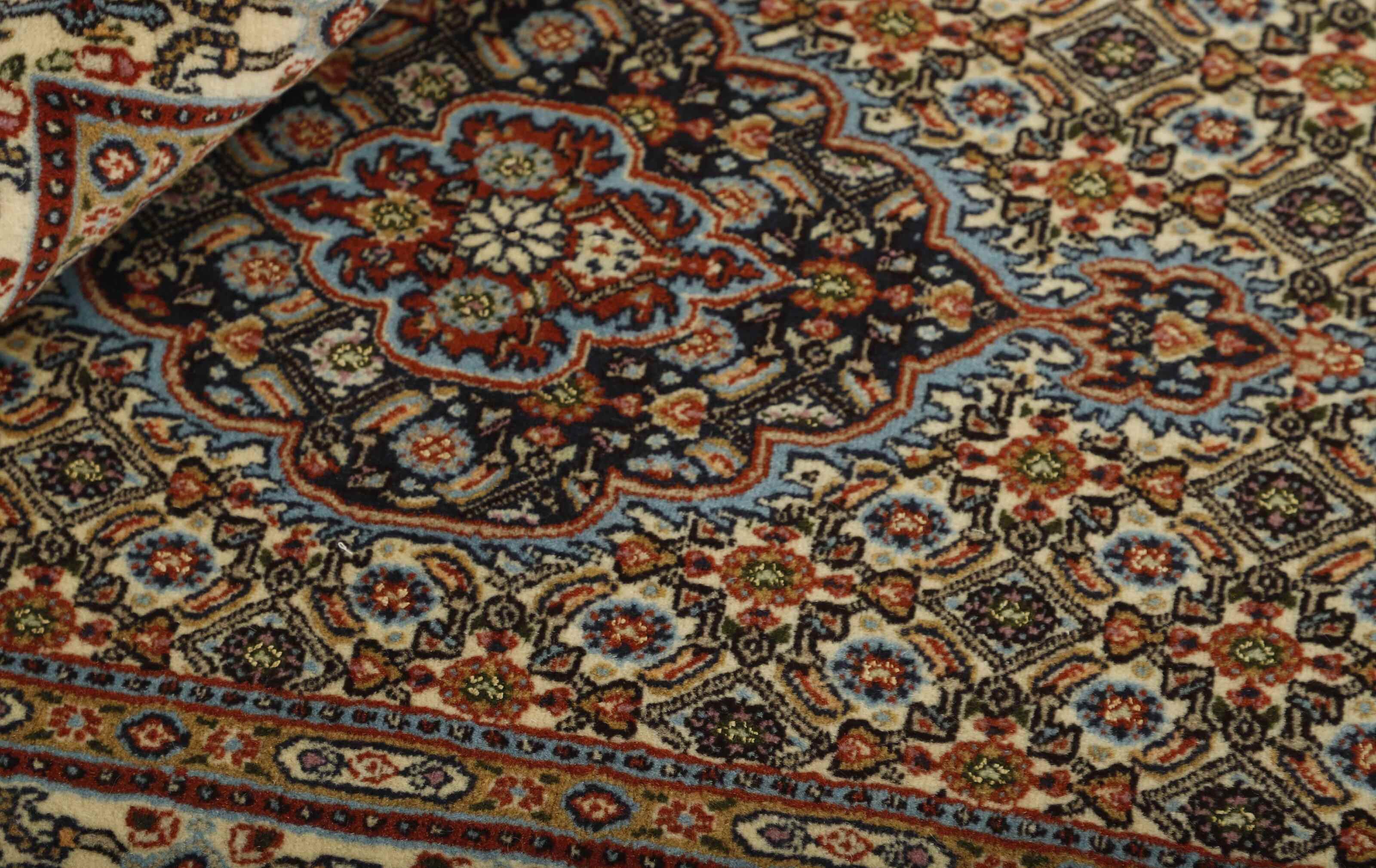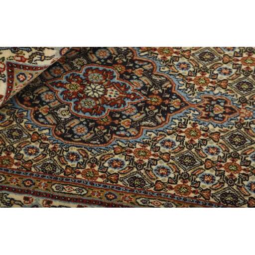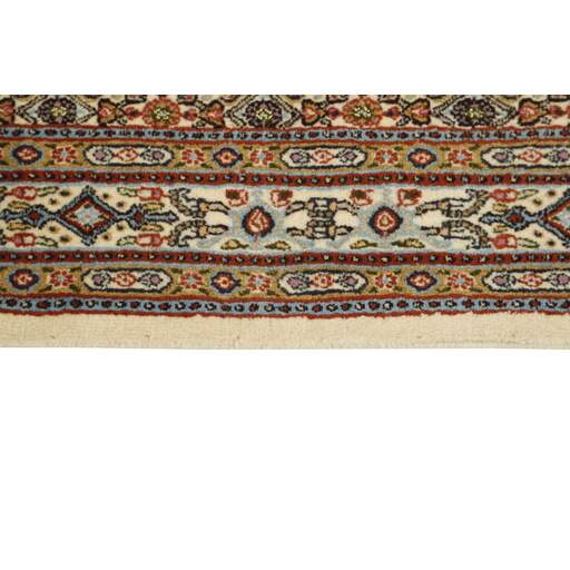 Moud est une petite ville au sud de Mashad, dans la province de Khorrasan. Les tapis de cette région se caractérisent par l'homogénéité de leurs motifs et de leur qualité. La chaîne et la trame sont en coton et le velours en laine. Les bordures sont une version de la bordure persane traditionnelle en tortue. Les tapis sont fabriqués dans toutes les tailles. Les tapis Moud sont souvent copiés en Inde, en raison de leur remarquable homogénéité. Les motifs caractéristiques de Moud sont parmi les plus uniformes, les plus réguliers et les plus facilement reconnaissables de la province de Khorrasan. Les Moud Mahi sont fabriqués dans des tons beige, rouge clair ou bleu, avec des motifs Mahi sur toute la surface ou avec un médaillon en forme d'étoile. Mahi signifie poisson et le motif Mahi est le motif le plus couramment utilisé dans les véritables tapis persans. En l'observant de près, vous pouvez voir un étang entouré de quatre poissons.