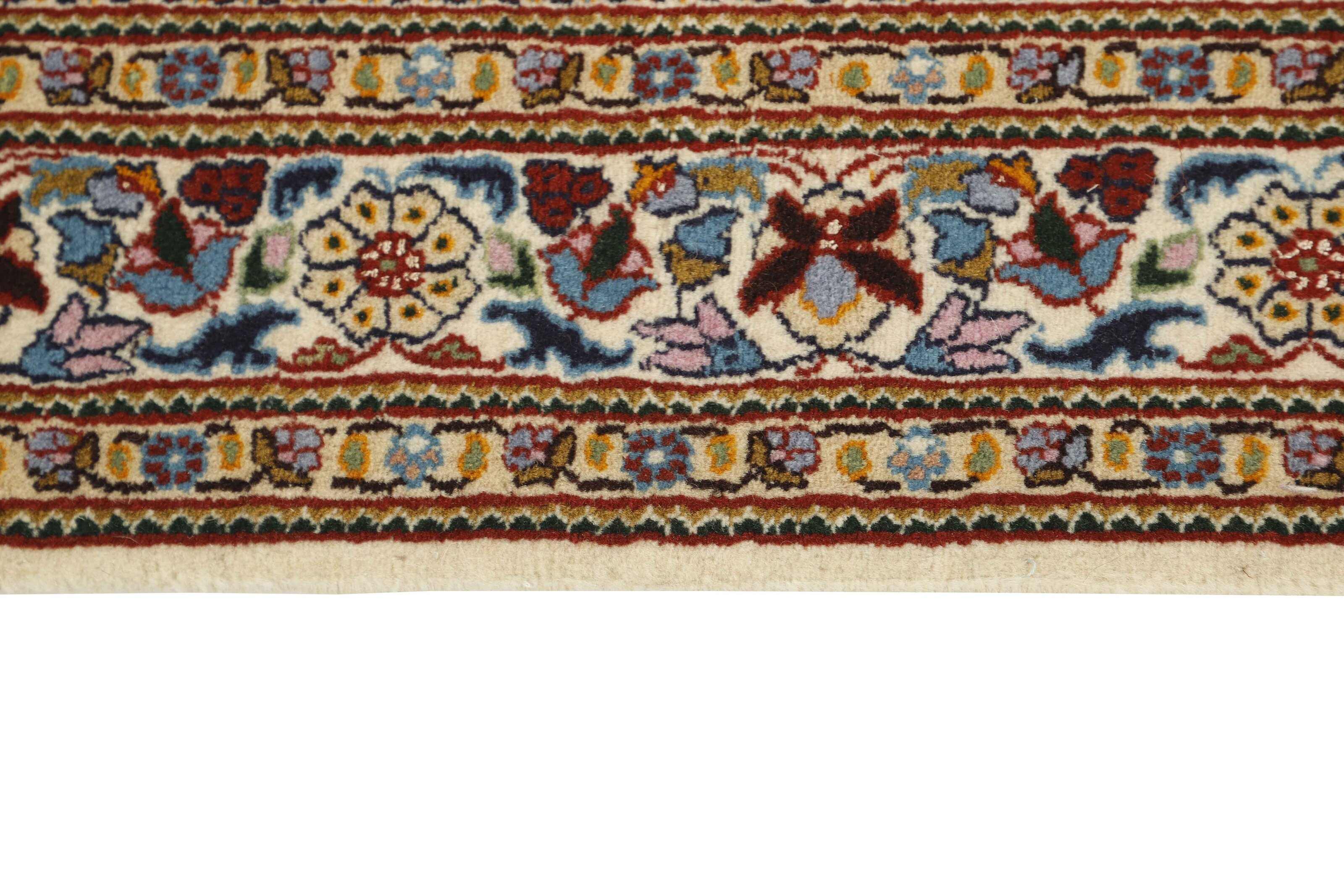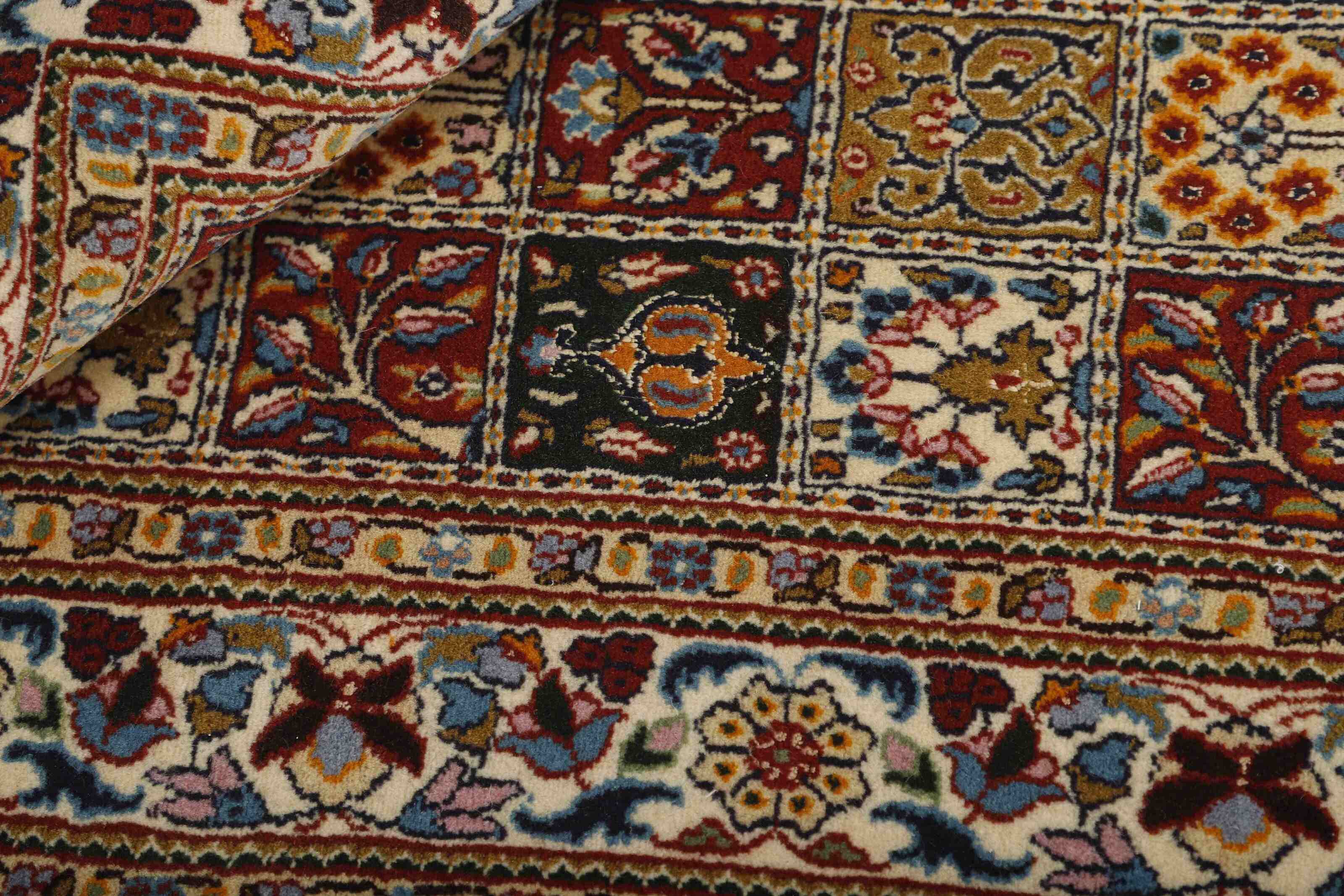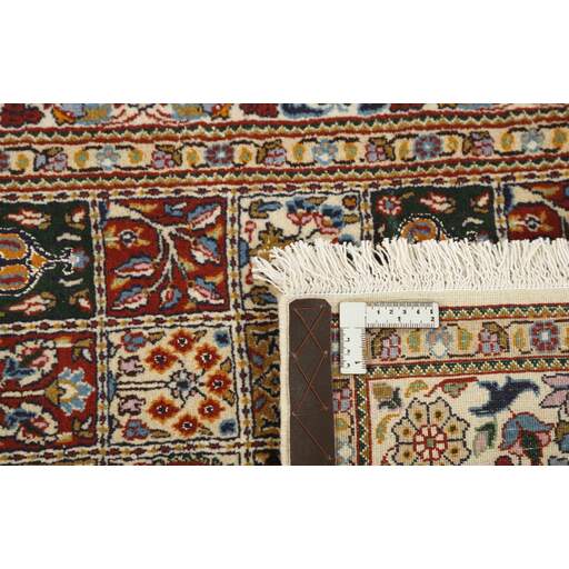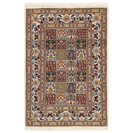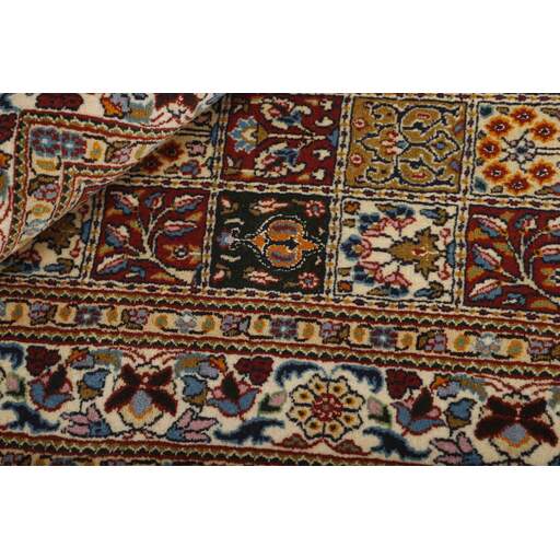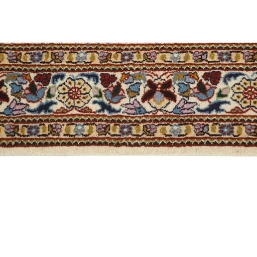 Moud est une petite ville au sud de Mashad, dans la province de Khorrasan. Les tapis de cette région se caractérisent par l'homogénéité de leurs motifs et de leur qualité. La chaîne et la trame sont en coton et le velours en laine. Les bordures sont une version de la bordure persane traditionnelle en tortue. Les tapis sont fabriqués dans toutes les tailles. Les tapis Moud sont souvent copiés en Inde, en raison de leur remarquable homogénéité. Les motifs caractéristiques de Moud sont parmi les plus uniformes, les plus réguliers et les plus facilement reconnaissables de la province de Khorrasan. Les Moud Mahi sont fabriqués dans des tons beige, rouge clair ou bleu, avec des motifs Mahi sur toute la surface ou avec un médaillon en forme d'étoile. Mahi signifie poisson et le motif Mahi est le motif le plus couramment utilisé dans les véritables tapis persans. En l'observant de près, vous pouvez voir un étang entouré de quatre poissons.