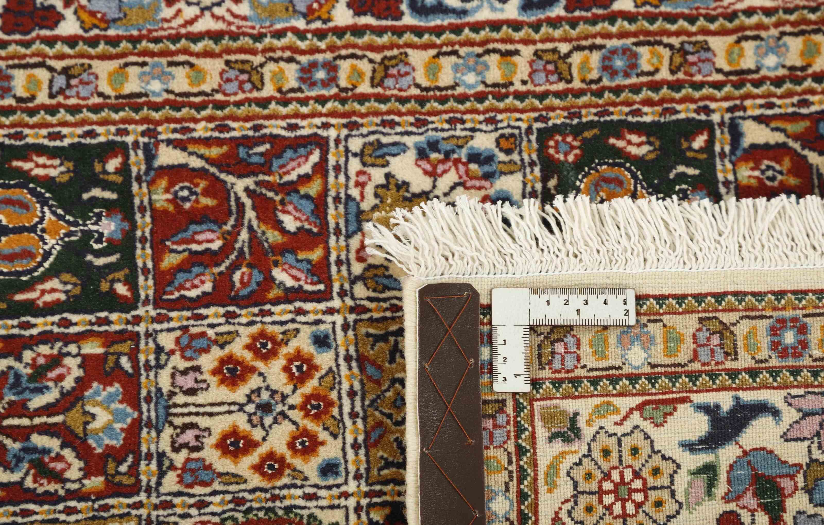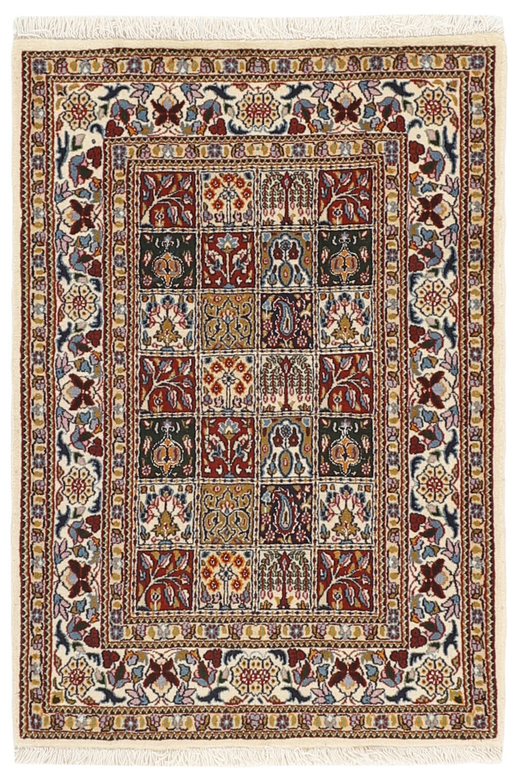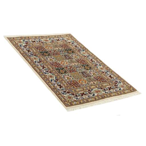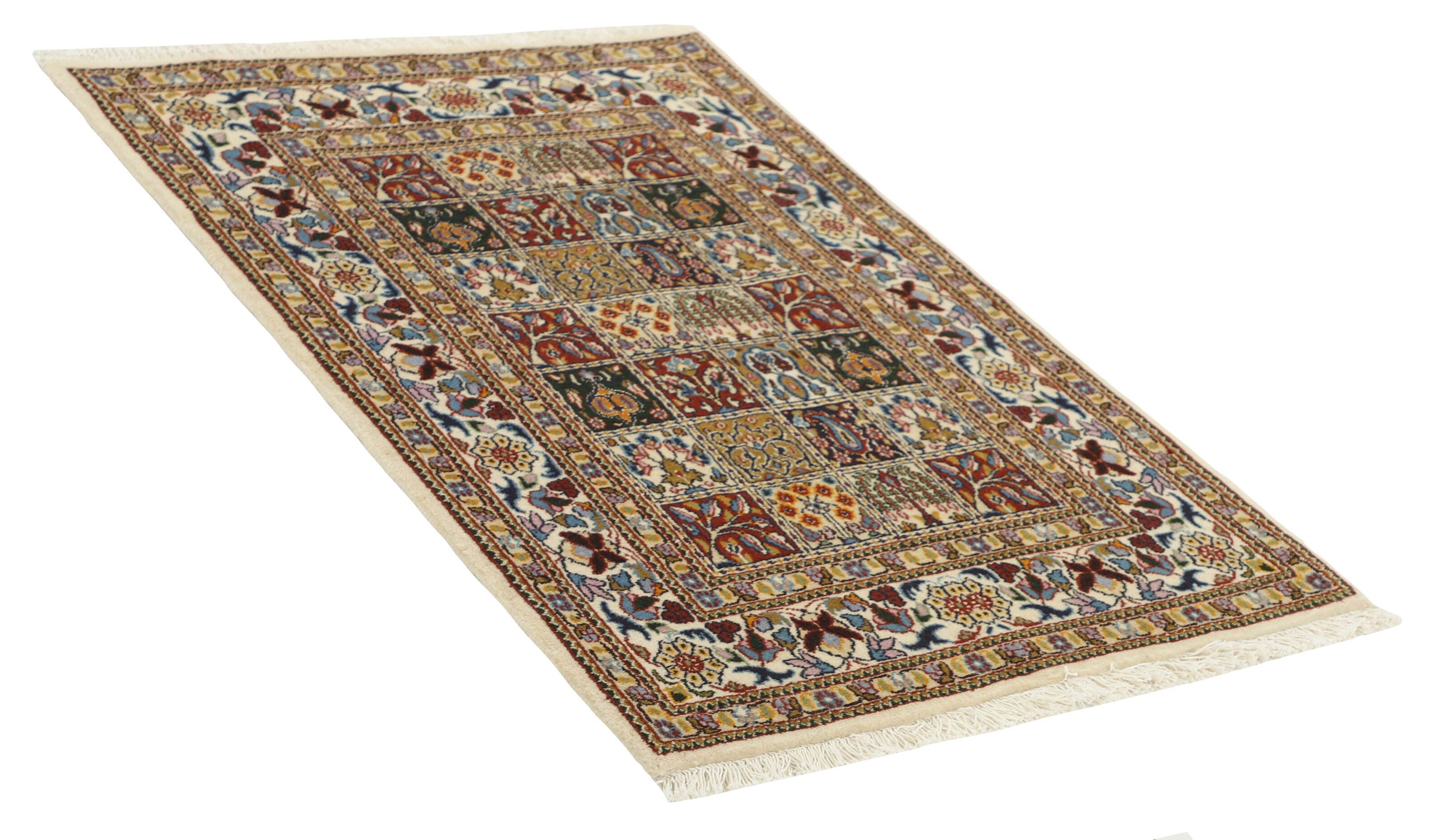 Moud est une petite ville au sud de Mashad, dans la province de Khorrasan. Les tapis de cette région se caractérisent par l'homogénéité de leurs motifs et de leur qualité. La chaîne et la trame sont en coton et le velours en laine. Les bordures sont une version de la bordure persane traditionnelle en tortue. Les tapis sont fabriqués dans toutes les tailles. Les tapis Moud sont souvent copiés en Inde, en raison de leur remarquable homogénéité. Les motifs caractéristiques de Moud sont parmi les plus uniformes, les plus réguliers et les plus facilement reconnaissables de la province de Khorrasan. Les Moud Mahi sont fabriqués dans des tons beige, rouge clair ou bleu, avec des motifs Mahi sur toute la surface ou avec un médaillon en forme d'étoile. Mahi signifie poisson et le motif Mahi est le motif le plus couramment utilisé dans les véritables tapis persans. En l'observant de près, vous pouvez voir un étang entouré de quatre poissons.