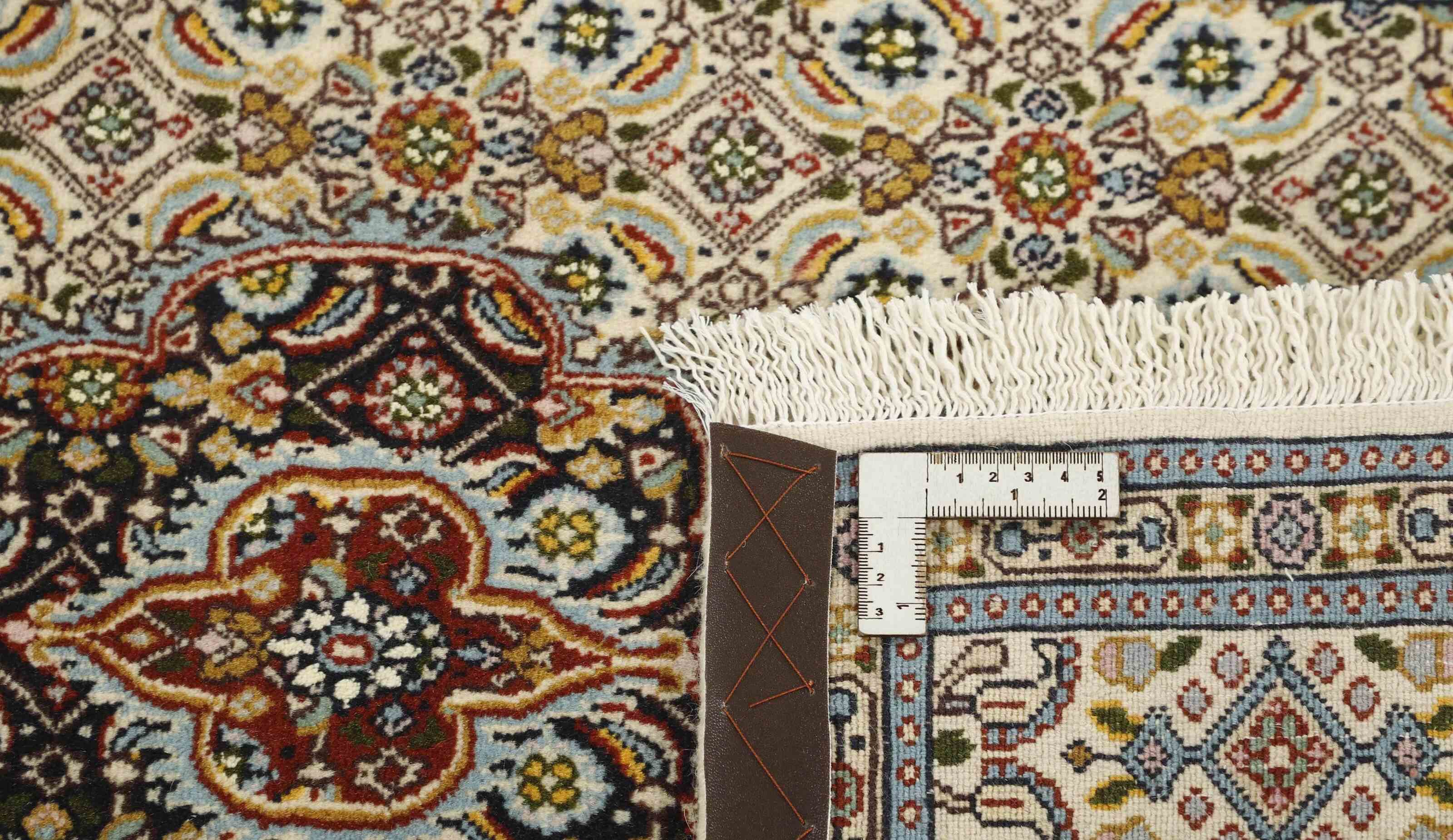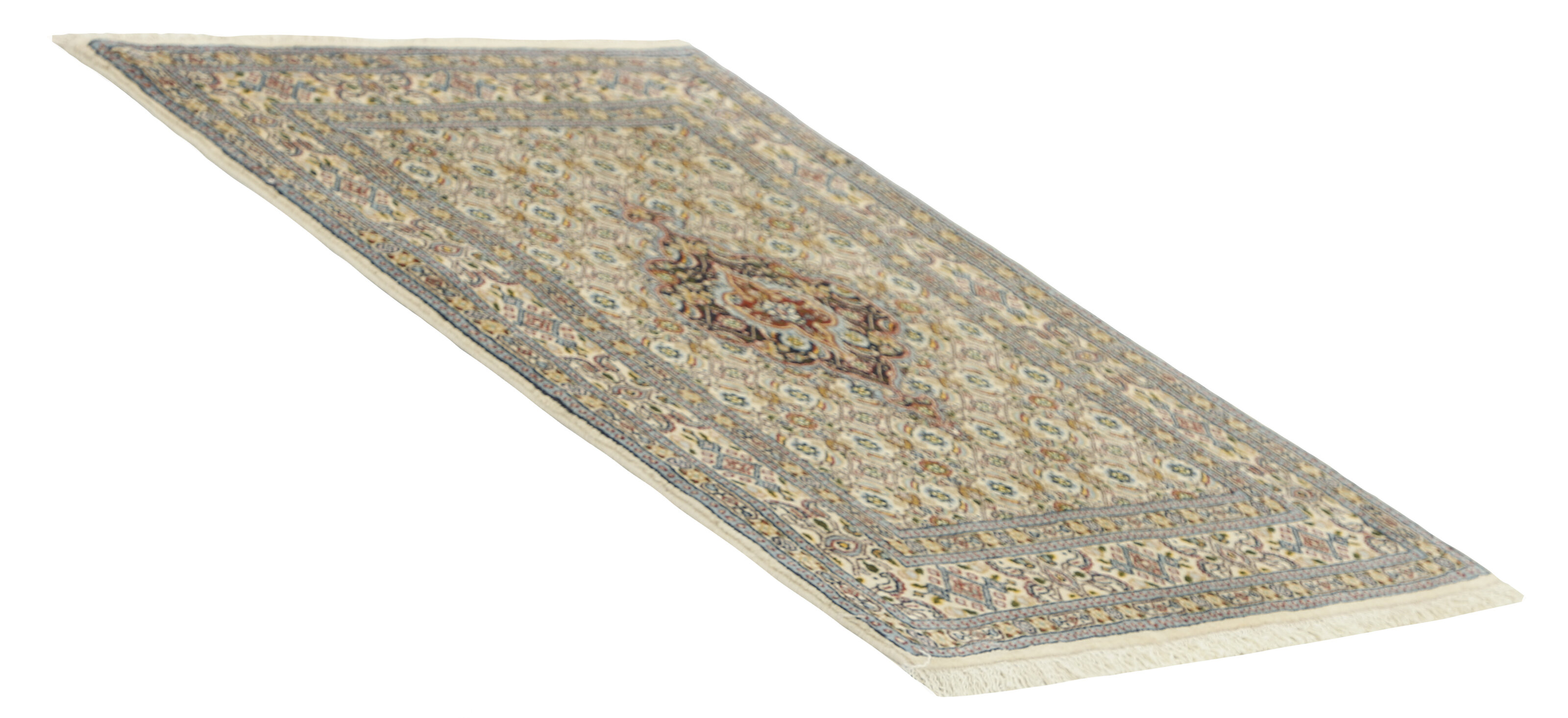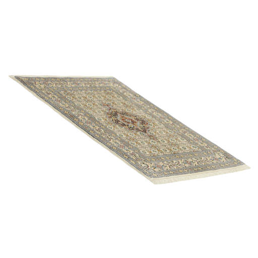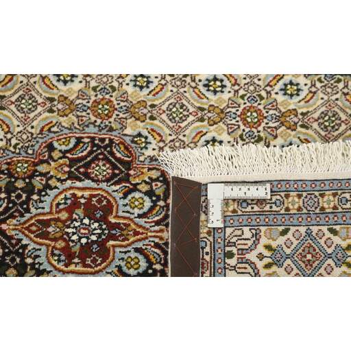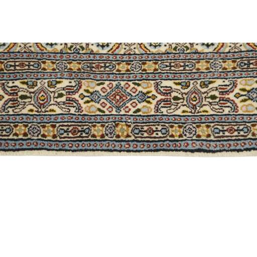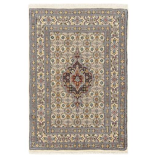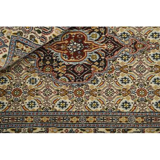 Moud est une petite ville au sud de Mashad, dans la province de Khorrasan. Les tapis de cette région se caractérisent par l'homogénéité de leurs motifs et de leur qualité. La chaîne et la trame sont en coton et le velours en laine. Les bordures sont une version de la bordure persane traditionnelle en tortue. Les tapis sont fabriqués dans toutes les tailles. Les tapis Moud sont souvent copiés en Inde, en raison de leur remarquable homogénéité. Les motifs caractéristiques de Moud sont parmi les plus uniformes, les plus réguliers et les plus facilement reconnaissables de la province de Khorrasan. Les Moud Mahi sont fabriqués dans des tons beige, rouge clair ou bleu, avec des motifs Mahi sur toute la surface ou avec un médaillon en forme d'étoile. Mahi signifie poisson et le motif Mahi est le motif le plus couramment utilisé dans les véritables tapis persans. En l'observant de près, vous pouvez voir un étang entouré de quatre poissons.