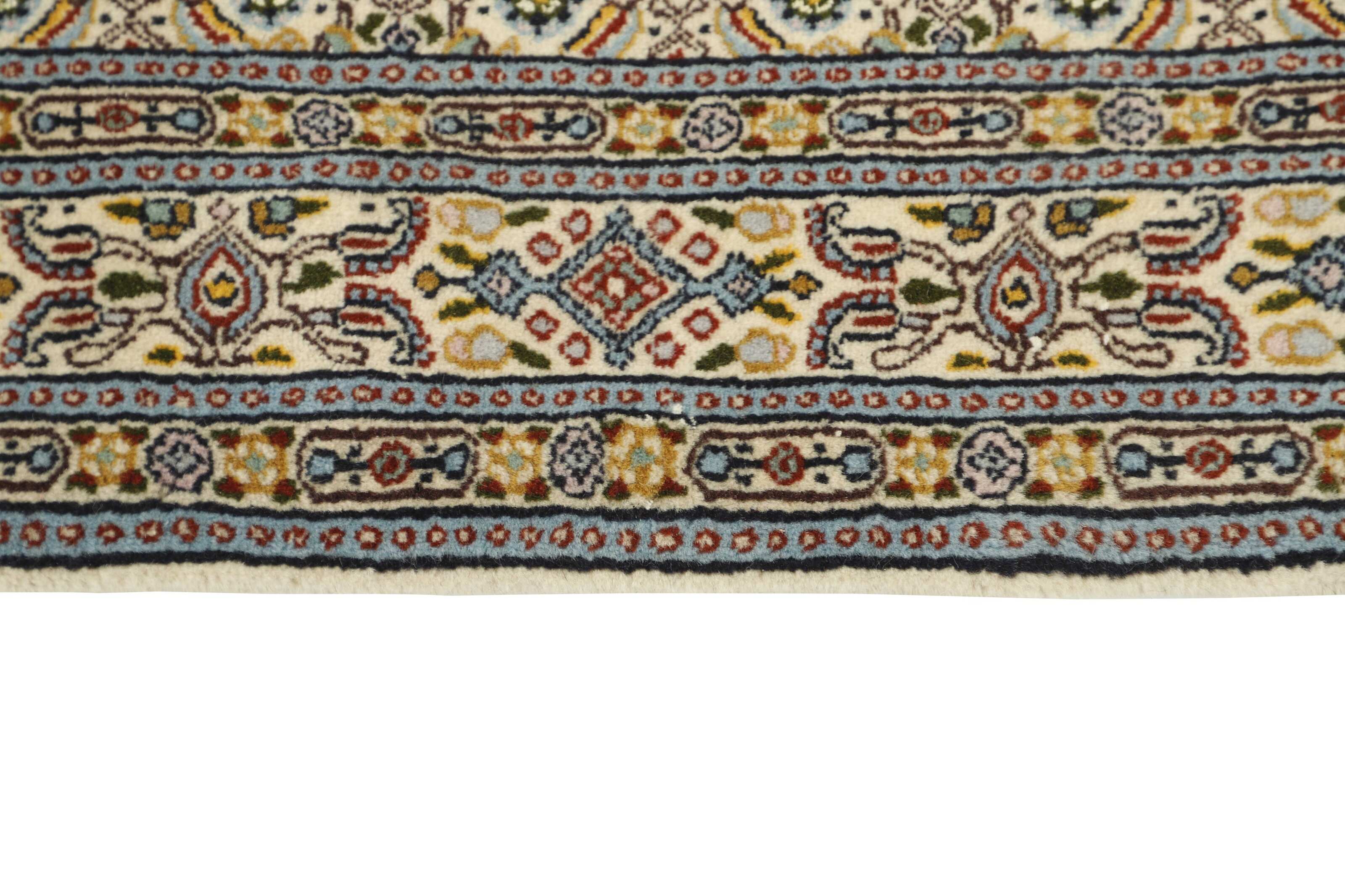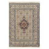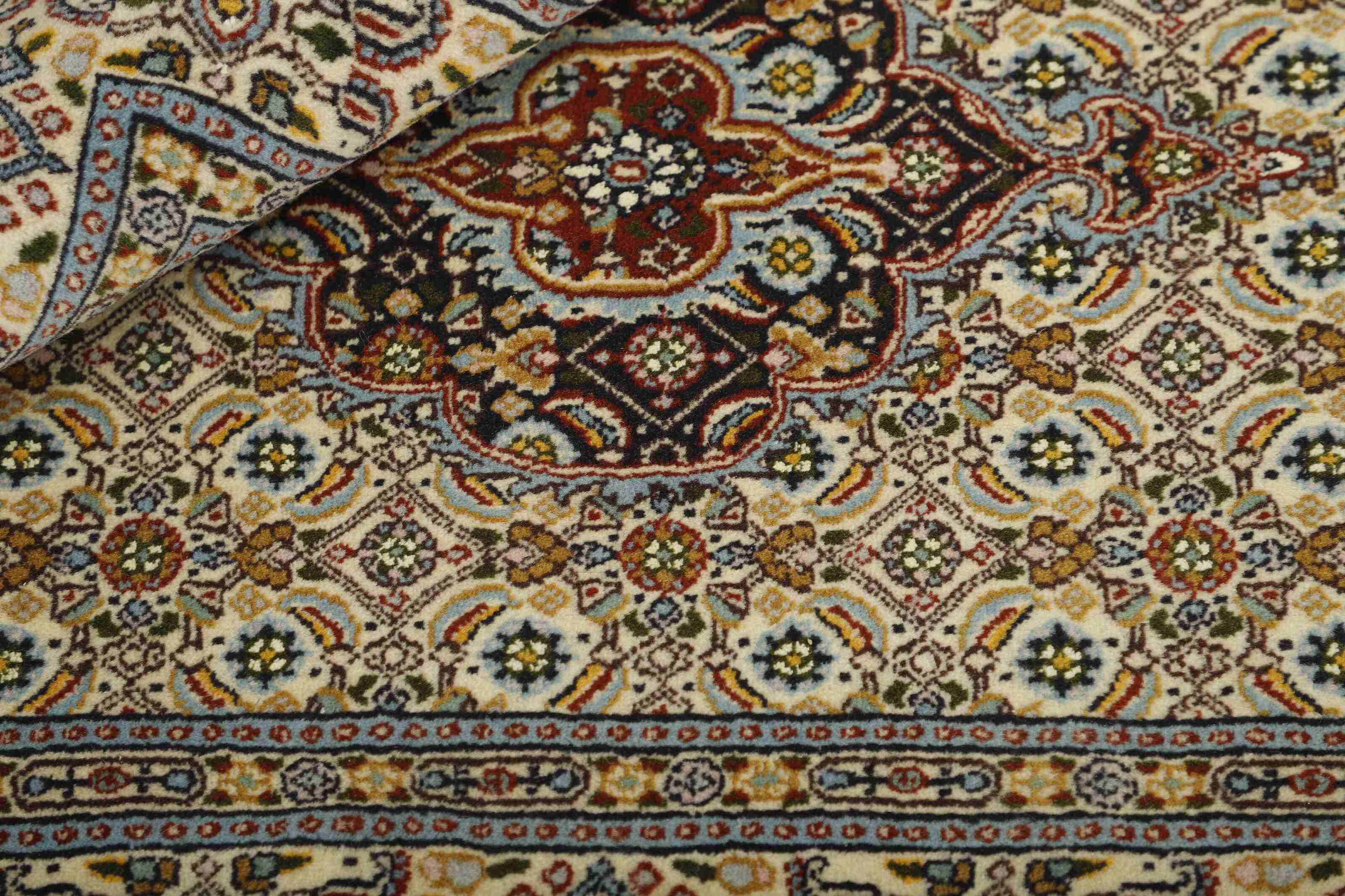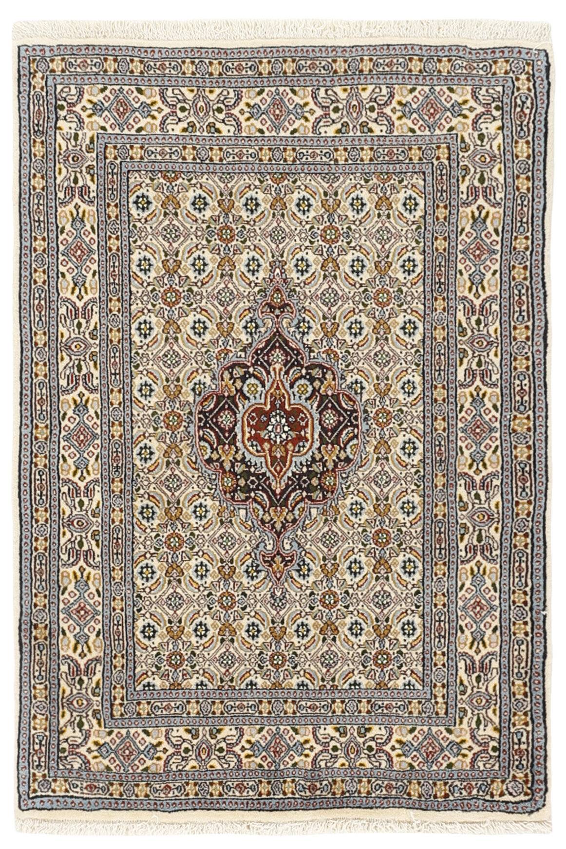 Moud est une petite ville au sud de Mashad, dans la province de Khorrasan. Les tapis de cette région se caractérisent par l'homogénéité de leurs motifs et de leur qualité. La chaîne et la trame sont en coton et le velours en laine. Les bordures sont une version de la bordure persane traditionnelle en tortue. Les tapis sont fabriqués dans toutes les tailles. Les tapis Moud sont souvent copiés en Inde, en raison de leur remarquable homogénéité. Les motifs caractéristiques de Moud sont parmi les plus uniformes, les plus réguliers et les plus facilement reconnaissables de la province de Khorrasan. Les Moud Mahi sont fabriqués dans des tons beige, rouge clair ou bleu, avec des motifs Mahi sur toute la surface ou avec un médaillon en forme d'étoile. Mahi signifie poisson et le motif Mahi est le motif le plus couramment utilisé dans les véritables tapis persans. En l'observant de près, vous pouvez voir un étang entouré de quatre poissons.