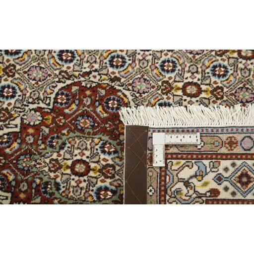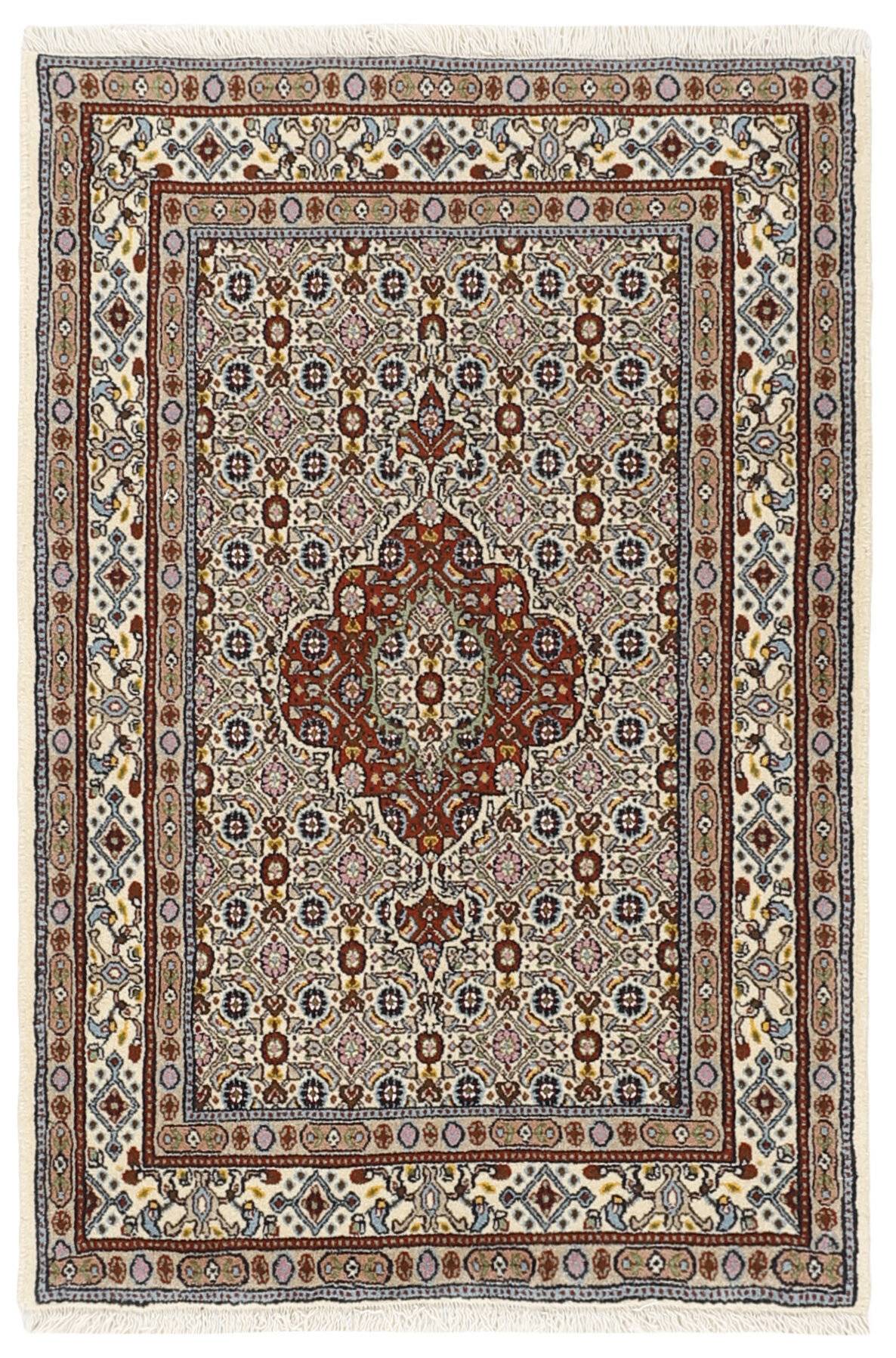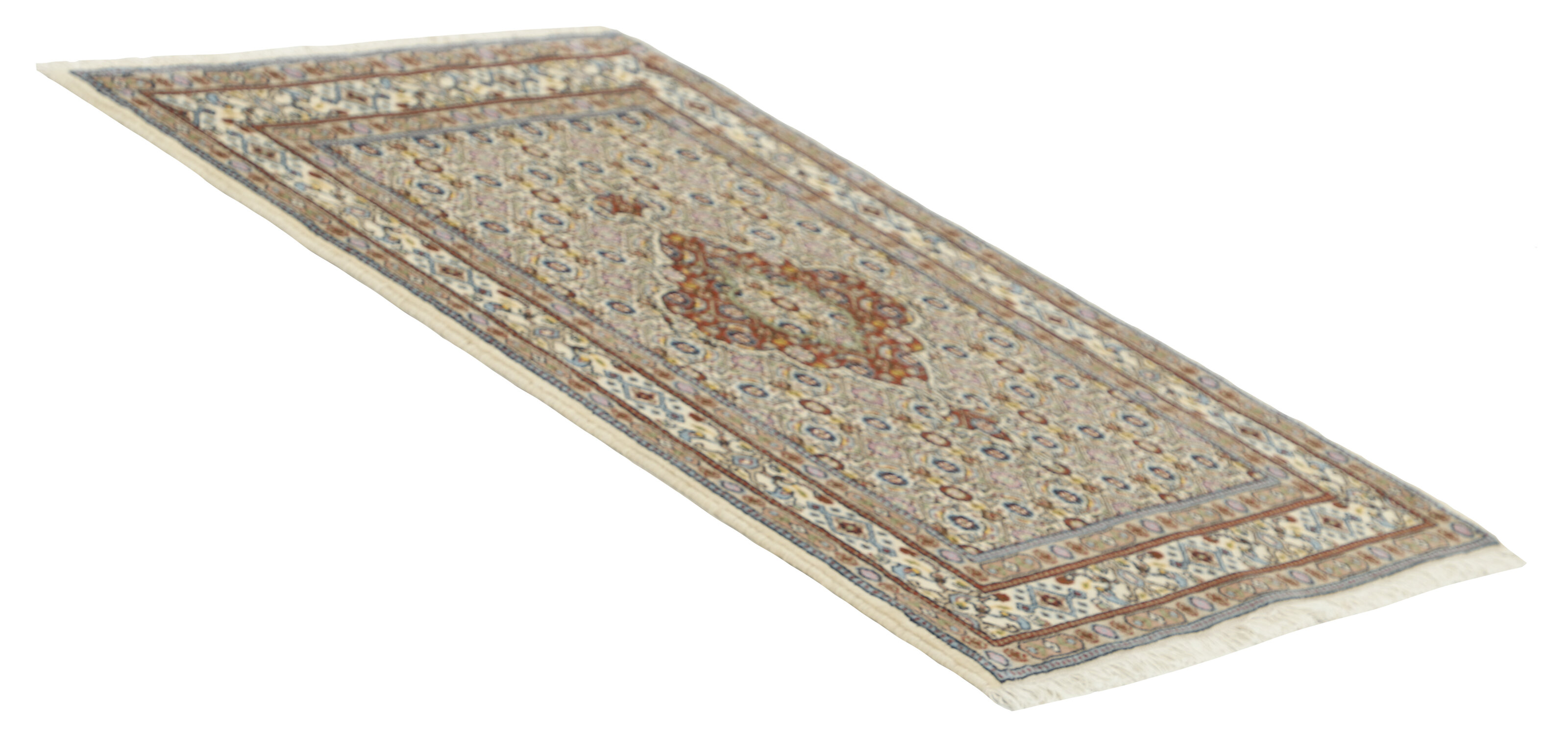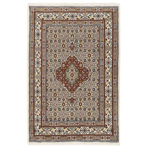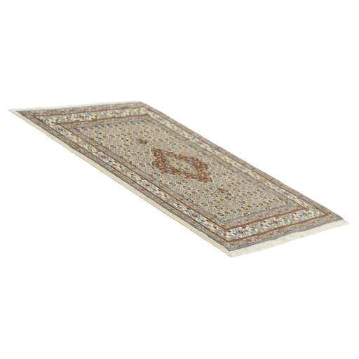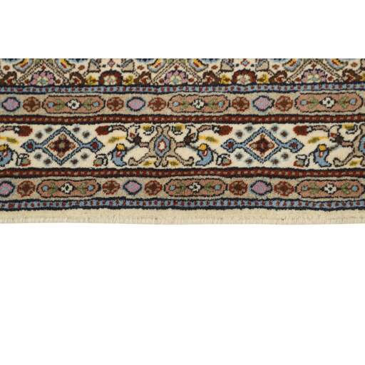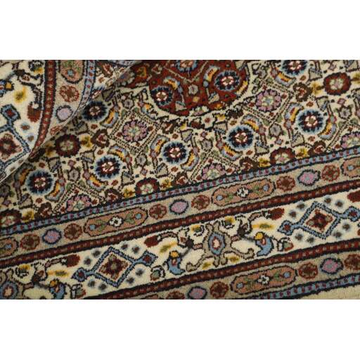 Moud est une petite ville au sud de Mashad, dans la province de Khorrasan. Les tapis de cette région se caractérisent par l'homogénéité de leurs motifs et de leur qualité. La chaîne et la trame sont en coton et le velours en laine. Les bordures sont une version de la bordure persane traditionnelle en tortue. Les tapis sont fabriqués dans toutes les tailles. Les tapis Moud sont souvent copiés en Inde, en raison de leur remarquable homogénéité. Les motifs caractéristiques de Moud sont parmi les plus uniformes, les plus réguliers et les plus facilement reconnaissables de la province de Khorrasan. Les Moud Mahi sont fabriqués dans des tons beige, rouge clair ou bleu, avec des motifs Mahi sur toute la surface ou avec un médaillon en forme d'étoile. Mahi signifie poisson et le motif Mahi est le motif le plus couramment utilisé dans les véritables tapis persans. En l'observant de près, vous pouvez voir un étang entouré de quatre poissons.