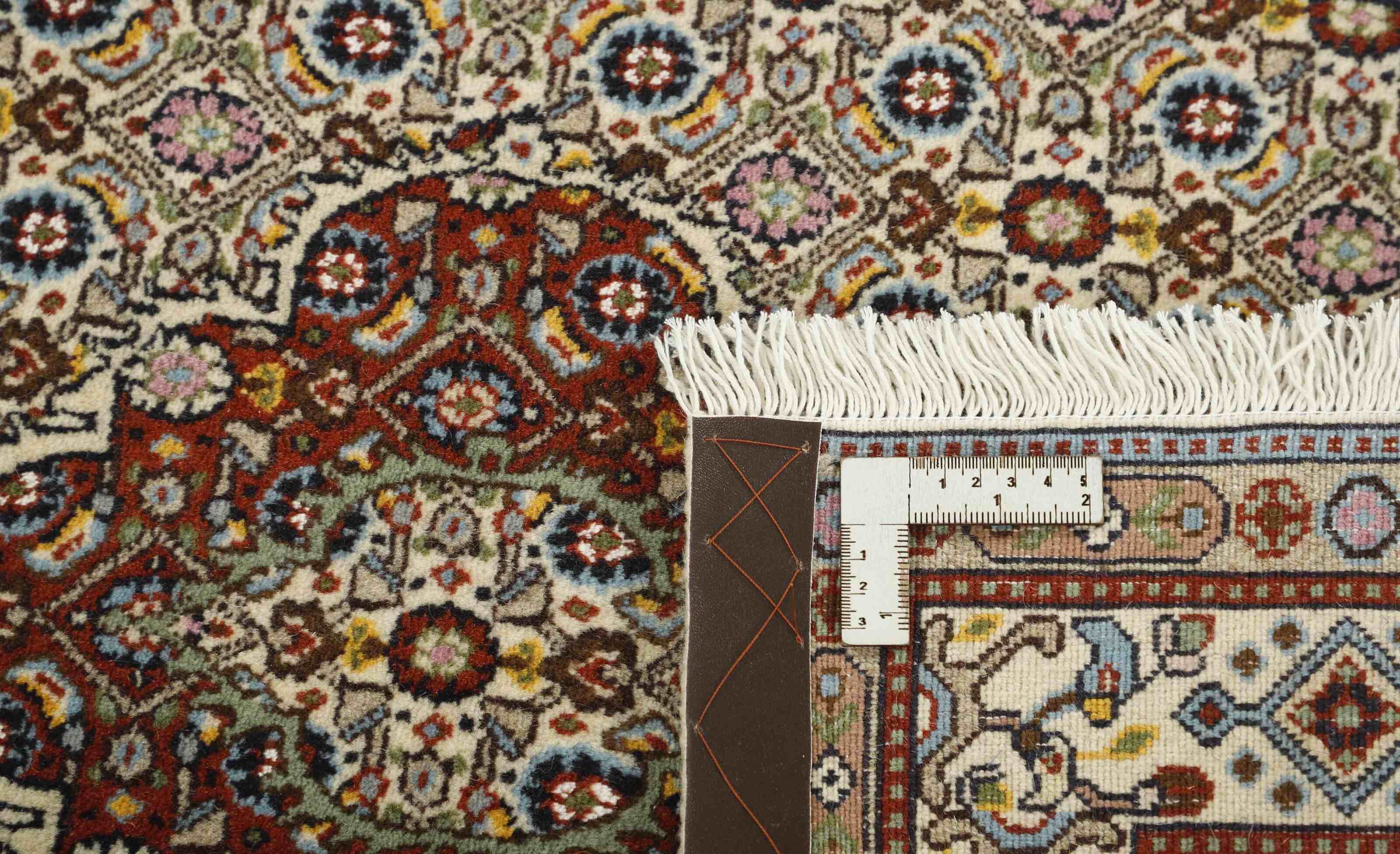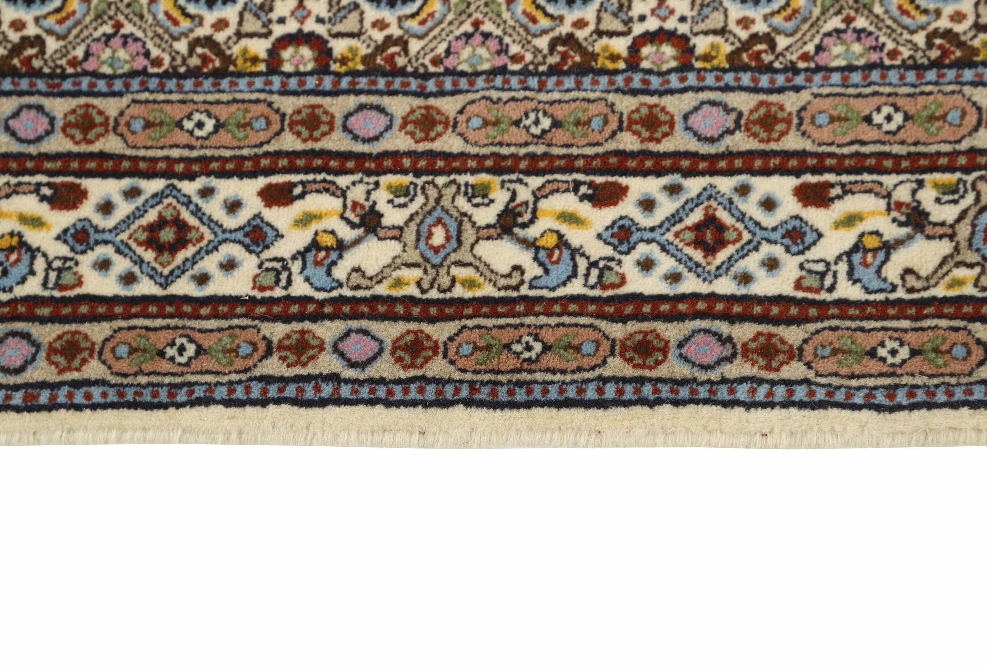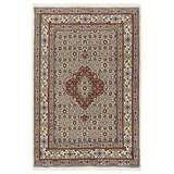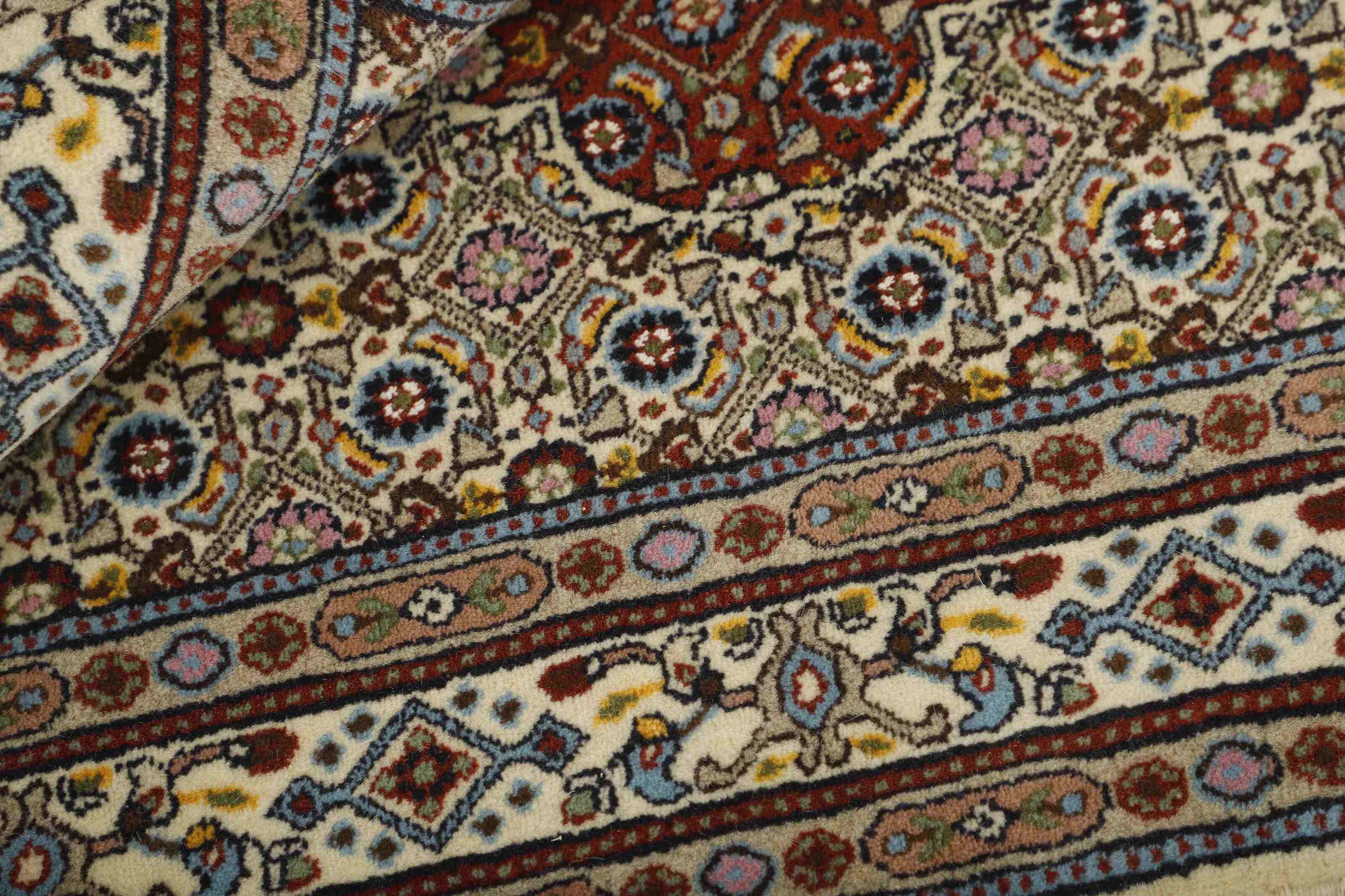 Moud est une petite ville au sud de Mashad, dans la province de Khorrasan. Les tapis de cette région se caractérisent par l'homogénéité de leurs motifs et de leur qualité. La chaîne et la trame sont en coton et le velours en laine. Les bordures sont une version de la bordure persane traditionnelle en tortue. Les tapis sont fabriqués dans toutes les tailles. Les tapis Moud sont souvent copiés en Inde, en raison de leur remarquable homogénéité. Les motifs caractéristiques de Moud sont parmi les plus uniformes, les plus réguliers et les plus facilement reconnaissables de la province de Khorrasan. Les Moud Mahi sont fabriqués dans des tons beige, rouge clair ou bleu, avec des motifs Mahi sur toute la surface ou avec un médaillon en forme d'étoile. Mahi signifie poisson et le motif Mahi est le motif le plus couramment utilisé dans les véritables tapis persans. En l'observant de près, vous pouvez voir un étang entouré de quatre poissons.