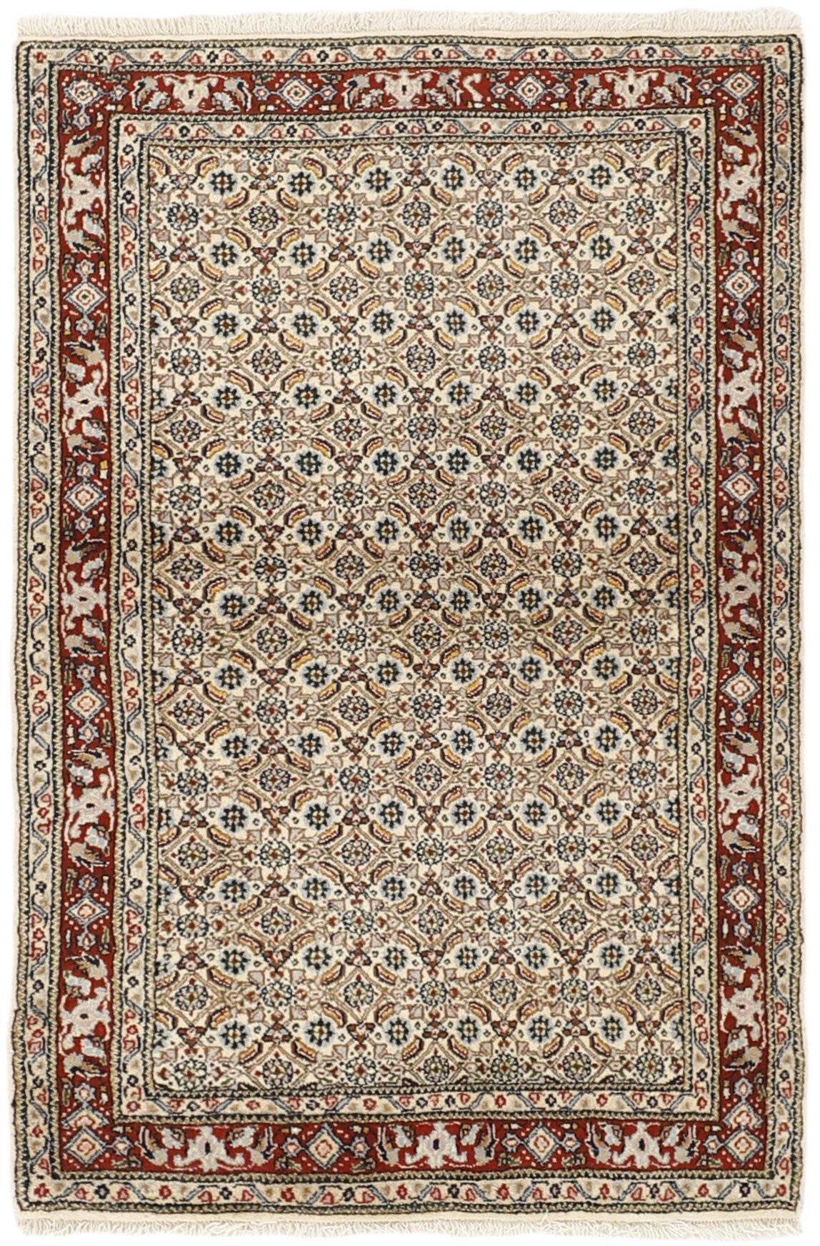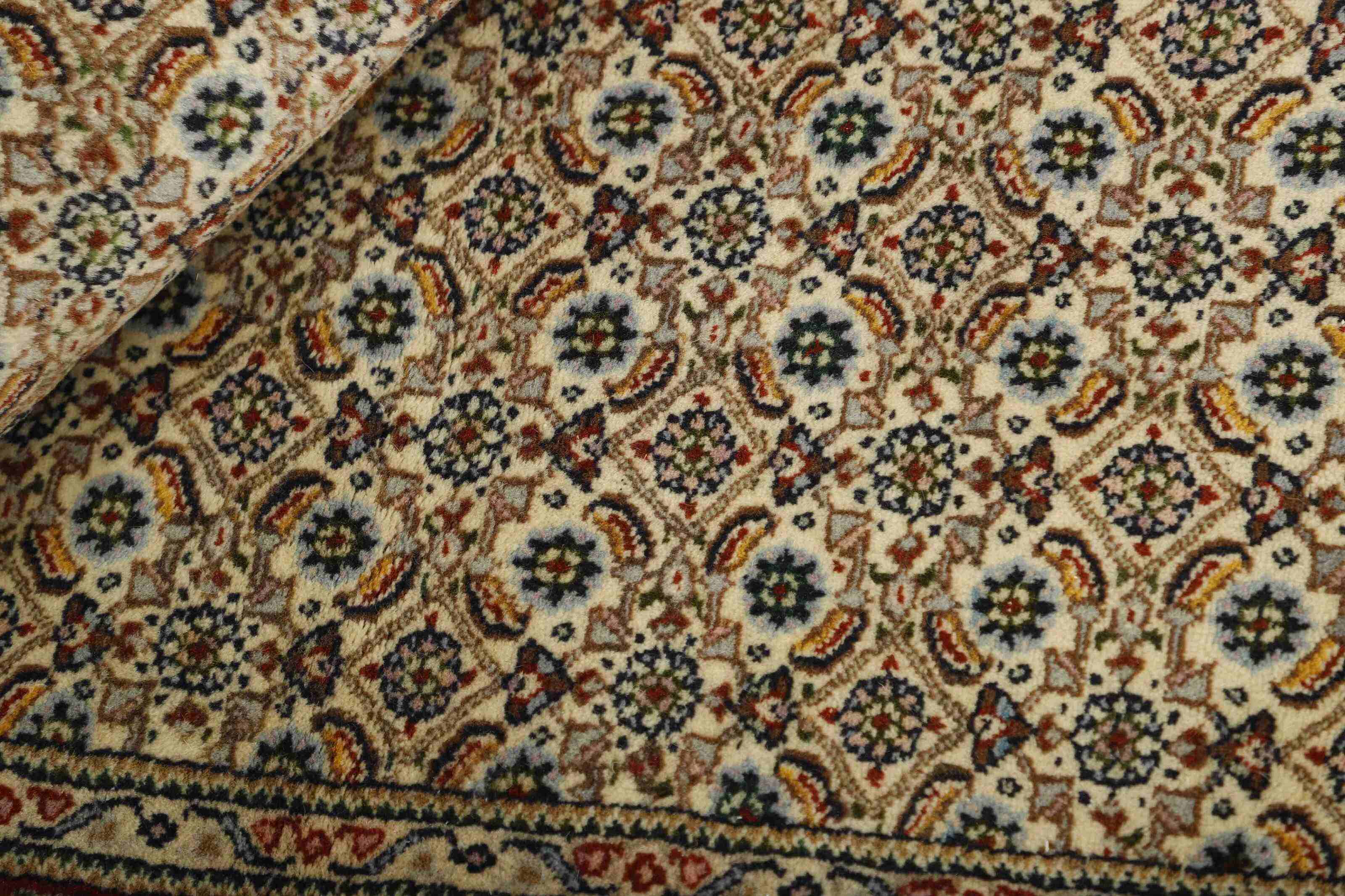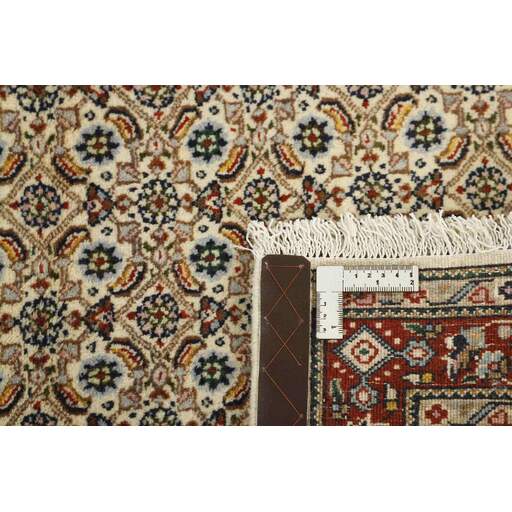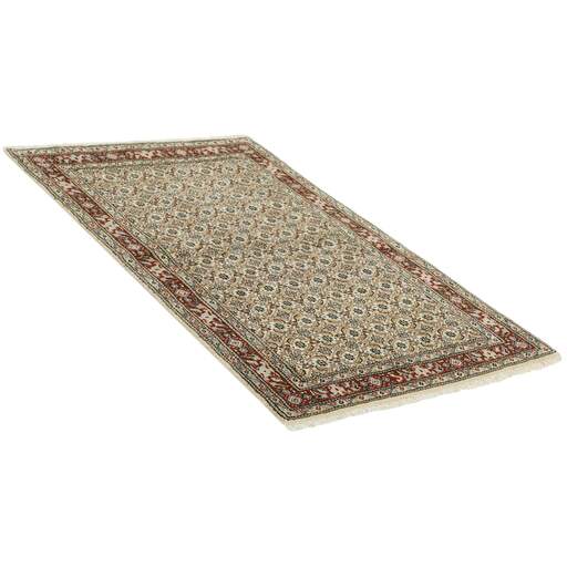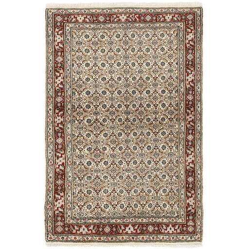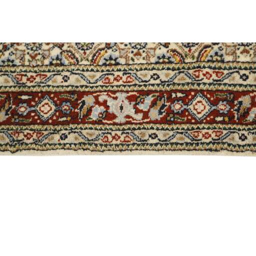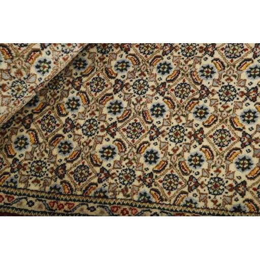 Moud est une petite ville au sud de Mashad, dans la province de Khorrasan. Les tapis de cette région se caractérisent par l'homogénéité de leurs motifs et de leur qualité. La chaîne et la trame sont en coton et le velours en laine. Les bordures sont une version de la bordure persane traditionnelle en tortue. Les tapis sont fabriqués dans toutes les tailles. Les tapis Moud sont souvent copiés en Inde, en raison de leur remarquable homogénéité. Les motifs caractéristiques de Moud sont parmi les plus uniformes, les plus réguliers et les plus facilement reconnaissables de la province de Khorrasan. Les Moud Mahi sont fabriqués dans des tons beige, rouge clair ou bleu, avec des motifs Mahi sur toute la surface ou avec un médaillon en forme d'étoile. Mahi signifie poisson et le motif Mahi est le motif le plus couramment utilisé dans les véritables tapis persans. En l'observant de près, vous pouvez voir un étang entouré de quatre poissons.
