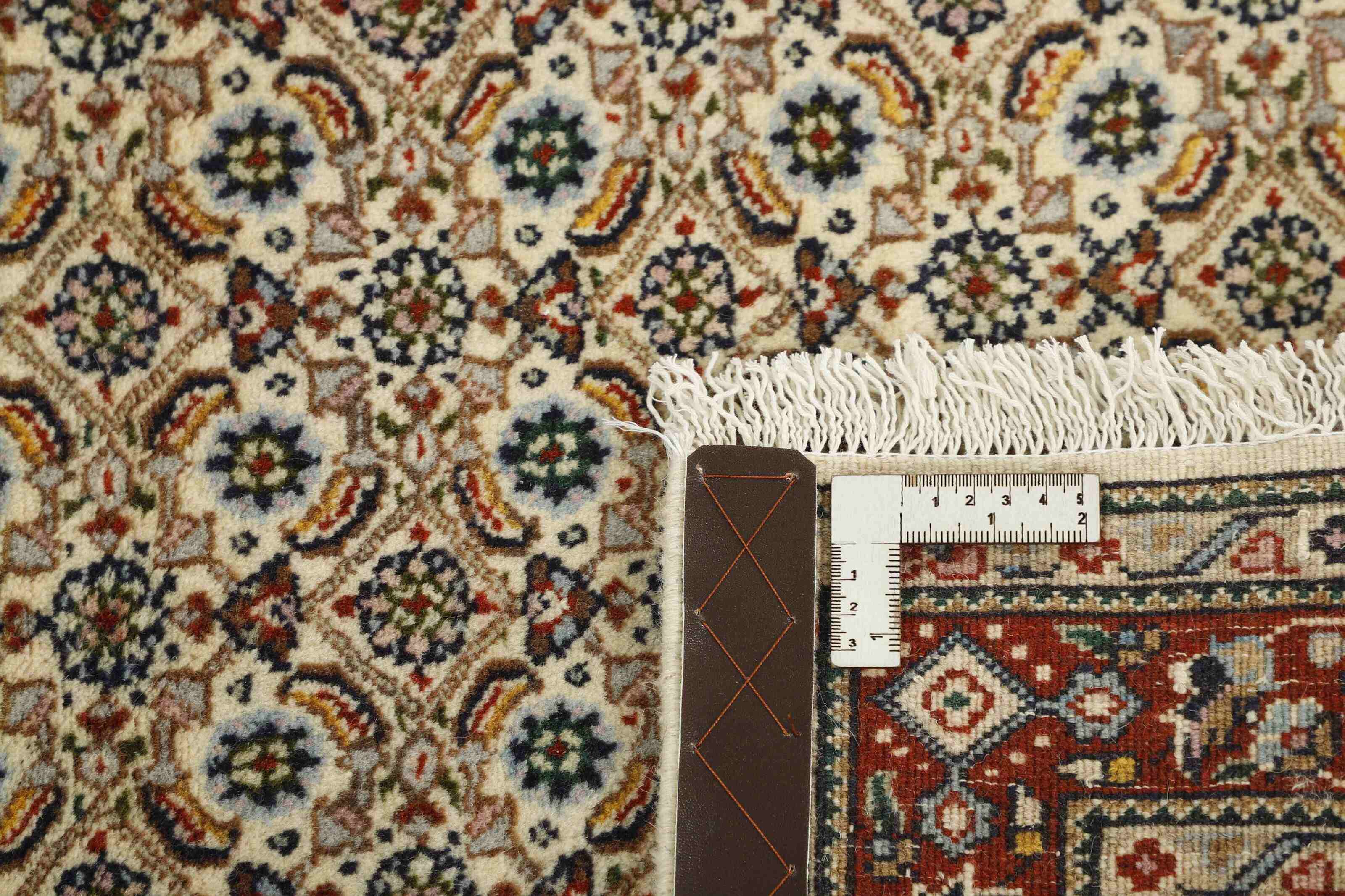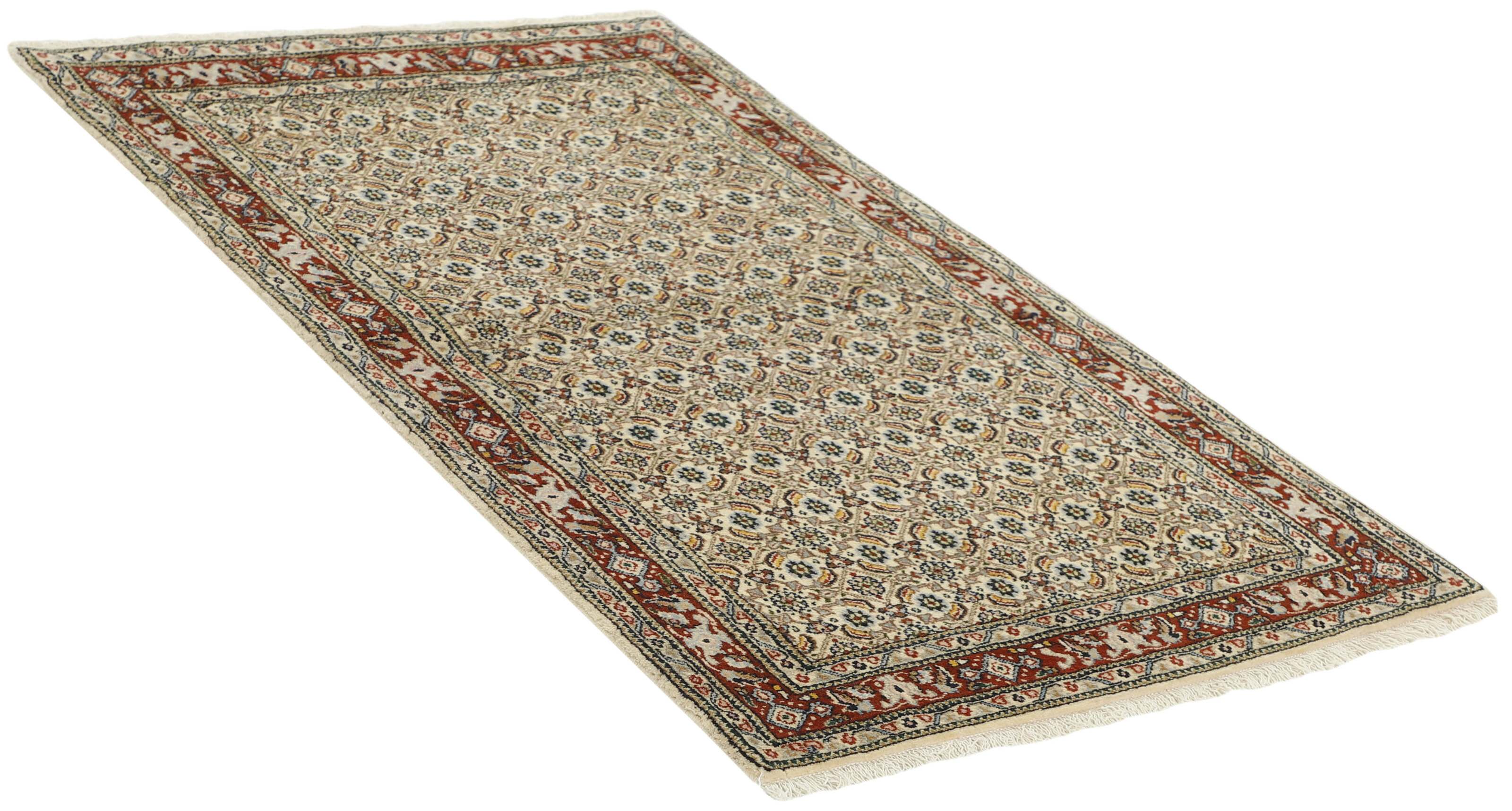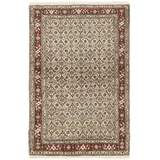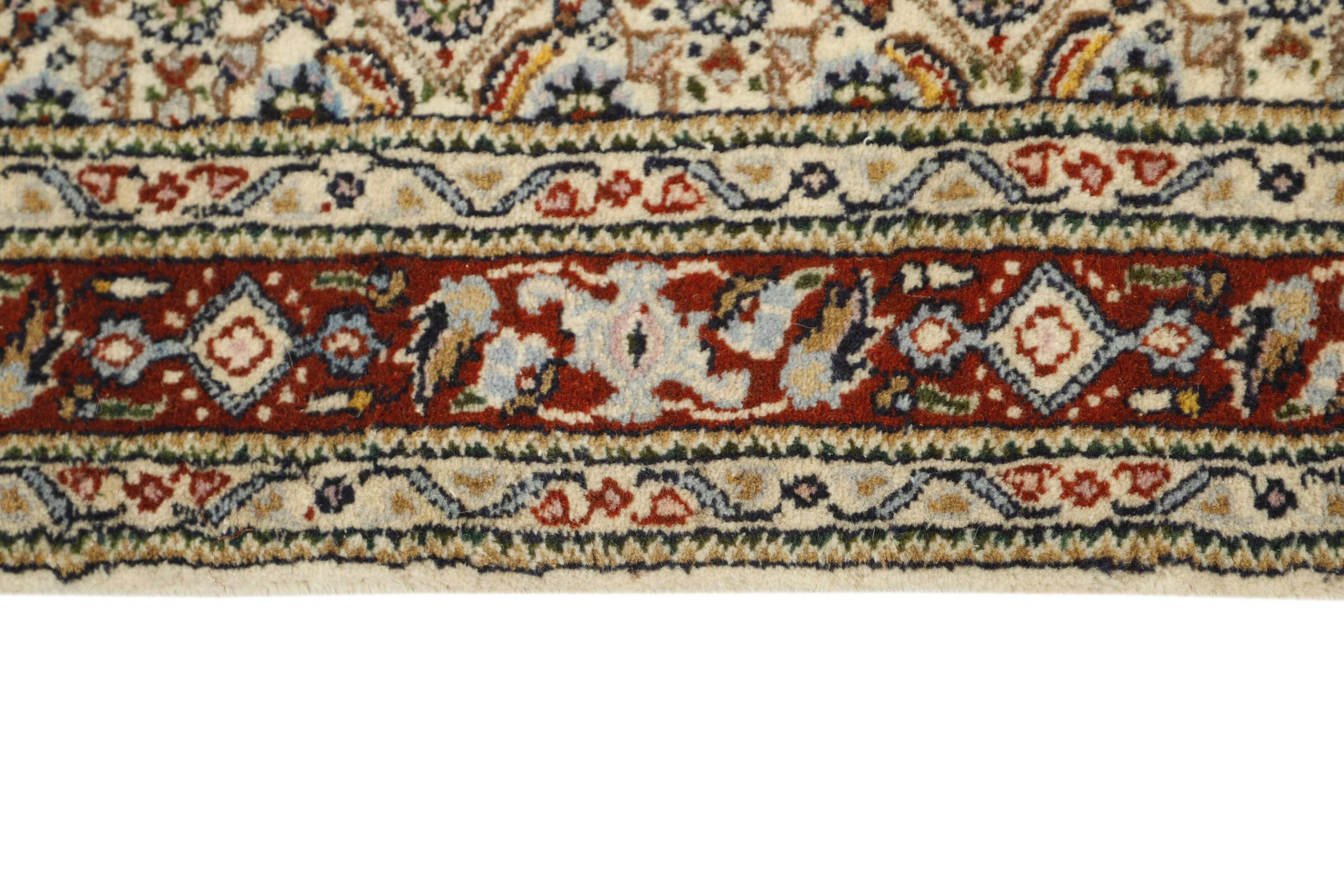 Moud est une petite ville au sud de Mashad, dans la province de Khorrasan. Les tapis de cette région se caractérisent par l'homogénéité de leurs motifs et de leur qualité. La chaîne et la trame sont en coton et le velours en laine. Les bordures sont une version de la bordure persane traditionnelle en tortue. Les tapis sont fabriqués dans toutes les tailles. Les tapis Moud sont souvent copiés en Inde, en raison de leur remarquable homogénéité. Les motifs caractéristiques de Moud sont parmi les plus uniformes, les plus réguliers et les plus facilement reconnaissables de la province de Khorrasan. Les Moud Mahi sont fabriqués dans des tons beige, rouge clair ou bleu, avec des motifs Mahi sur toute la surface ou avec un médaillon en forme d'étoile. Mahi signifie poisson et le motif Mahi est le motif le plus couramment utilisé dans les véritables tapis persans. En l'observant de près, vous pouvez voir un étang entouré de quatre poissons.