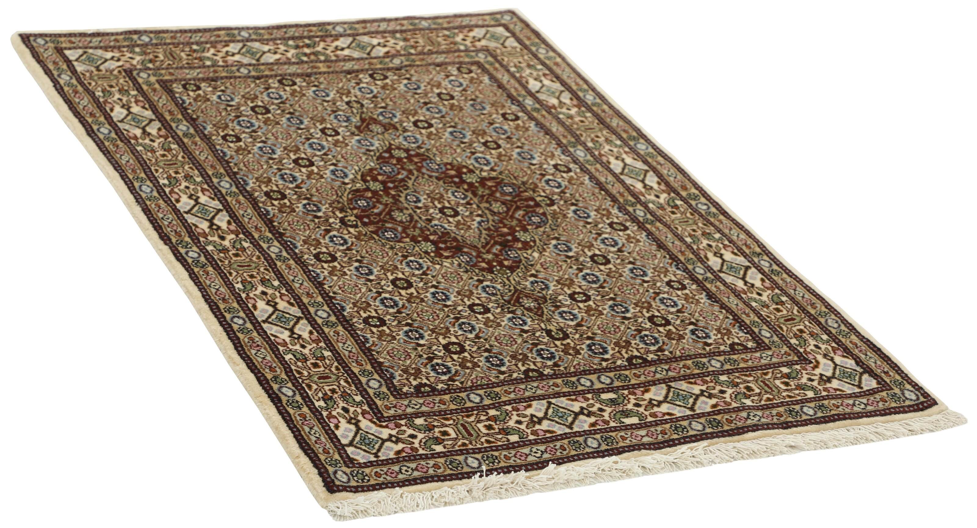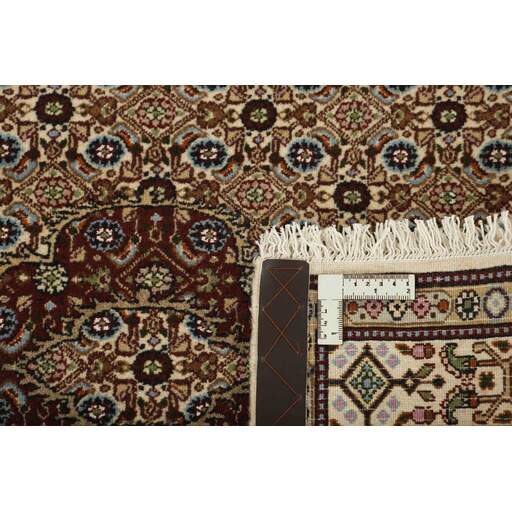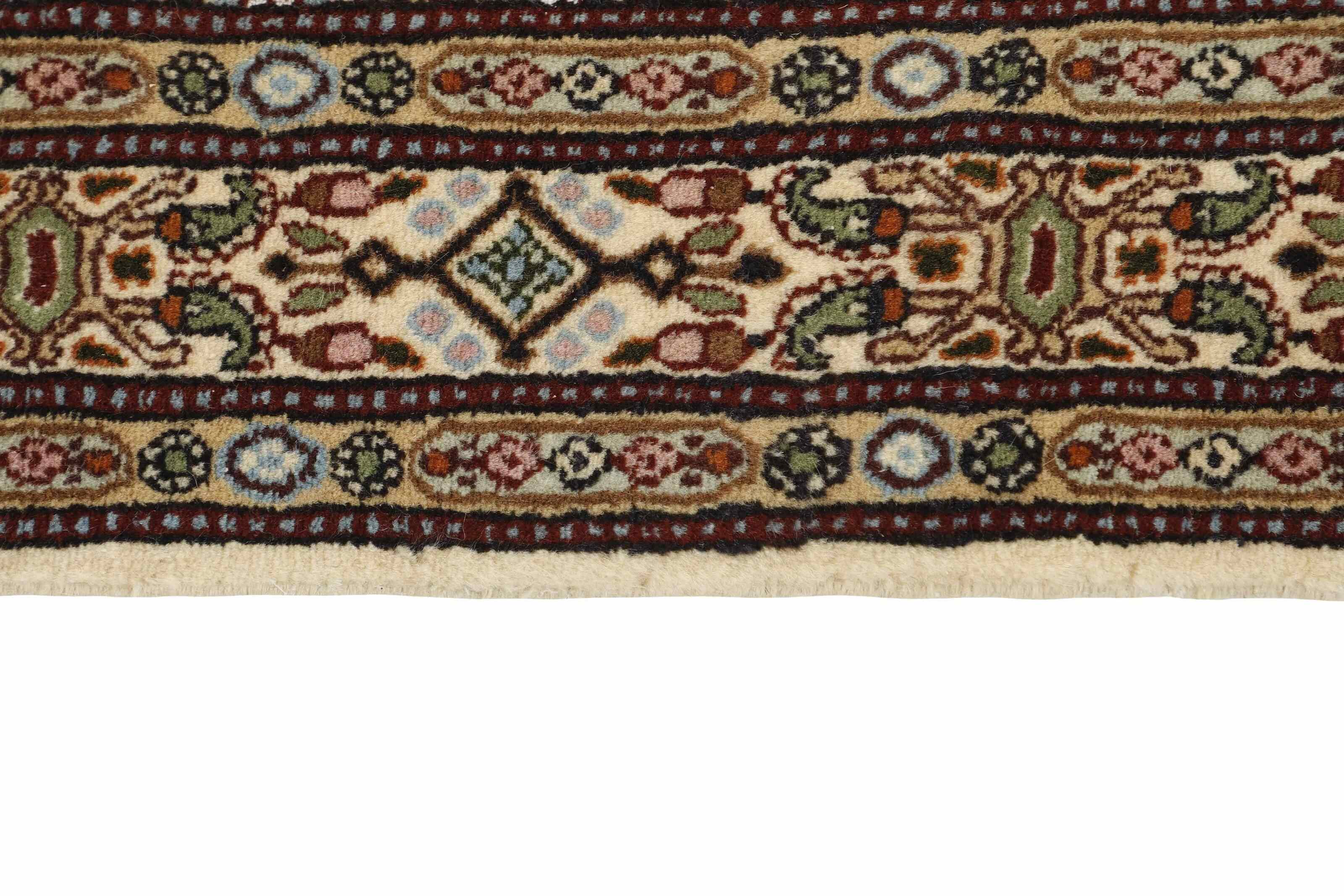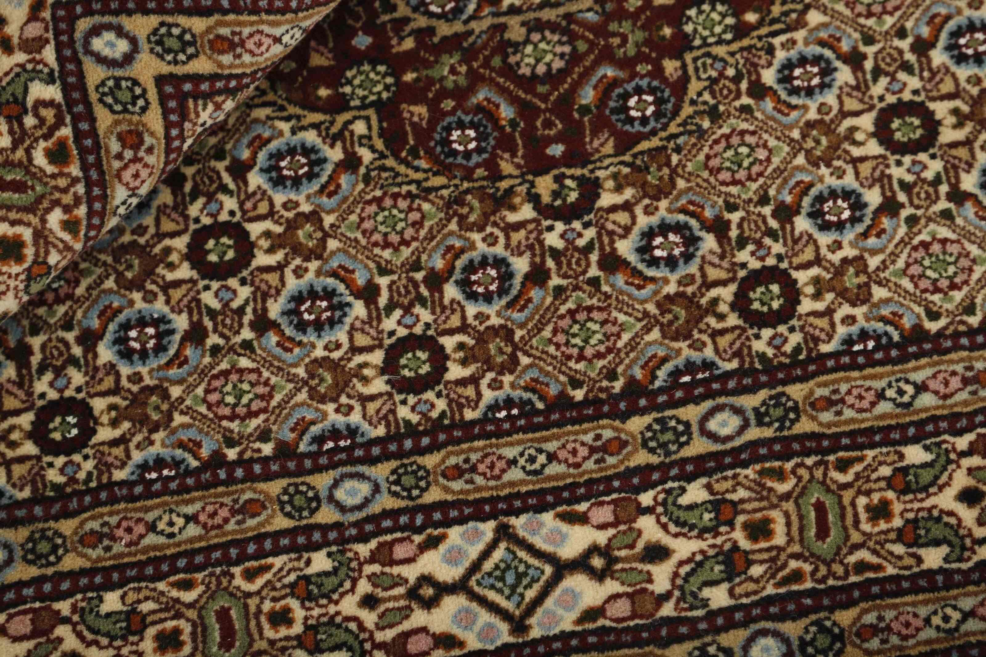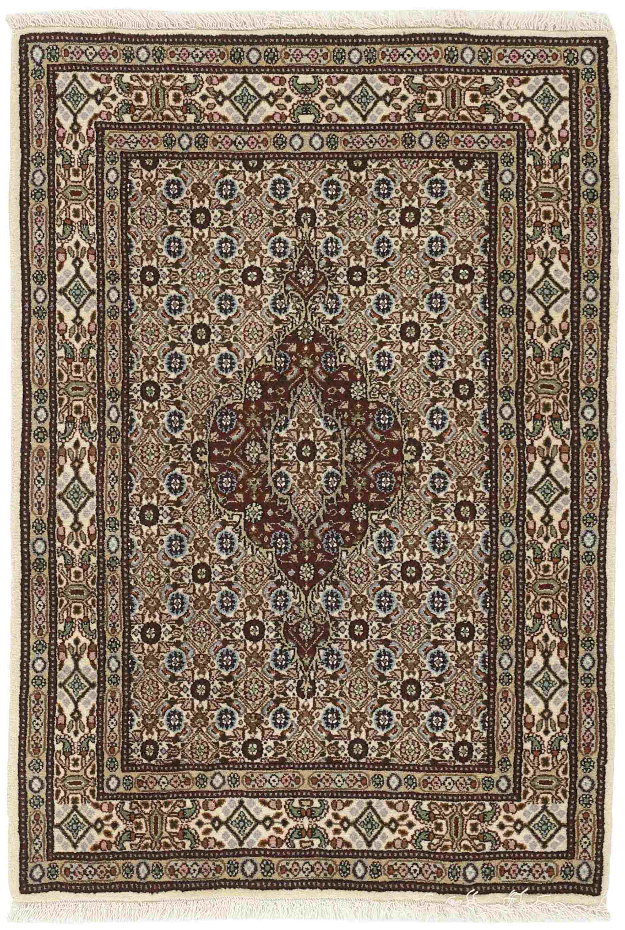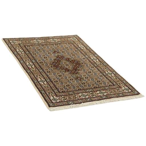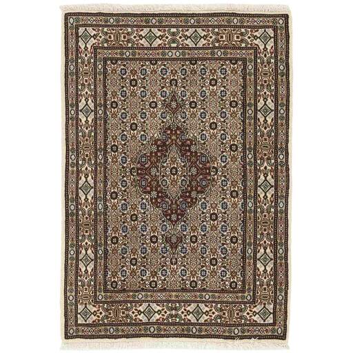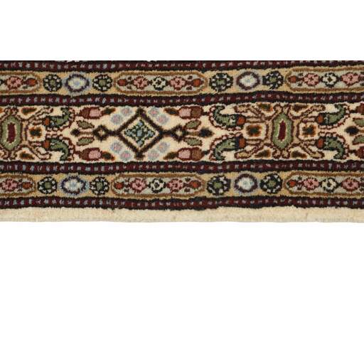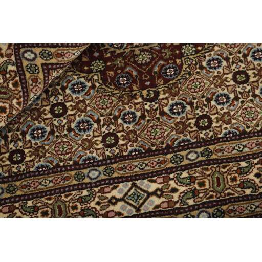 Moud est une petite ville au sud de Mashad, dans la province de Khorrasan. Les tapis de cette région se caractérisent par l'homogénéité de leurs motifs et de leur qualité. La chaîne et la trame sont en coton et le velours en laine. Les bordures sont une version de la bordure persane traditionnelle en tortue. Les tapis sont fabriqués dans toutes les tailles. Les tapis Moud sont souvent copiés en Inde, en raison de leur remarquable homogénéité. Les motifs caractéristiques de Moud sont parmi les plus uniformes, les plus réguliers et les plus facilement reconnaissables de la province de Khorrasan. Les Moud Mahi sont fabriqués dans des tons beige, rouge clair ou bleu, avec des motifs Mahi sur toute la surface ou avec un médaillon en forme d'étoile. Mahi signifie poisson et le motif Mahi est le motif le plus couramment utilisé dans les véritables tapis persans. En l'observant de près, vous pouvez voir un étang entouré de quatre poissons.