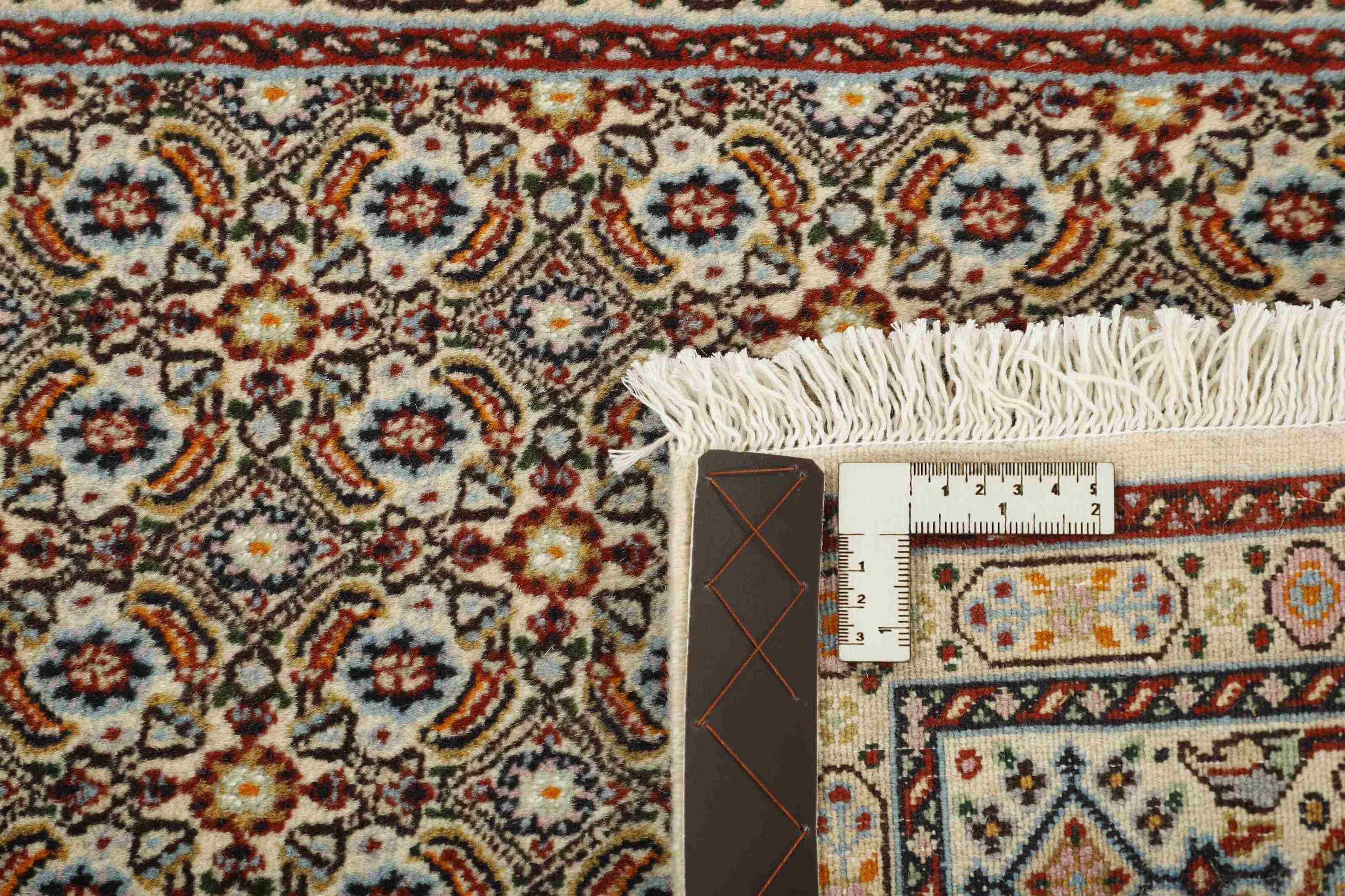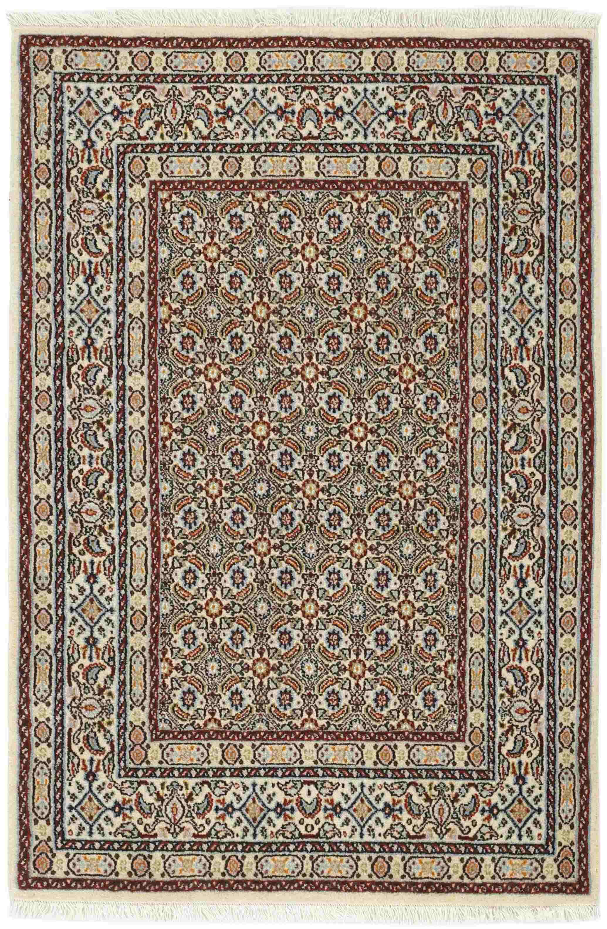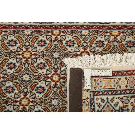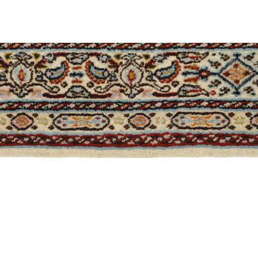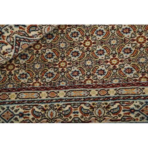 Moud est une petite ville au sud de Mashad, dans la province de Khorrasan. Les tapis de cette région se caractérisent par l'homogénéité de leurs motifs et de leur qualité. La chaîne et la trame sont en coton et le velours en laine. Les bordures sont une version de la bordure persane traditionnelle en tortue. Les tapis sont fabriqués dans toutes les tailles. Les tapis Moud sont souvent copiés en Inde, en raison de leur remarquable homogénéité. Les motifs caractéristiques de Moud sont parmi les plus uniformes, les plus réguliers et les plus facilement reconnaissables de la province de Khorrasan. Les Moud Mahi sont fabriqués dans des tons beige, rouge clair ou bleu, avec des motifs Mahi sur toute la surface ou avec un médaillon en forme d'étoile. Mahi signifie poisson et le motif Mahi est le motif le plus couramment utilisé dans les véritables tapis persans. En l'observant de près, vous pouvez voir un étang entouré de quatre poissons.