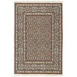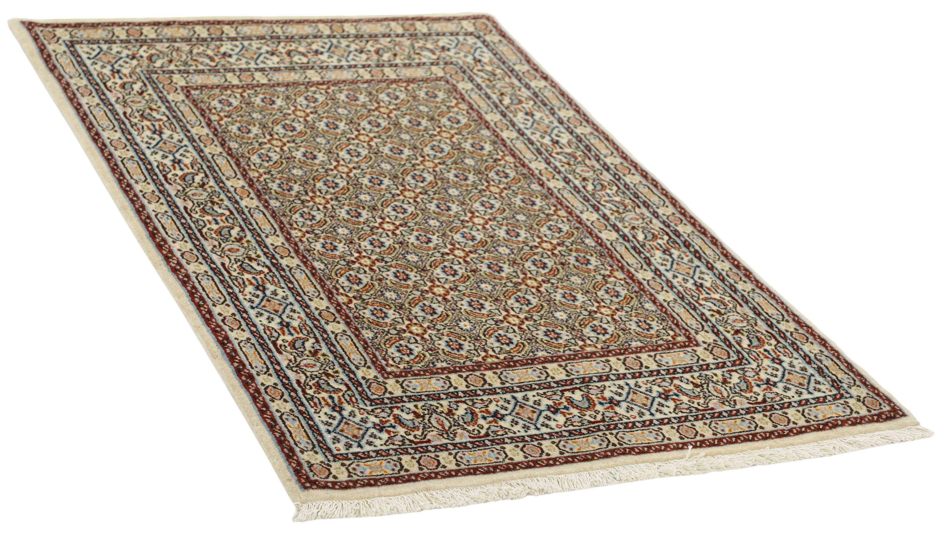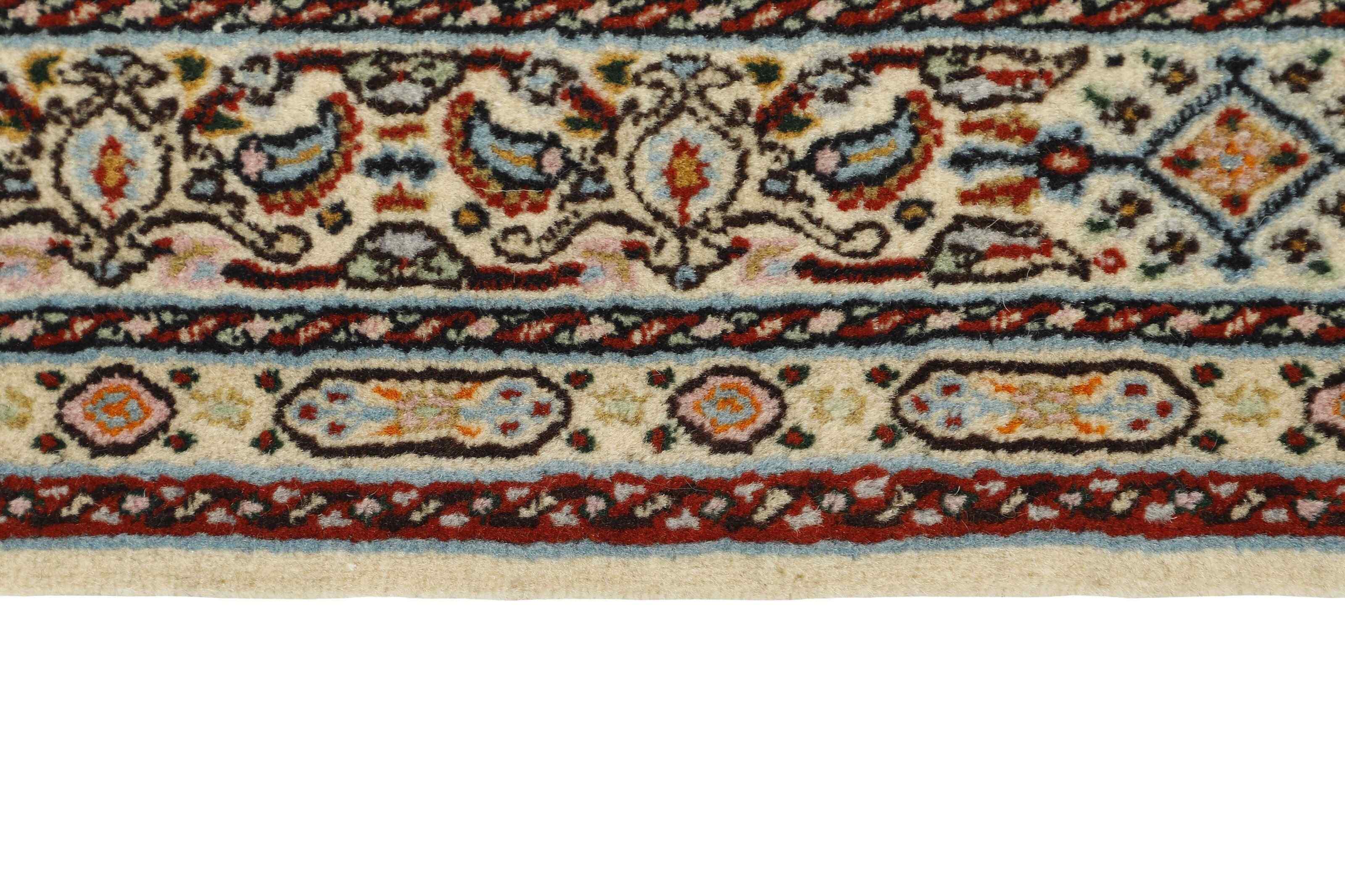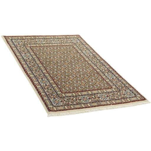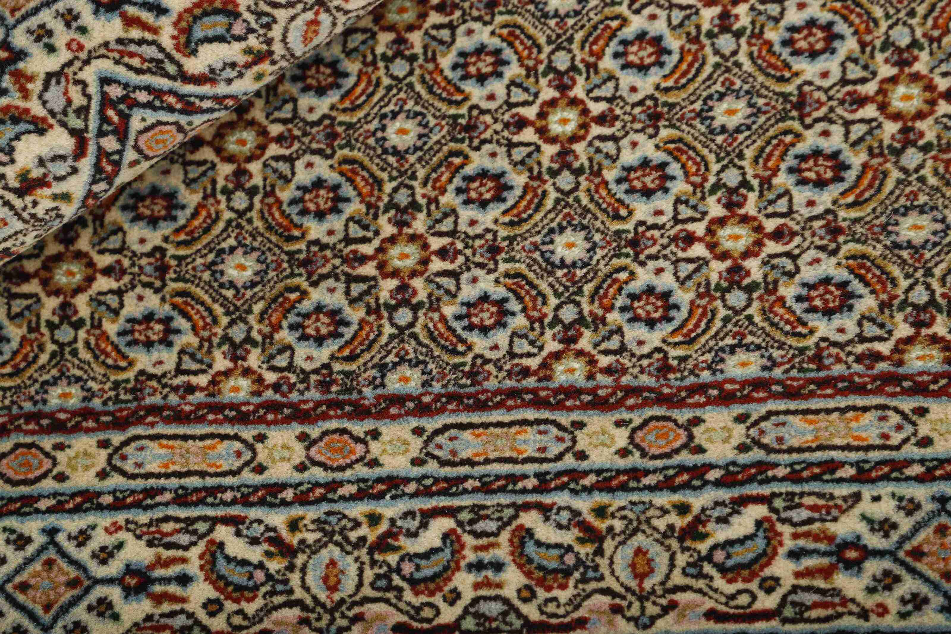 Moud est une petite ville au sud de Mashad, dans la province de Khorrasan. Les tapis de cette région se caractérisent par l'homogénéité de leurs motifs et de leur qualité. La chaîne et la trame sont en coton et le velours en laine. Les bordures sont une version de la bordure persane traditionnelle en tortue. Les tapis sont fabriqués dans toutes les tailles. Les tapis Moud sont souvent copiés en Inde, en raison de leur remarquable homogénéité. Les motifs caractéristiques de Moud sont parmi les plus uniformes, les plus réguliers et les plus facilement reconnaissables de la province de Khorrasan. Les Moud Mahi sont fabriqués dans des tons beige, rouge clair ou bleu, avec des motifs Mahi sur toute la surface ou avec un médaillon en forme d'étoile. Mahi signifie poisson et le motif Mahi est le motif le plus couramment utilisé dans les véritables tapis persans. En l'observant de près, vous pouvez voir un étang entouré de quatre poissons.