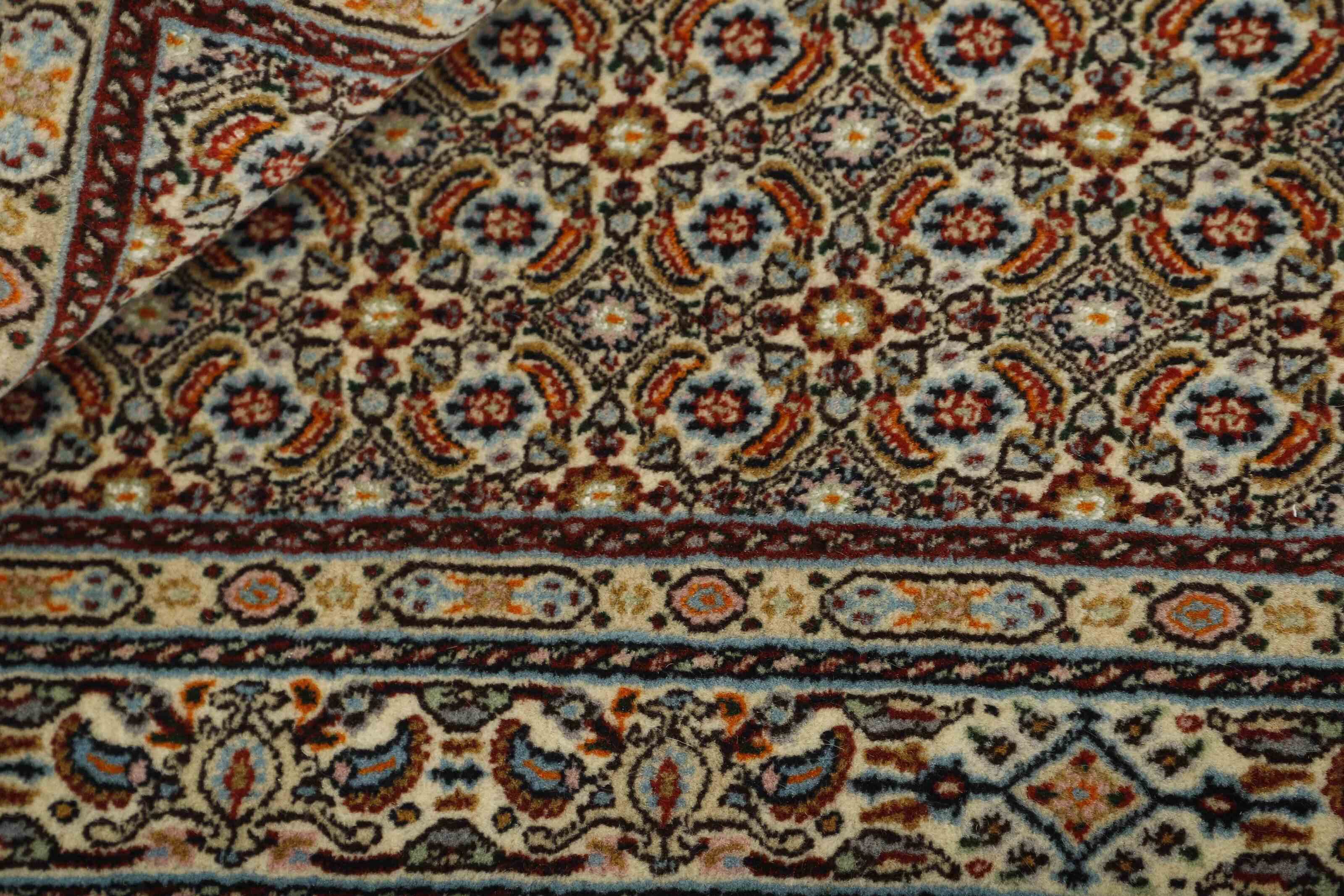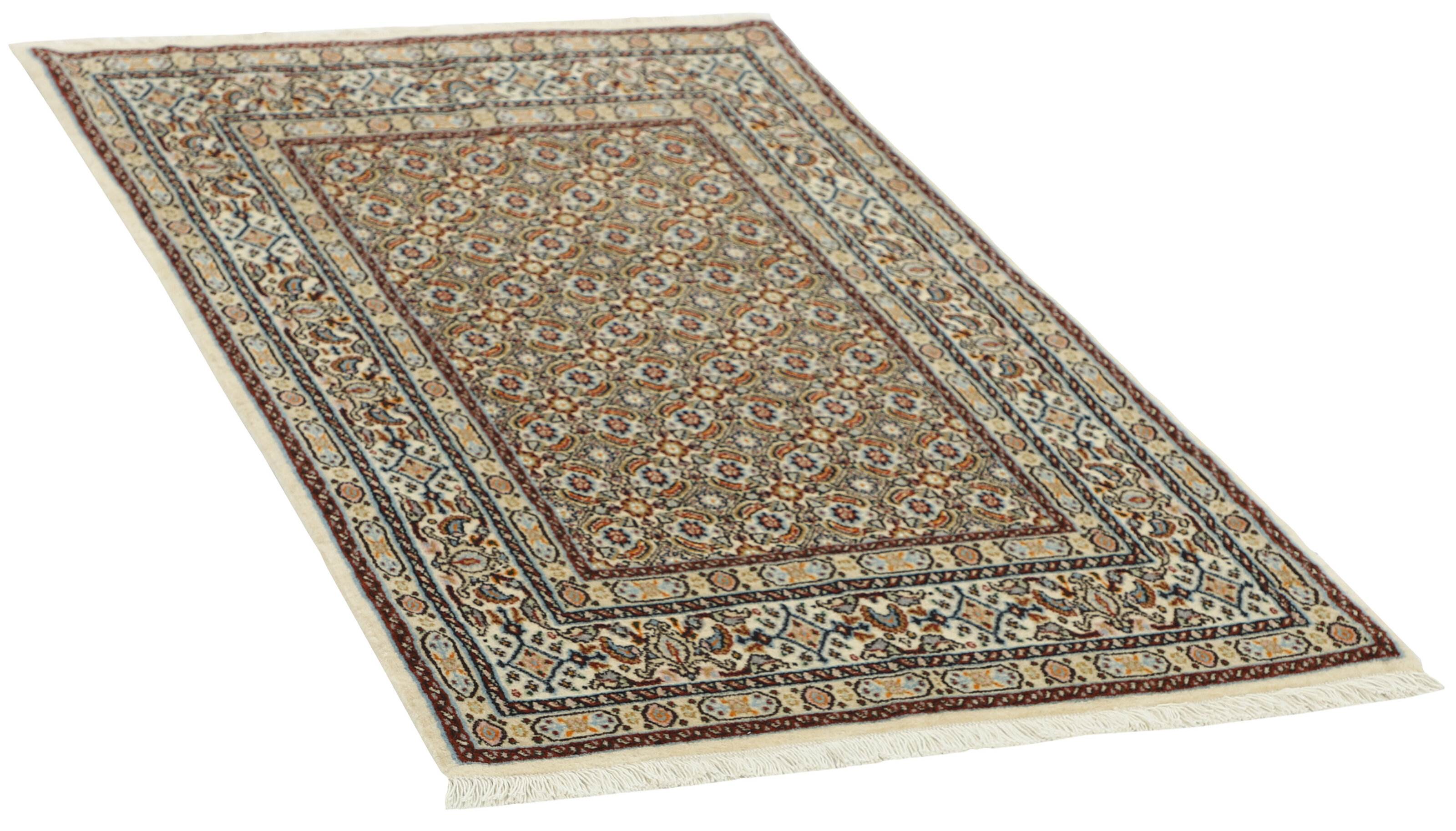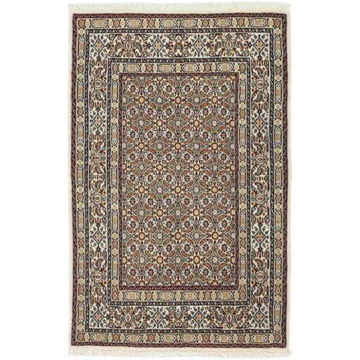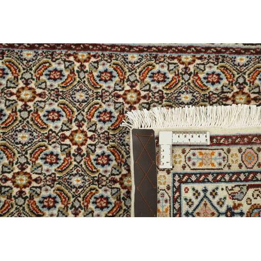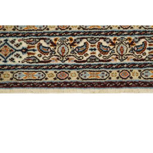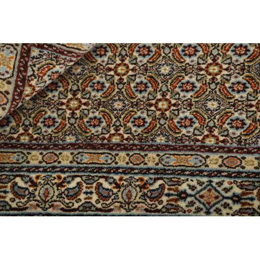 Moud est une petite ville au sud de Mashad, dans la province de Khorrasan. Les tapis de cette région se caractérisent par l'homogénéité de leurs motifs et de leur qualité. La chaîne et la trame sont en coton et le velours en laine. Les bordures sont une version de la bordure persane traditionnelle en tortue. Les tapis sont fabriqués dans toutes les tailles. Les tapis Moud sont souvent copiés en Inde, en raison de leur remarquable homogénéité. Les motifs caractéristiques de Moud sont parmi les plus uniformes, les plus réguliers et les plus facilement reconnaissables de la province de Khorrasan. Les Moud Mahi sont fabriqués dans des tons beige, rouge clair ou bleu, avec des motifs Mahi sur toute la surface ou avec un médaillon en forme d'étoile. Mahi signifie poisson et le motif Mahi est le motif le plus couramment utilisé dans les véritables tapis persans. En l'observant de près, vous pouvez voir un étang entouré de quatre poissons.