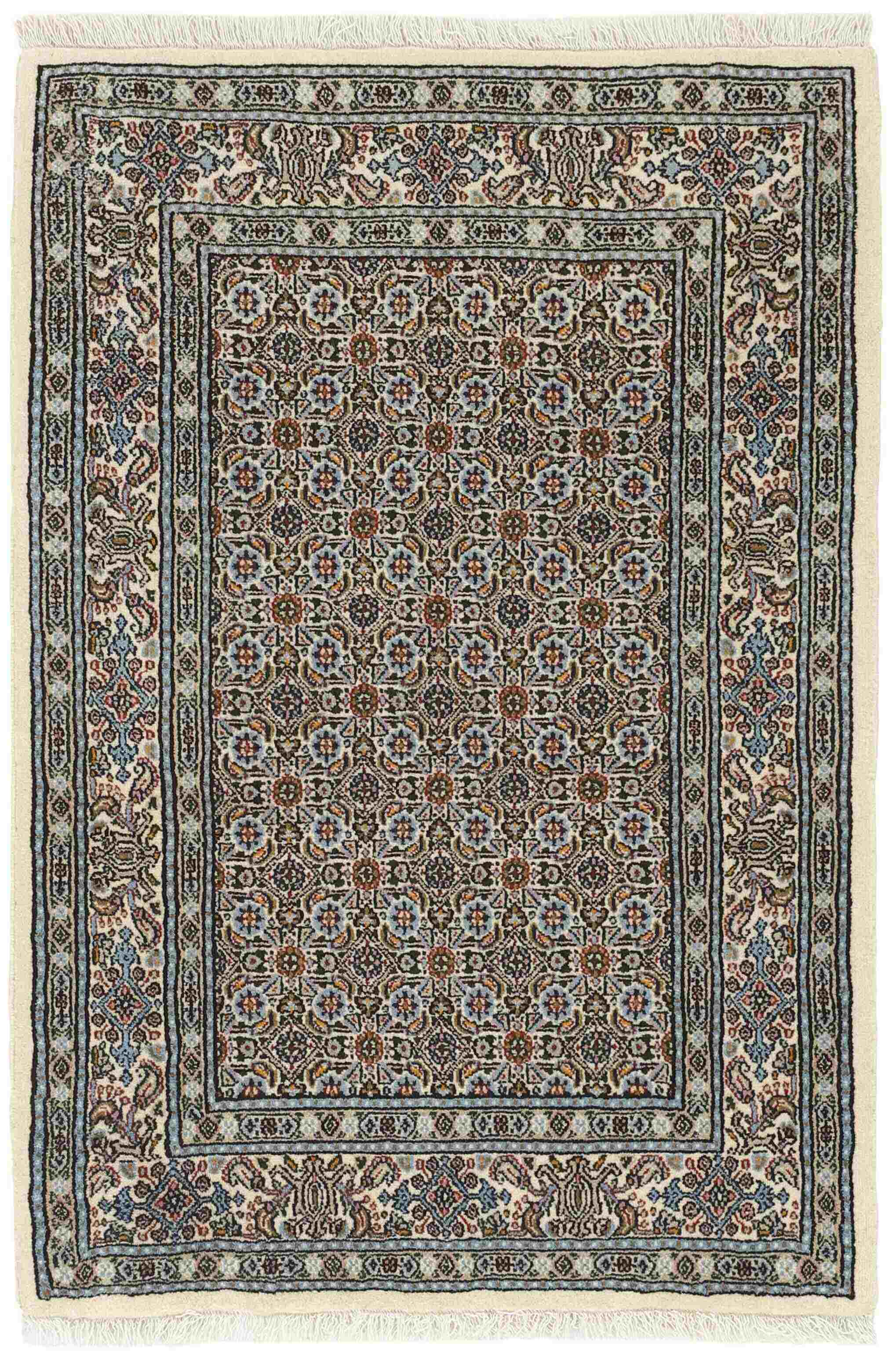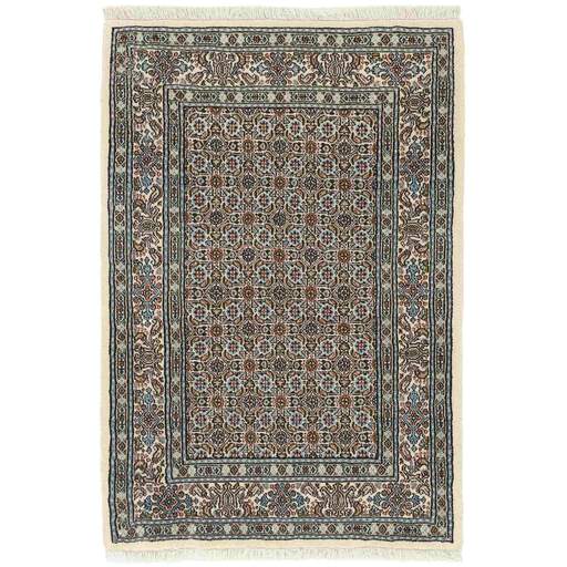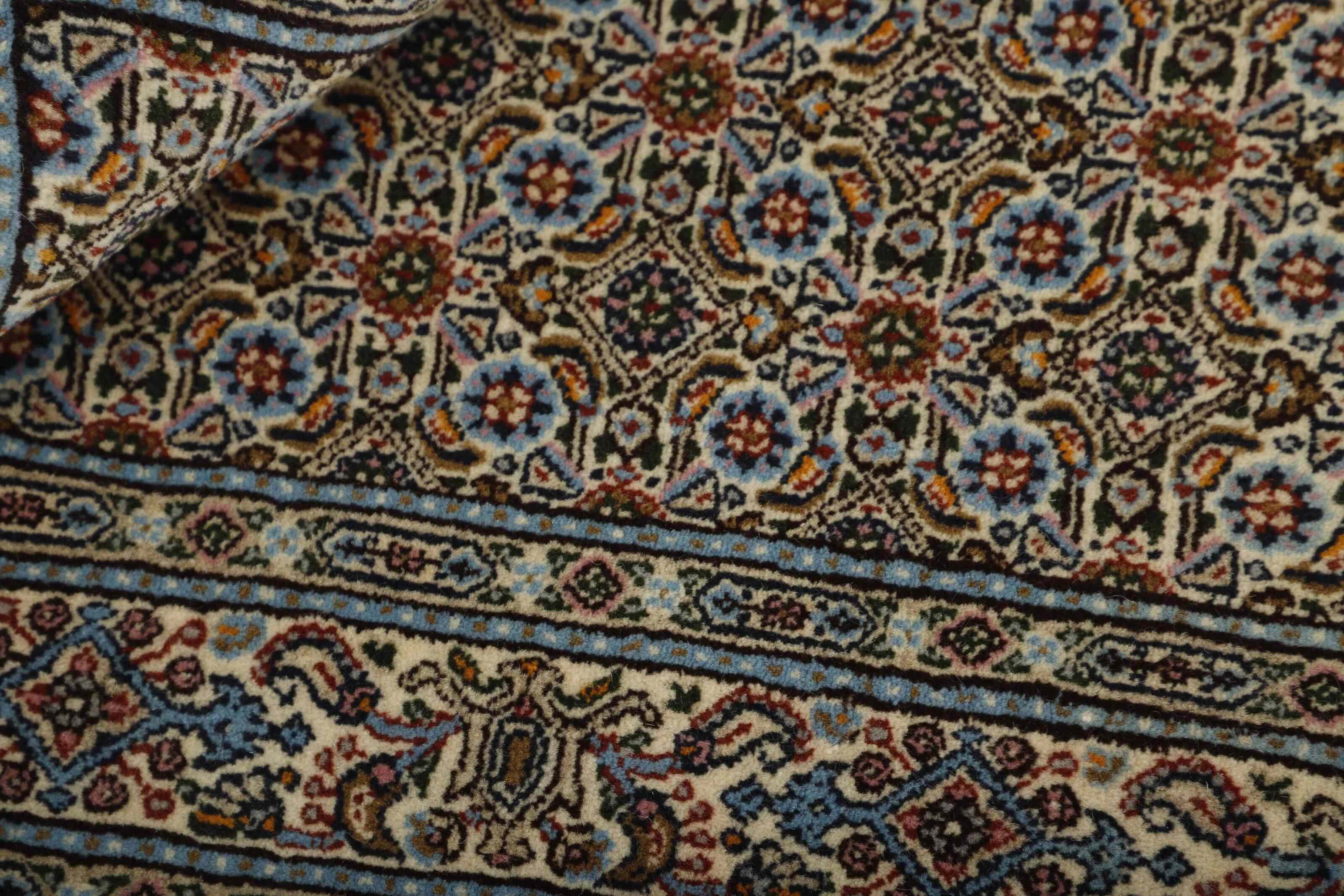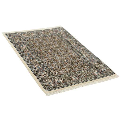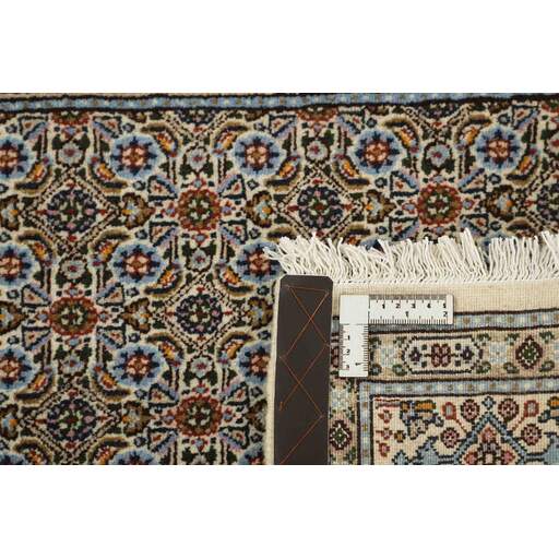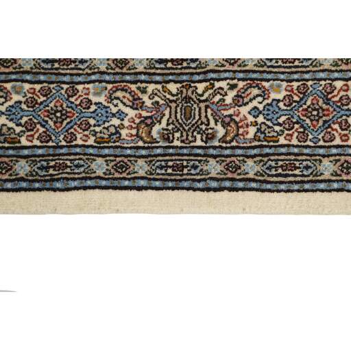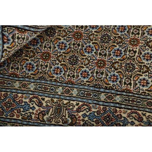 Moud est une petite ville au sud de Mashad, dans la province de Khorrasan. Les tapis de cette région se caractérisent par l'homogénéité de leurs motifs et de leur qualité. La chaîne et la trame sont en coton et le velours en laine. Les bordures sont une version de la bordure persane traditionnelle en tortue. Les tapis sont fabriqués dans toutes les tailles. Les tapis Moud sont souvent copiés en Inde, en raison de leur remarquable homogénéité. Les motifs caractéristiques de Moud sont parmi les plus uniformes, les plus réguliers et les plus facilement reconnaissables de la province de Khorrasan. Les Moud Mahi sont fabriqués dans des tons beige, rouge clair ou bleu, avec des motifs Mahi sur toute la surface ou avec un médaillon en forme d'étoile. Mahi signifie poisson et le motif Mahi est le motif le plus couramment utilisé dans les véritables tapis persans. En l'observant de près, vous pouvez voir un étang entouré de quatre poissons.