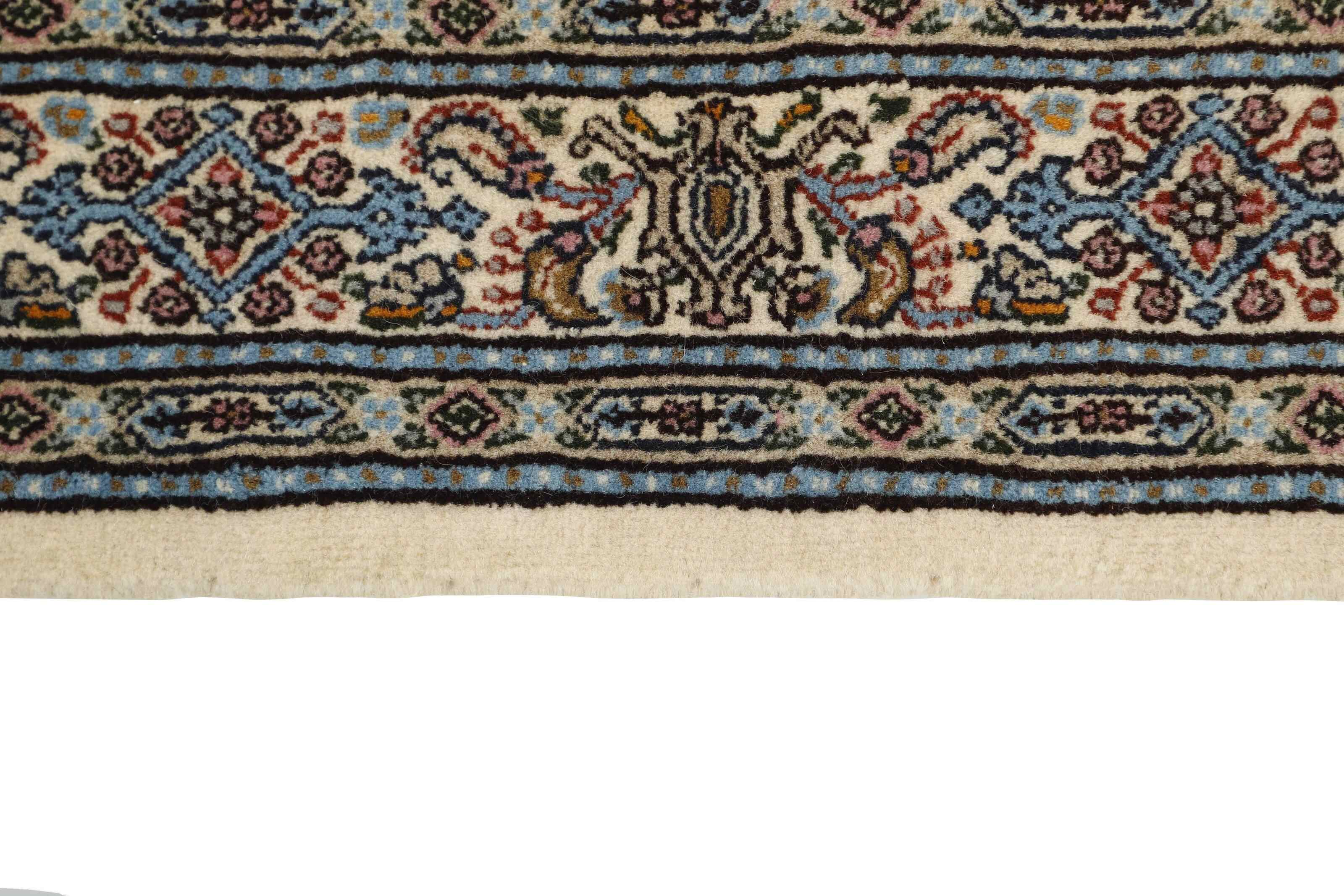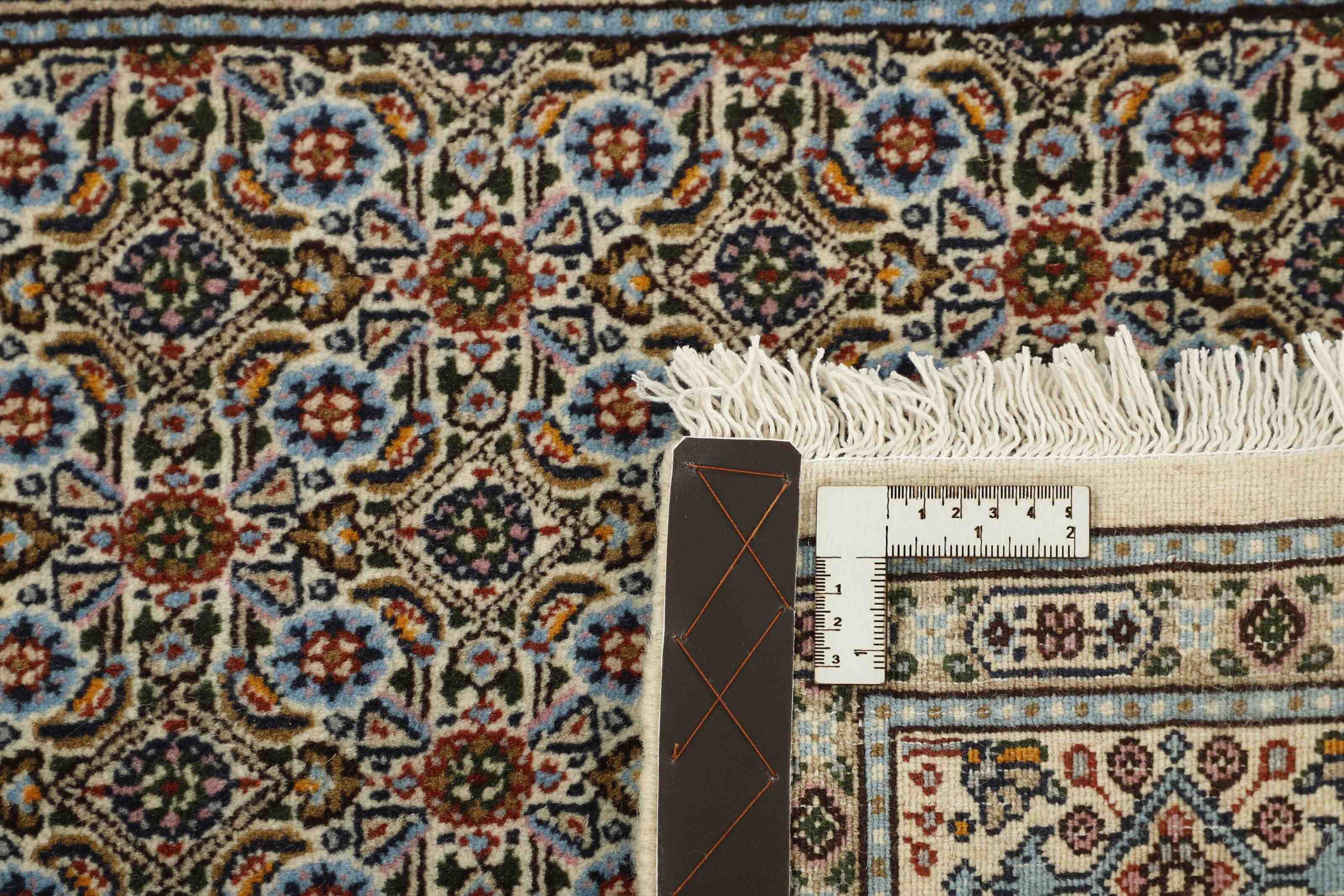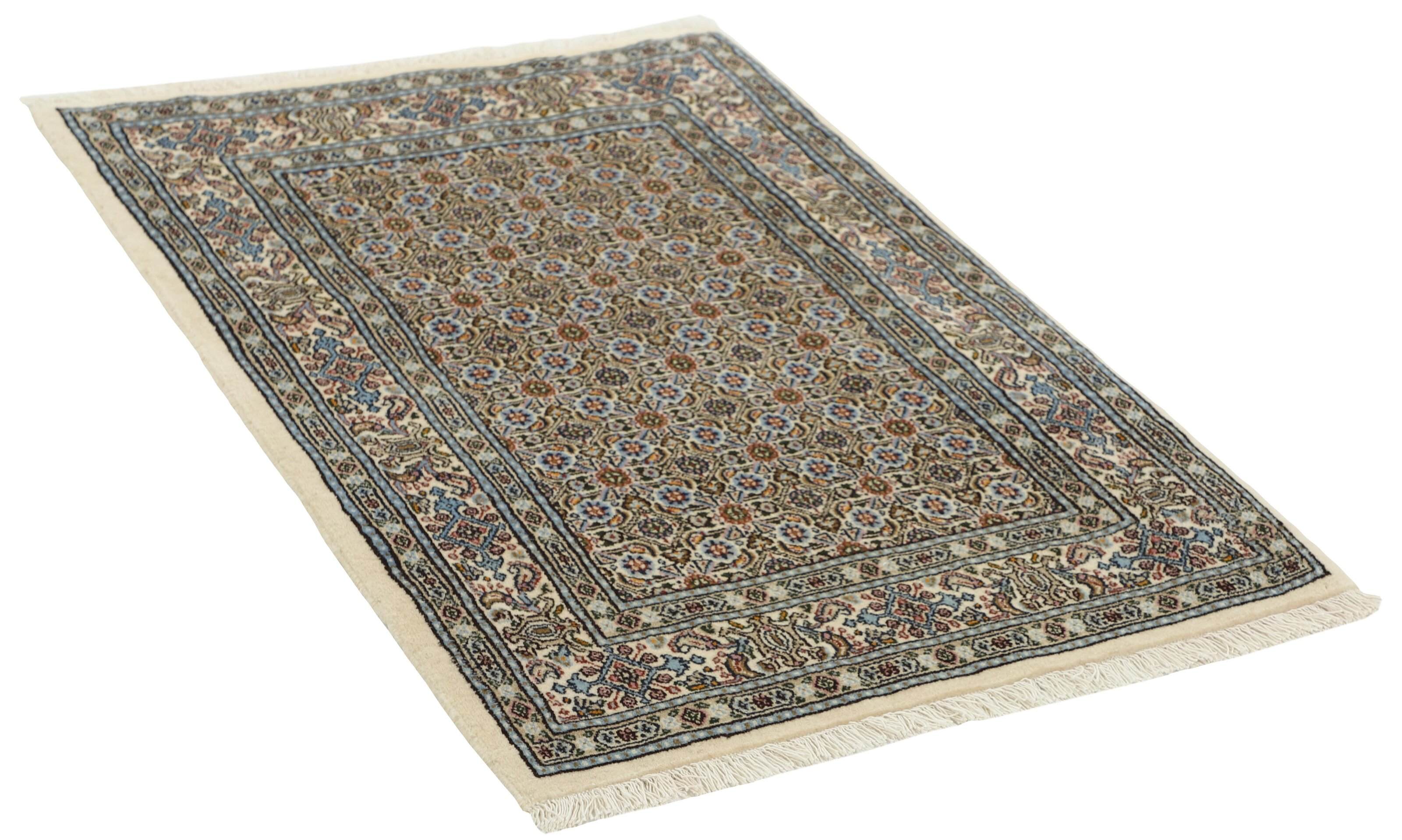 Moud est une petite ville au sud de Mashad, dans la province de Khorrasan. Les tapis de cette région se caractérisent par l'homogénéité de leurs motifs et de leur qualité. La chaîne et la trame sont en coton et le velours en laine. Les bordures sont une version de la bordure persane traditionnelle en tortue. Les tapis sont fabriqués dans toutes les tailles. Les tapis Moud sont souvent copiés en Inde, en raison de leur remarquable homogénéité. Les motifs caractéristiques de Moud sont parmi les plus uniformes, les plus réguliers et les plus facilement reconnaissables de la province de Khorrasan. Les Moud Mahi sont fabriqués dans des tons beige, rouge clair ou bleu, avec des motifs Mahi sur toute la surface ou avec un médaillon en forme d'étoile. Mahi signifie poisson et le motif Mahi est le motif le plus couramment utilisé dans les véritables tapis persans. En l'observant de près, vous pouvez voir un étang entouré de quatre poissons.
