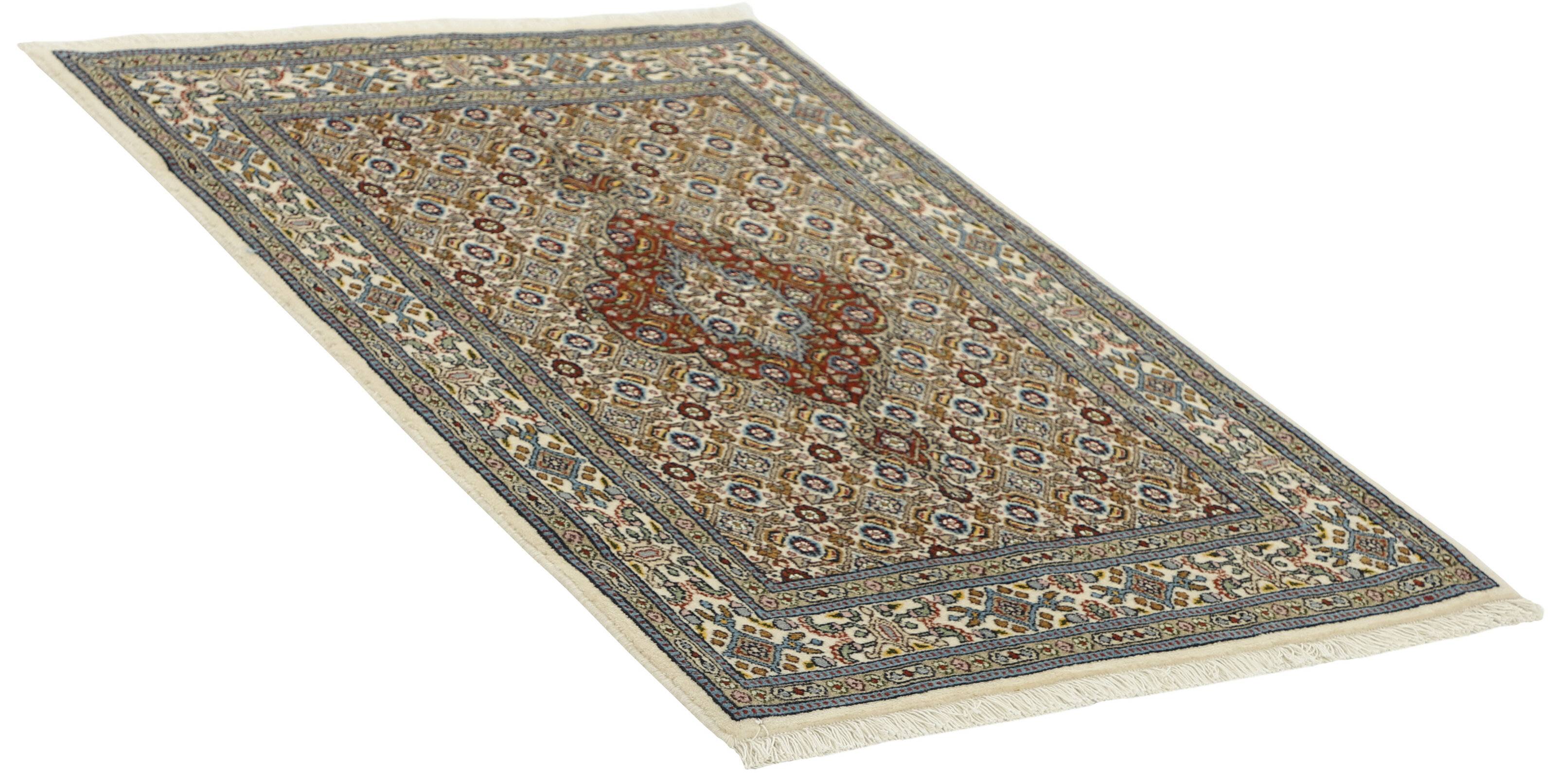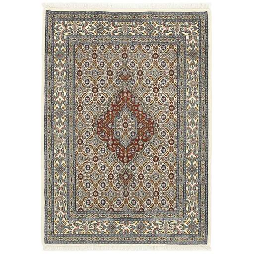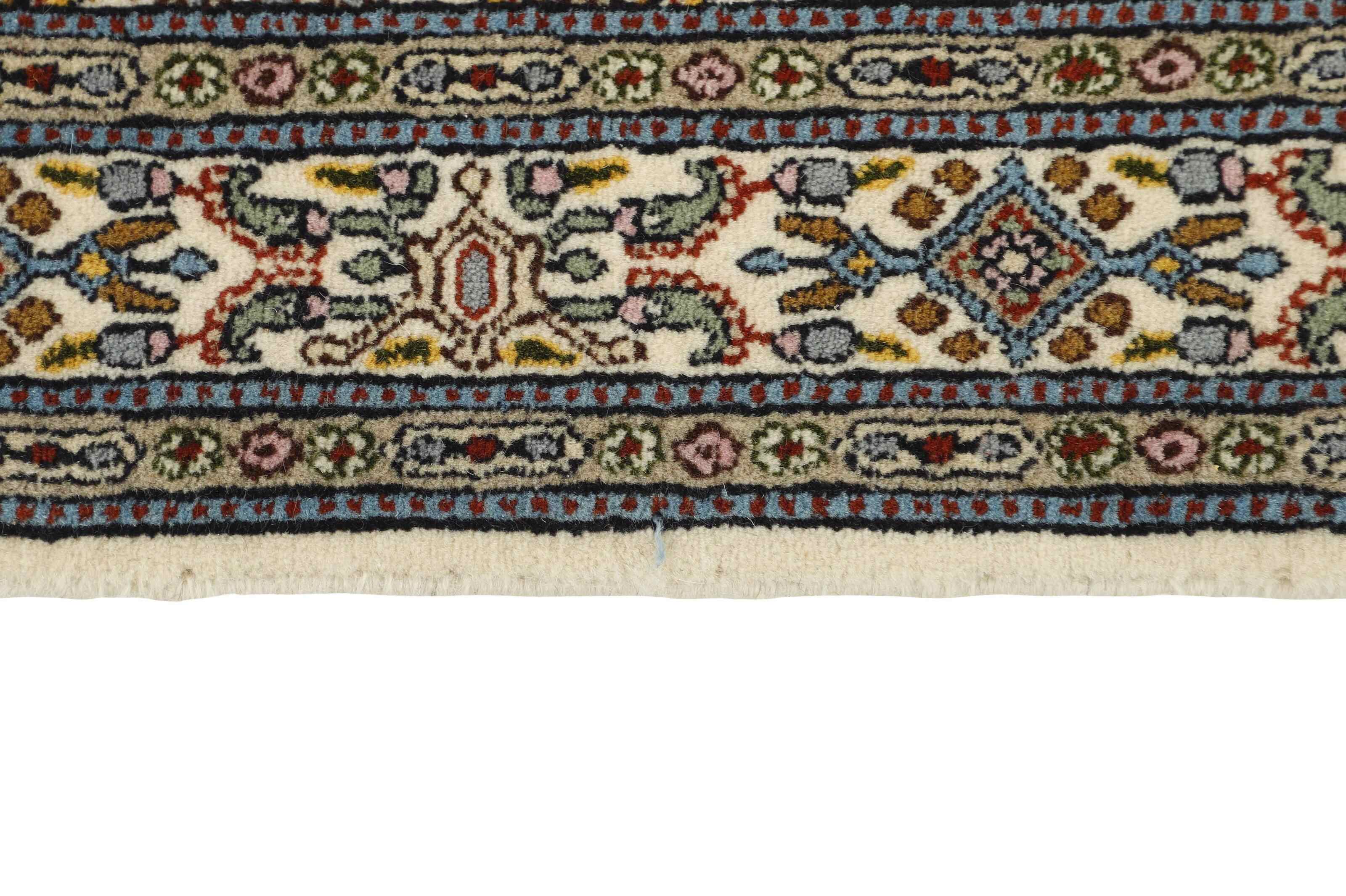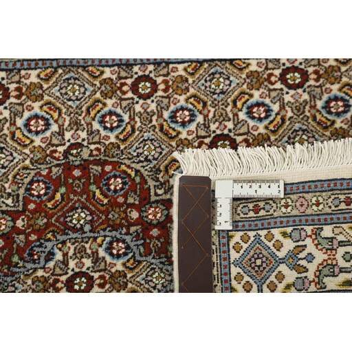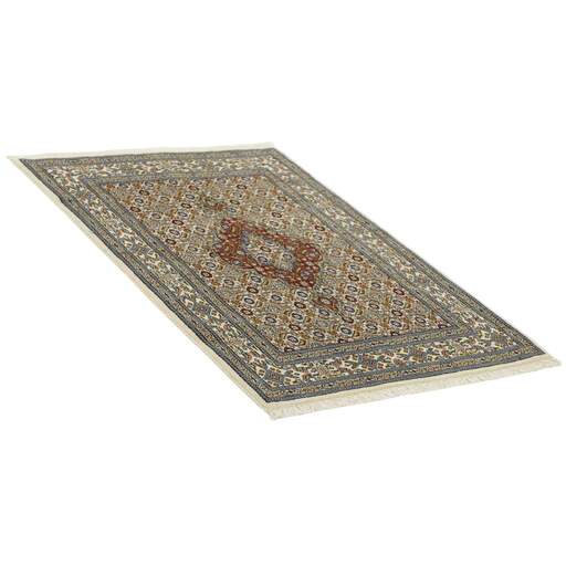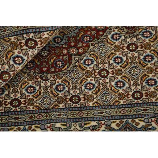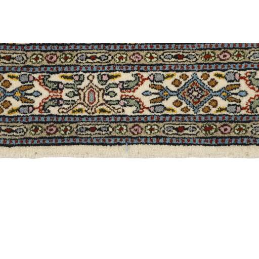 Moud est une petite ville au sud de Mashad, dans la province de Khorrasan. Les tapis de cette région se caractérisent par l'homogénéité de leurs motifs et de leur qualité. La chaîne et la trame sont en coton et le velours en laine. Les bordures sont une version de la bordure persane traditionnelle en tortue. Les tapis sont fabriqués dans toutes les tailles. Les tapis Moud sont souvent copiés en Inde, en raison de leur remarquable homogénéité. Les motifs caractéristiques de Moud sont parmi les plus uniformes, les plus réguliers et les plus facilement reconnaissables de la province de Khorrasan. Les Moud Mahi sont fabriqués dans des tons beige, rouge clair ou bleu, avec des motifs Mahi sur toute la surface ou avec un médaillon en forme d'étoile. Mahi signifie poisson et le motif Mahi est le motif le plus couramment utilisé dans les véritables tapis persans. En l'observant de près, vous pouvez voir un étang entouré de quatre poissons.