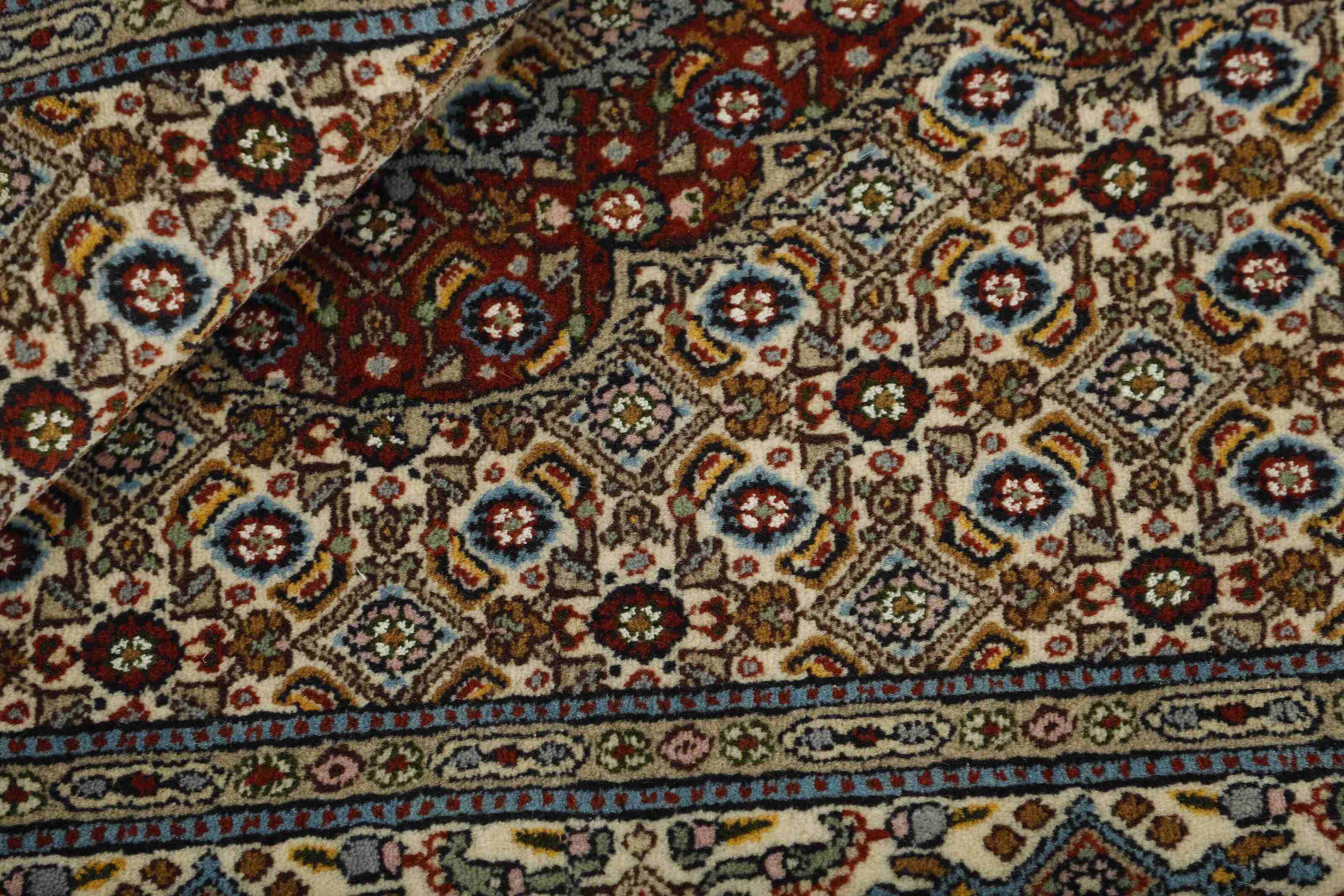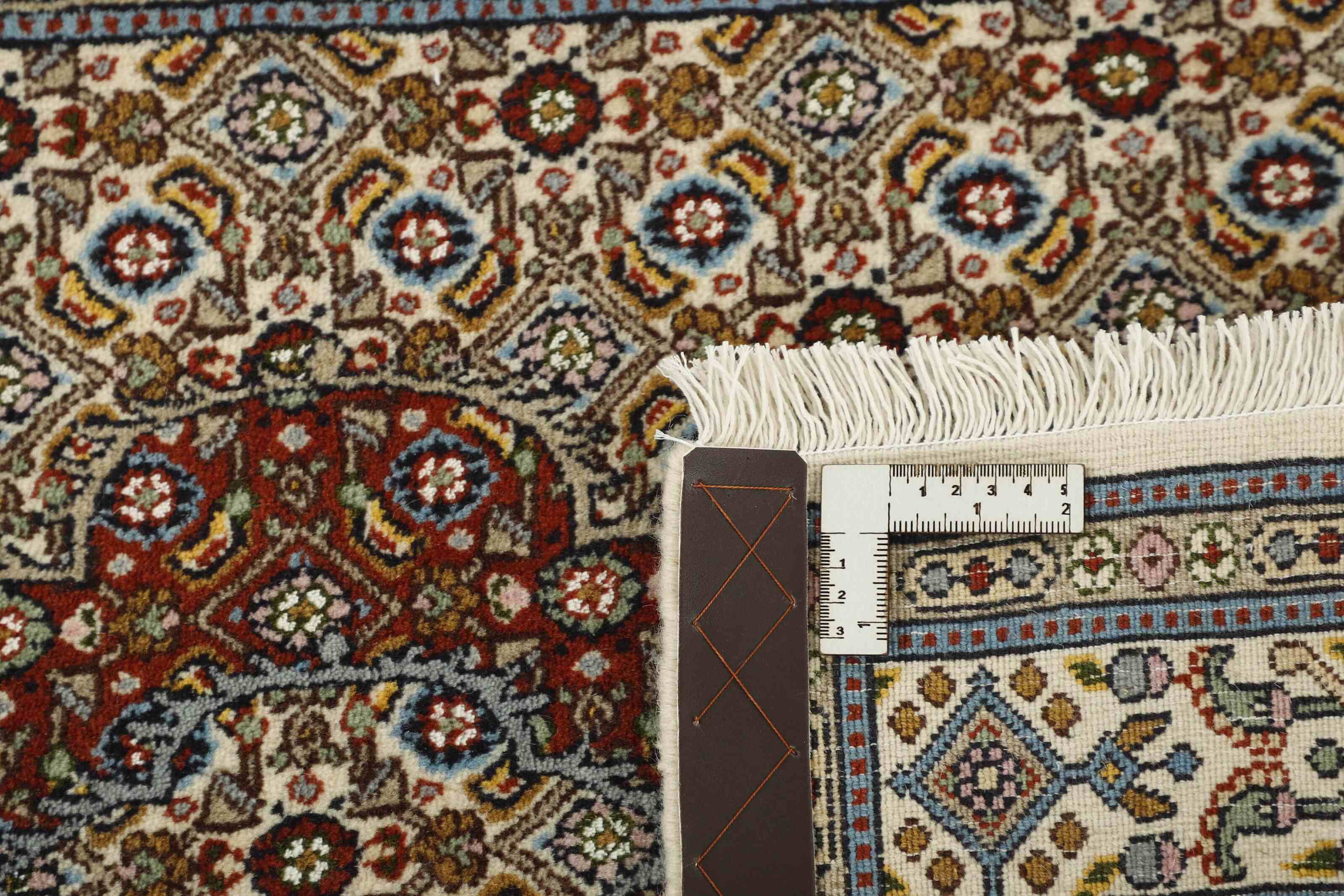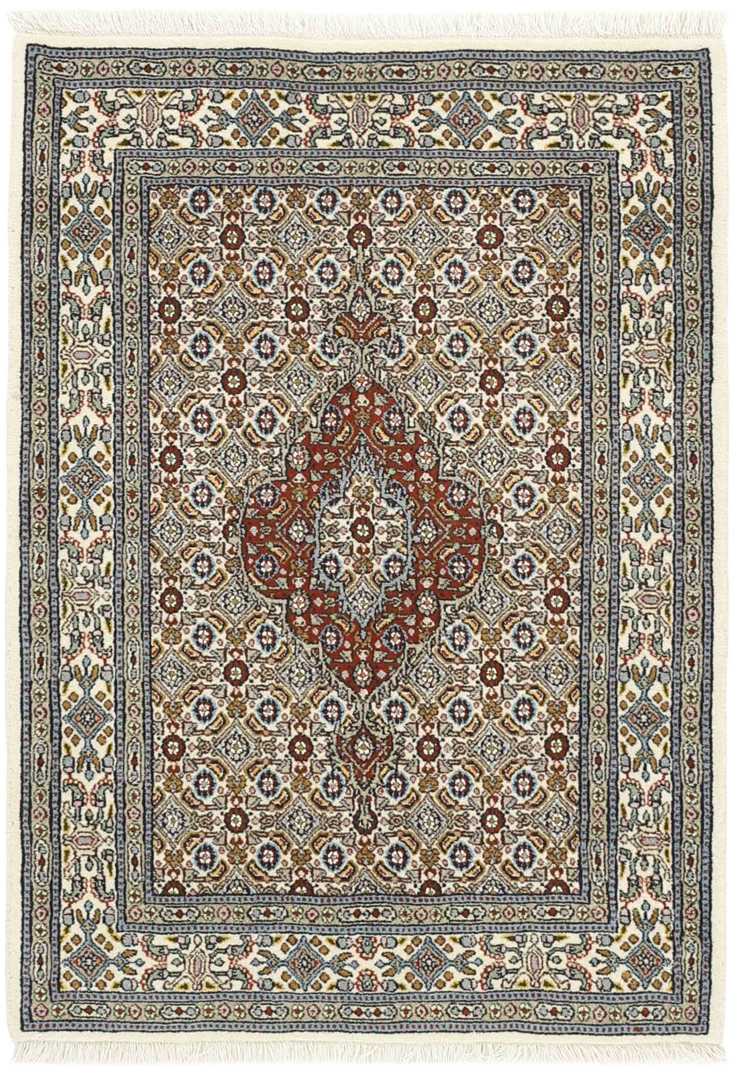Moud est une petite ville au sud de Mashad, dans la province de Khorrasan. Les tapis de cette région se caractérisent par l'homogénéité de leurs motifs et de leur qualité. La chaîne et la trame sont en coton et le velours en laine. Les bordures sont une version de la bordure persane traditionnelle en tortue. Les tapis sont fabriqués dans toutes les tailles. Les tapis Moud sont souvent copiés en Inde, en raison de leur remarquable homogénéité. Les motifs caractéristiques de Moud sont parmi les plus uniformes, les plus réguliers et les plus facilement reconnaissables de la province de Khorrasan. Les Moud Mahi sont fabriqués dans des tons beige, rouge clair ou bleu, avec des motifs Mahi sur toute la surface ou avec un médaillon en forme d'étoile. Mahi signifie poisson et le motif Mahi est le motif le plus couramment utilisé dans les véritables tapis persans. En l'observant de près, vous pouvez voir un étang entouré de quatre poissons.
