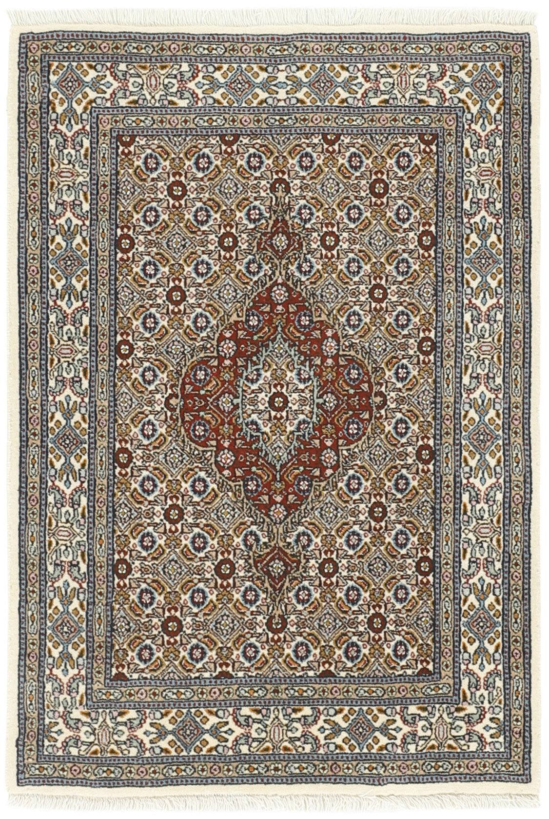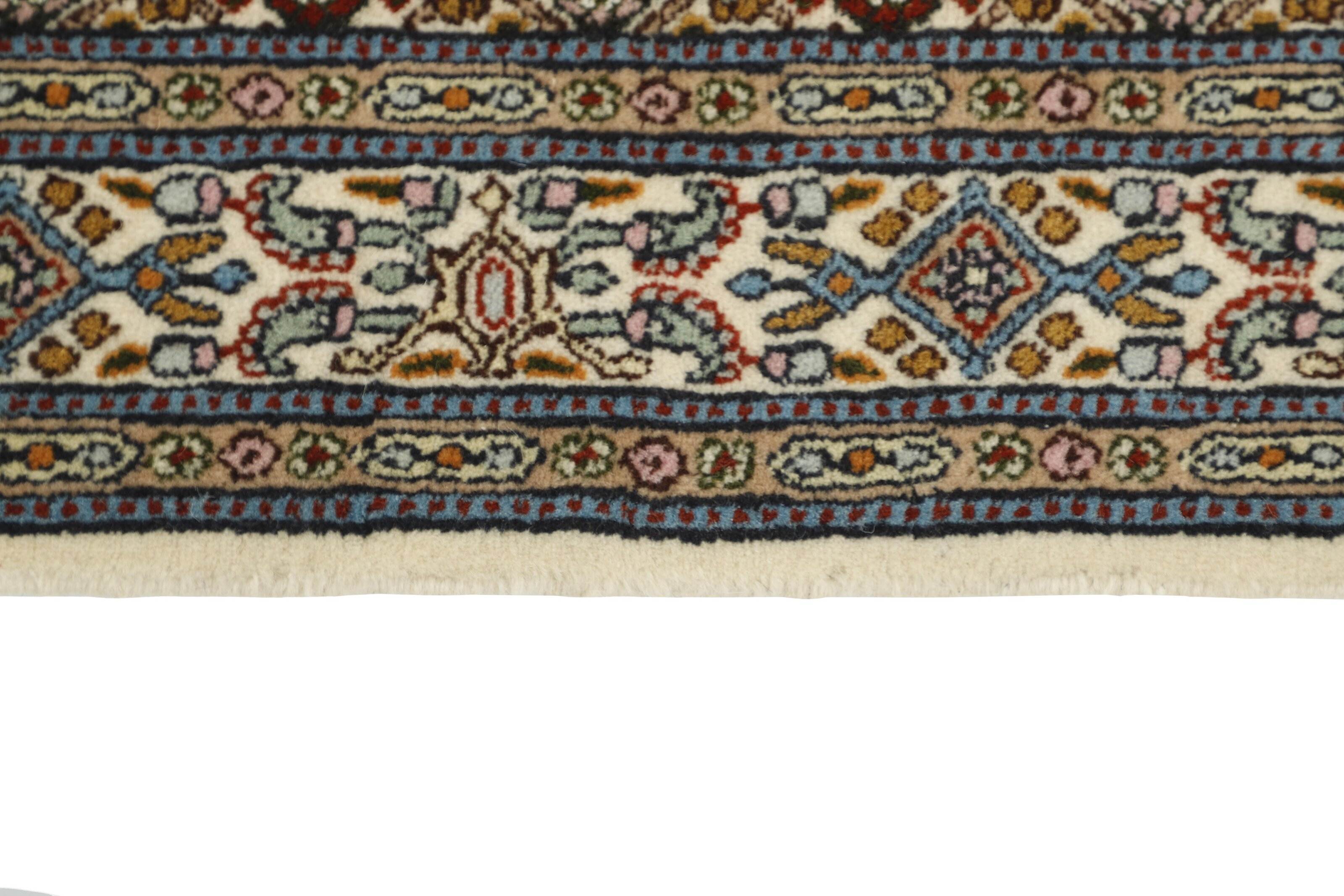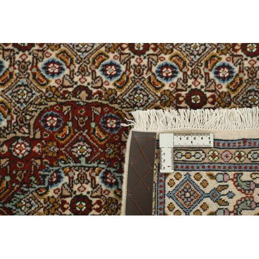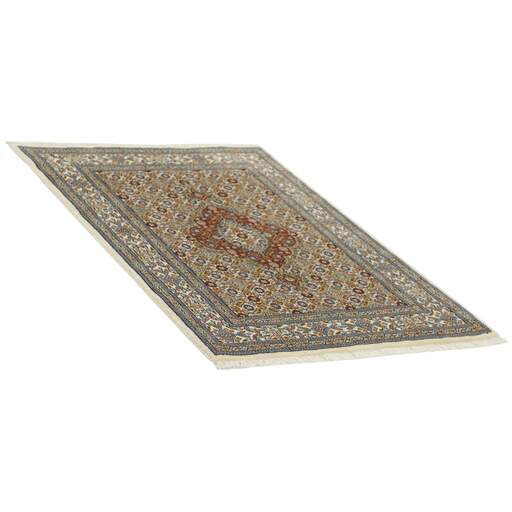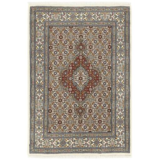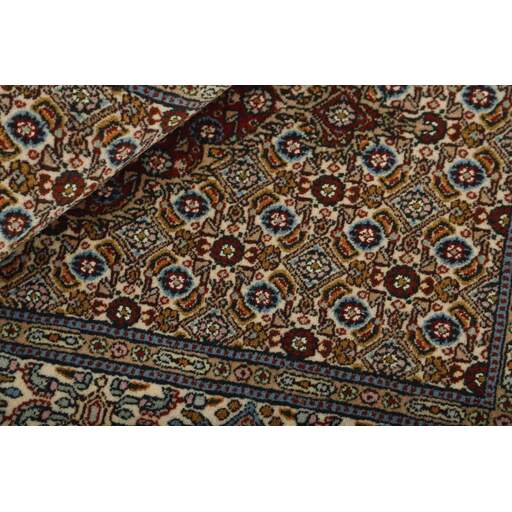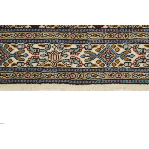Moud est une petite ville au sud de Mashad, dans la province de Khorrasan. Les tapis de cette région se caractérisent par l'homogénéité de leurs motifs et de leur qualité. La chaîne et la trame sont en coton et le velours en laine. Les bordures sont une version de la bordure persane traditionnelle en tortue. Les tapis sont fabriqués dans toutes les tailles. Les tapis Moud sont souvent copiés en Inde, en raison de leur remarquable homogénéité. Les motifs caractéristiques de Moud sont parmi les plus uniformes, les plus réguliers et les plus facilement reconnaissables de la province de Khorrasan. Les Moud Mahi sont fabriqués dans des tons beige, rouge clair ou bleu, avec des motifs Mahi sur toute la surface ou avec un médaillon en forme d'étoile. Mahi signifie poisson et le motif Mahi est le motif le plus couramment utilisé dans les véritables tapis persans. En l'observant de près, vous pouvez voir un étang entouré de quatre poissons.
