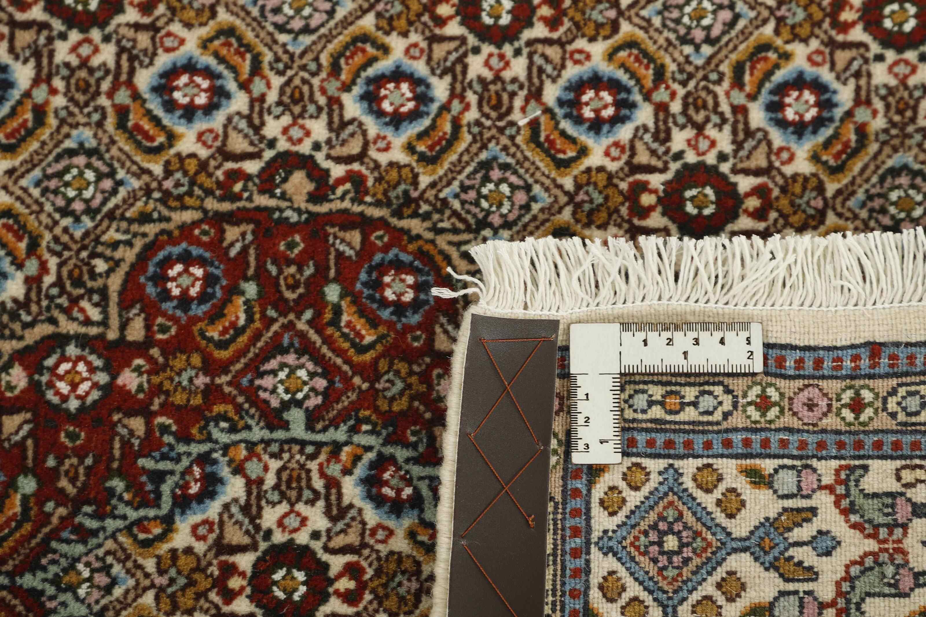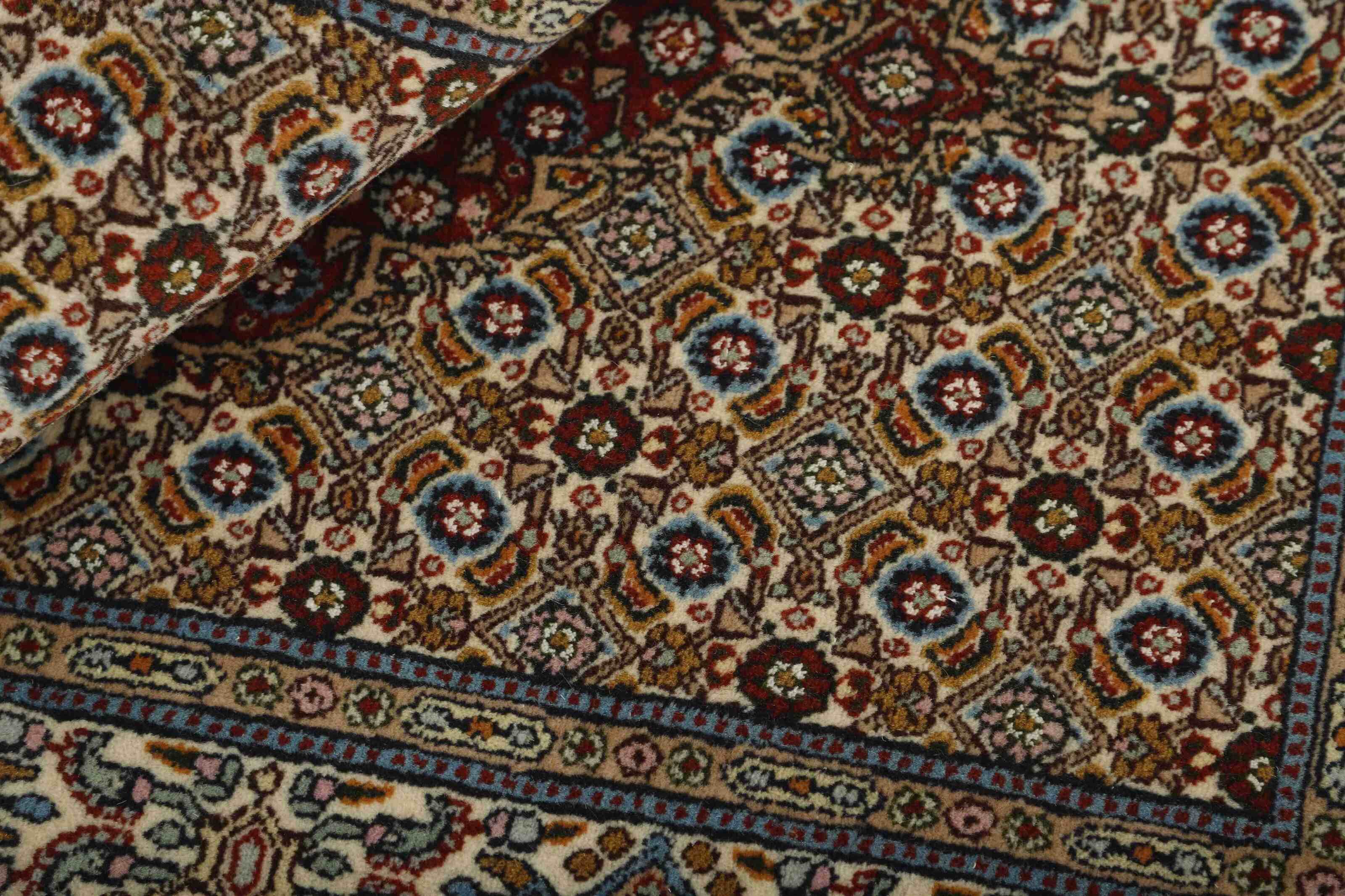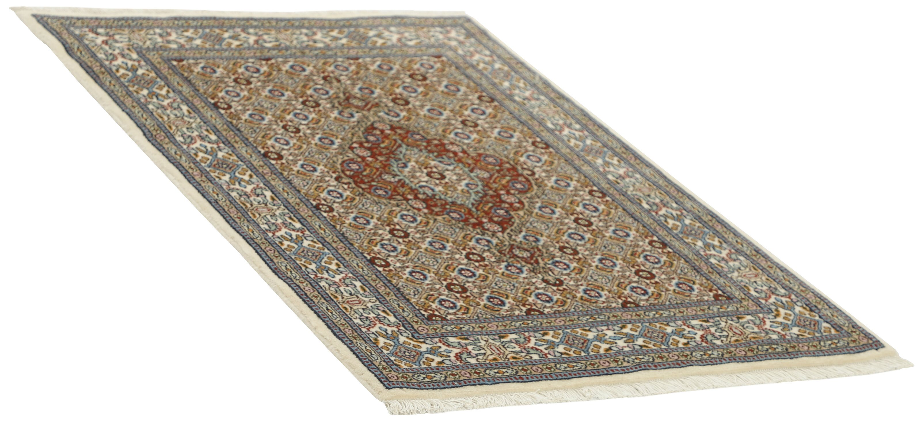 Moud est une petite ville au sud de Mashad, dans la province de Khorrasan. Les tapis de cette région se caractérisent par l'homogénéité de leurs motifs et de leur qualité. La chaîne et la trame sont en coton et le velours en laine. Les bordures sont une version de la bordure persane traditionnelle en tortue. Les tapis sont fabriqués dans toutes les tailles. Les tapis Moud sont souvent copiés en Inde, en raison de leur remarquable homogénéité. Les motifs caractéristiques de Moud sont parmi les plus uniformes, les plus réguliers et les plus facilement reconnaissables de la province de Khorrasan. Les Moud Mahi sont fabriqués dans des tons beige, rouge clair ou bleu, avec des motifs Mahi sur toute la surface ou avec un médaillon en forme d'étoile. Mahi signifie poisson et le motif Mahi est le motif le plus couramment utilisé dans les véritables tapis persans. En l'observant de près, vous pouvez voir un étang entouré de quatre poissons.