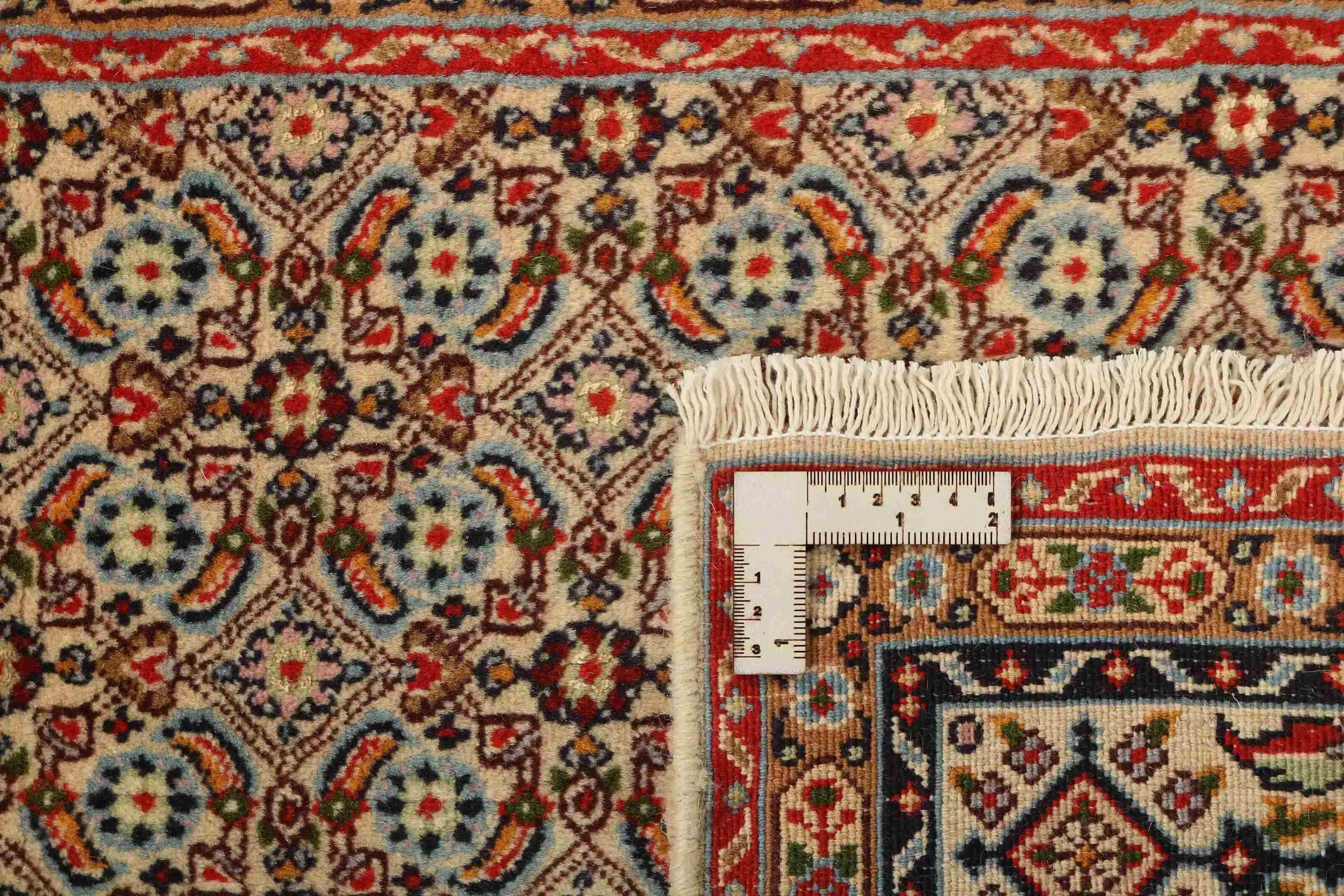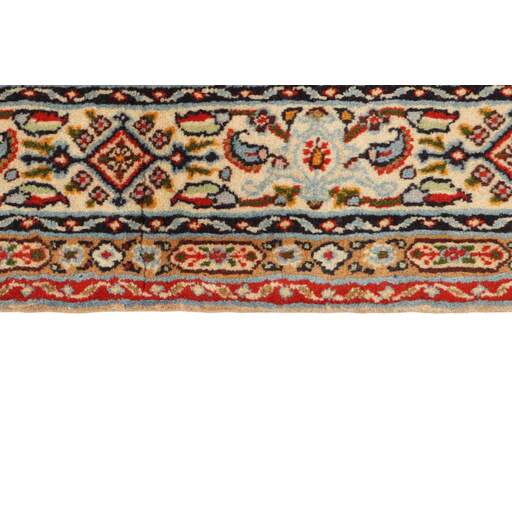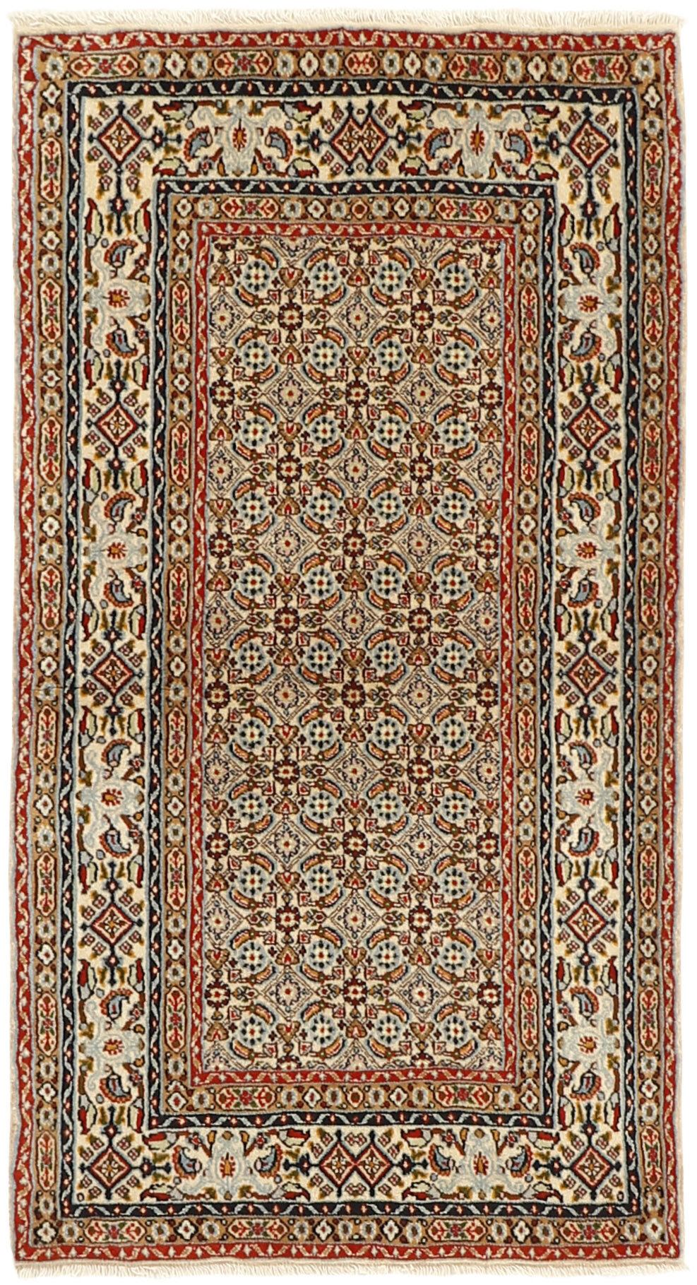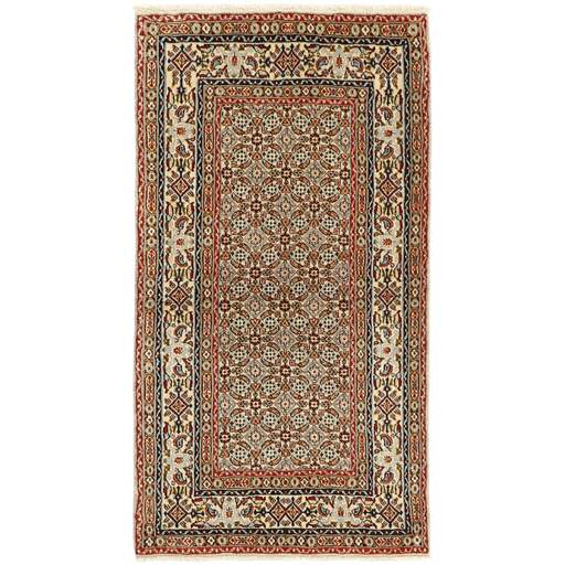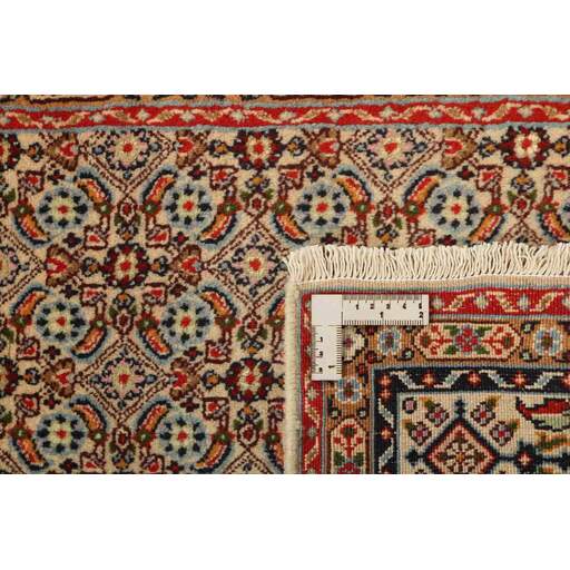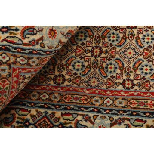 Moud est une petite ville au sud de Mashad, dans la province de Khorrasan. Les tapis de cette région se caractérisent par l'homogénéité de leurs motifs et de leur qualité. La chaîne et la trame sont en coton et le velours en laine. Les bordures sont une version de la bordure persane traditionnelle en tortue. Les tapis sont fabriqués dans toutes les tailles. Les tapis Moud sont souvent copiés en Inde, en raison de leur remarquable homogénéité. Les motifs caractéristiques de Moud sont parmi les plus uniformes, les plus réguliers et les plus facilement reconnaissables de la province de Khorrasan. Les Moud Mahi sont fabriqués dans des tons beige, rouge clair ou bleu, avec des motifs Mahi sur toute la surface ou avec un médaillon en forme d'étoile. Mahi signifie poisson et le motif Mahi est le motif le plus couramment utilisé dans les véritables tapis persans. En l'observant de près, vous pouvez voir un étang entouré de quatre poissons.