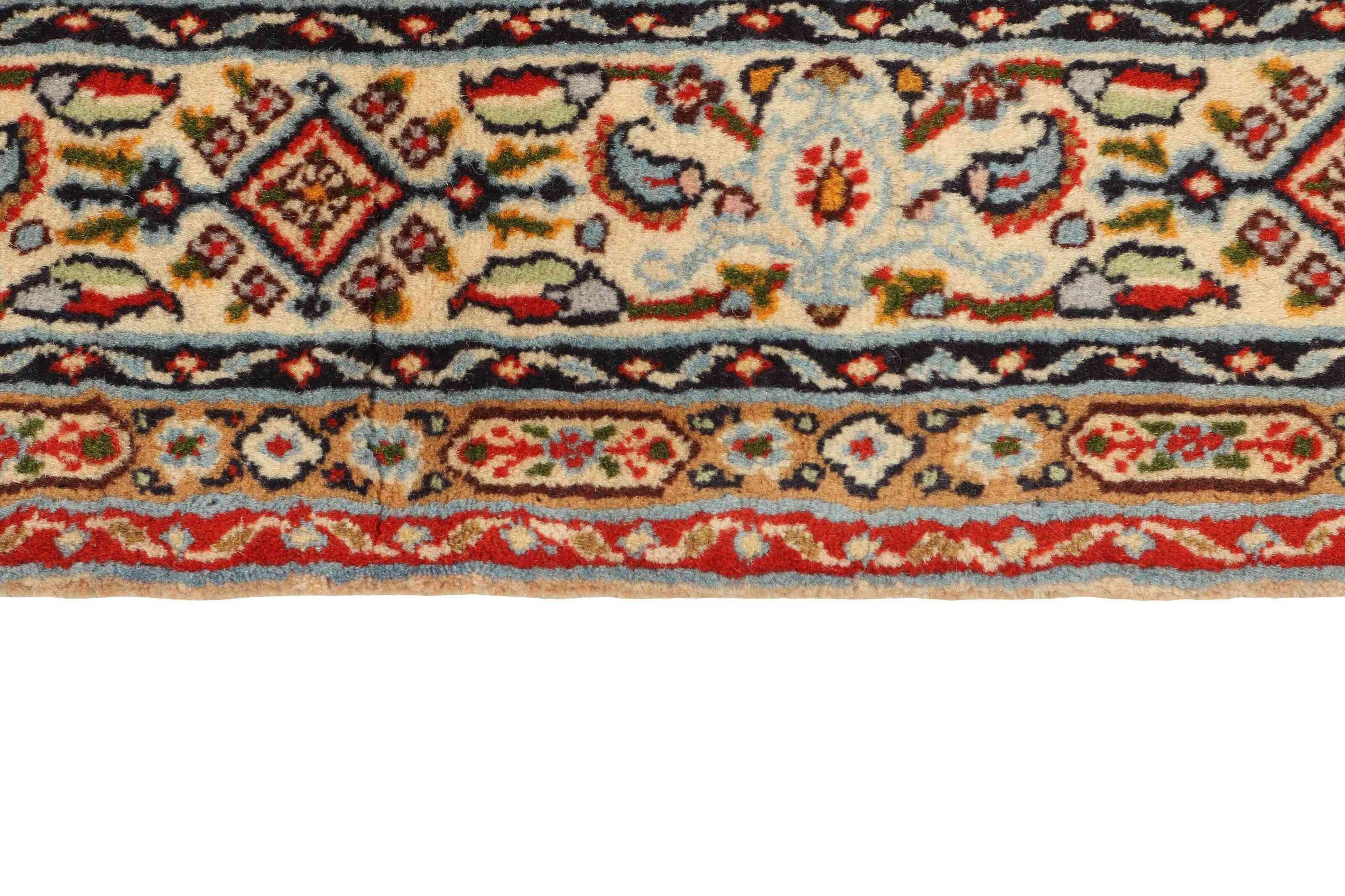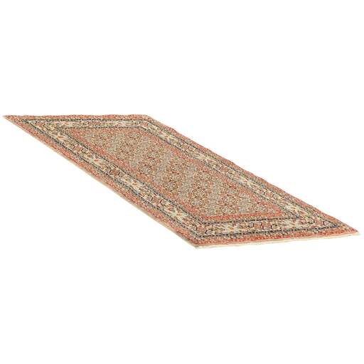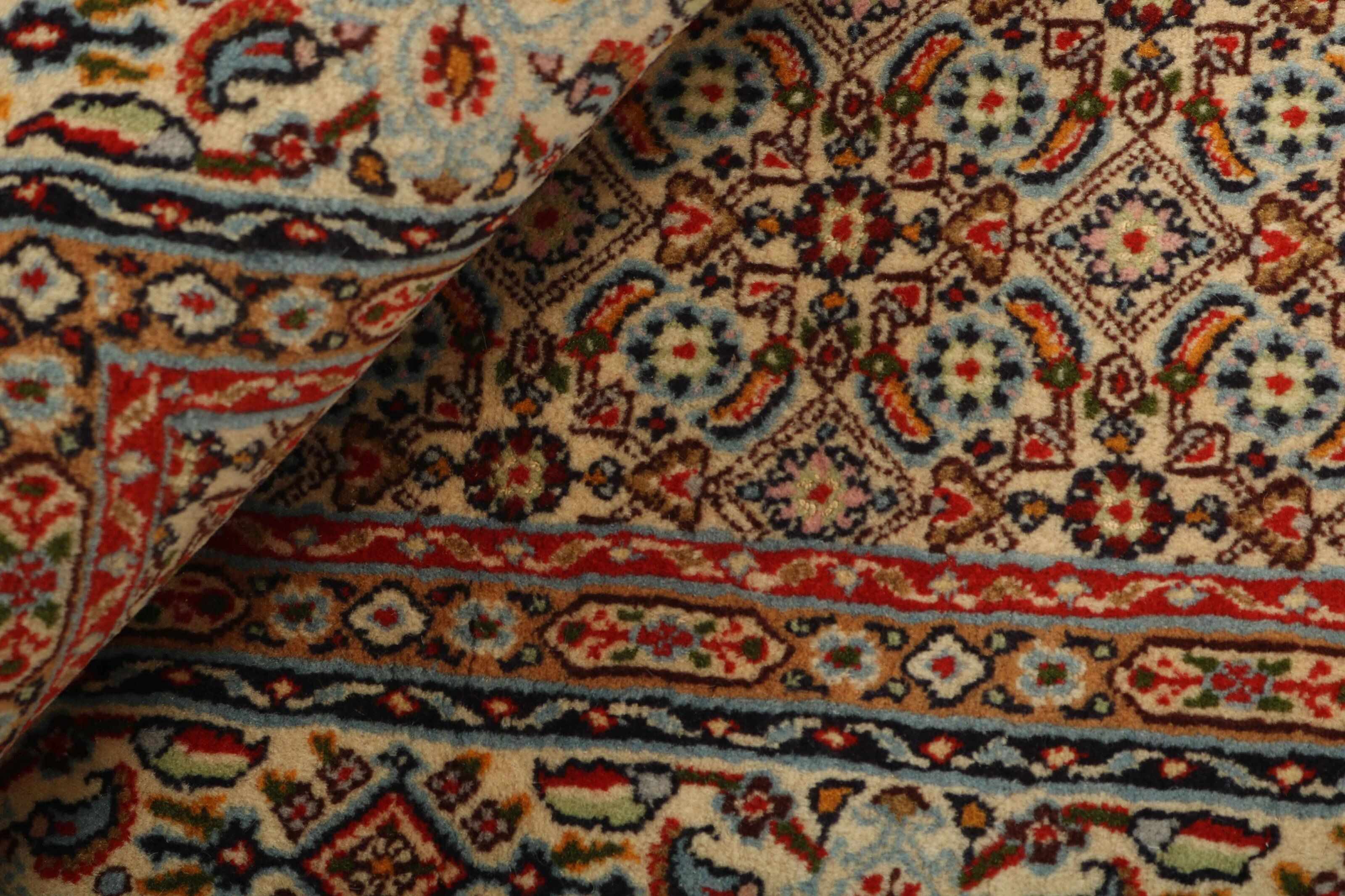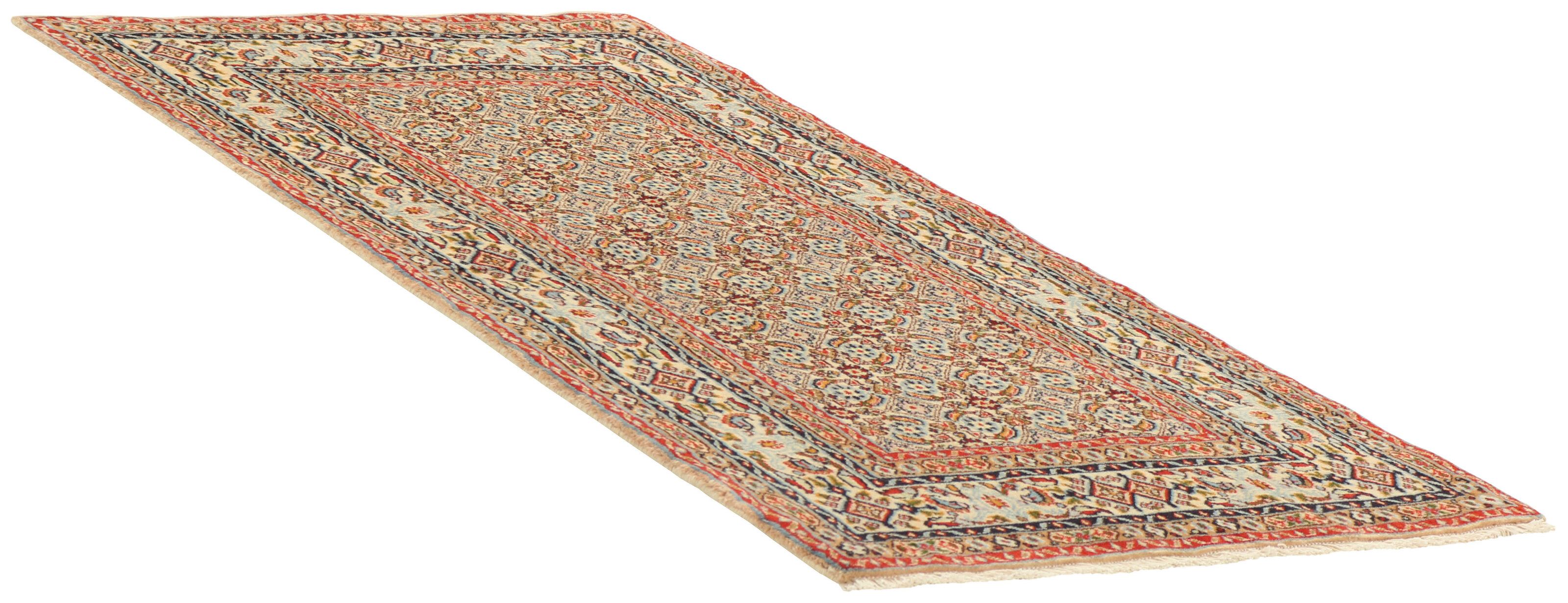 Moud est une petite ville au sud de Mashad, dans la province de Khorrasan. Les tapis de cette région se caractérisent par l'homogénéité de leurs motifs et de leur qualité. La chaîne et la trame sont en coton et le velours en laine. Les bordures sont une version de la bordure persane traditionnelle en tortue. Les tapis sont fabriqués dans toutes les tailles. Les tapis Moud sont souvent copiés en Inde, en raison de leur remarquable homogénéité. Les motifs caractéristiques de Moud sont parmi les plus uniformes, les plus réguliers et les plus facilement reconnaissables de la province de Khorrasan. Les Moud Mahi sont fabriqués dans des tons beige, rouge clair ou bleu, avec des motifs Mahi sur toute la surface ou avec un médaillon en forme d'étoile. Mahi signifie poisson et le motif Mahi est le motif le plus couramment utilisé dans les véritables tapis persans. En l'observant de près, vous pouvez voir un étang entouré de quatre poissons.