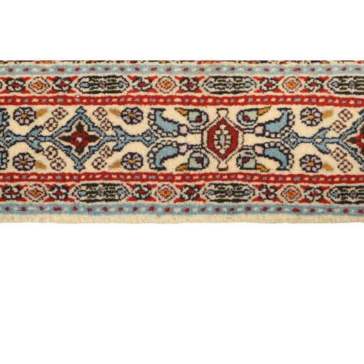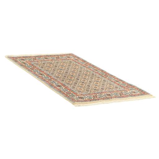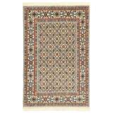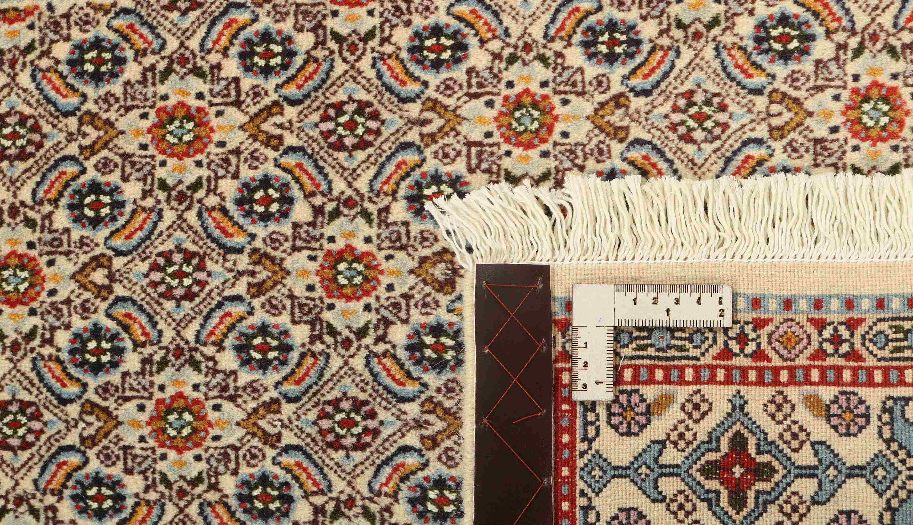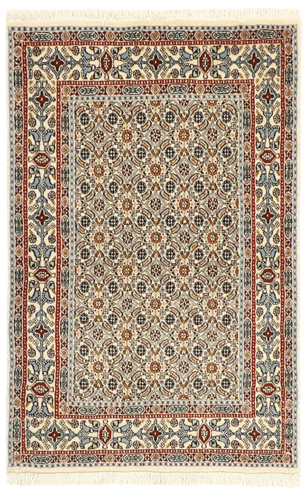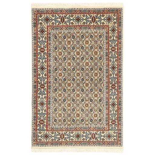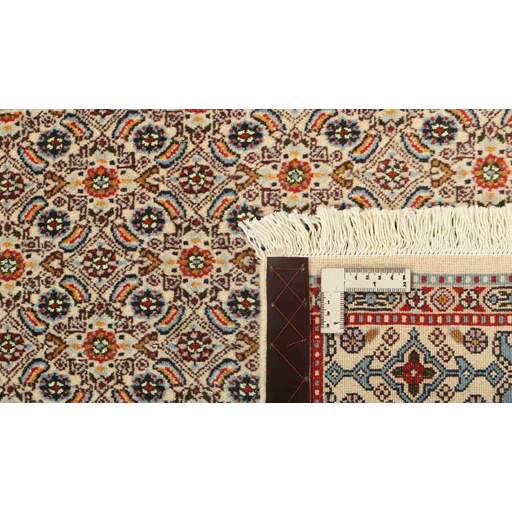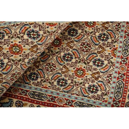 Moud est une petite ville au sud de Mashad, dans la province de Khorrasan. Les tapis de cette région se caractérisent par l'homogénéité de leurs motifs et de leur qualité. La chaîne et la trame sont en coton et le velours en laine. Les bordures sont une version de la bordure persane traditionnelle en tortue. Les tapis sont fabriqués dans toutes les tailles. Les tapis Moud sont souvent copiés en Inde, en raison de leur remarquable homogénéité. Les motifs caractéristiques de Moud sont parmi les plus uniformes, les plus réguliers et les plus facilement reconnaissables de la province de Khorrasan. Les Moud Mahi sont fabriqués dans des tons beige, rouge clair ou bleu, avec des motifs Mahi sur toute la surface ou avec un médaillon en forme d'étoile. Mahi signifie poisson et le motif Mahi est le motif le plus couramment utilisé dans les véritables tapis persans. En l'observant de près, vous pouvez voir un étang entouré de quatre poissons.