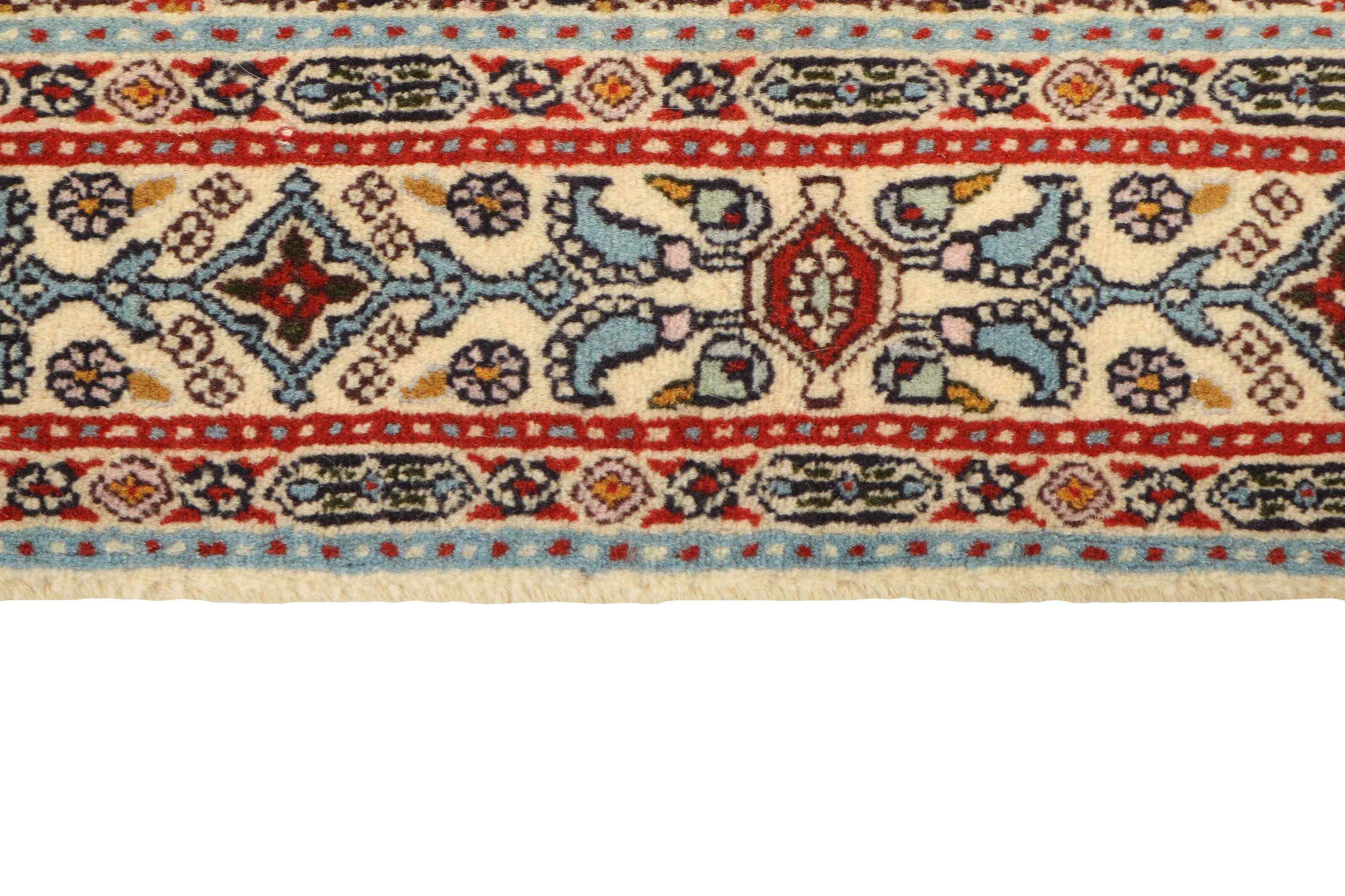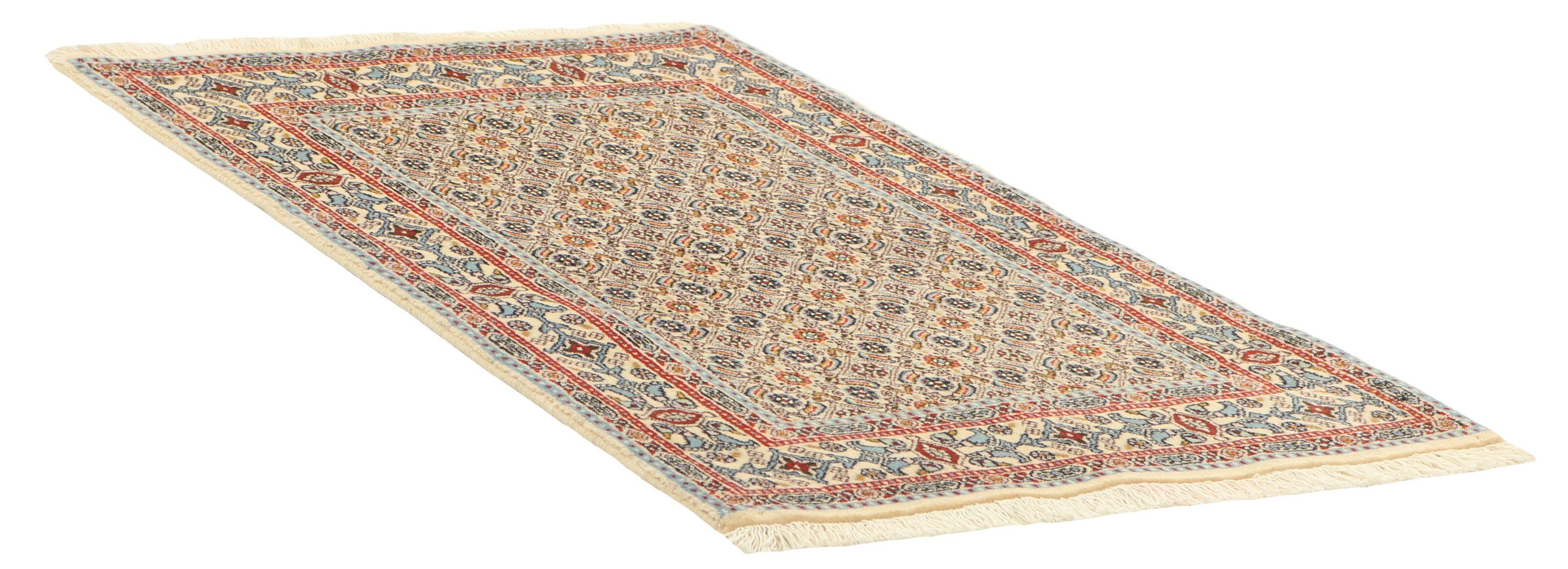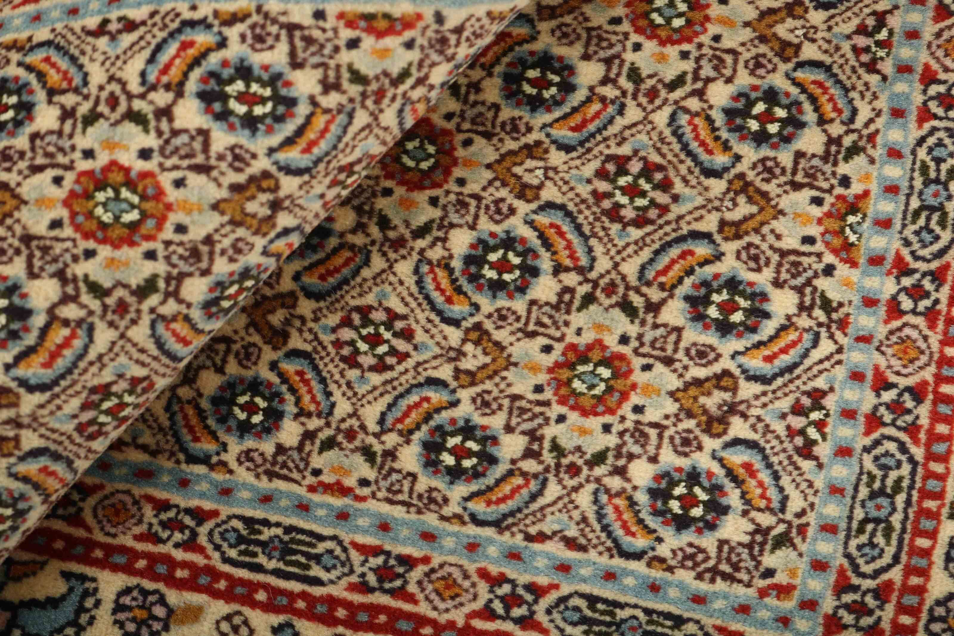 Moud est une petite ville au sud de Mashad, dans la province de Khorrasan. Les tapis de cette région se caractérisent par l'homogénéité de leurs motifs et de leur qualité. La chaîne et la trame sont en coton et le velours en laine. Les bordures sont une version de la bordure persane traditionnelle en tortue. Les tapis sont fabriqués dans toutes les tailles. Les tapis Moud sont souvent copiés en Inde, en raison de leur remarquable homogénéité. Les motifs caractéristiques de Moud sont parmi les plus uniformes, les plus réguliers et les plus facilement reconnaissables de la province de Khorrasan. Les Moud Mahi sont fabriqués dans des tons beige, rouge clair ou bleu, avec des motifs Mahi sur toute la surface ou avec un médaillon en forme d'étoile. Mahi signifie poisson et le motif Mahi est le motif le plus couramment utilisé dans les véritables tapis persans. En l'observant de près, vous pouvez voir un étang entouré de quatre poissons.