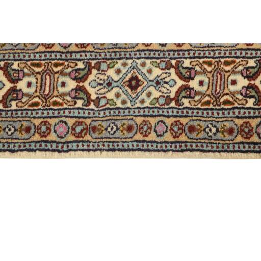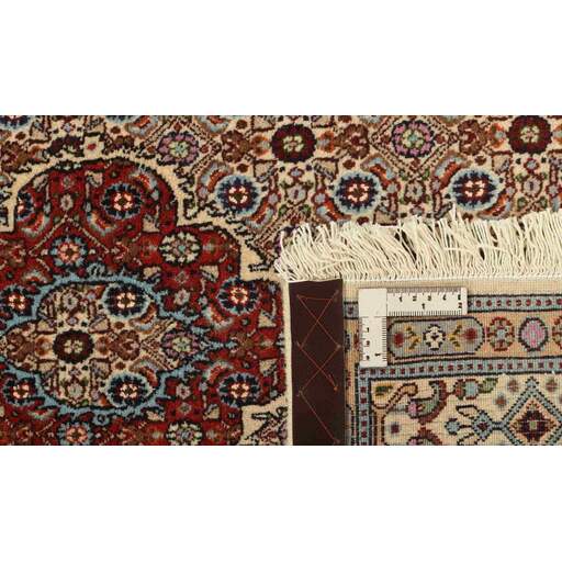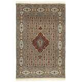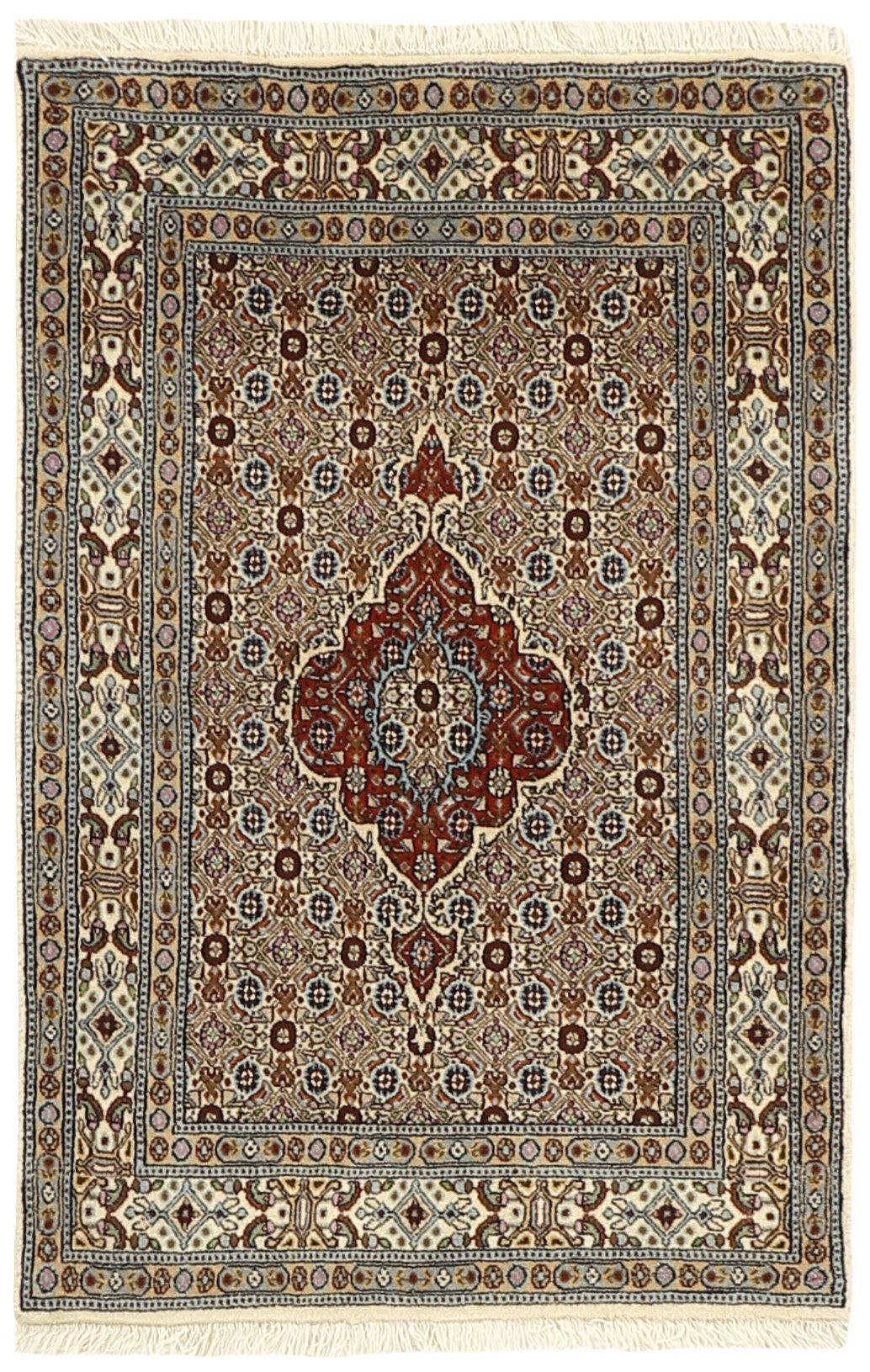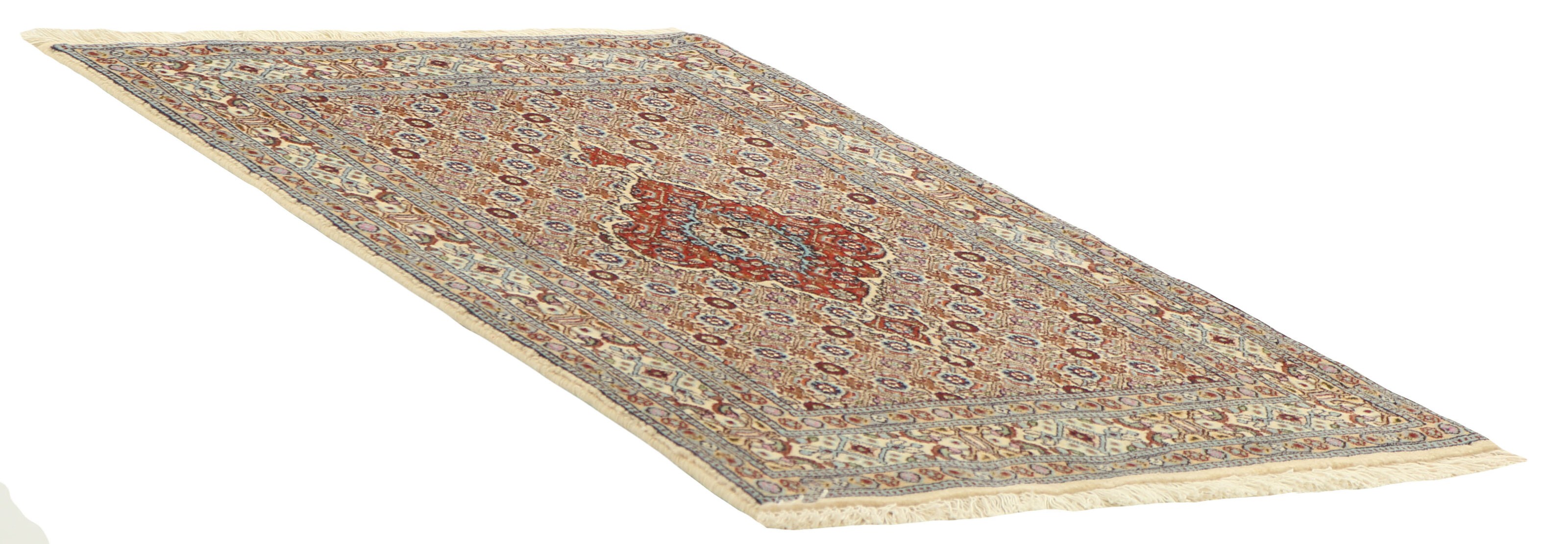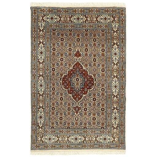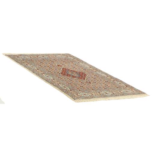 Moud est une petite ville au sud de Mashad, dans la province de Khorrasan. Les tapis de cette région se caractérisent par l'homogénéité de leurs motifs et de leur qualité. La chaîne et la trame sont en coton et le velours en laine. Les bordures sont une version de la bordure persane traditionnelle en tortue. Les tapis sont fabriqués dans toutes les tailles. Les tapis Moud sont souvent copiés en Inde, en raison de leur remarquable homogénéité. Les motifs caractéristiques de Moud sont parmi les plus uniformes, les plus réguliers et les plus facilement reconnaissables de la province de Khorrasan. Les Moud Mahi sont fabriqués dans des tons beige, rouge clair ou bleu, avec des motifs Mahi sur toute la surface ou avec un médaillon en forme d'étoile. Mahi signifie poisson et le motif Mahi est le motif le plus couramment utilisé dans les véritables tapis persans. En l'observant de près, vous pouvez voir un étang entouré de quatre poissons.