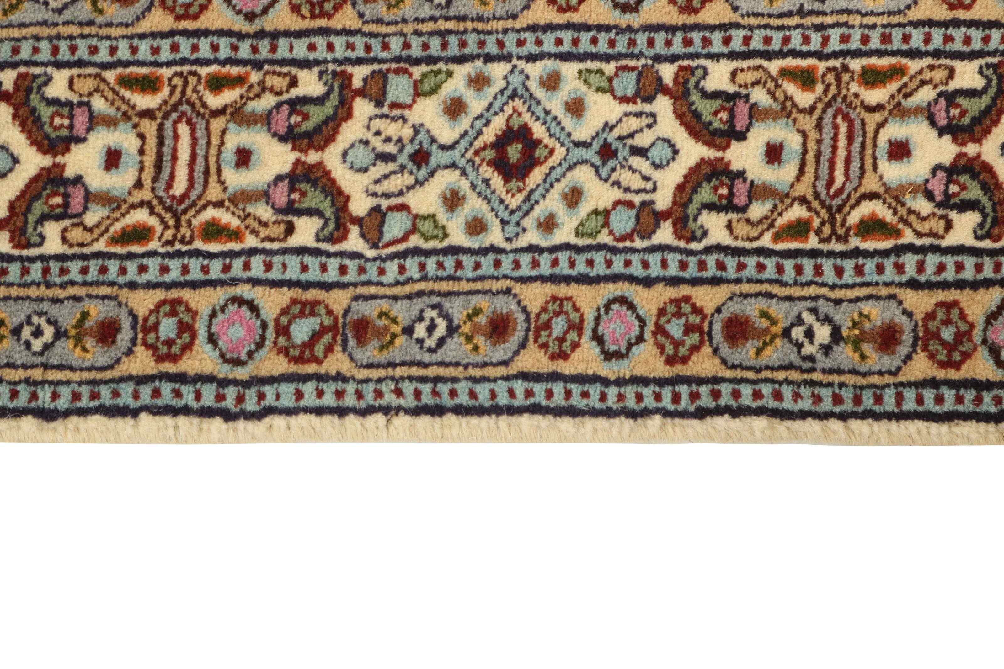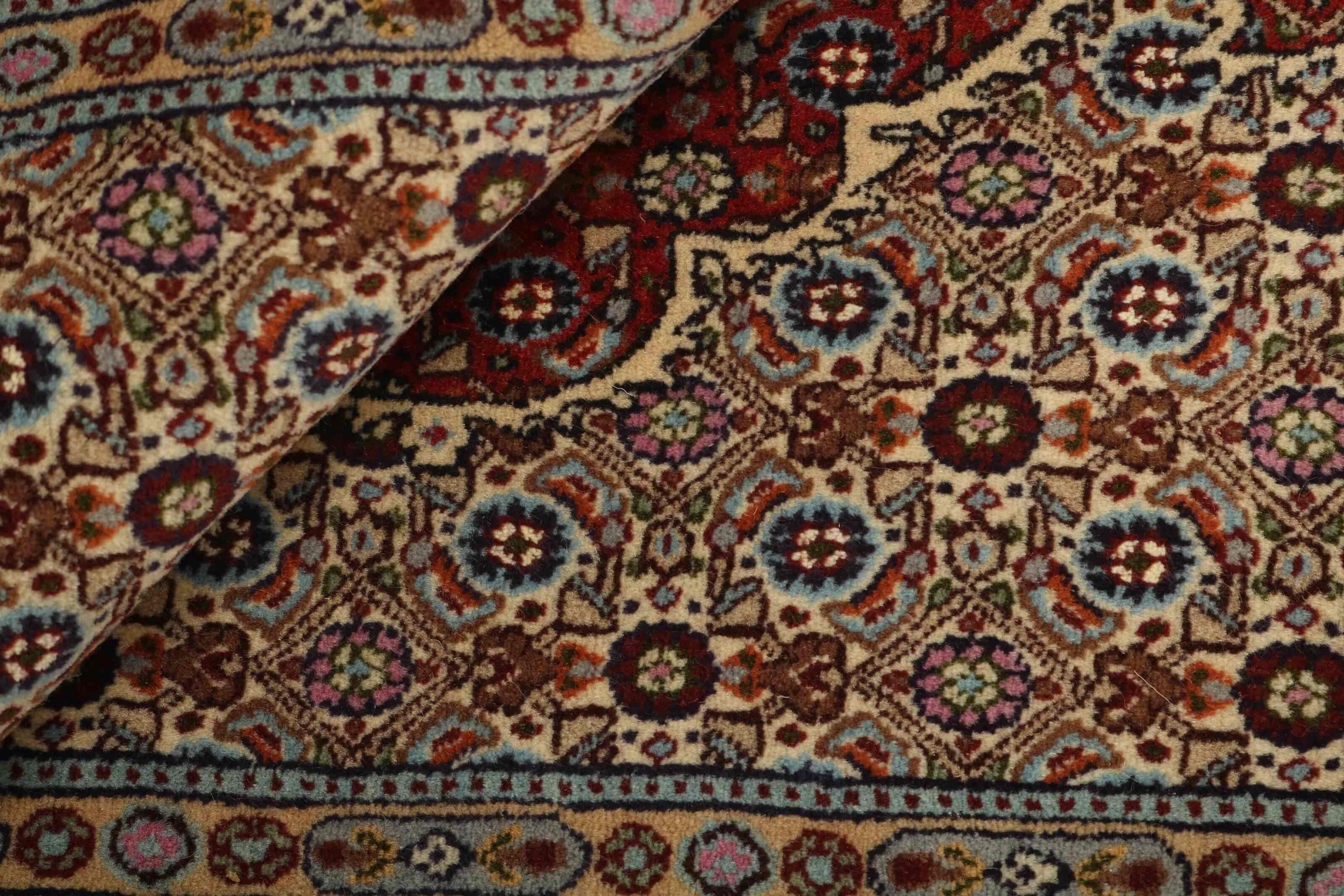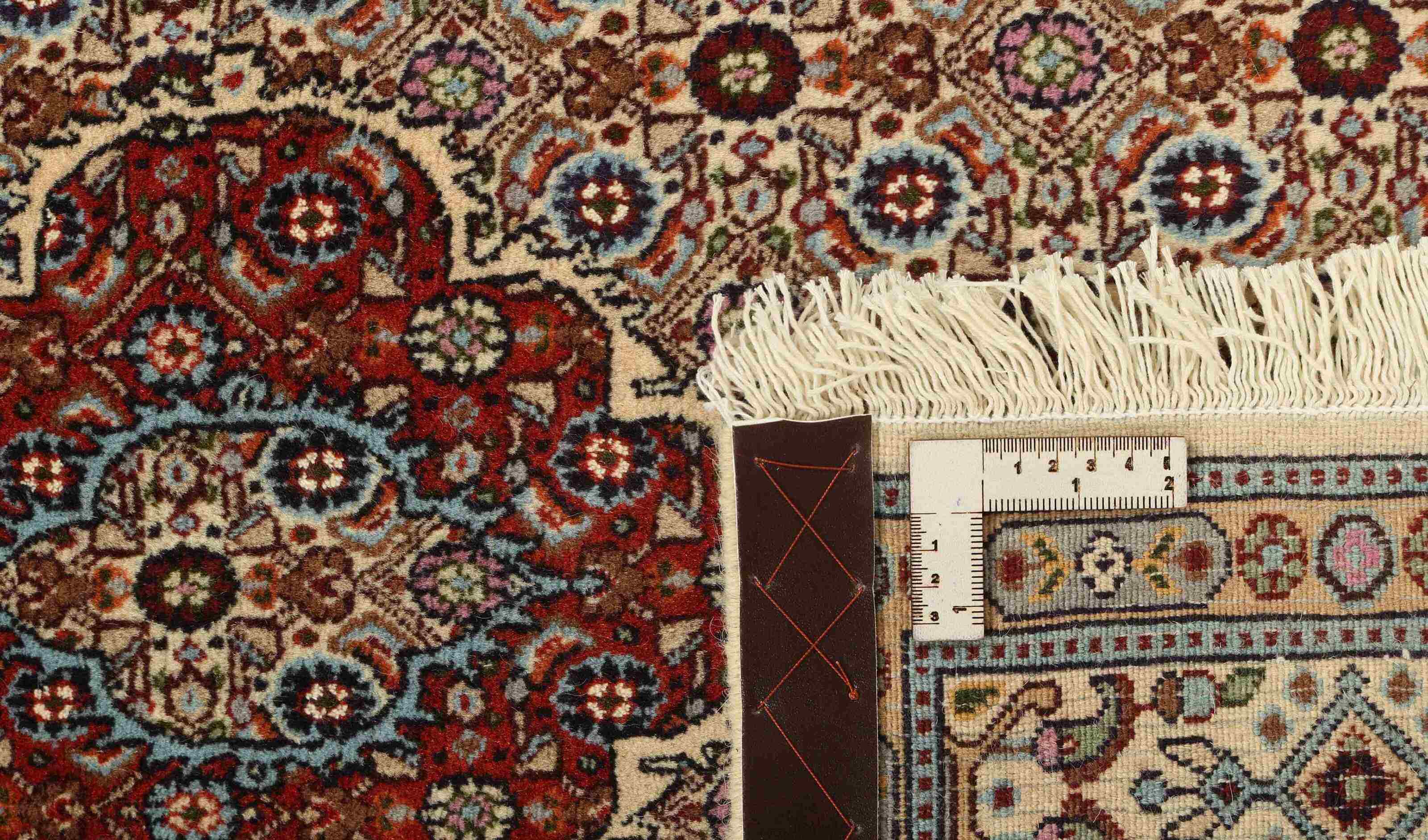 Moud est une petite ville au sud de Mashad, dans la province de Khorrasan. Les tapis de cette région se caractérisent par l'homogénéité de leurs motifs et de leur qualité. La chaîne et la trame sont en coton et le velours en laine. Les bordures sont une version de la bordure persane traditionnelle en tortue. Les tapis sont fabriqués dans toutes les tailles. Les tapis Moud sont souvent copiés en Inde, en raison de leur remarquable homogénéité. Les motifs caractéristiques de Moud sont parmi les plus uniformes, les plus réguliers et les plus facilement reconnaissables de la province de Khorrasan. Les Moud Mahi sont fabriqués dans des tons beige, rouge clair ou bleu, avec des motifs Mahi sur toute la surface ou avec un médaillon en forme d'étoile. Mahi signifie poisson et le motif Mahi est le motif le plus couramment utilisé dans les véritables tapis persans. En l'observant de près, vous pouvez voir un étang entouré de quatre poissons.