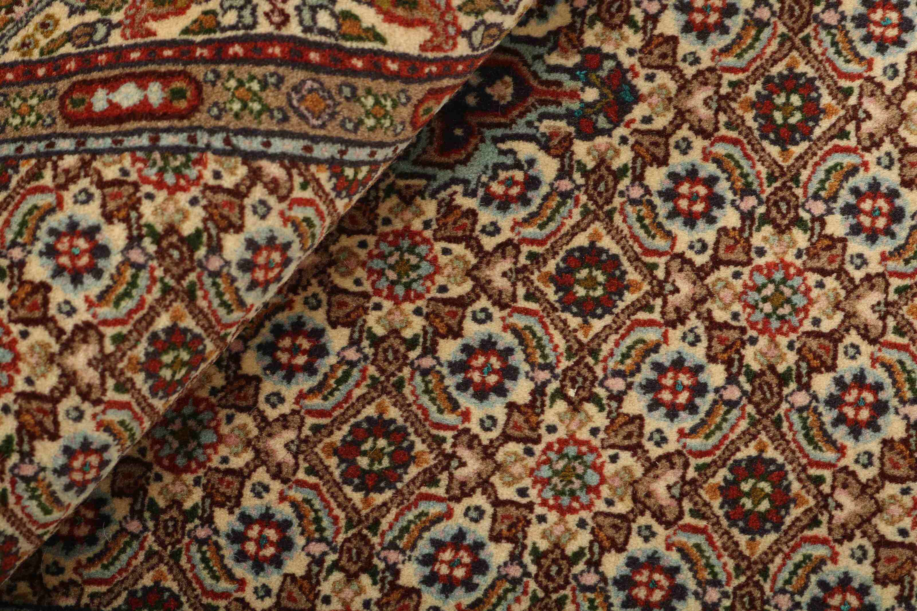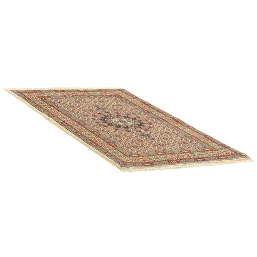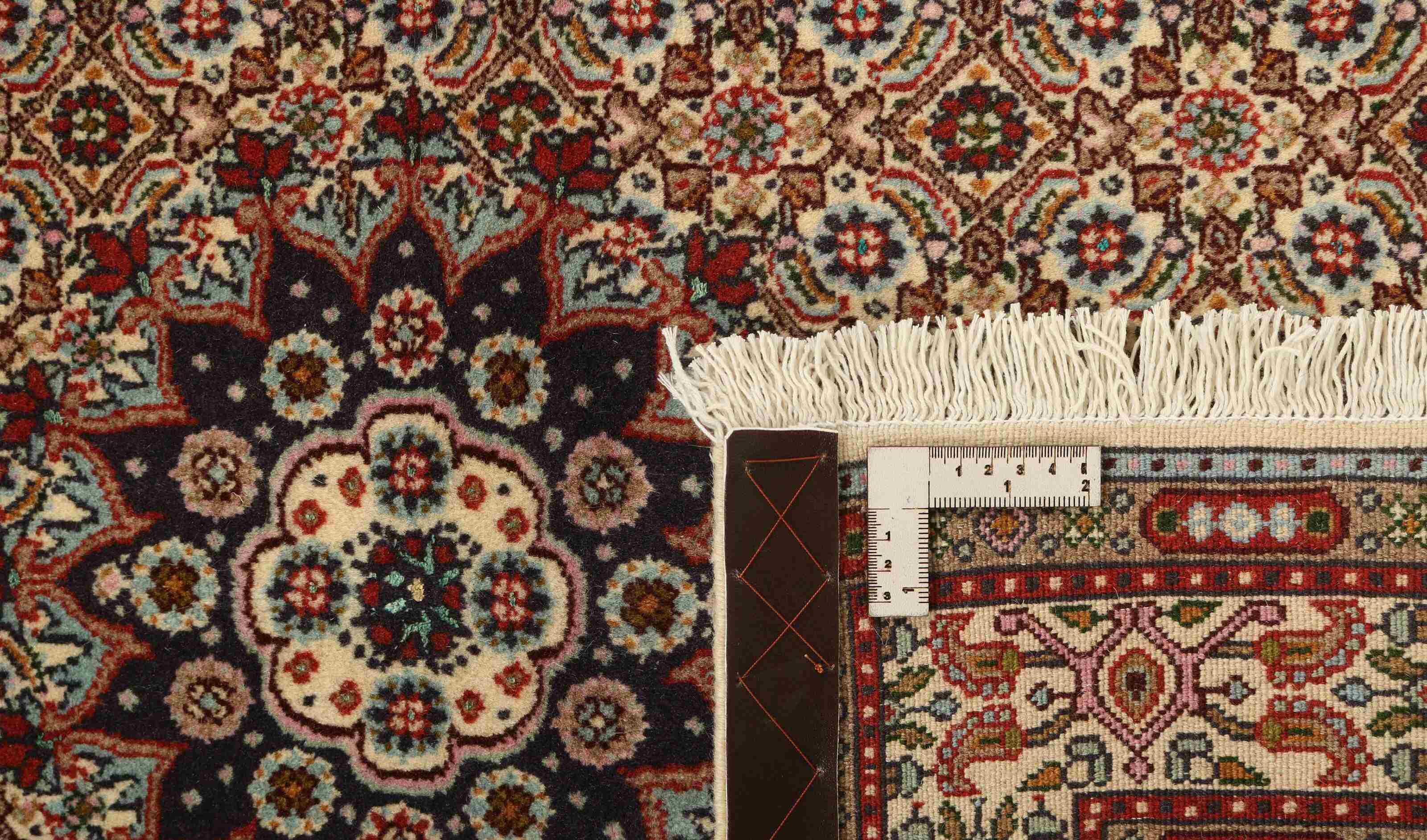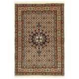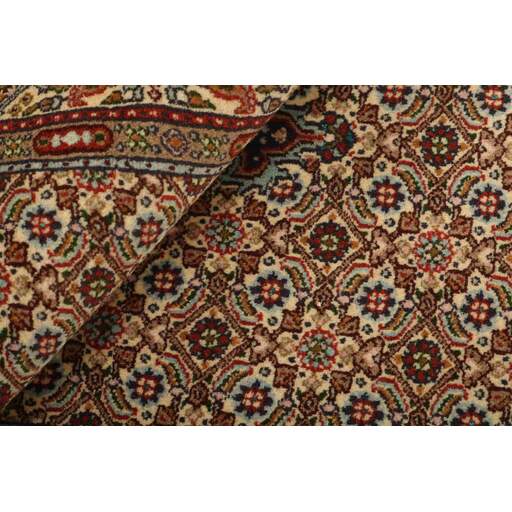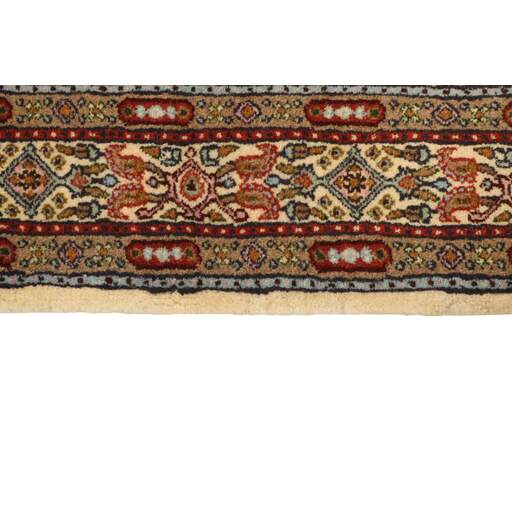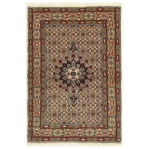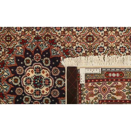 Moud est une petite ville au sud de Mashad, dans la province de Khorrasan. Les tapis de cette région se caractérisent par l'homogénéité de leurs motifs et de leur qualité. La chaîne et la trame sont en coton et le velours en laine. Les bordures sont une version de la bordure persane traditionnelle en tortue. Les tapis sont fabriqués dans toutes les tailles. Les tapis Moud sont souvent copiés en Inde, en raison de leur remarquable homogénéité. Les motifs caractéristiques de Moud sont parmi les plus uniformes, les plus réguliers et les plus facilement reconnaissables de la province de Khorrasan. Les Moud Mahi sont fabriqués dans des tons beige, rouge clair ou bleu, avec des motifs Mahi sur toute la surface ou avec un médaillon en forme d'étoile. Mahi signifie poisson et le motif Mahi est le motif le plus couramment utilisé dans les véritables tapis persans. En l'observant de près, vous pouvez voir un étang entouré de quatre poissons.