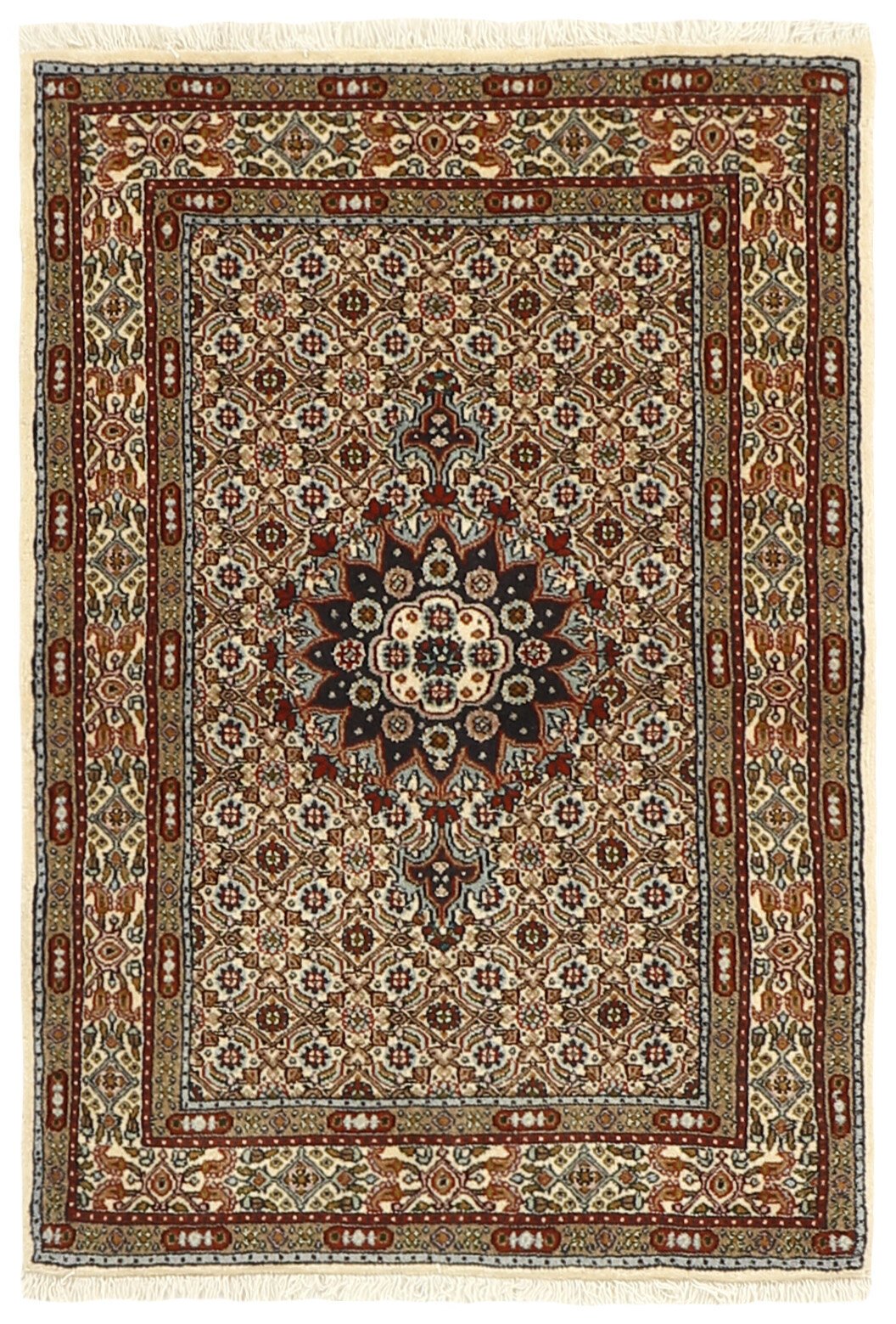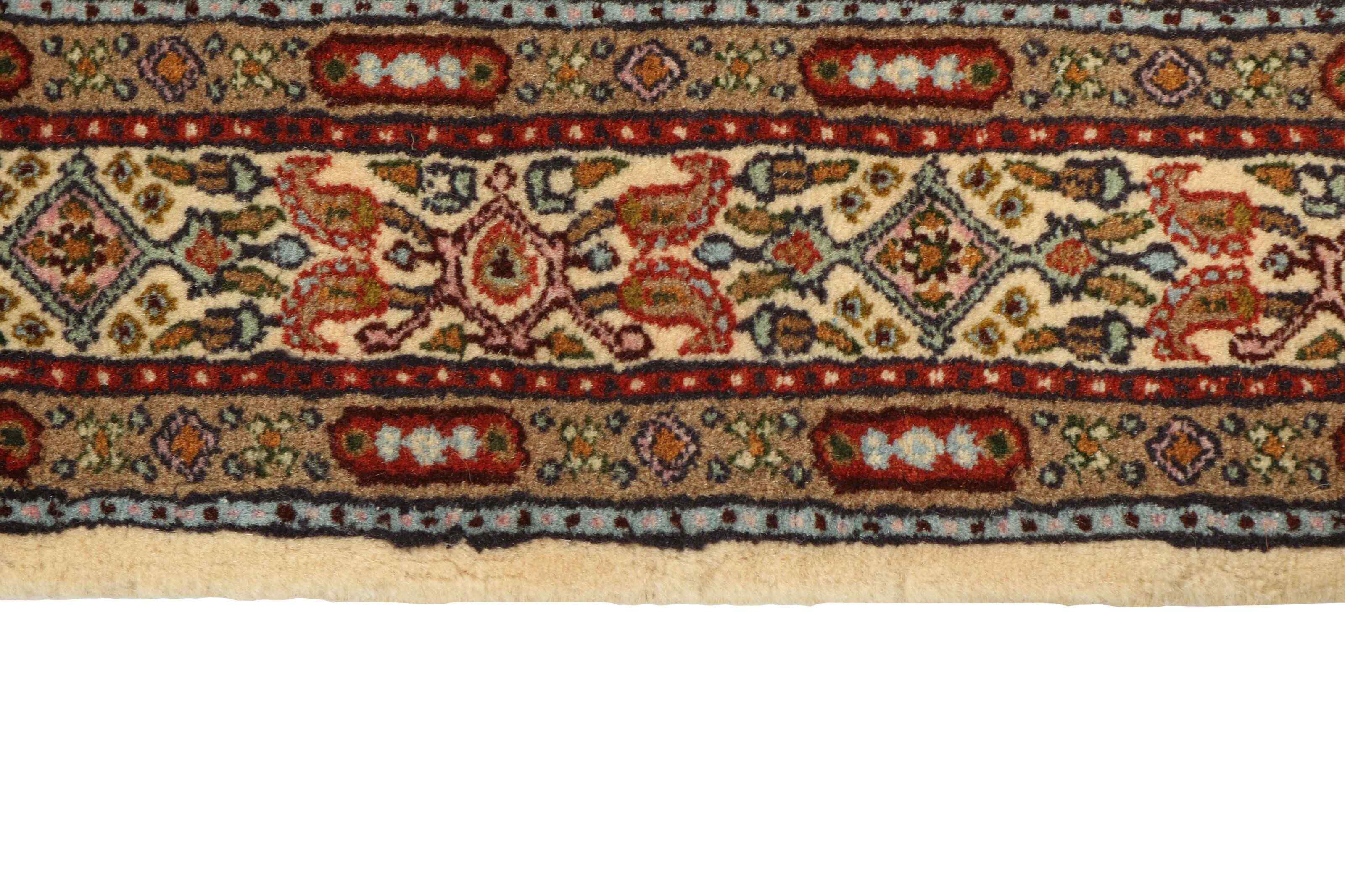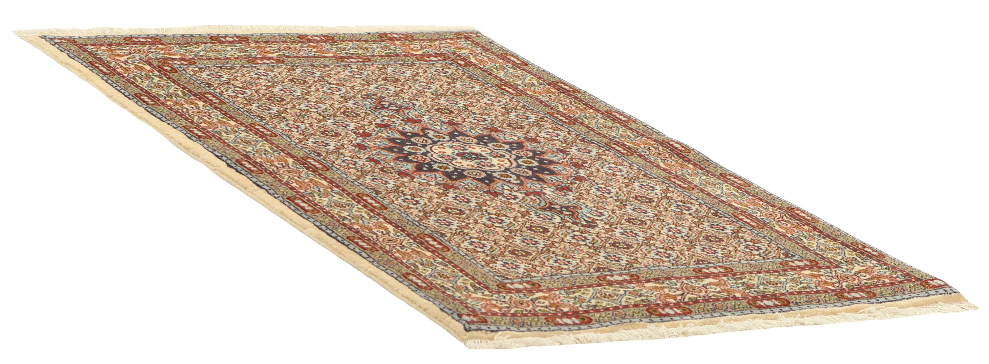 Moud est une petite ville au sud de Mashad, dans la province de Khorrasan. Les tapis de cette région se caractérisent par l'homogénéité de leurs motifs et de leur qualité. La chaîne et la trame sont en coton et le velours en laine. Les bordures sont une version de la bordure persane traditionnelle en tortue. Les tapis sont fabriqués dans toutes les tailles. Les tapis Moud sont souvent copiés en Inde, en raison de leur remarquable homogénéité. Les motifs caractéristiques de Moud sont parmi les plus uniformes, les plus réguliers et les plus facilement reconnaissables de la province de Khorrasan. Les Moud Mahi sont fabriqués dans des tons beige, rouge clair ou bleu, avec des motifs Mahi sur toute la surface ou avec un médaillon en forme d'étoile. Mahi signifie poisson et le motif Mahi est le motif le plus couramment utilisé dans les véritables tapis persans. En l'observant de près, vous pouvez voir un étang entouré de quatre poissons.