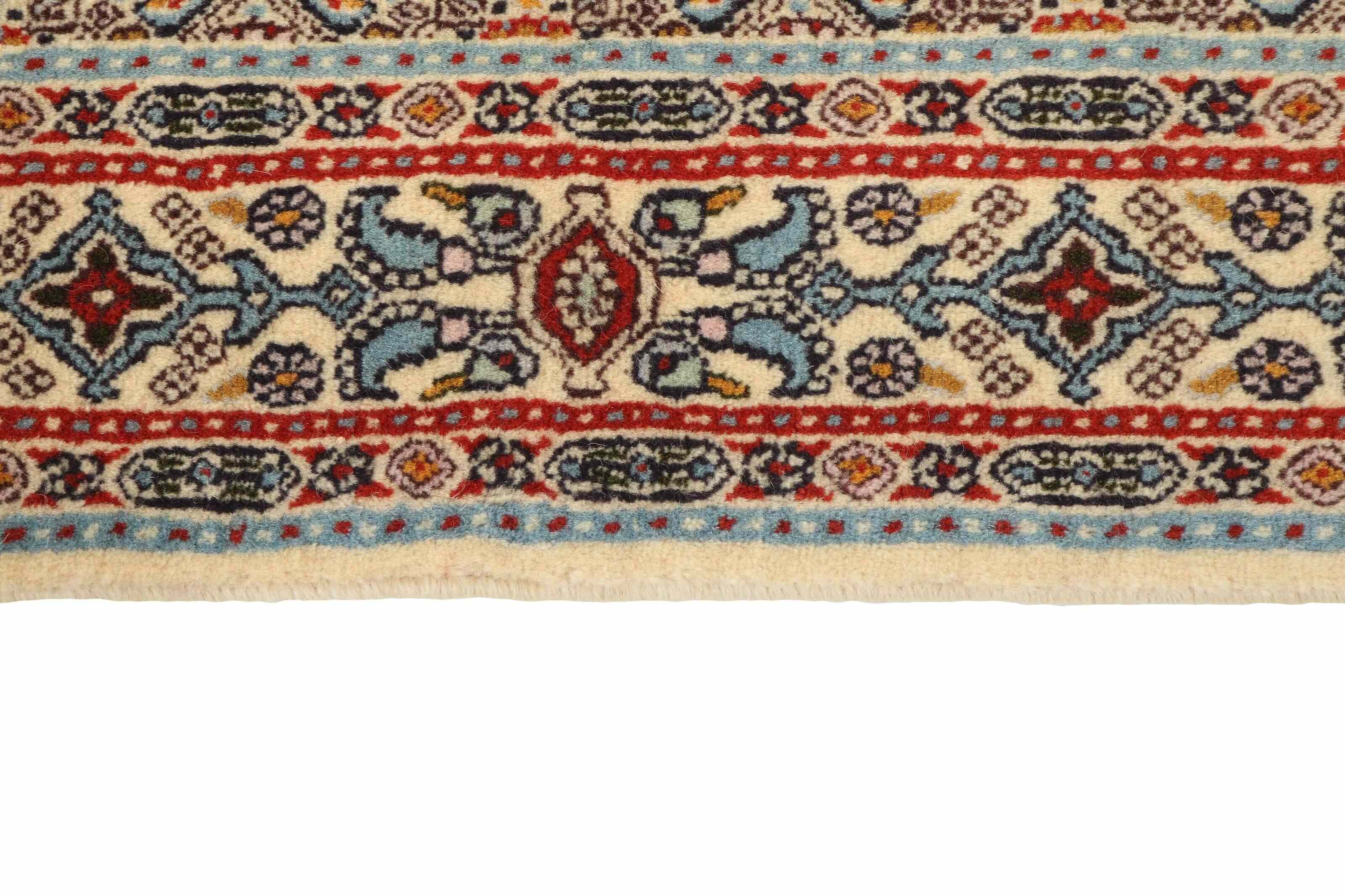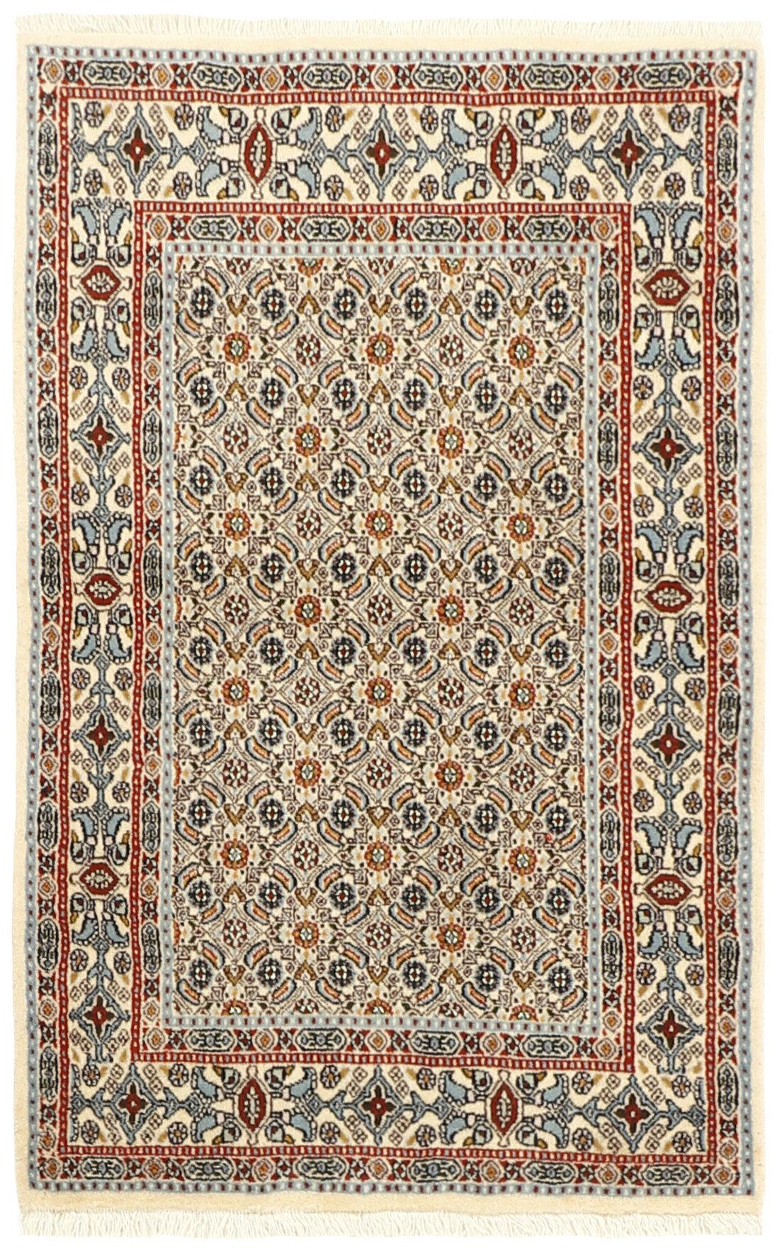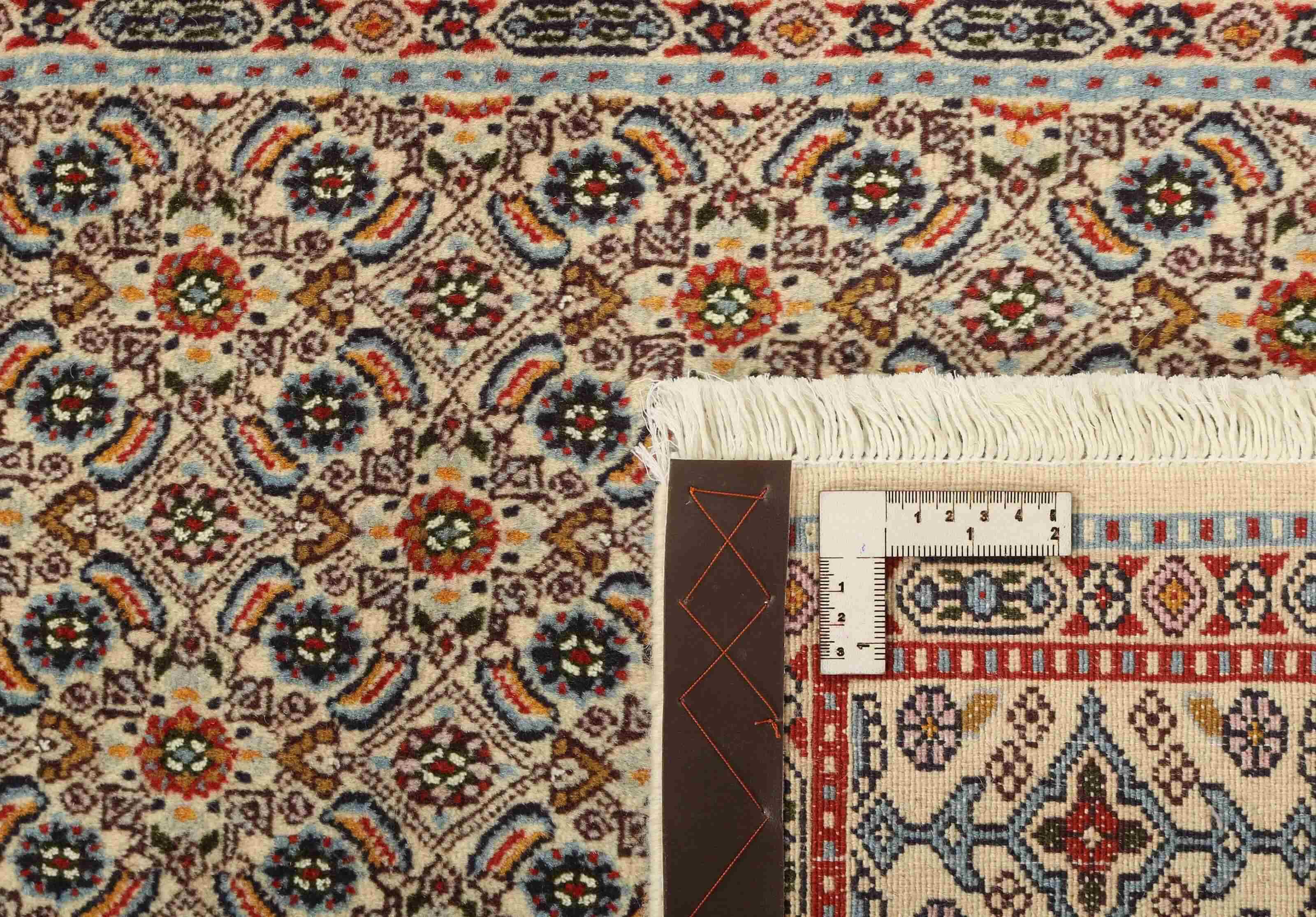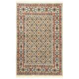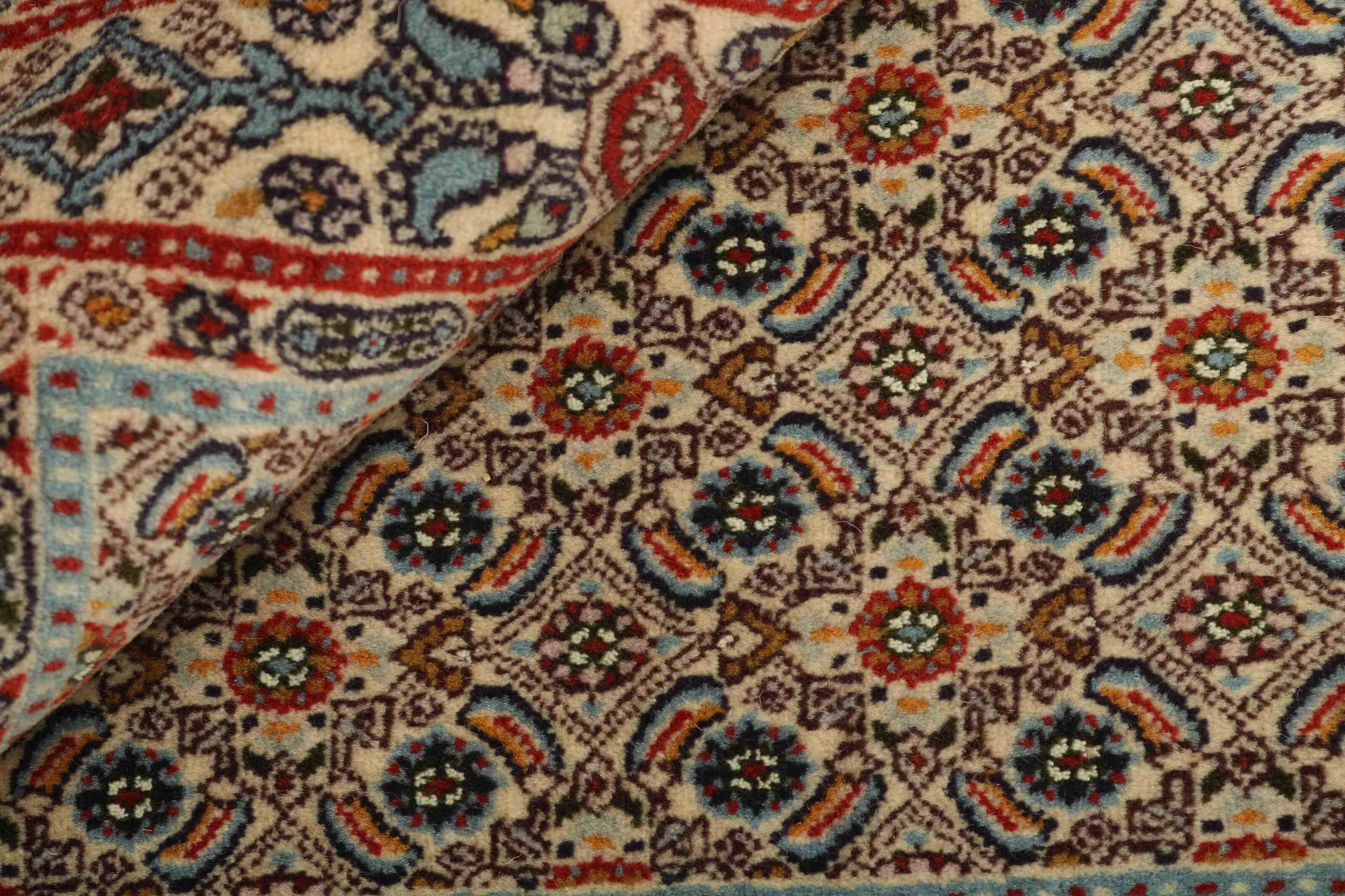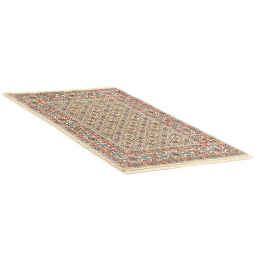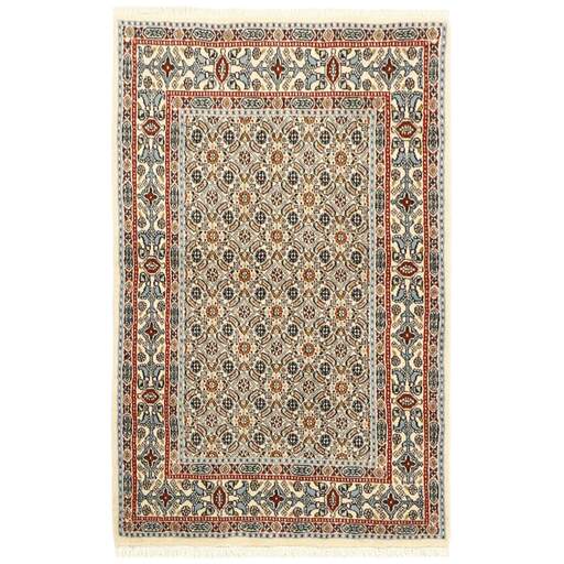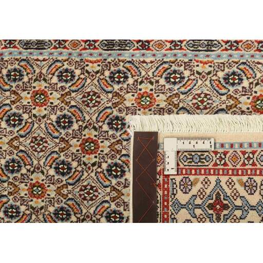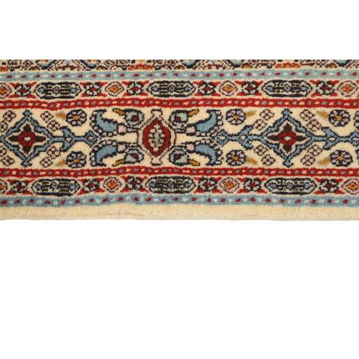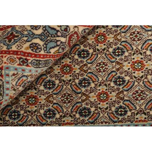 Moud est une petite ville au sud de Mashad, dans la province de Khorrasan. Les tapis de cette région se caractérisent par l'homogénéité de leurs motifs et de leur qualité. La chaîne et la trame sont en coton et le velours en laine. Les bordures sont une version de la bordure persane traditionnelle en tortue. Les tapis sont fabriqués dans toutes les tailles. Les tapis Moud sont souvent copiés en Inde, en raison de leur remarquable homogénéité. Les motifs caractéristiques de Moud sont parmi les plus uniformes, les plus réguliers et les plus facilement reconnaissables de la province de Khorrasan. Les Moud Mahi sont fabriqués dans des tons beige, rouge clair ou bleu, avec des motifs Mahi sur toute la surface ou avec un médaillon en forme d'étoile. Mahi signifie poisson et le motif Mahi est le motif le plus couramment utilisé dans les véritables tapis persans. En l'observant de près, vous pouvez voir un étang entouré de quatre poissons.