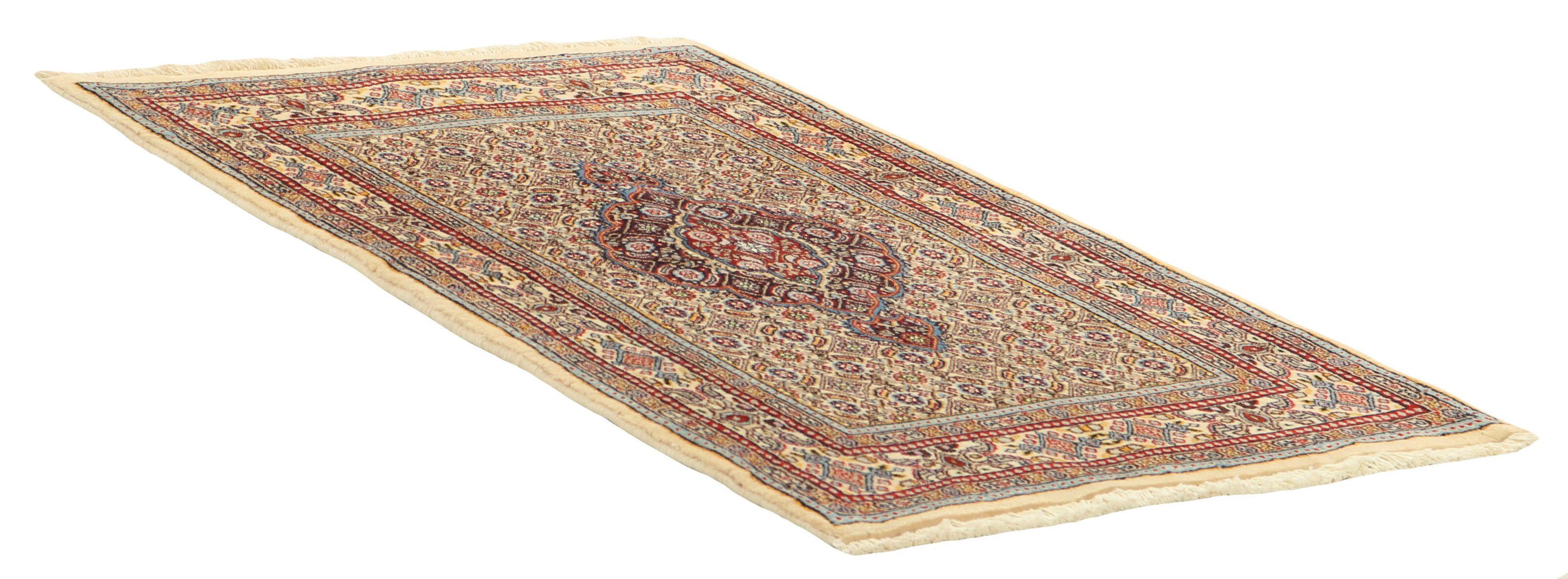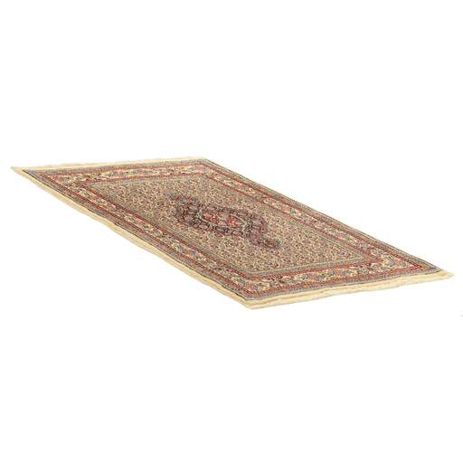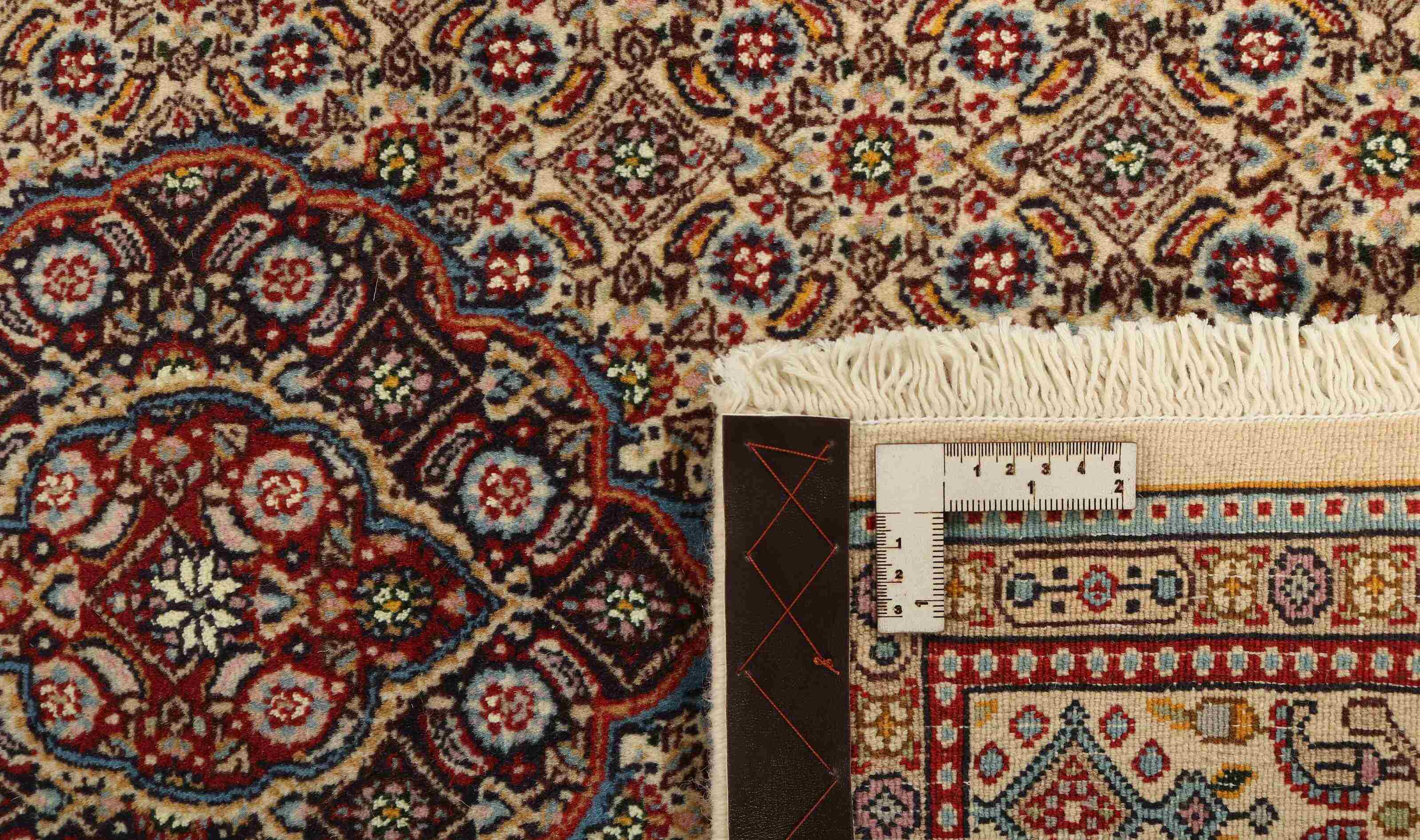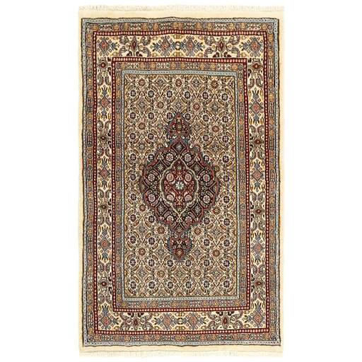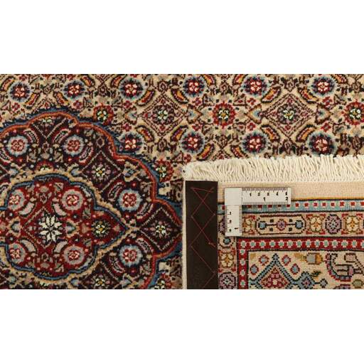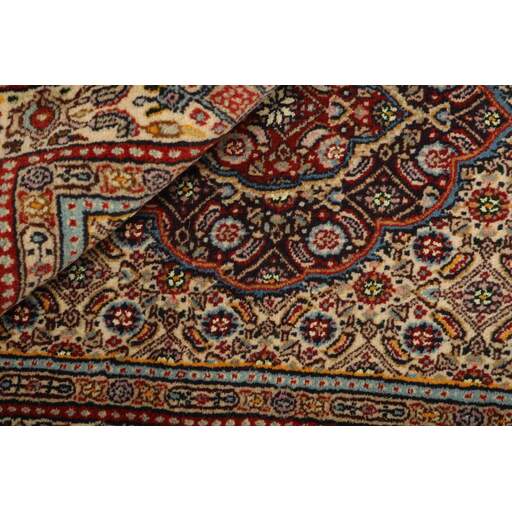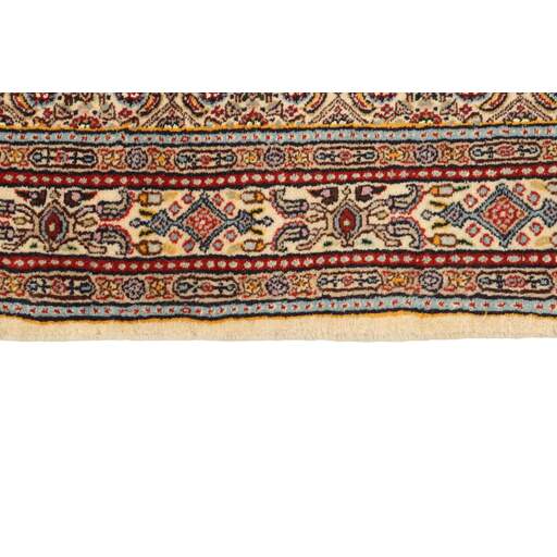 Moud est une petite ville au sud de Mashad, dans la province de Khorrasan. Les tapis de cette région se caractérisent par l'homogénéité de leurs motifs et de leur qualité. La chaîne et la trame sont en coton et le velours en laine. Les bordures sont une version de la bordure persane traditionnelle en tortue. Les tapis sont fabriqués dans toutes les tailles. Les tapis Moud sont souvent copiés en Inde, en raison de leur remarquable homogénéité. Les motifs caractéristiques de Moud sont parmi les plus uniformes, les plus réguliers et les plus facilement reconnaissables de la province de Khorrasan. Les Moud Mahi sont fabriqués dans des tons beige, rouge clair ou bleu, avec des motifs Mahi sur toute la surface ou avec un médaillon en forme d'étoile. Mahi signifie poisson et le motif Mahi est le motif le plus couramment utilisé dans les véritables tapis persans. En l'observant de près, vous pouvez voir un étang entouré de quatre poissons.
