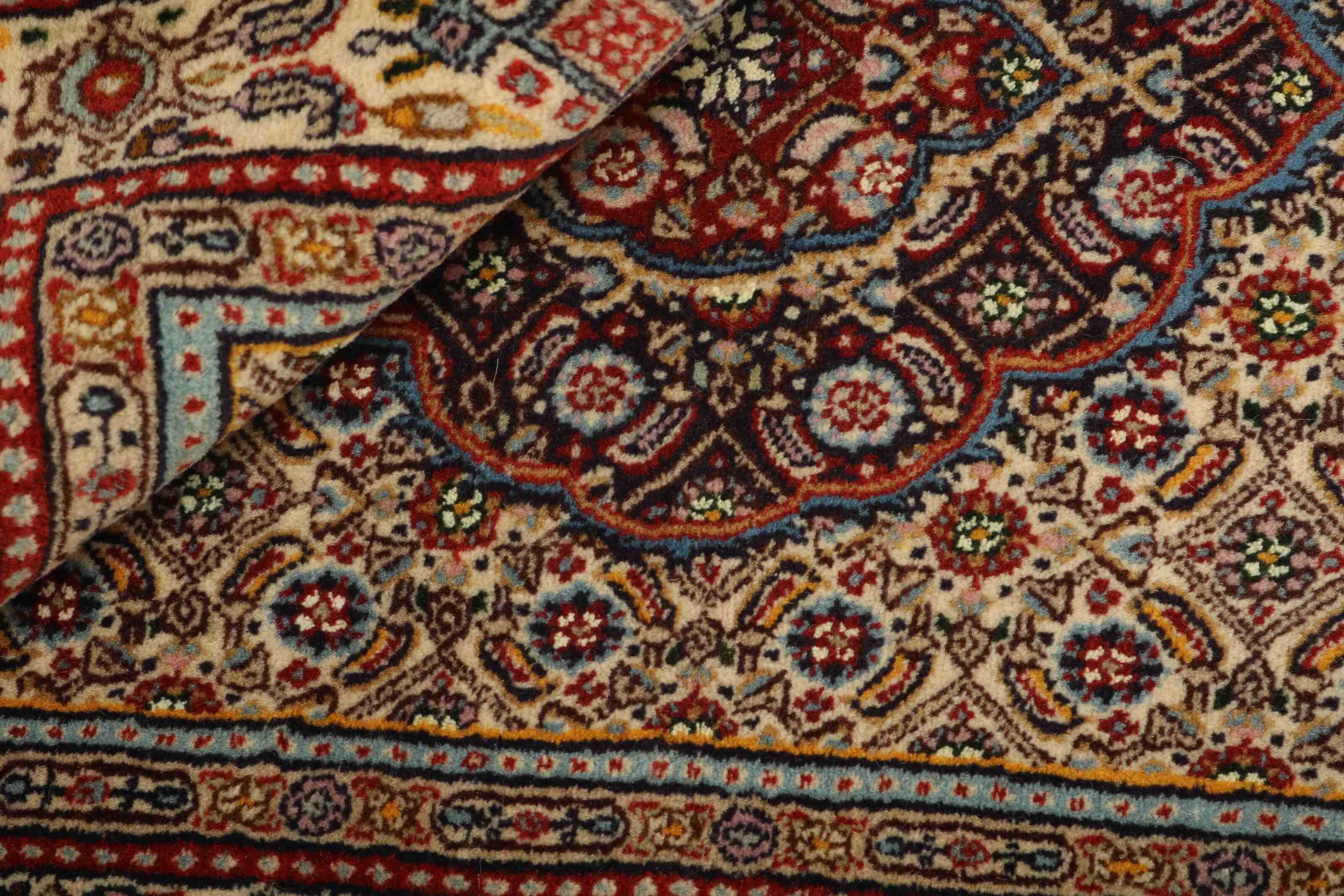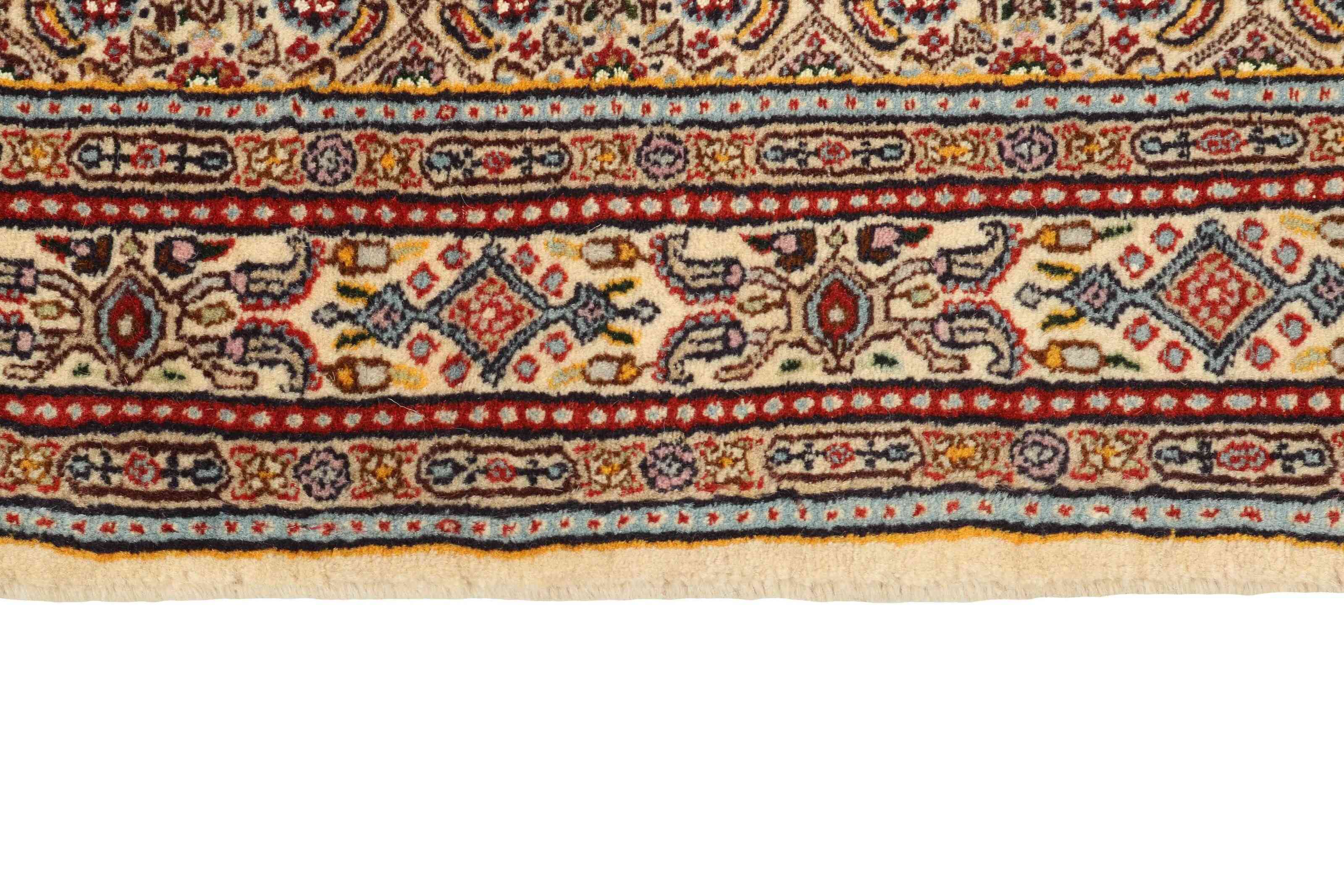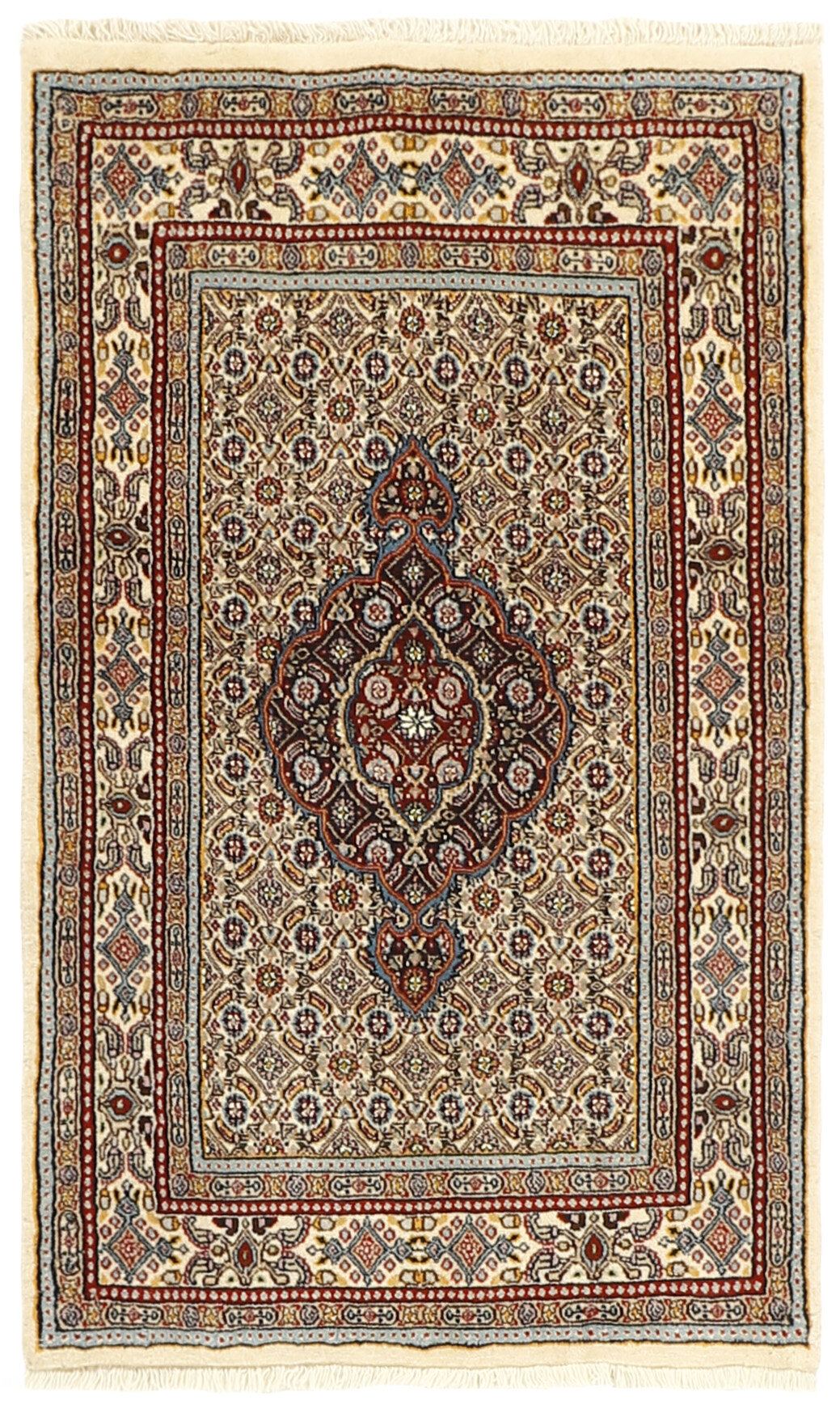 Moud est une petite ville au sud de Mashad, dans la province de Khorrasan. Les tapis de cette région se caractérisent par l'homogénéité de leurs motifs et de leur qualité. La chaîne et la trame sont en coton et le velours en laine. Les bordures sont une version de la bordure persane traditionnelle en tortue. Les tapis sont fabriqués dans toutes les tailles. Les tapis Moud sont souvent copiés en Inde, en raison de leur remarquable homogénéité. Les motifs caractéristiques de Moud sont parmi les plus uniformes, les plus réguliers et les plus facilement reconnaissables de la province de Khorrasan. Les Moud Mahi sont fabriqués dans des tons beige, rouge clair ou bleu, avec des motifs Mahi sur toute la surface ou avec un médaillon en forme d'étoile. Mahi signifie poisson et le motif Mahi est le motif le plus couramment utilisé dans les véritables tapis persans. En l'observant de près, vous pouvez voir un étang entouré de quatre poissons.