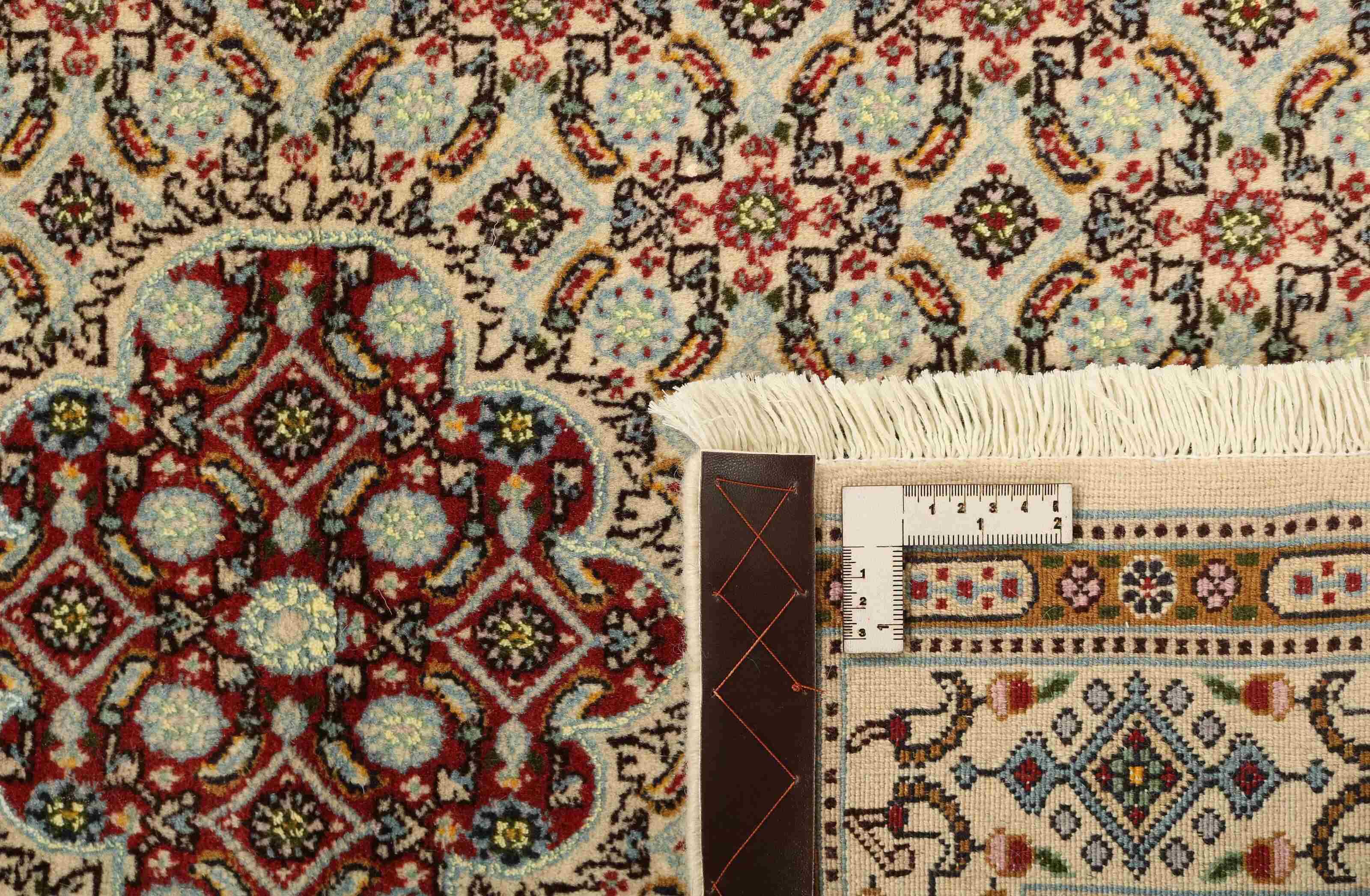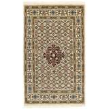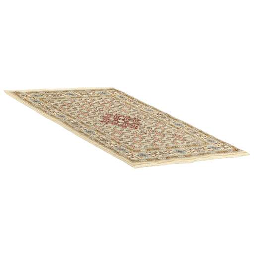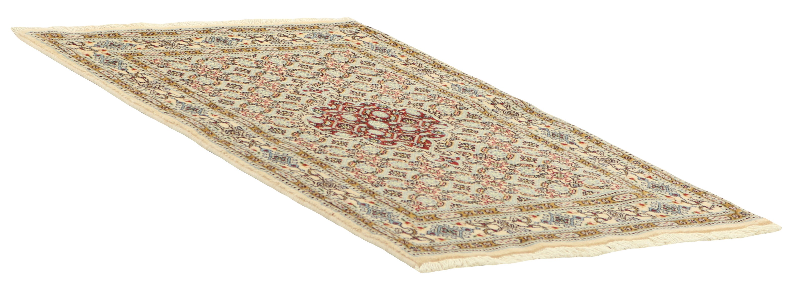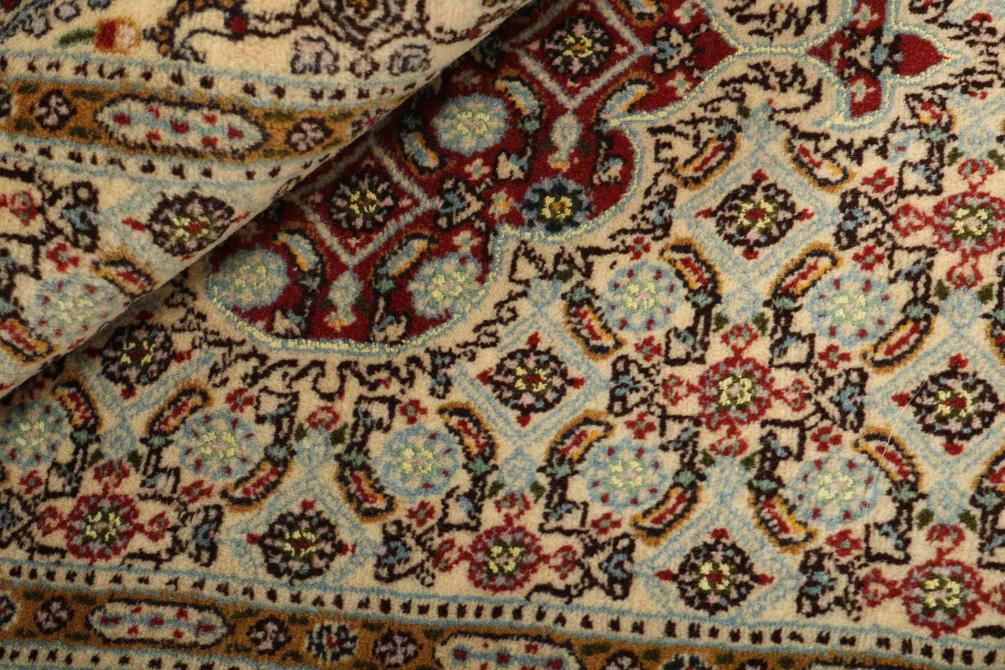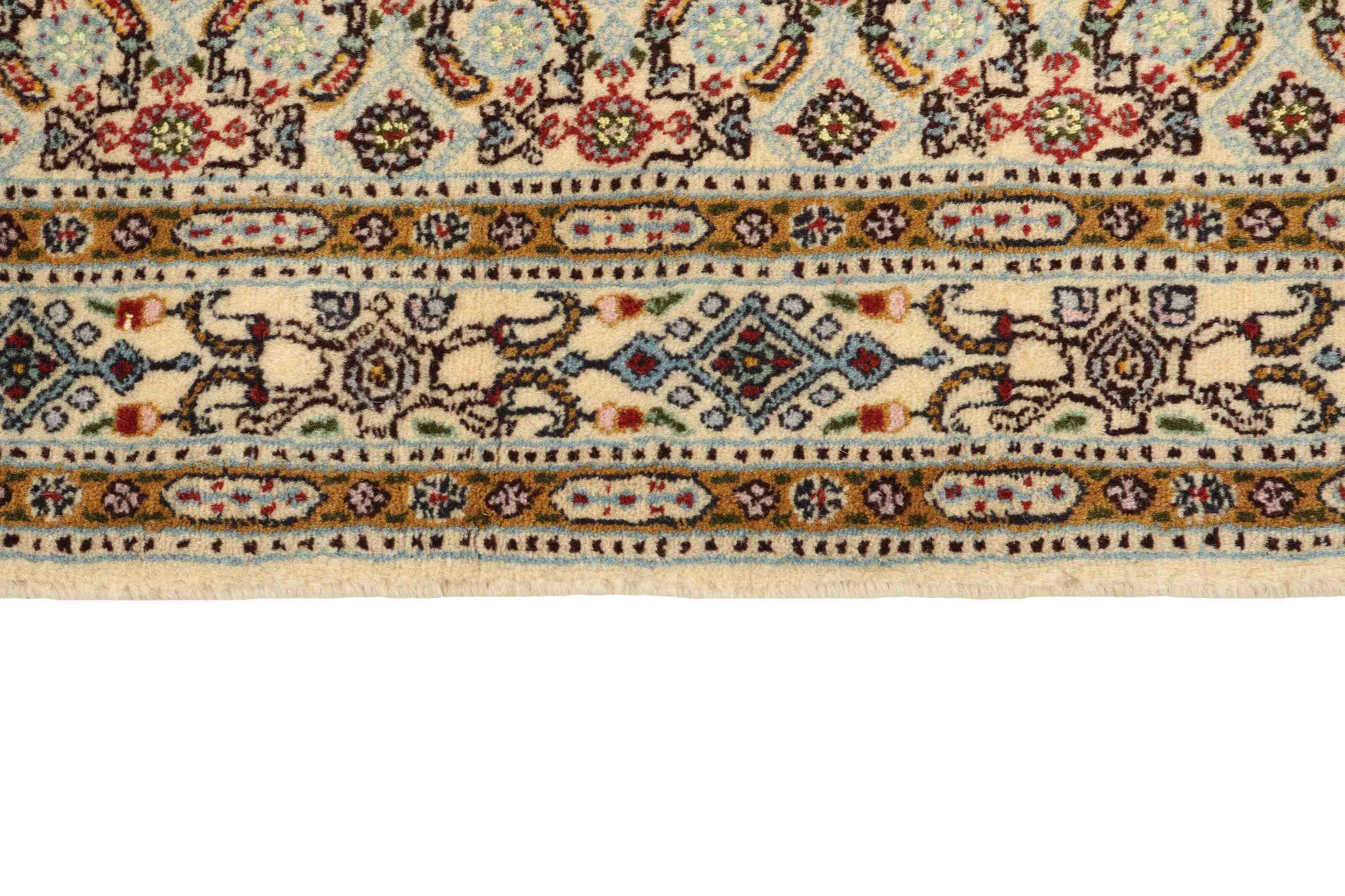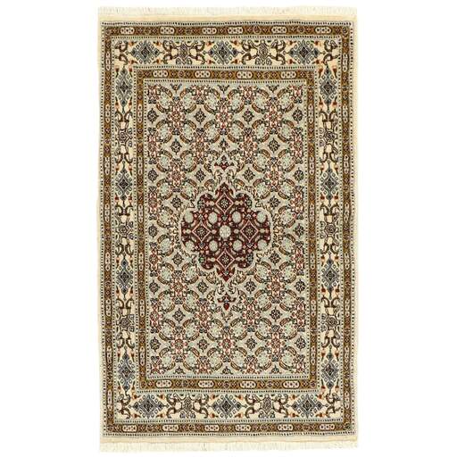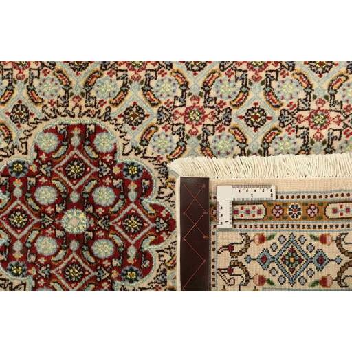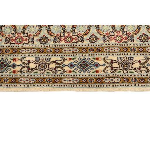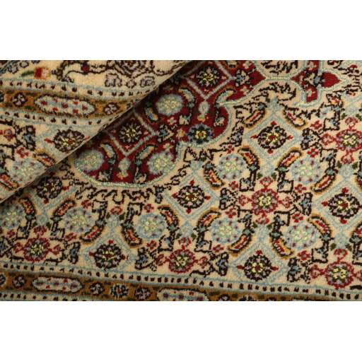 Moud est une petite ville au sud de Mashad, dans la province de Khorrasan. Les tapis de cette région se caractérisent par l'homogénéité de leurs motifs et de leur qualité. La chaîne et la trame sont en coton et le velours en laine. Les bordures sont une version de la bordure persane traditionnelle en tortue. Les tapis sont fabriqués dans toutes les tailles. Les tapis Moud sont souvent copiés en Inde, en raison de leur remarquable homogénéité. Les motifs caractéristiques de Moud sont parmi les plus uniformes, les plus réguliers et les plus facilement reconnaissables de la province de Khorrasan. Les Moud Mahi sont fabriqués dans des tons beige, rouge clair ou bleu, avec des motifs Mahi sur toute la surface ou avec un médaillon en forme d'étoile. Mahi signifie poisson et le motif Mahi est le motif le plus couramment utilisé dans les véritables tapis persans. En l'observant de près, vous pouvez voir un étang entouré de quatre poissons.