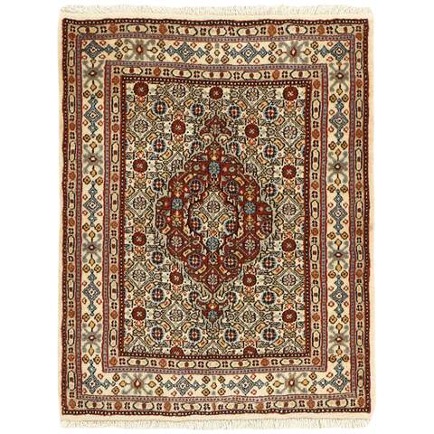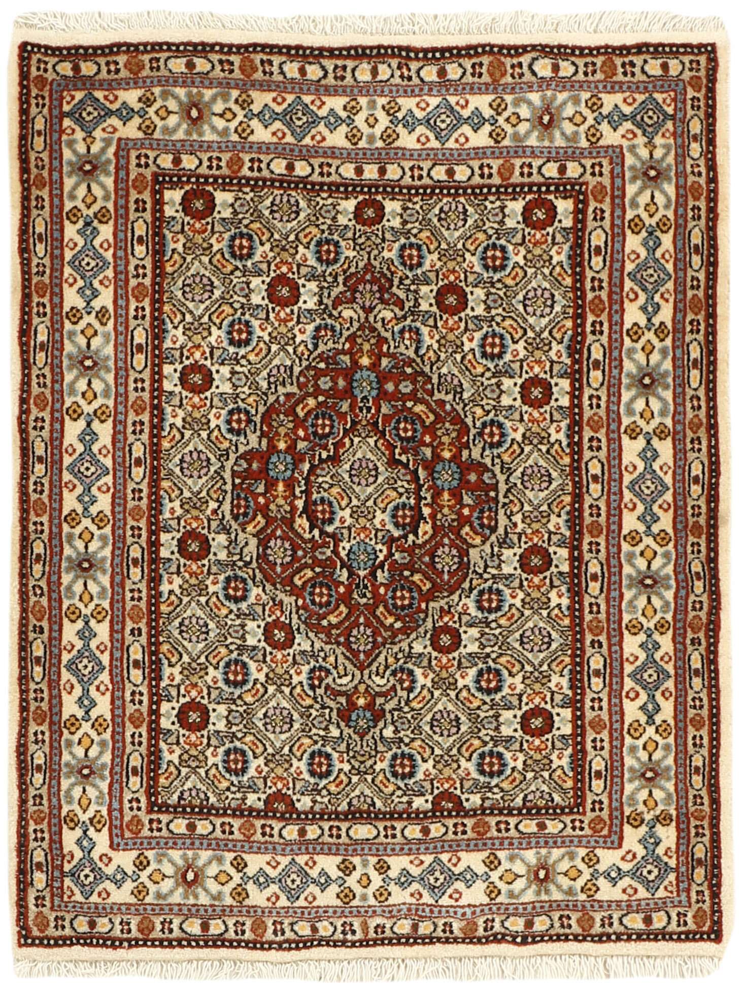 Moud est une petite ville au sud de Mashad, dans la province de Khorrasan. Les tapis de cette région se caractérisent par l'homogénéité de leurs motifs et de leur qualité. La chaîne et la trame sont en coton et le velours en laine. Les bordures sont une version de la bordure persane traditionnelle en tortue. Les tapis sont fabriqués dans toutes les tailles. Les tapis Moud sont souvent copiés en Inde, en raison de leur remarquable homogénéité. Les motifs caractéristiques de Moud sont parmi les plus uniformes, les plus réguliers et les plus facilement reconnaissables de la province de Khorrasan. Les Moud Mahi sont fabriqués dans des tons beige, rouge clair ou bleu, avec des motifs Mahi sur toute la surface ou avec un médaillon en forme d'étoile. Mahi signifie poisson et le motif Mahi est le motif le plus couramment utilisé dans les véritables tapis persans. En l'observant de près, vous pouvez voir un étang entouré de quatre poissons.
