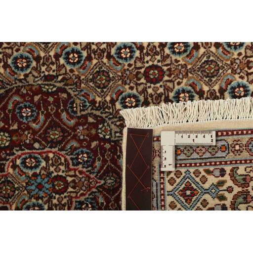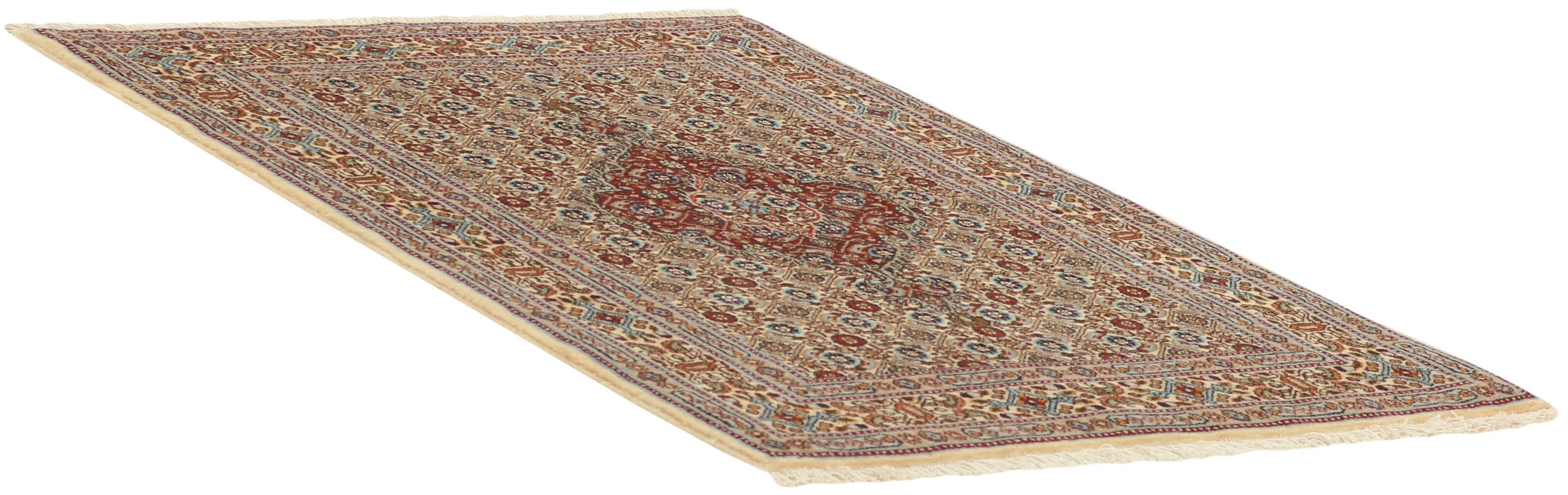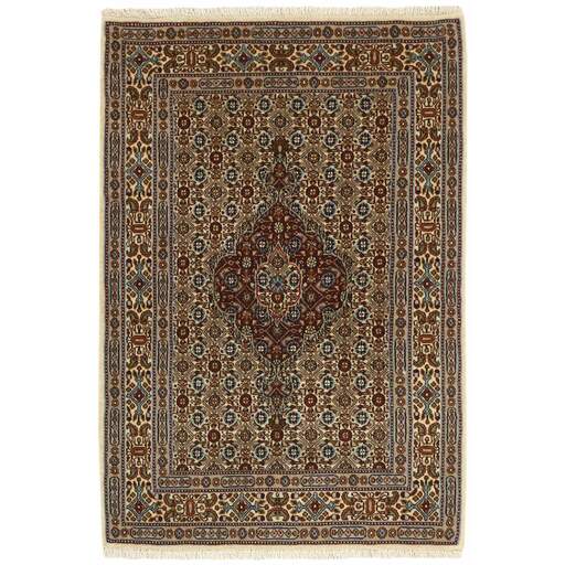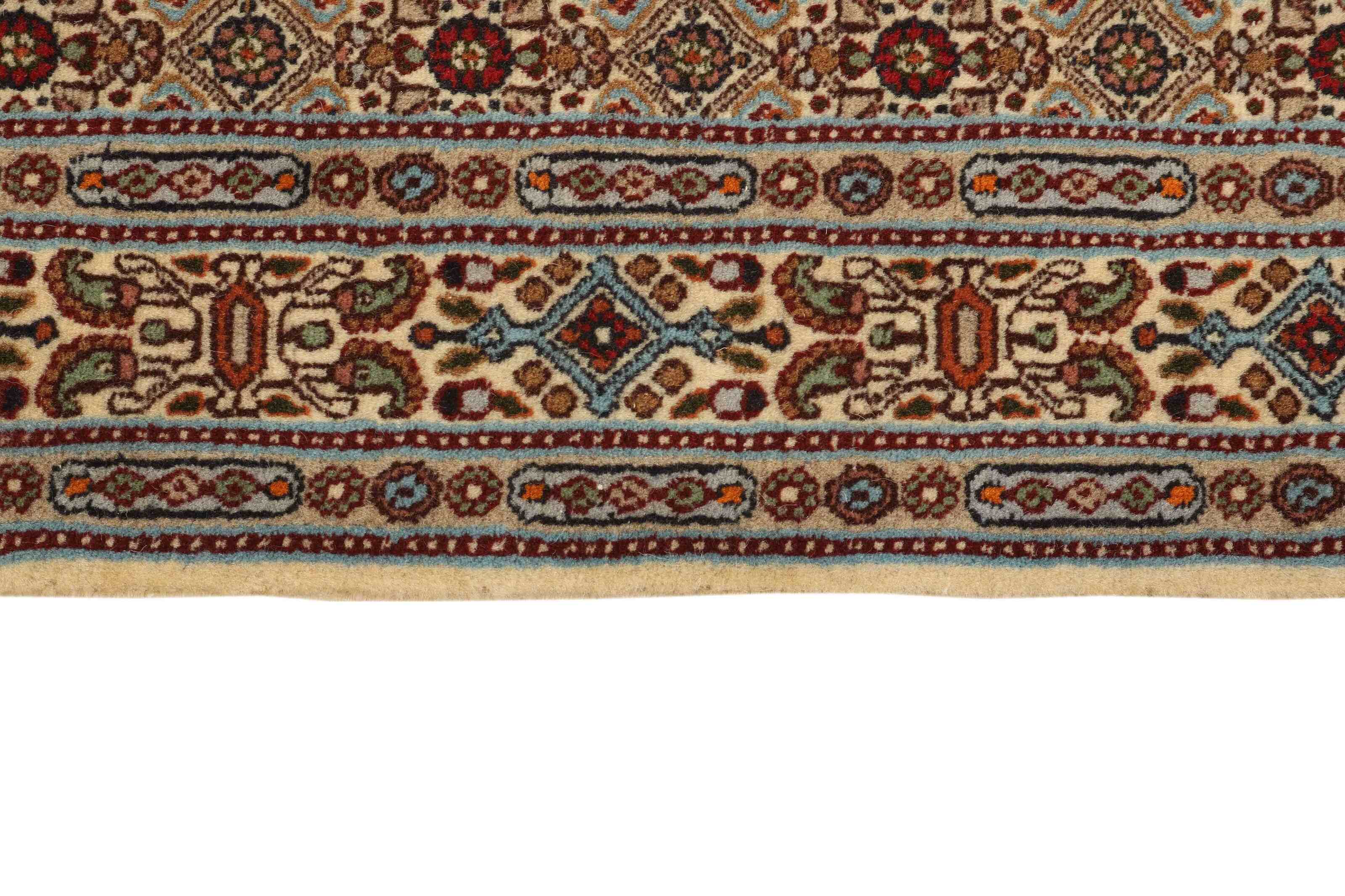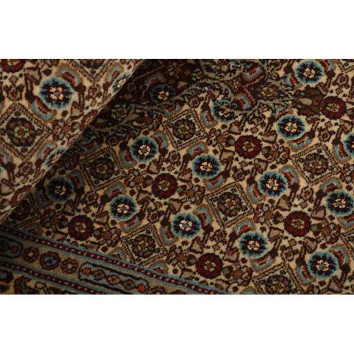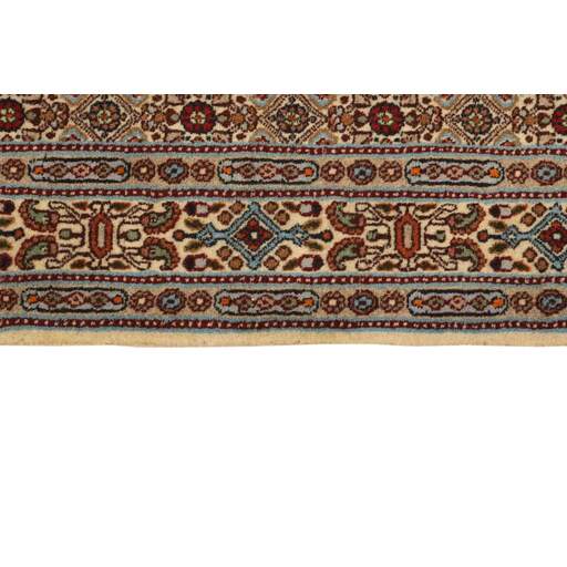 Moud est une petite ville au sud de Mashad, dans la province de Khorrasan. Les tapis de cette région se caractérisent par l'homogénéité de leurs motifs et de leur qualité. La chaîne et la trame sont en coton et le velours en laine. Les bordures sont une version de la bordure persane traditionnelle en tortue. Les tapis sont fabriqués dans toutes les tailles. Les tapis Moud sont souvent copiés en Inde, en raison de leur remarquable homogénéité. Les motifs caractéristiques de Moud sont parmi les plus uniformes, les plus réguliers et les plus facilement reconnaissables de la province de Khorrasan. Les Moud Mahi sont fabriqués dans des tons beige, rouge clair ou bleu, avec des motifs Mahi sur toute la surface ou avec un médaillon en forme d'étoile. Mahi signifie poisson et le motif Mahi est le motif le plus couramment utilisé dans les véritables tapis persans. En l'observant de près, vous pouvez voir un étang entouré de quatre poissons.