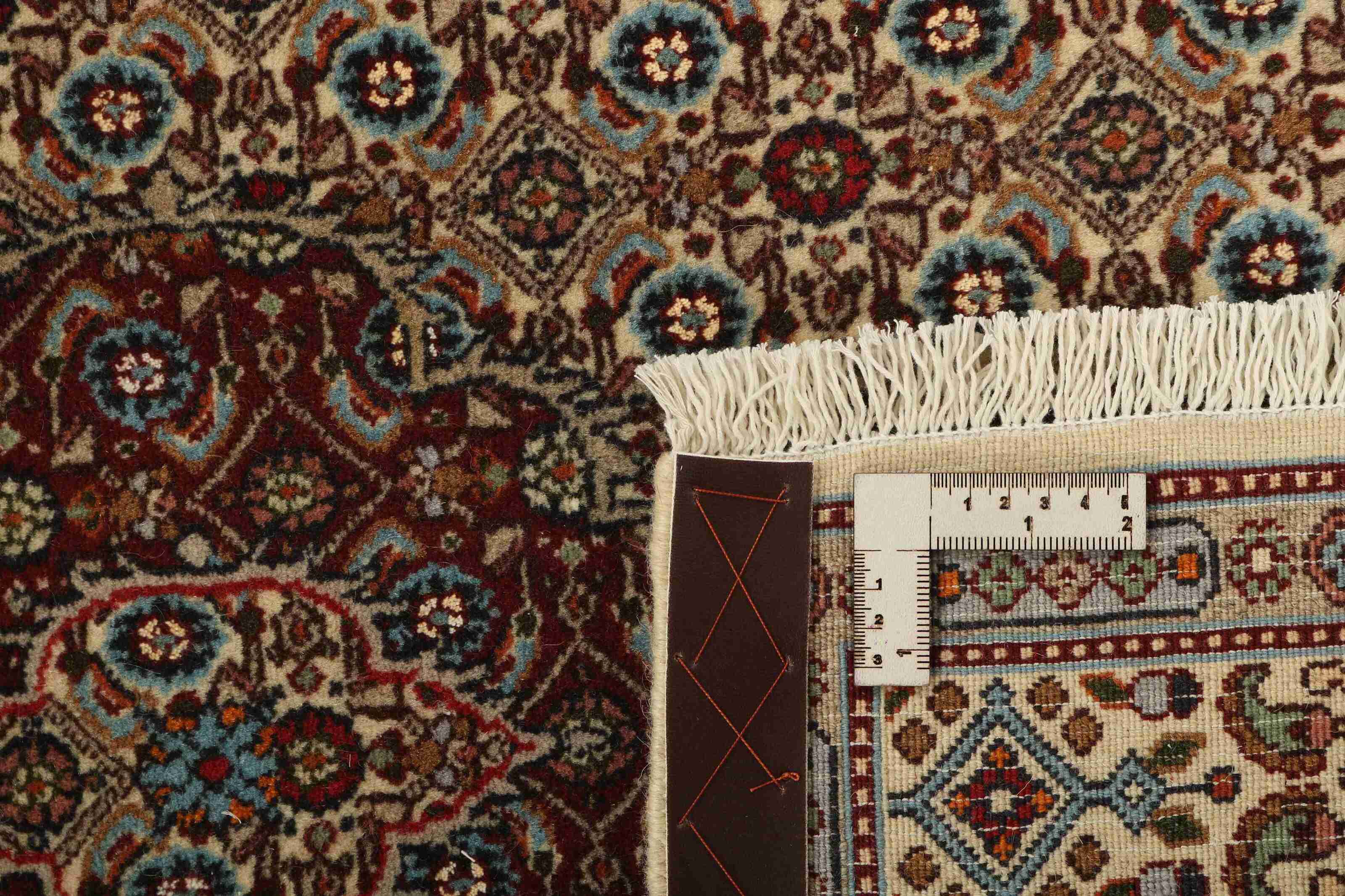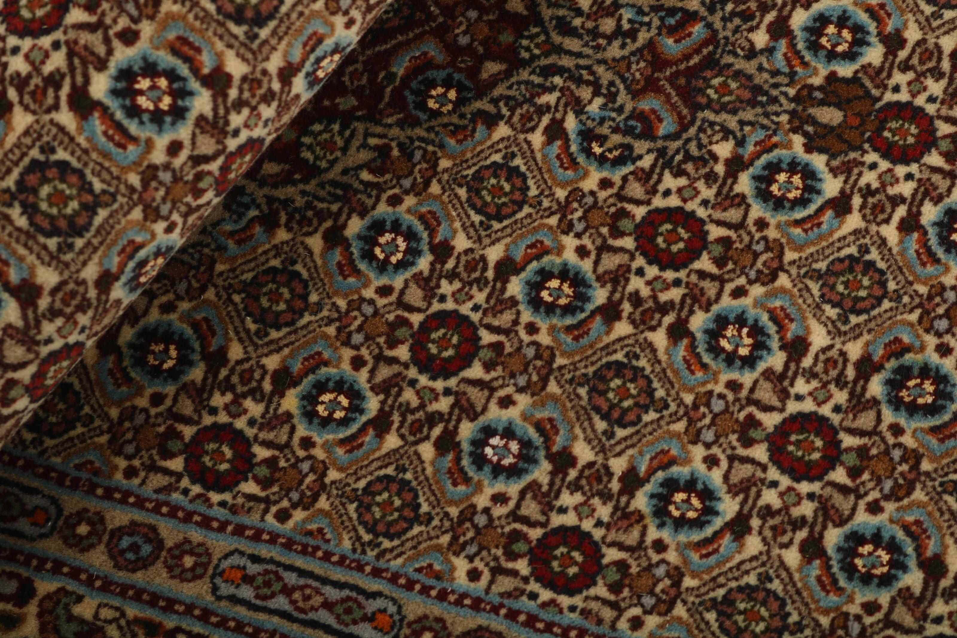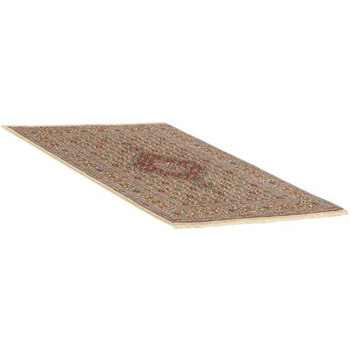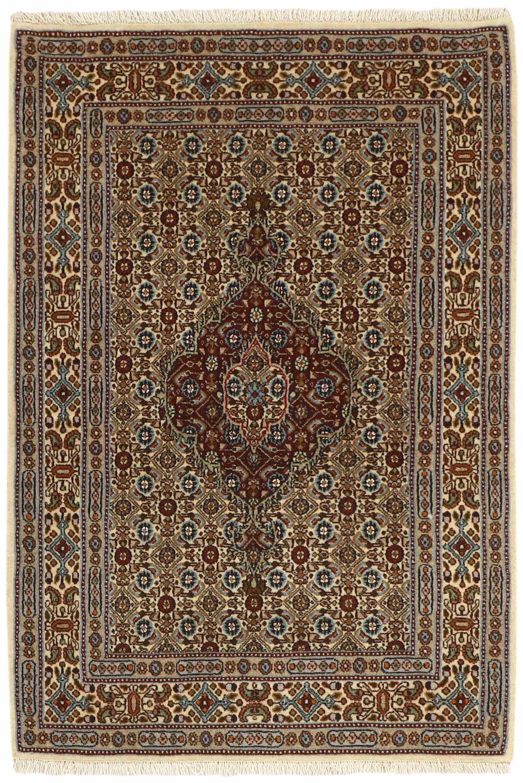 Moud est une petite ville au sud de Mashad, dans la province de Khorrasan. Les tapis de cette région se caractérisent par l'homogénéité de leurs motifs et de leur qualité. La chaîne et la trame sont en coton et le velours en laine. Les bordures sont une version de la bordure persane traditionnelle en tortue. Les tapis sont fabriqués dans toutes les tailles. Les tapis Moud sont souvent copiés en Inde, en raison de leur remarquable homogénéité. Les motifs caractéristiques de Moud sont parmi les plus uniformes, les plus réguliers et les plus facilement reconnaissables de la province de Khorrasan. Les Moud Mahi sont fabriqués dans des tons beige, rouge clair ou bleu, avec des motifs Mahi sur toute la surface ou avec un médaillon en forme d'étoile. Mahi signifie poisson et le motif Mahi est le motif le plus couramment utilisé dans les véritables tapis persans. En l'observant de près, vous pouvez voir un étang entouré de quatre poissons.