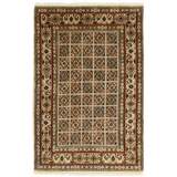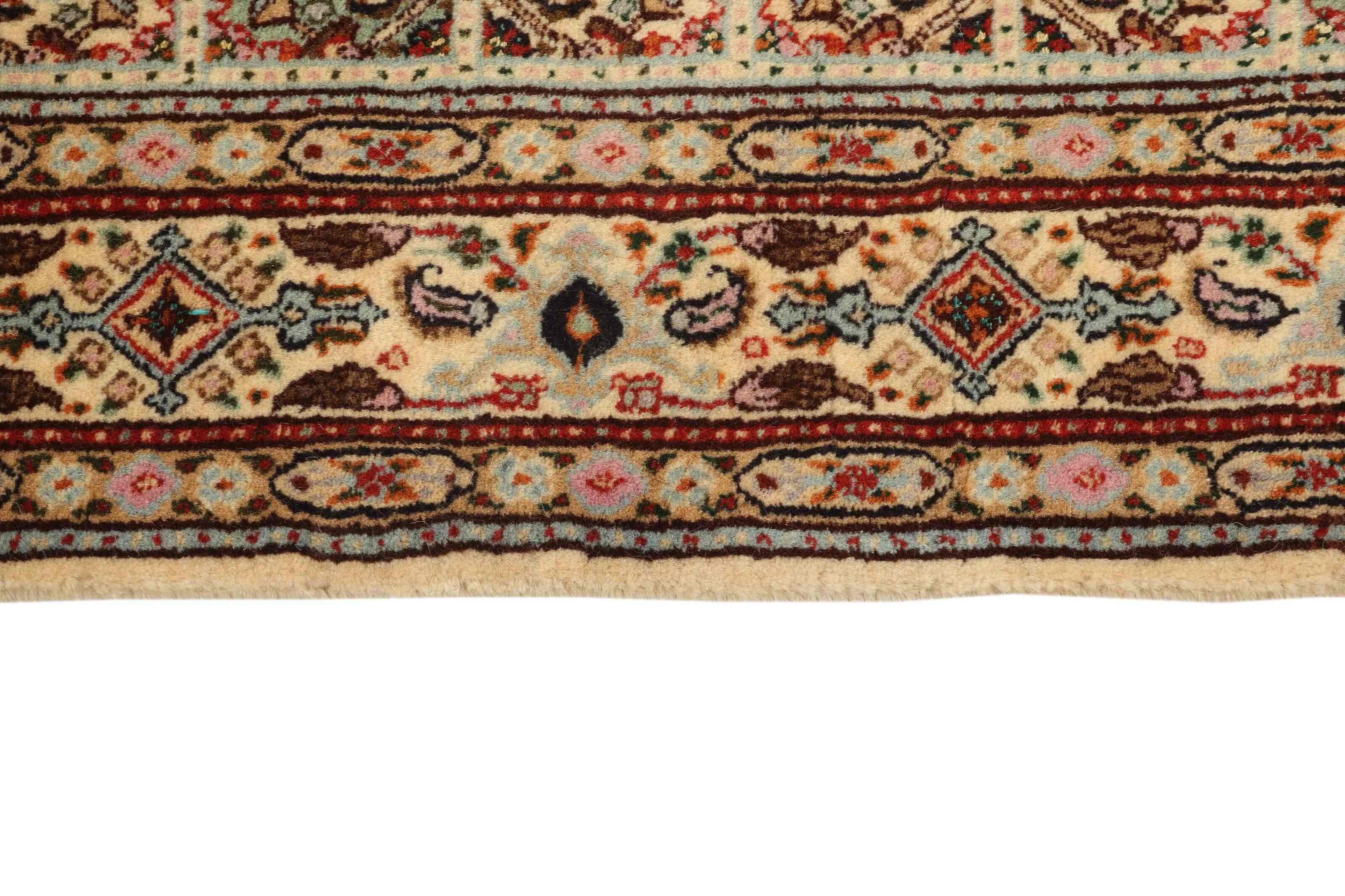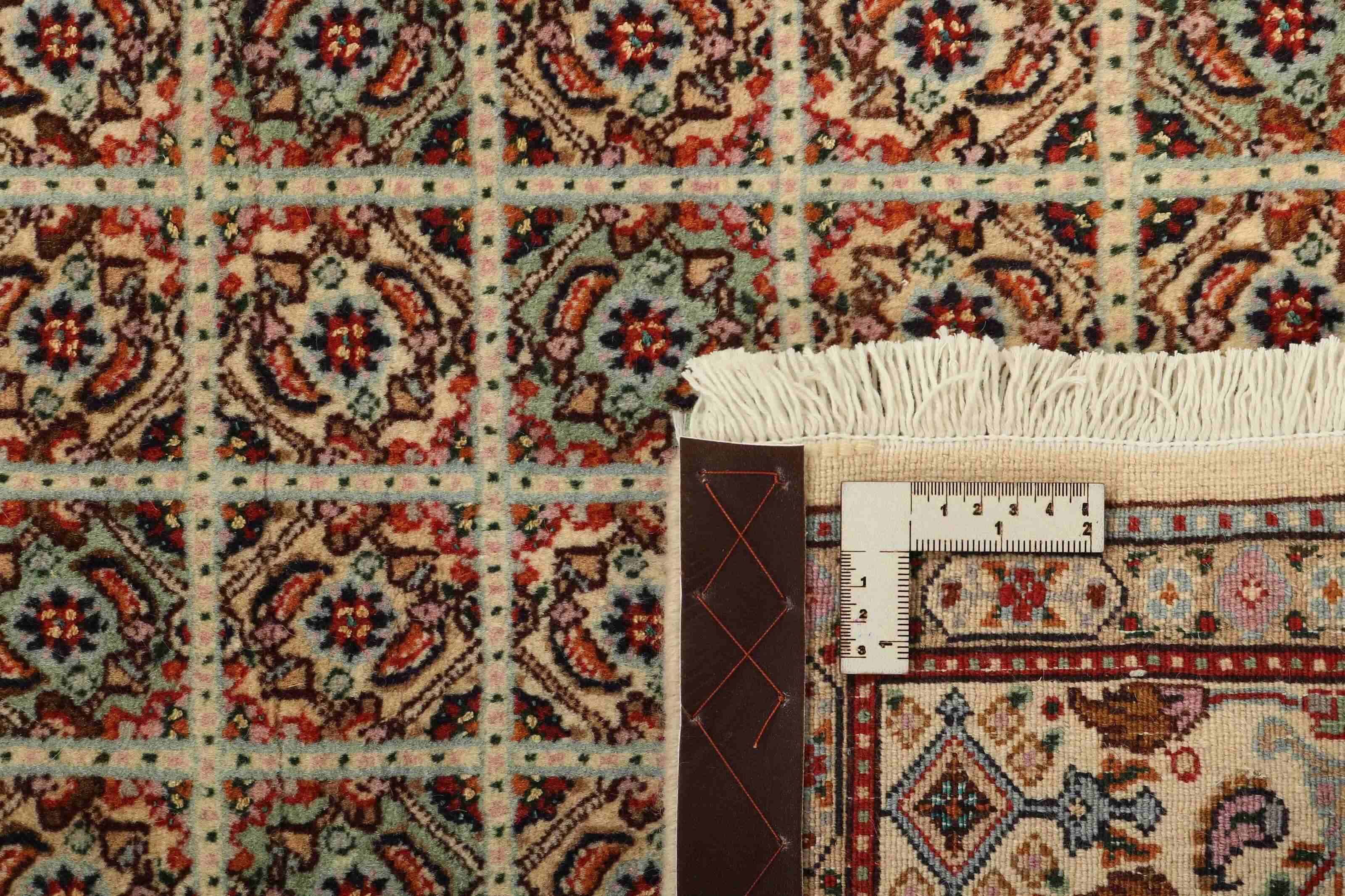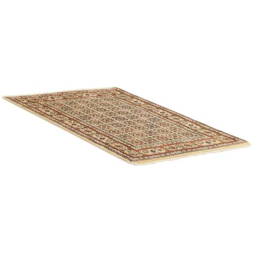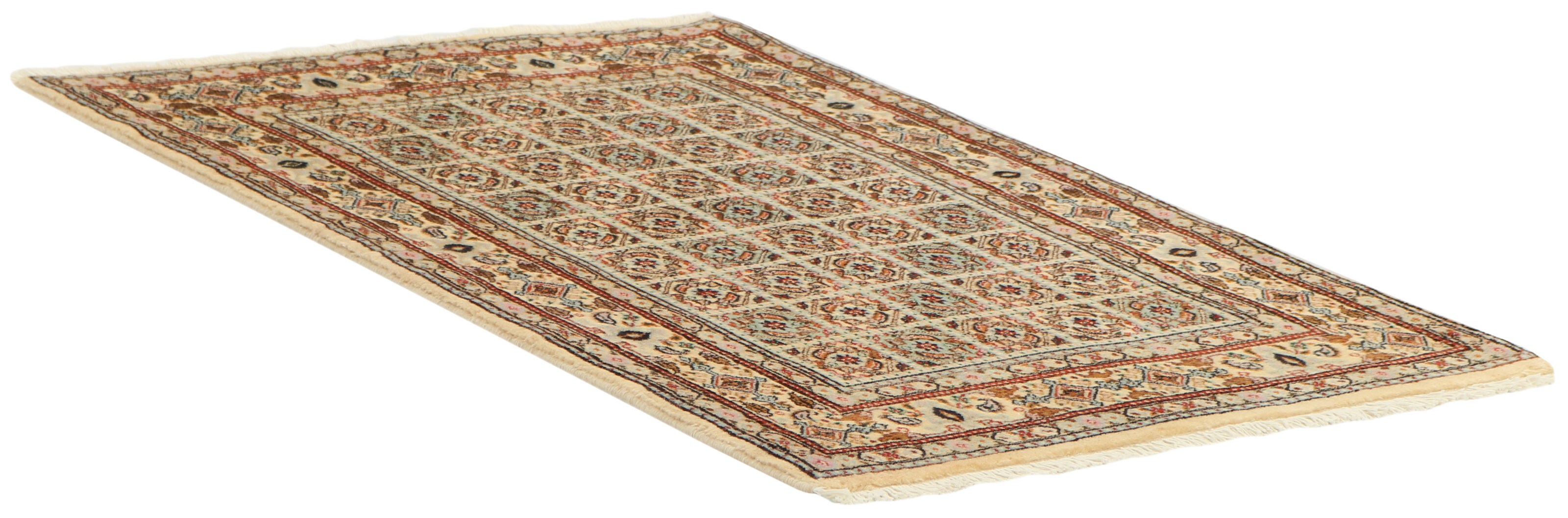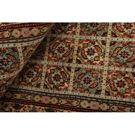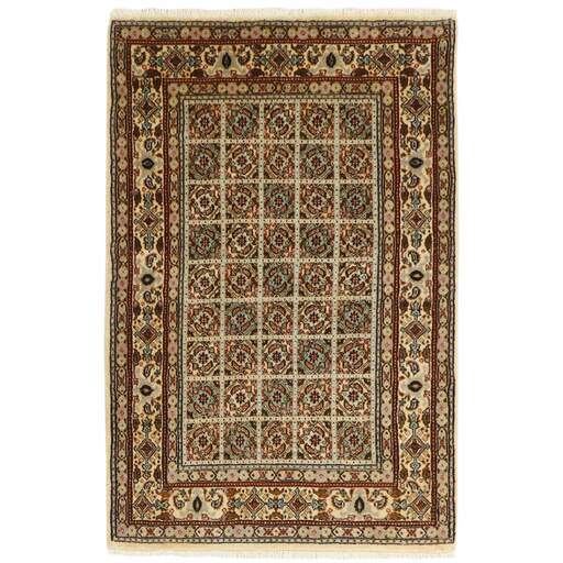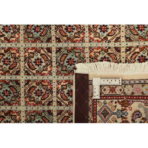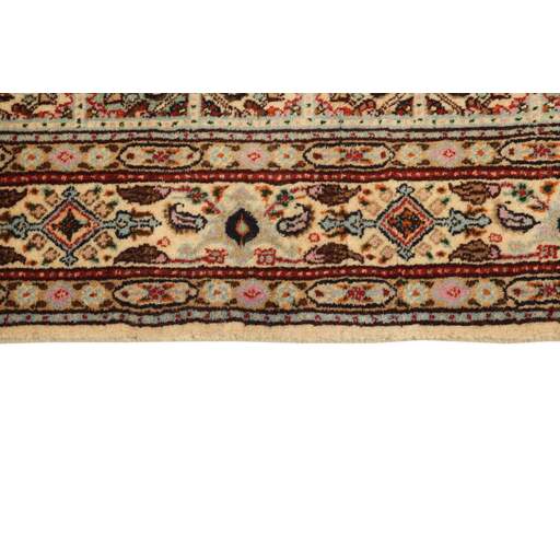 Moud est une petite ville au sud de Mashad, dans la province de Khorrasan. Les tapis de cette région se caractérisent par l'homogénéité de leurs motifs et de leur qualité. La chaîne et la trame sont en coton et le velours en laine. Les bordures sont une version de la bordure persane traditionnelle en tortue. Les tapis sont fabriqués dans toutes les tailles. Les tapis Moud sont souvent copiés en Inde, en raison de leur remarquable homogénéité. Les motifs caractéristiques de Moud sont parmi les plus uniformes, les plus réguliers et les plus facilement reconnaissables de la province de Khorrasan. Les Moud Mahi sont fabriqués dans des tons beige, rouge clair ou bleu, avec des motifs Mahi sur toute la surface ou avec un médaillon en forme d'étoile. Mahi signifie poisson et le motif Mahi est le motif le plus couramment utilisé dans les véritables tapis persans. En l'observant de près, vous pouvez voir un étang entouré de quatre poissons.